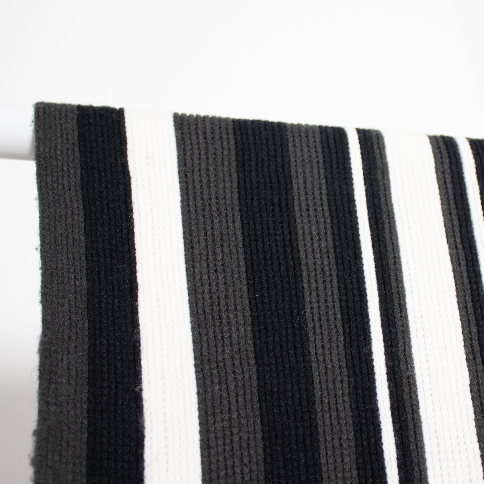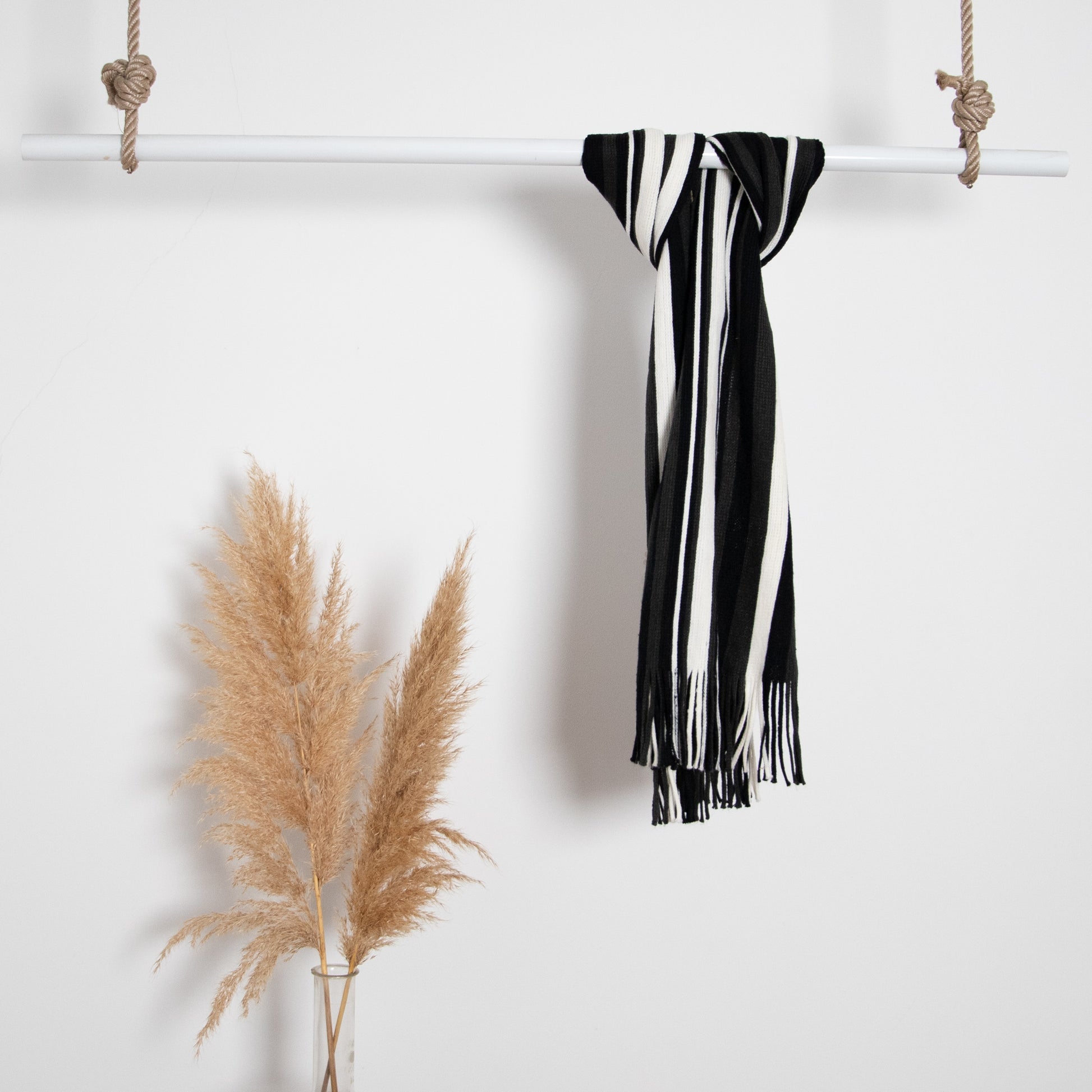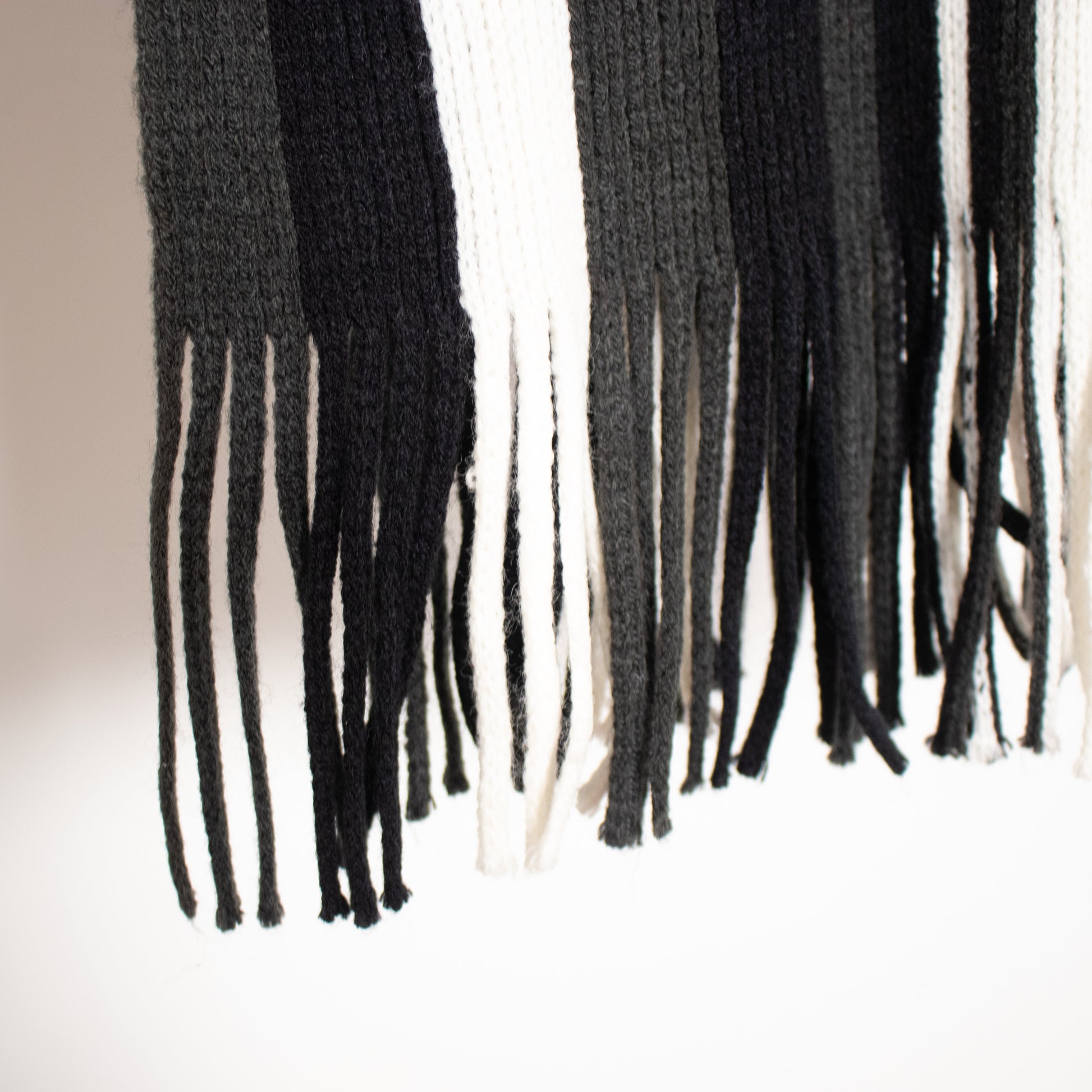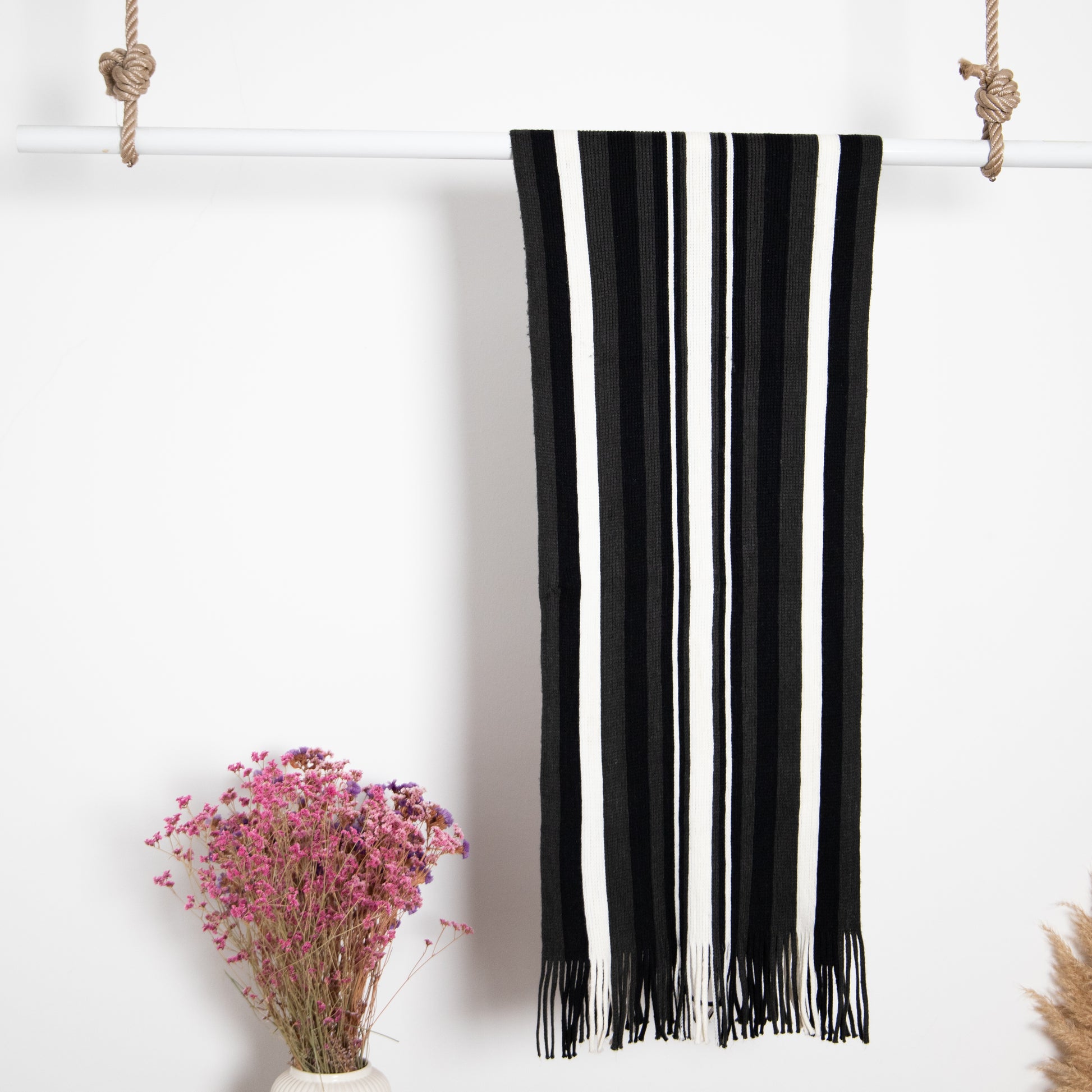 Striped patterned scarf in soft fabric with fringes on the short sides.