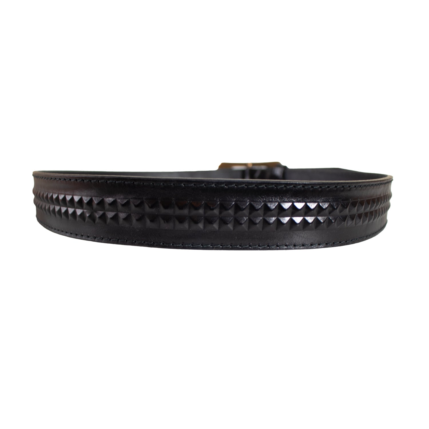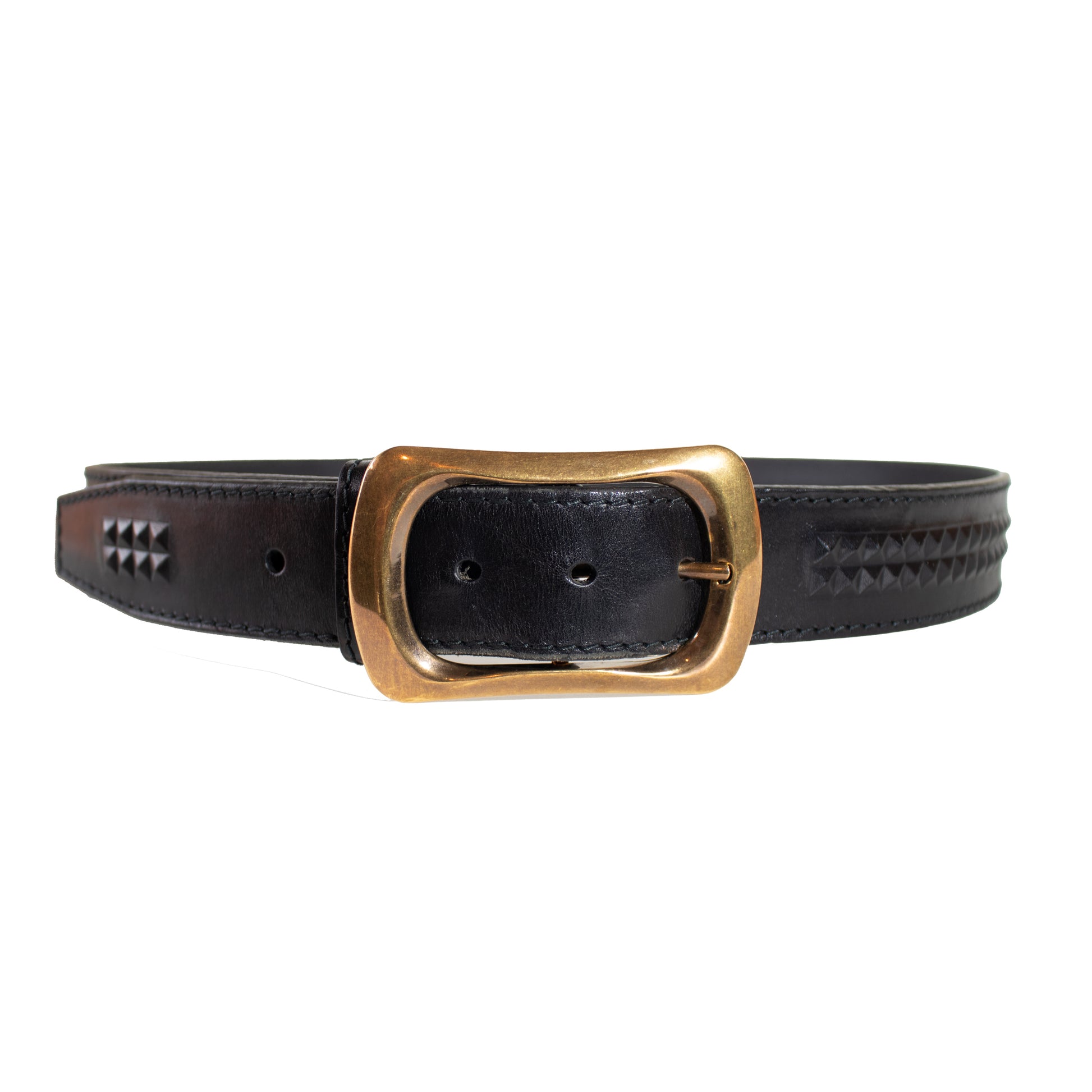 Cinto em pele em tom preto com relevo a toda a sua volta. Fivela de metal em tom bronze.