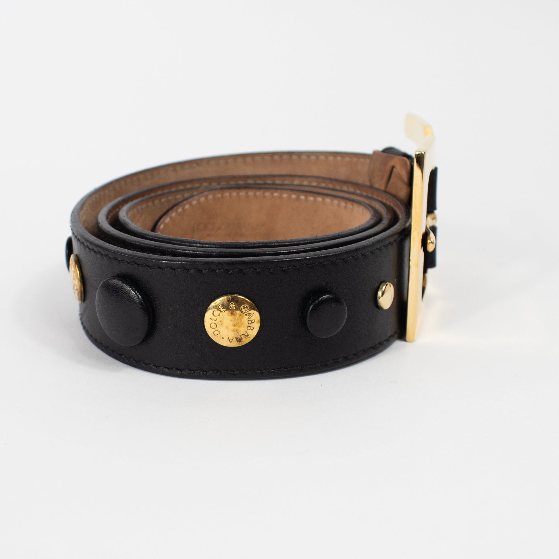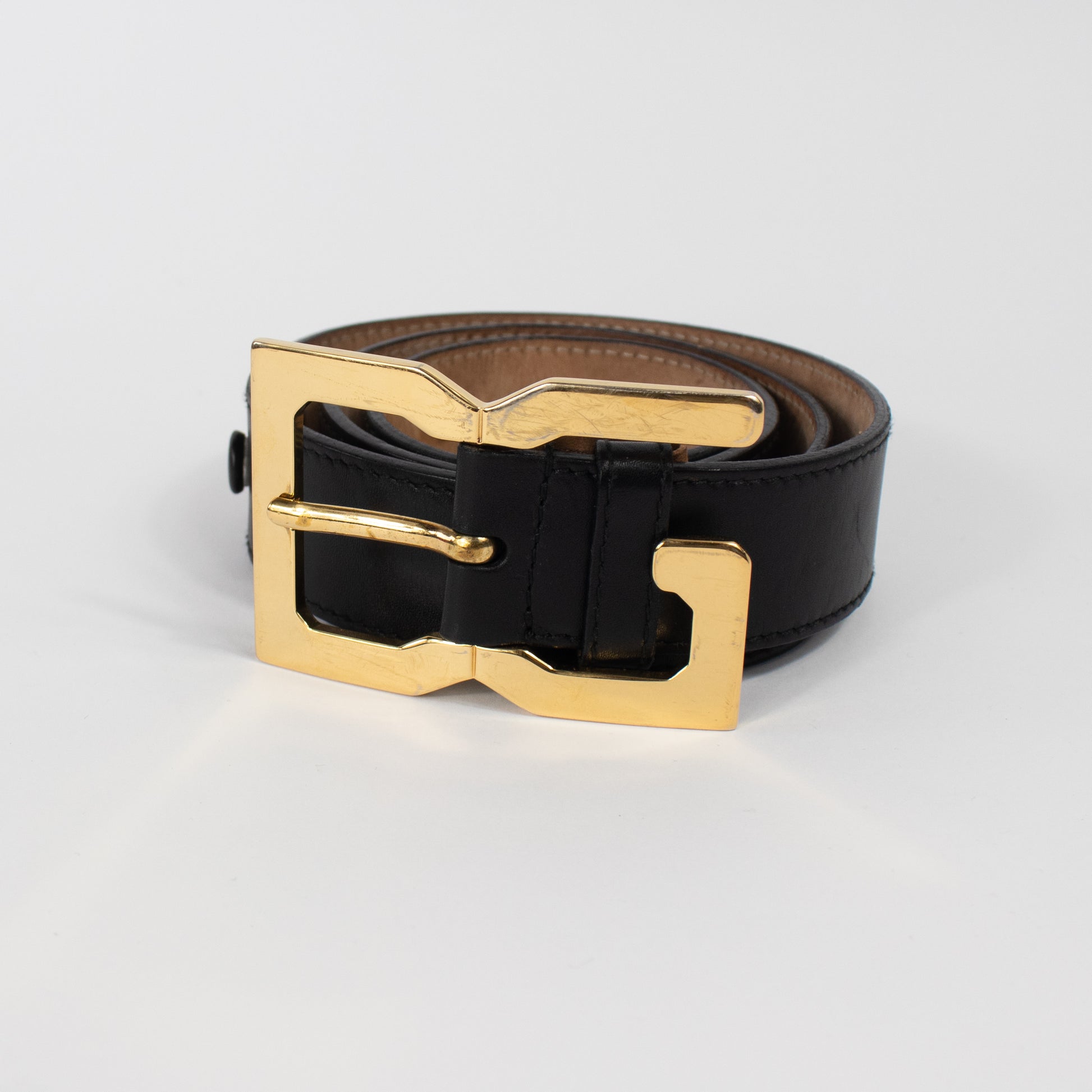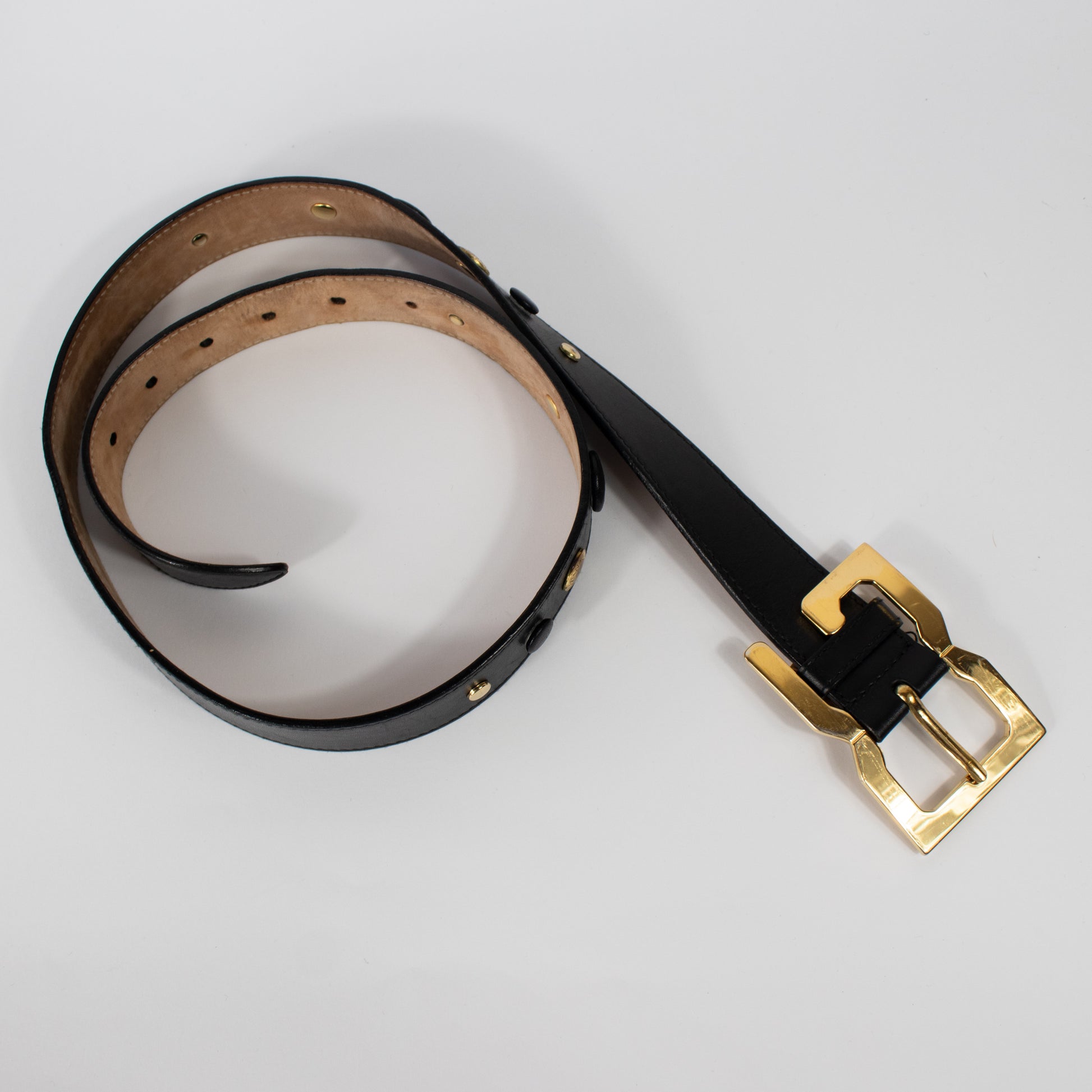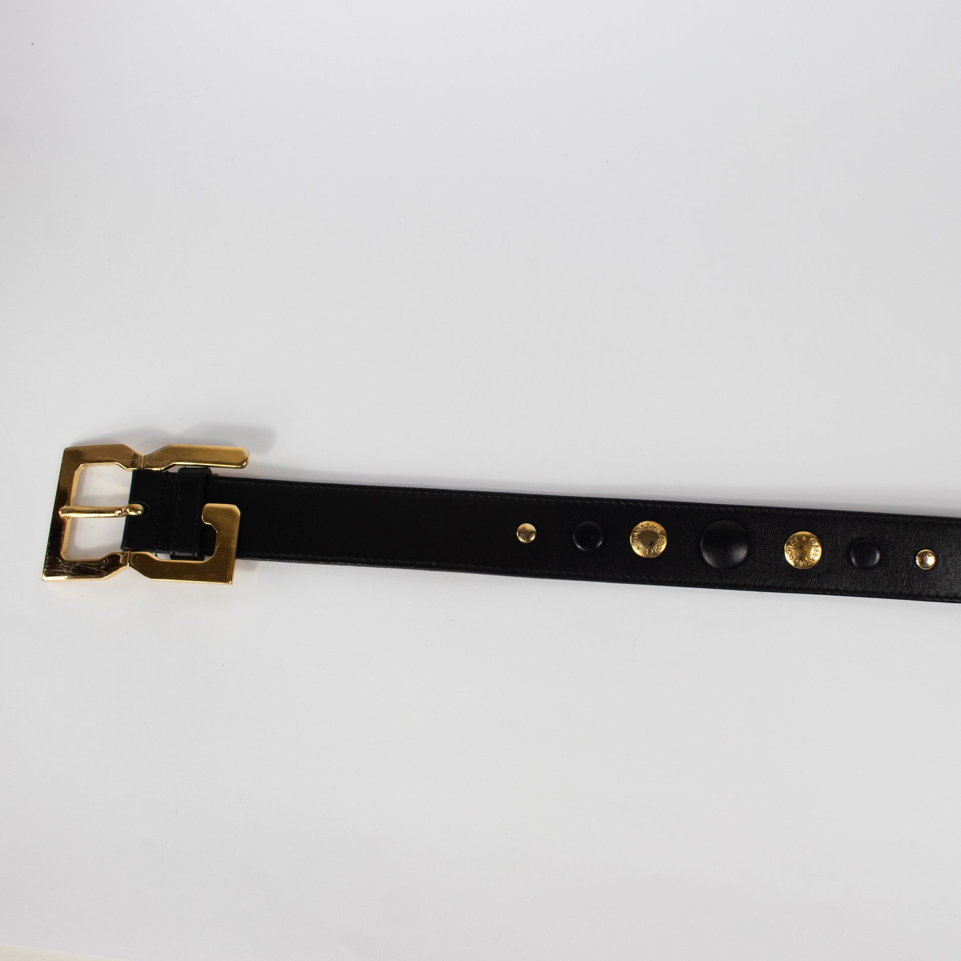 Cinto em pele com tachas pretas e douradas redondas ao longo do sítio. Fecho dourado com as iniciais da marca.