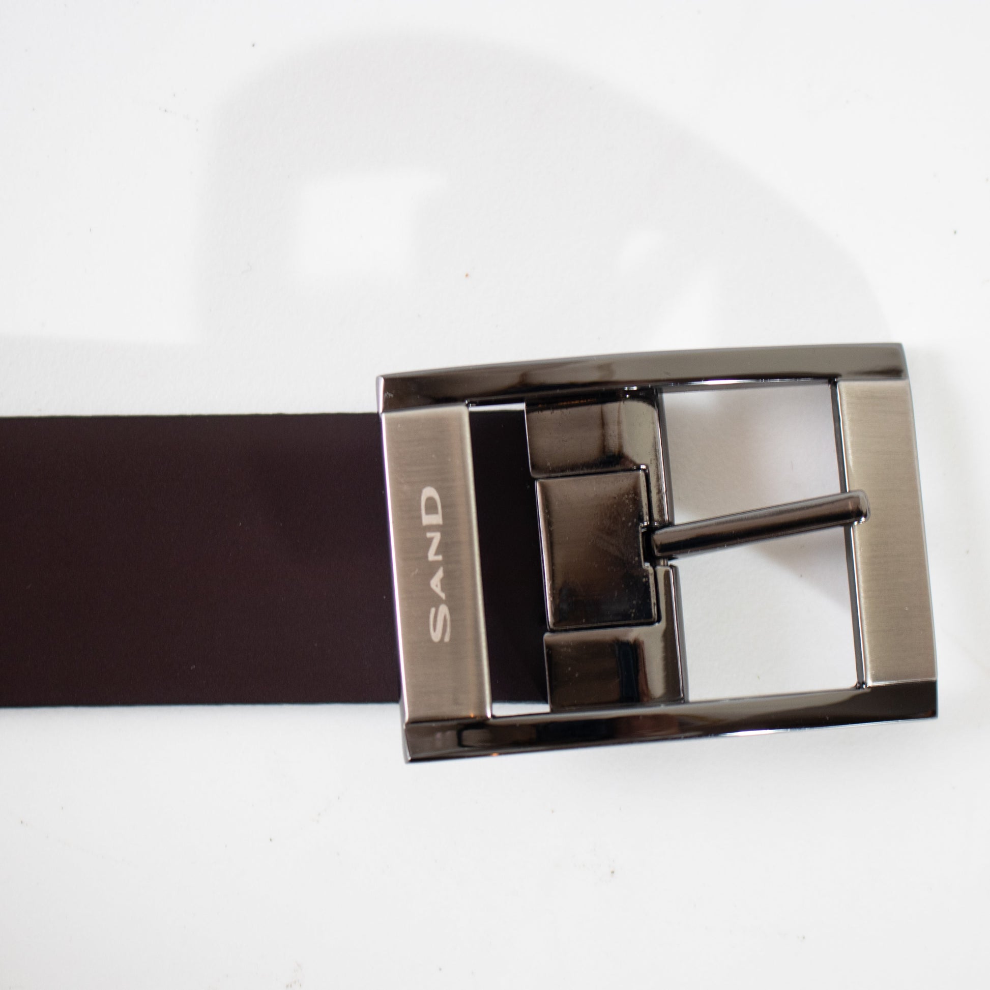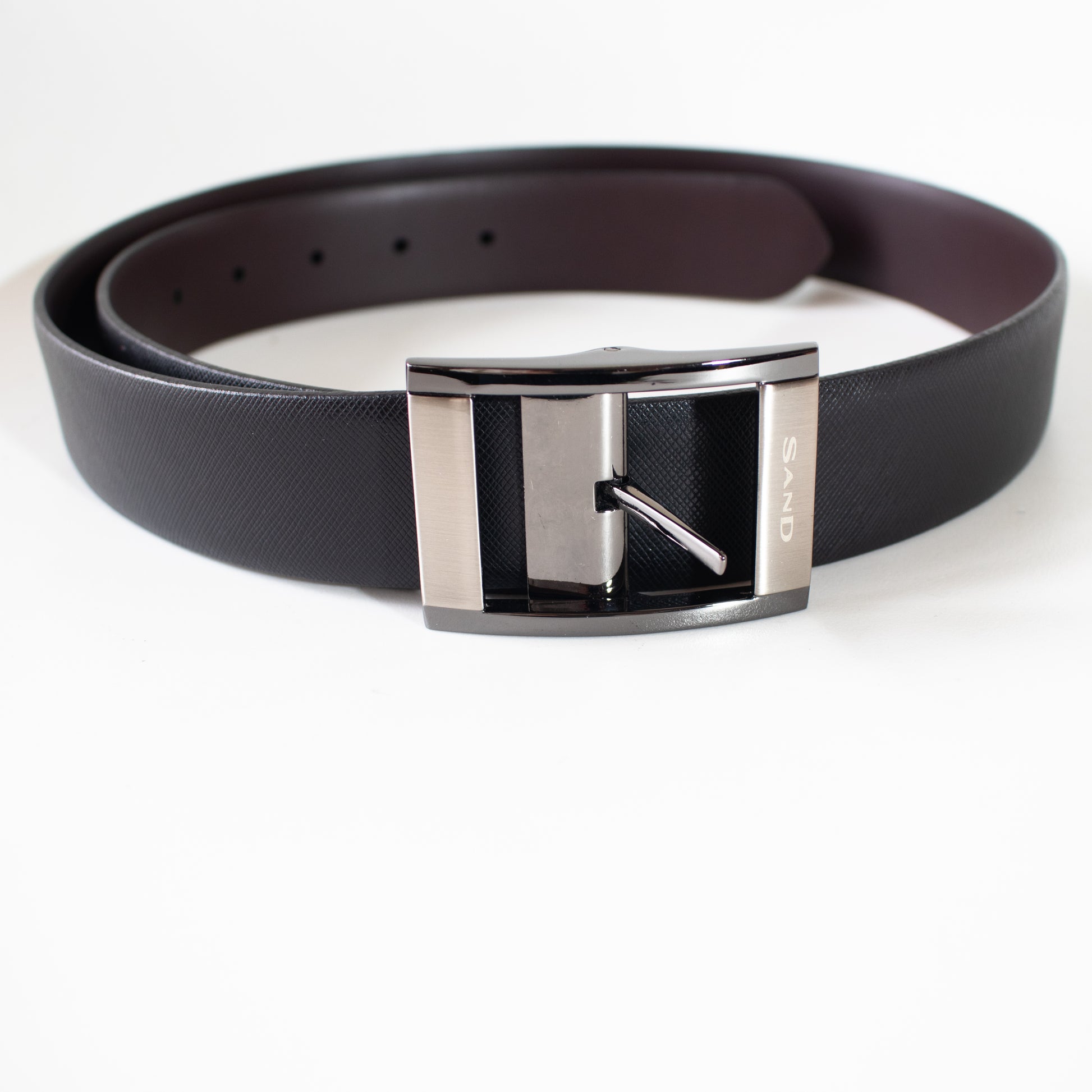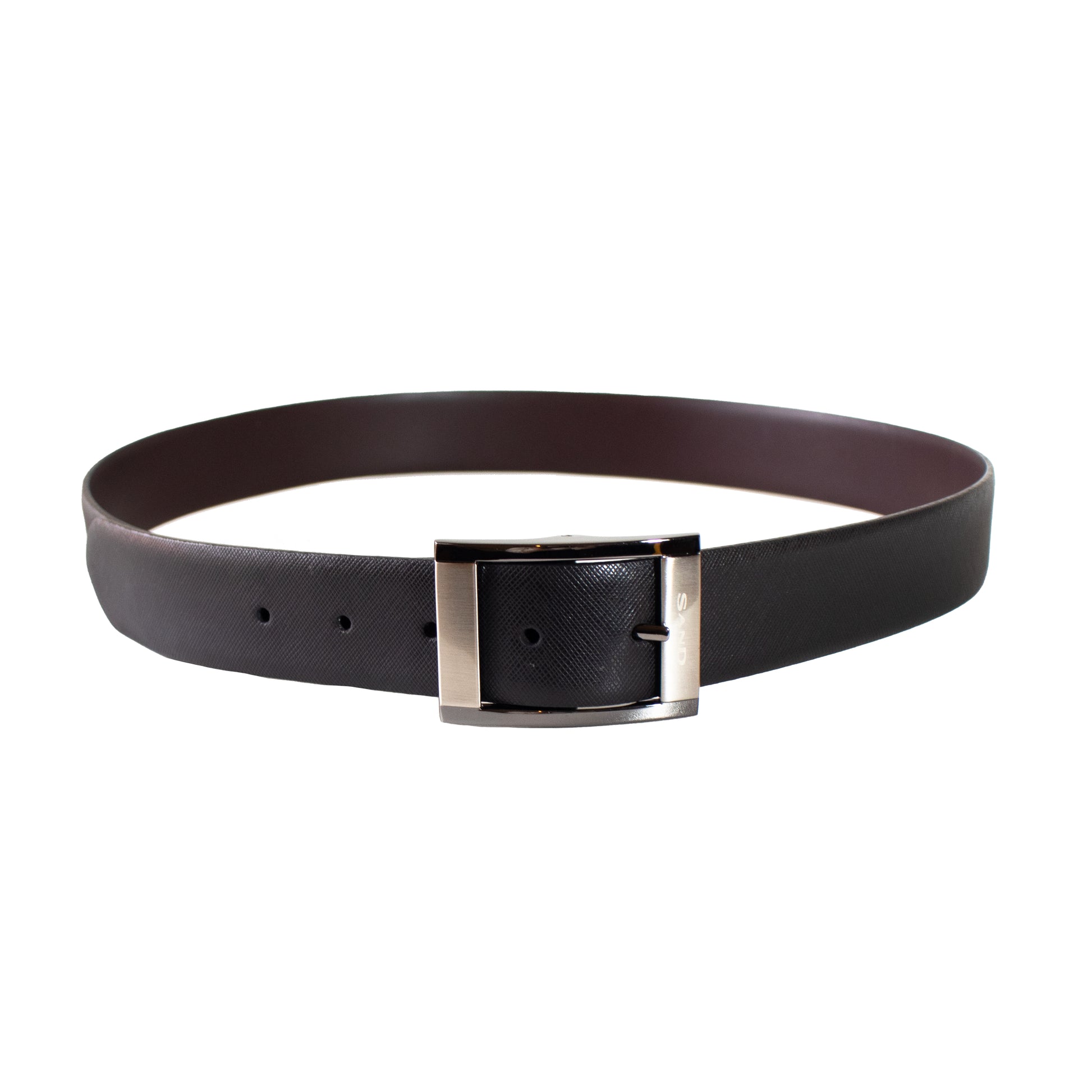 Cinto reversível em pele preta de um lado e castanha do outro com fivela metalizada.