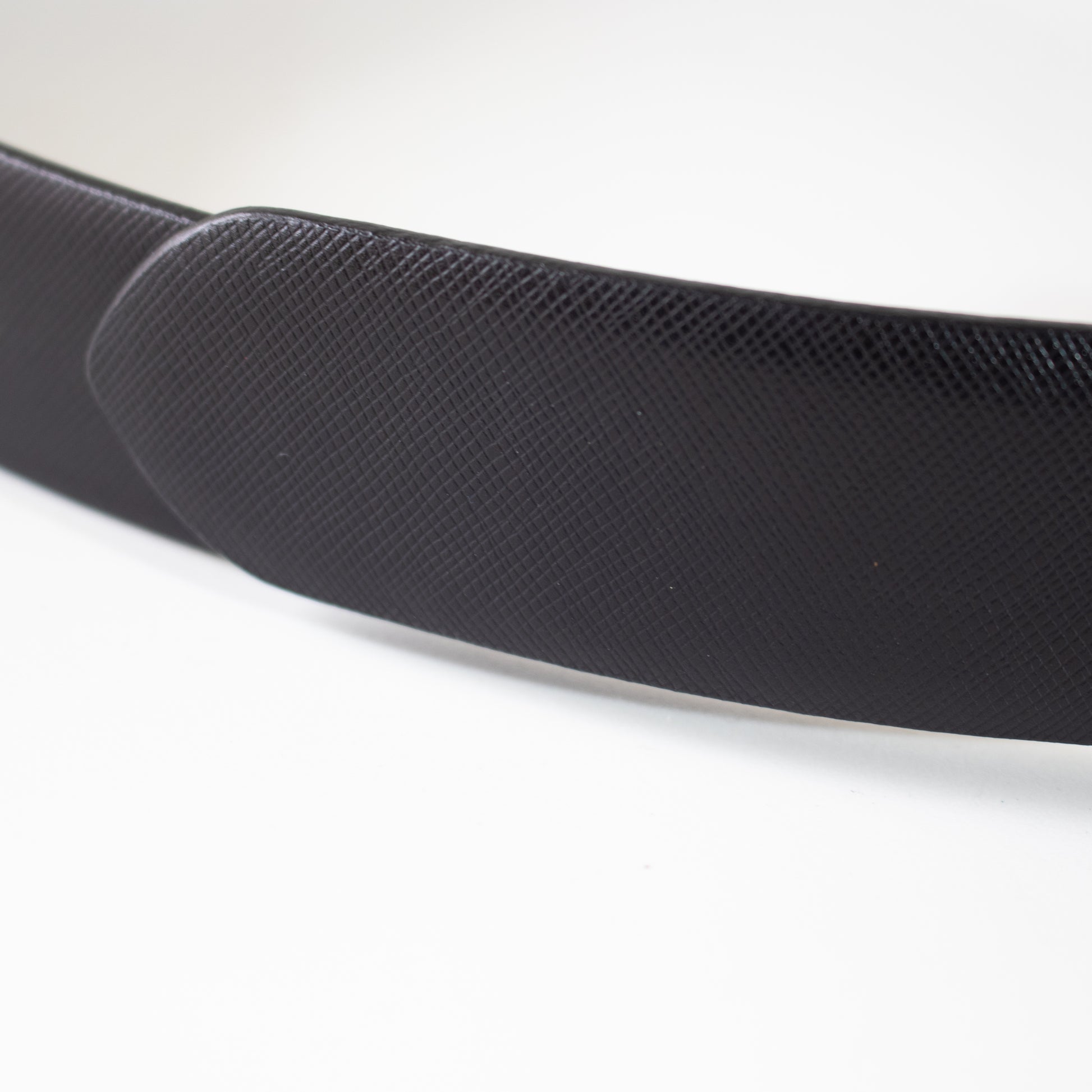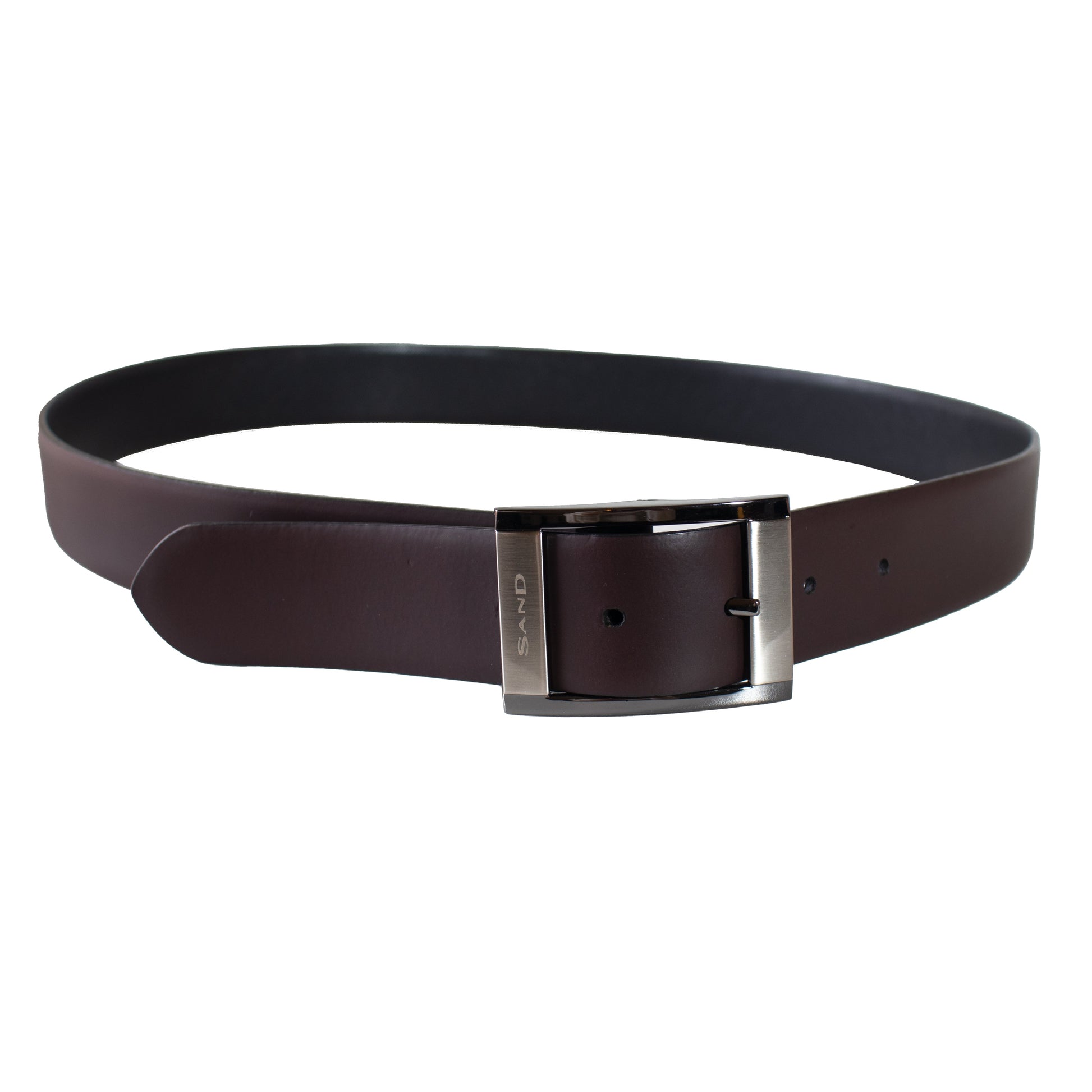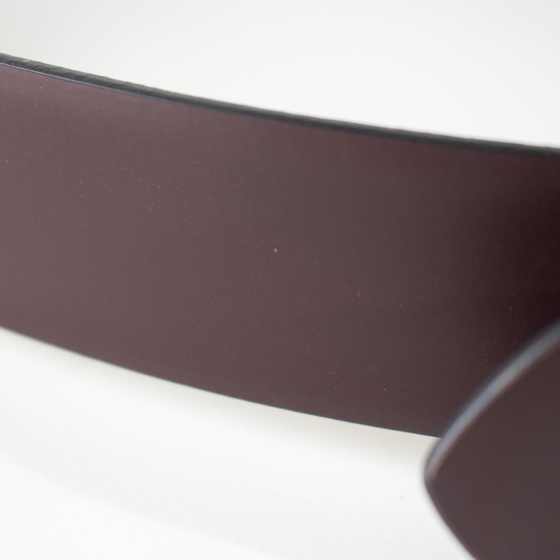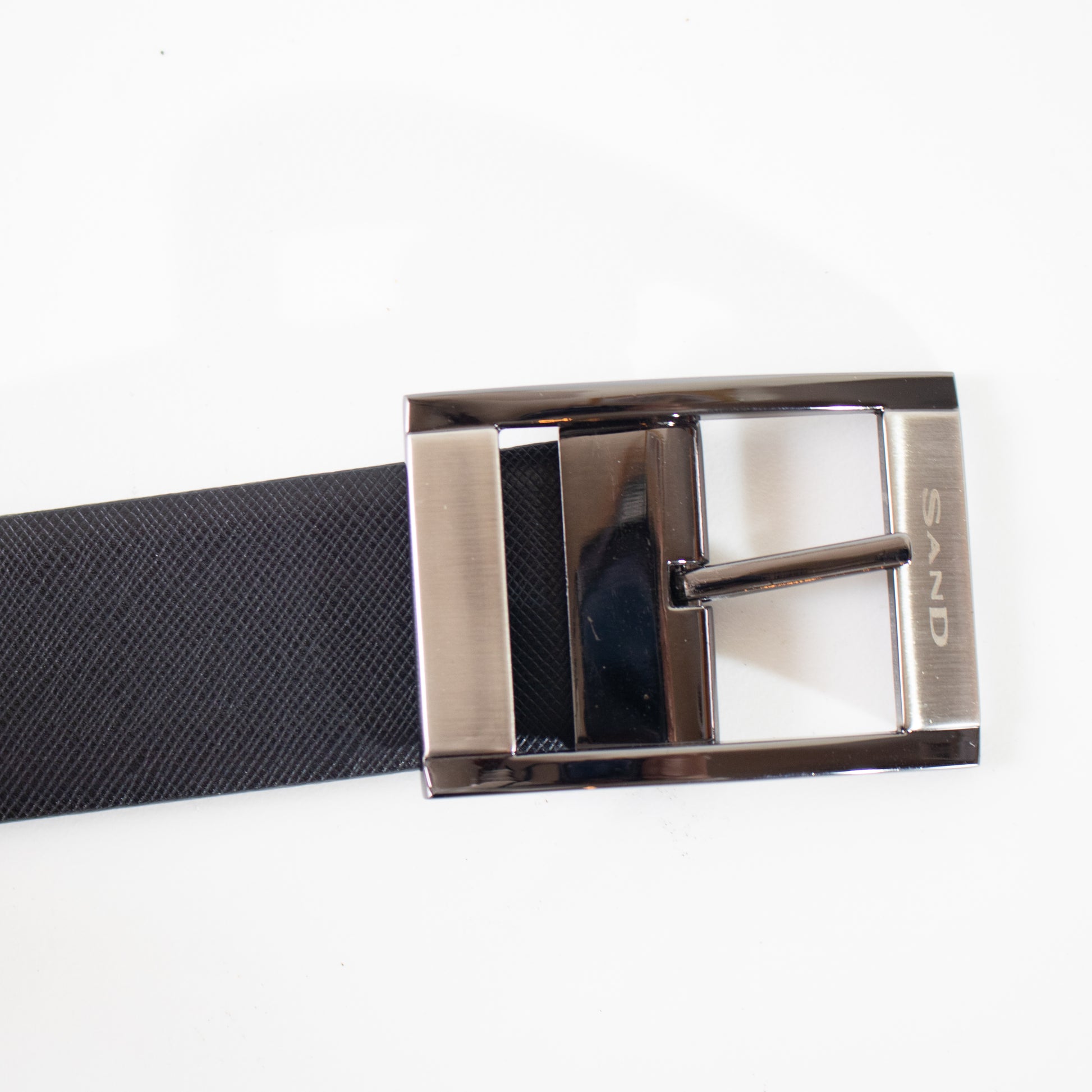 Cinto reversível em pele preta de um lado e castanha do outro com fivela metalizada.