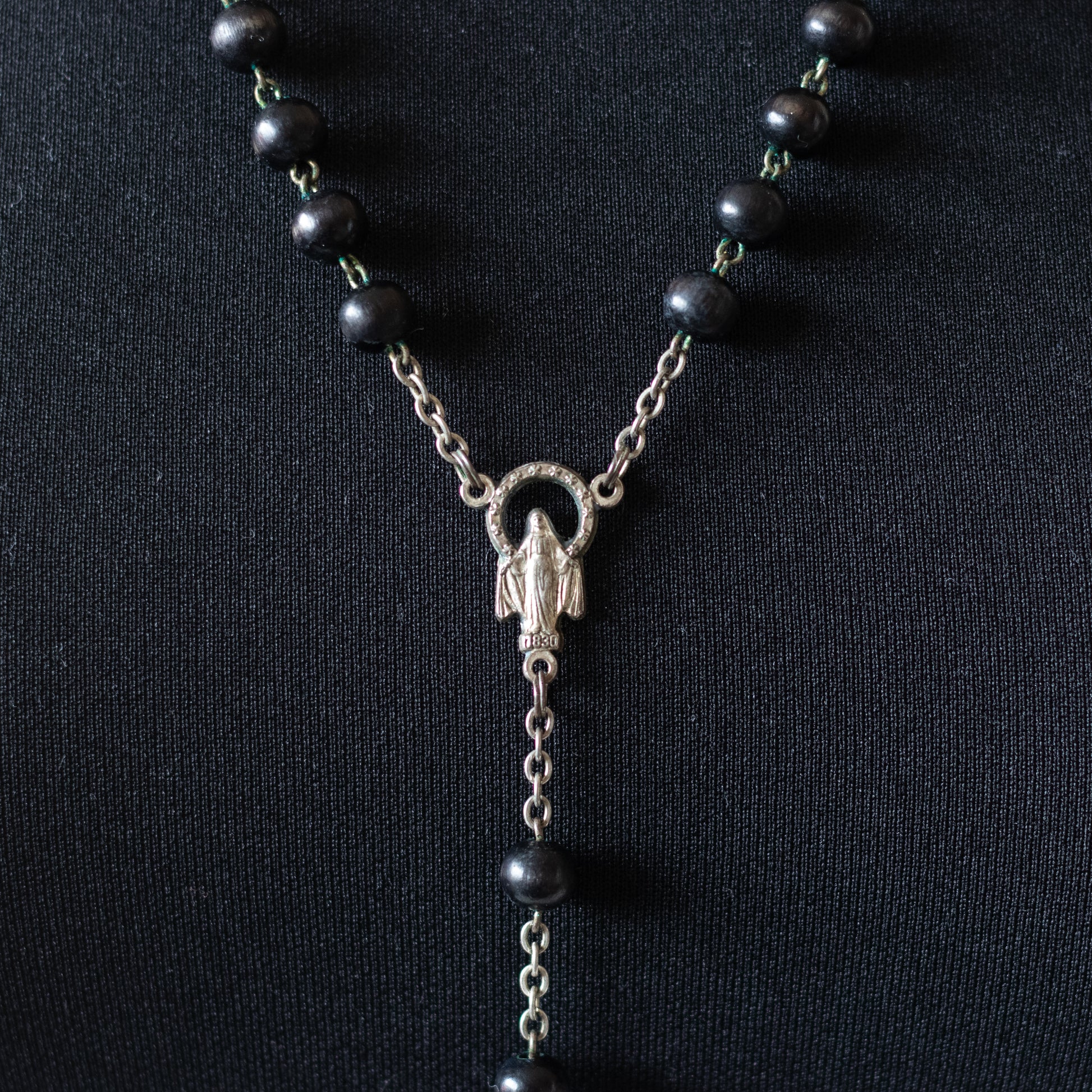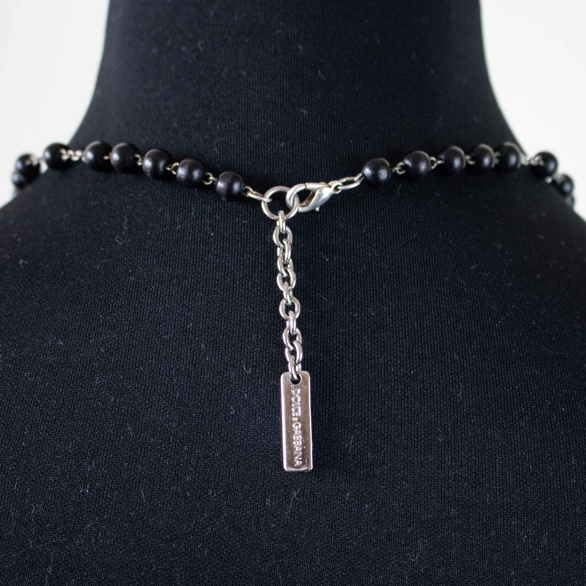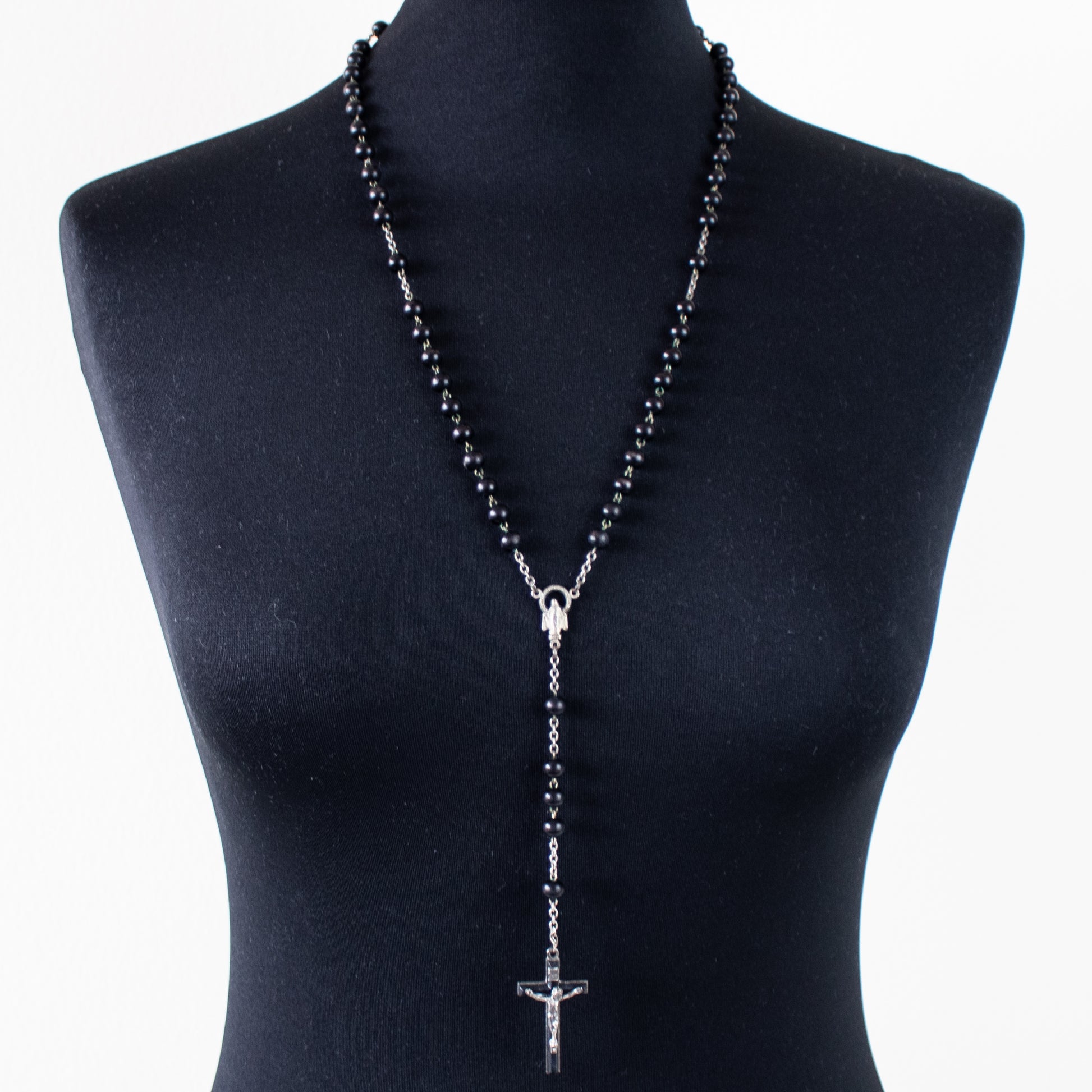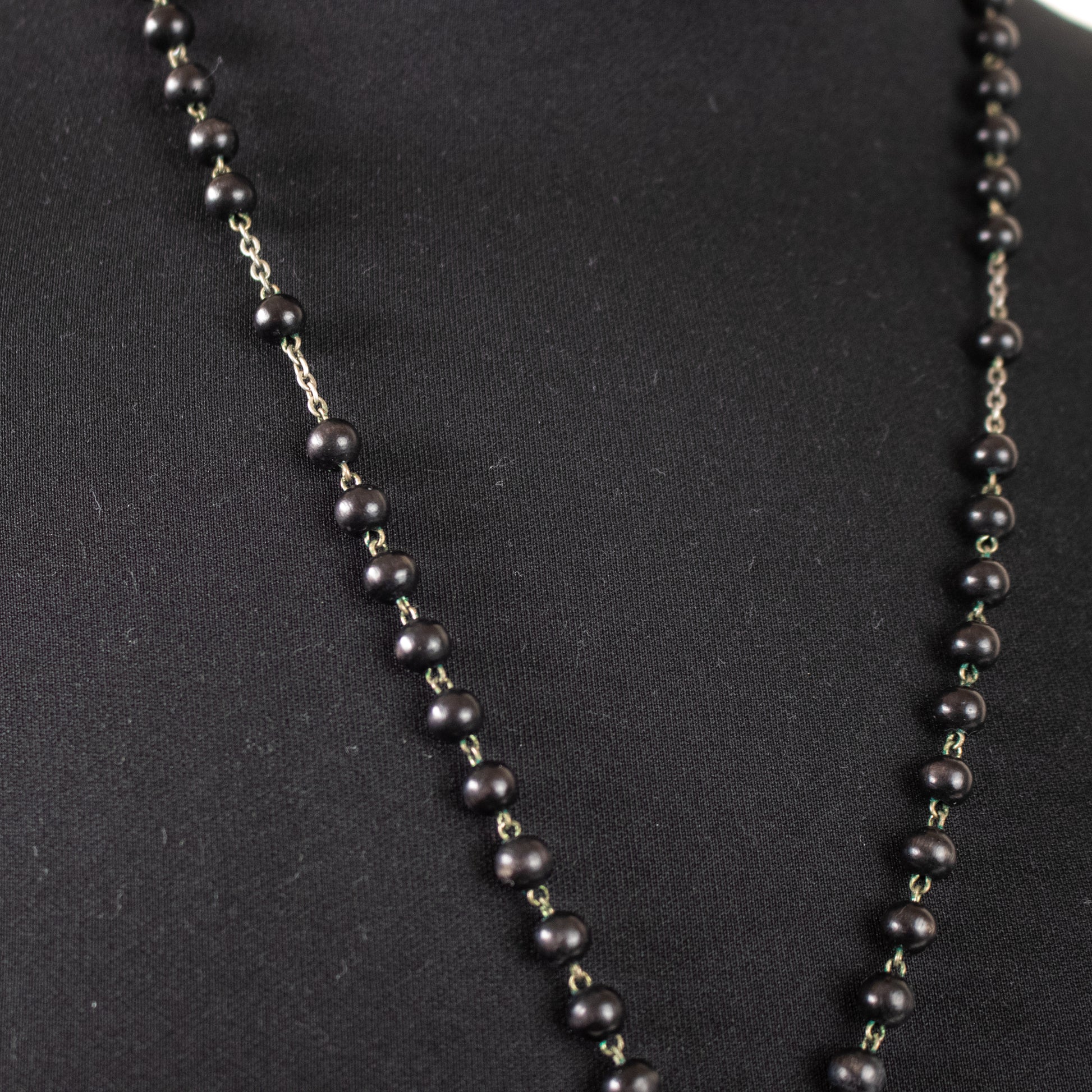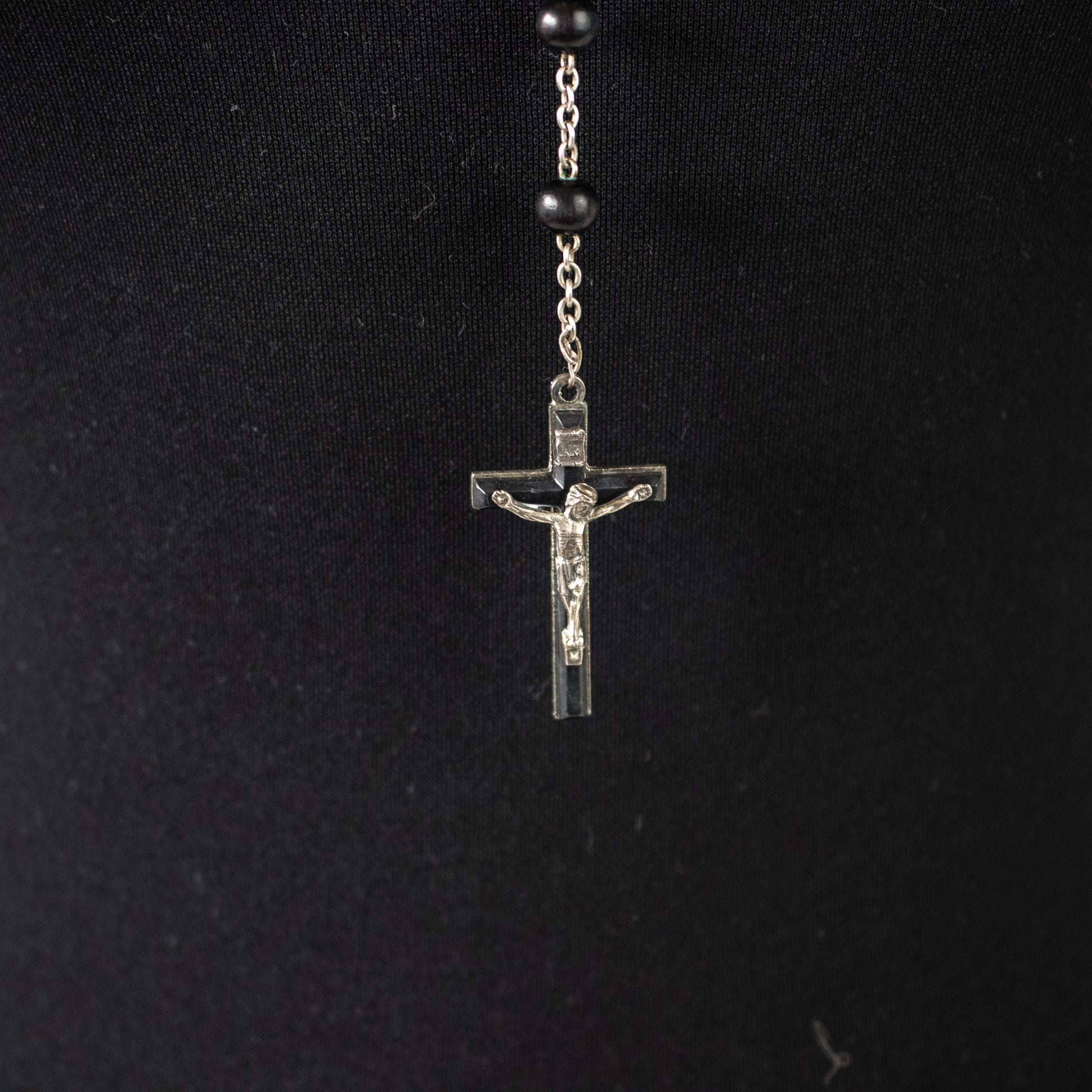 Colar com contas em tom preto e detalhe de uma cruz em tom prateado.