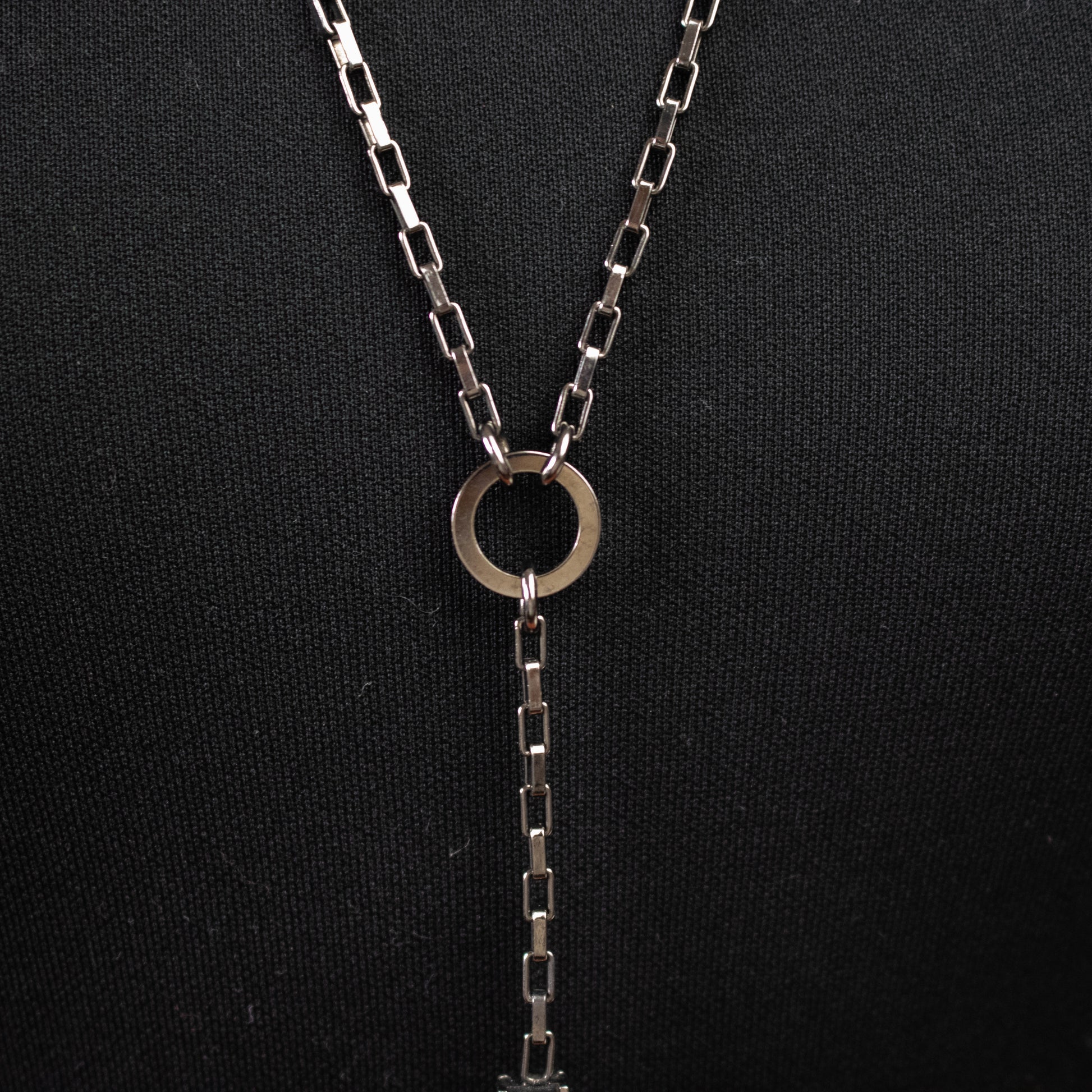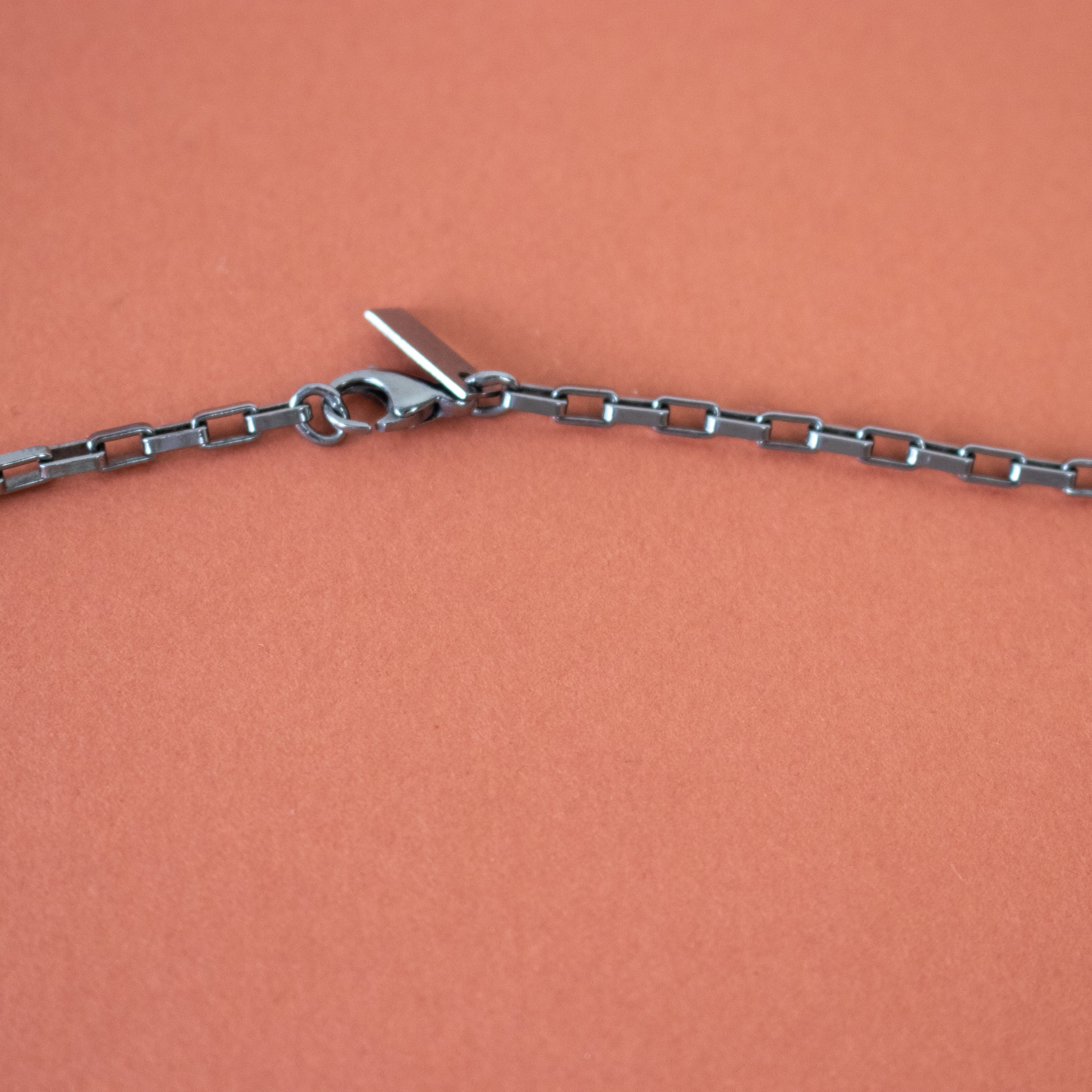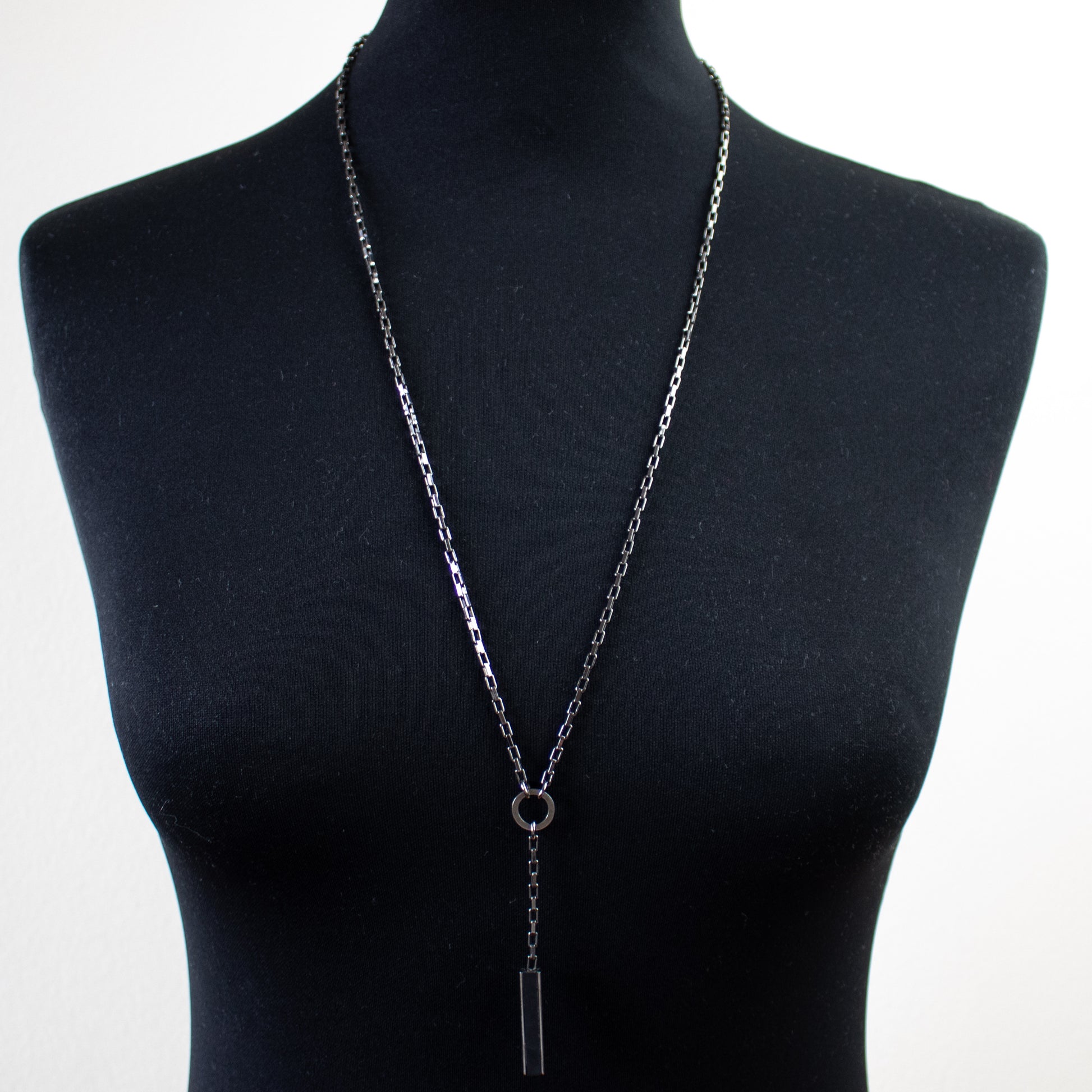 Fio de corrente metalizada em tom prateado, com cruzamento numa delicada argola e pêndulo retângular na frente.