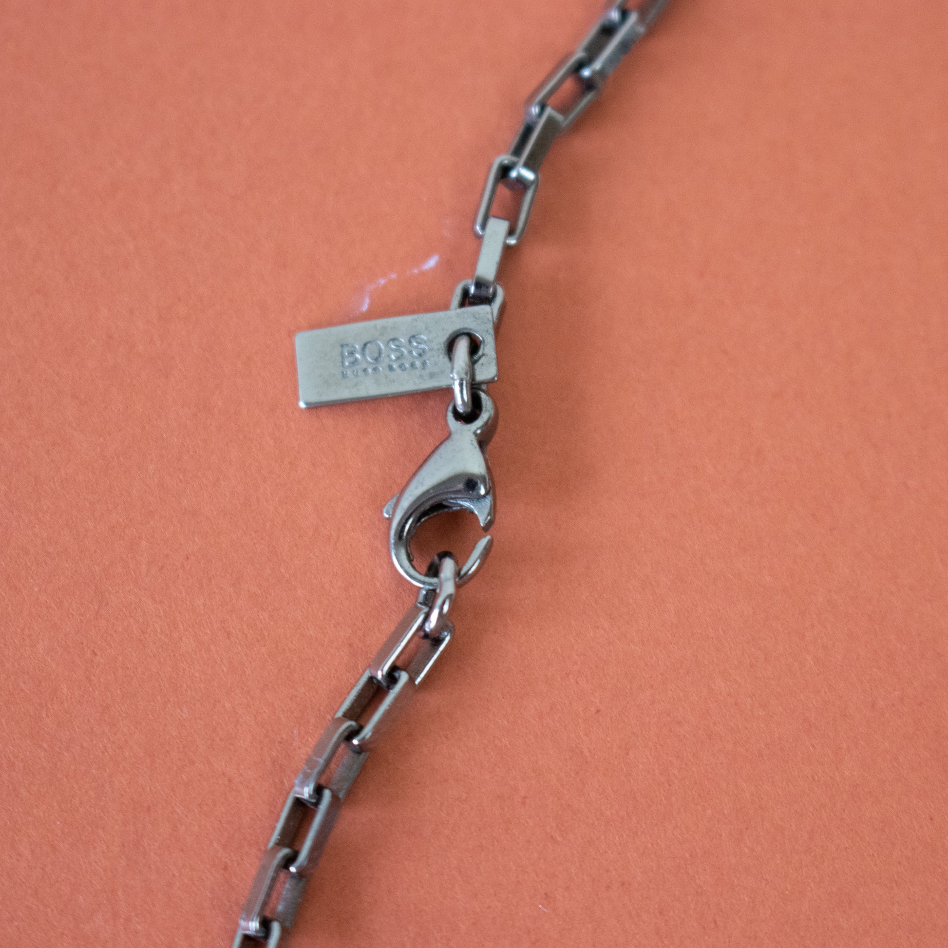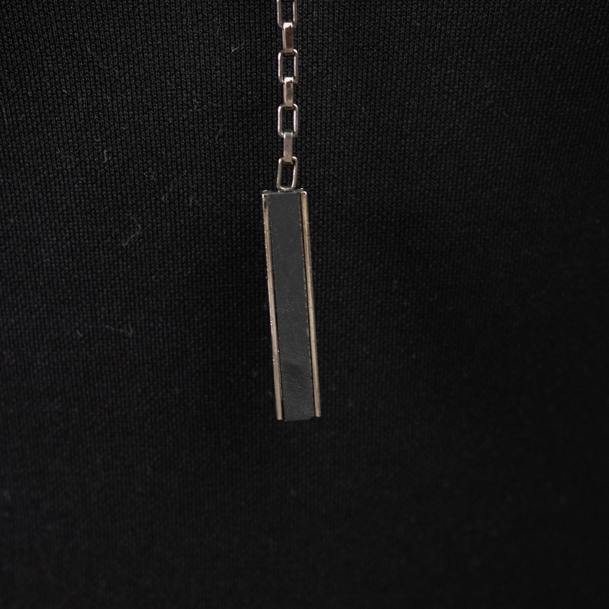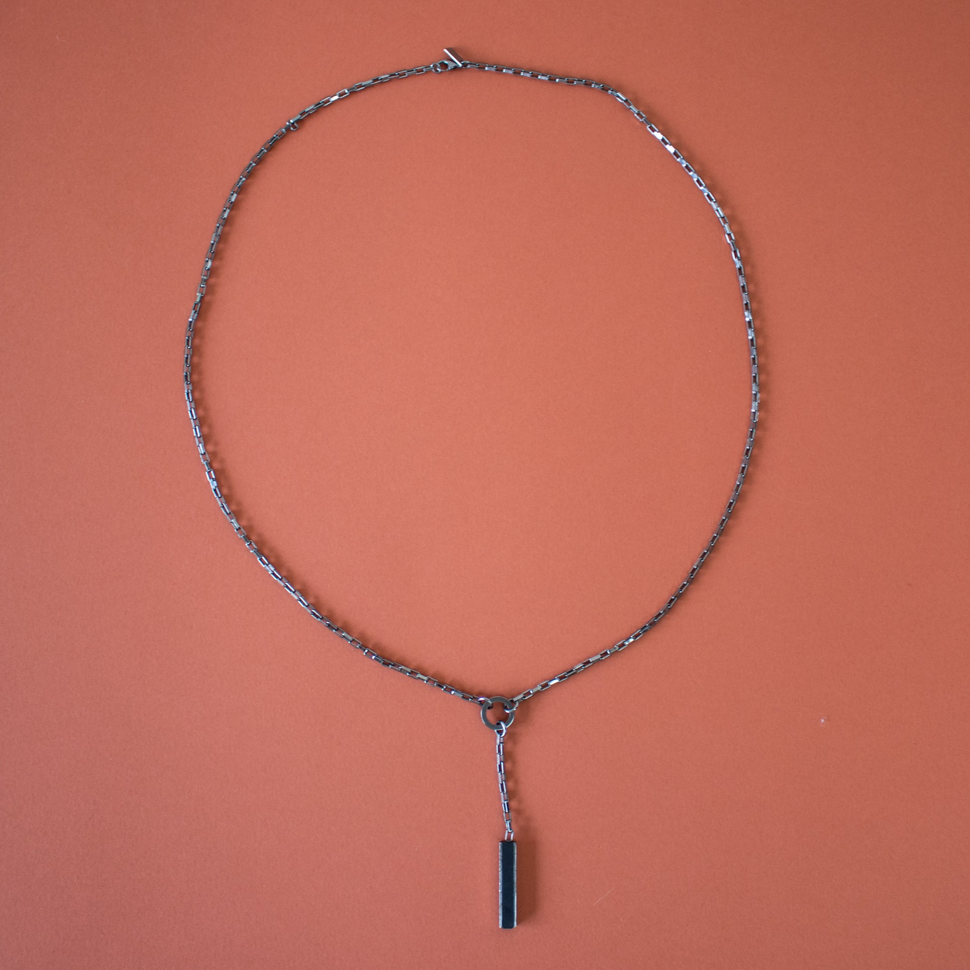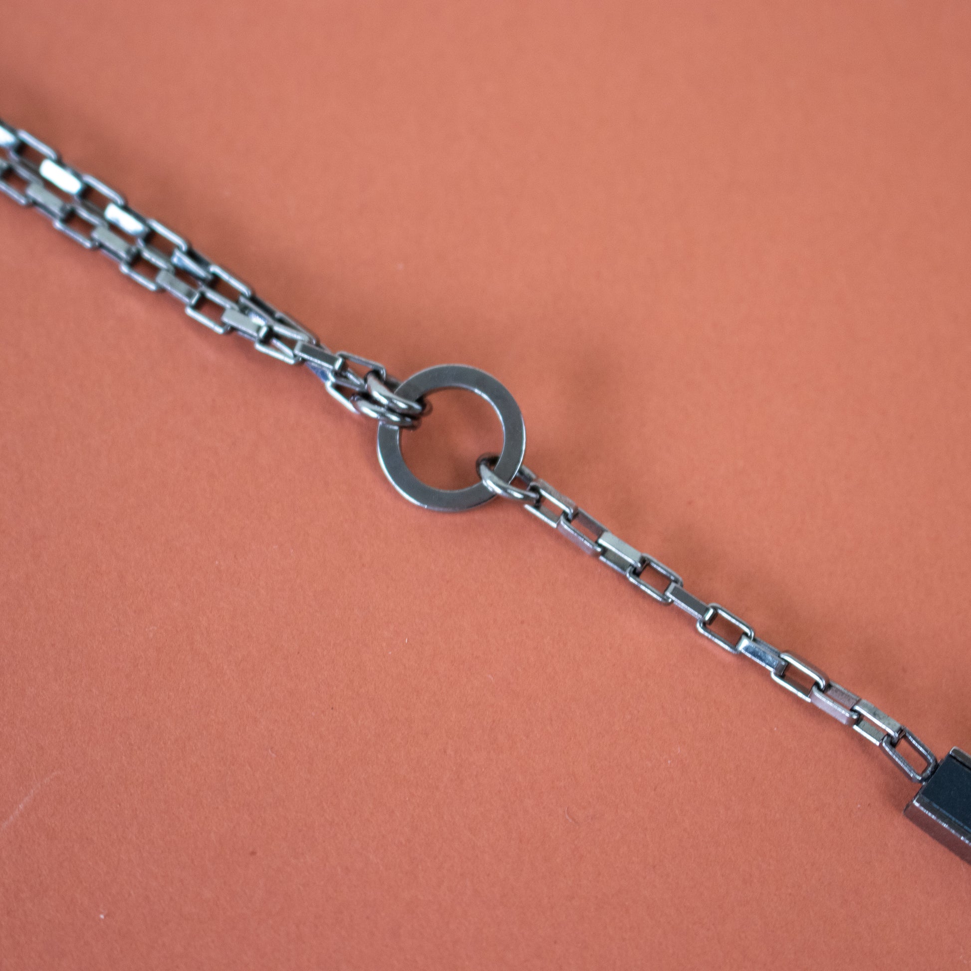 Fio de corrente metalizada em tom prateado, com cruzamento numa delicada argola e pêndulo retângular na frente.