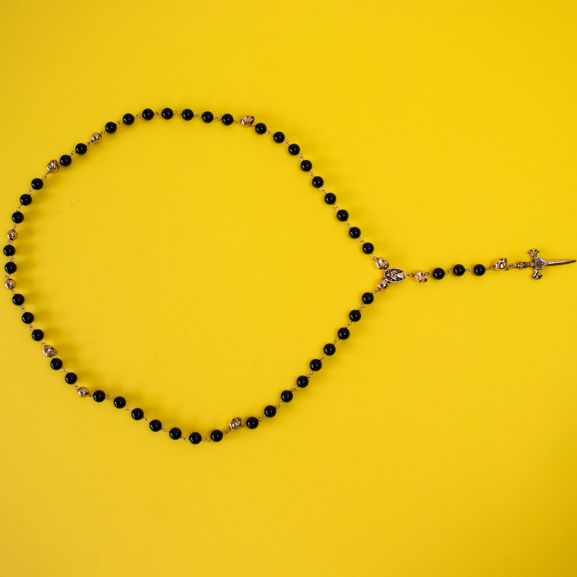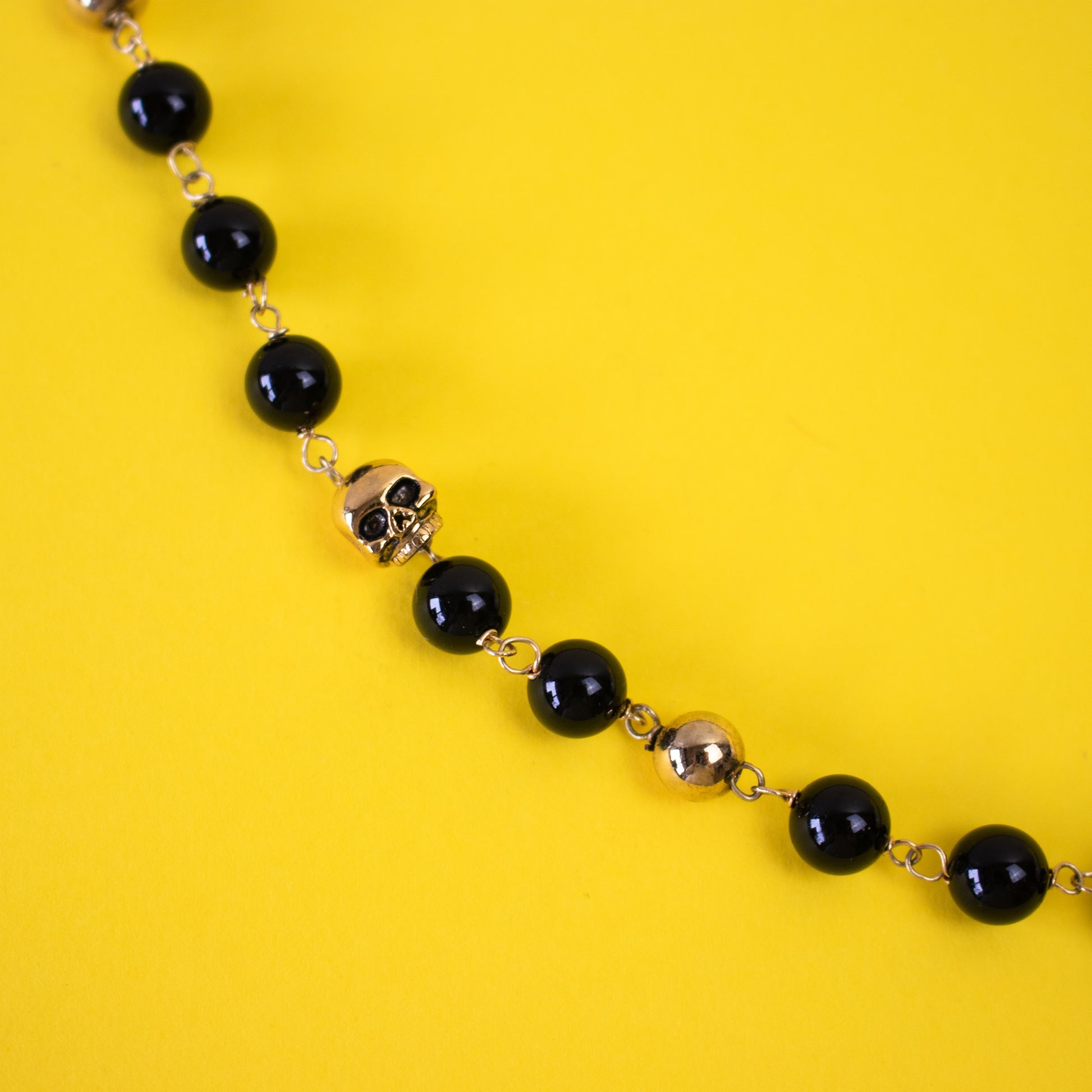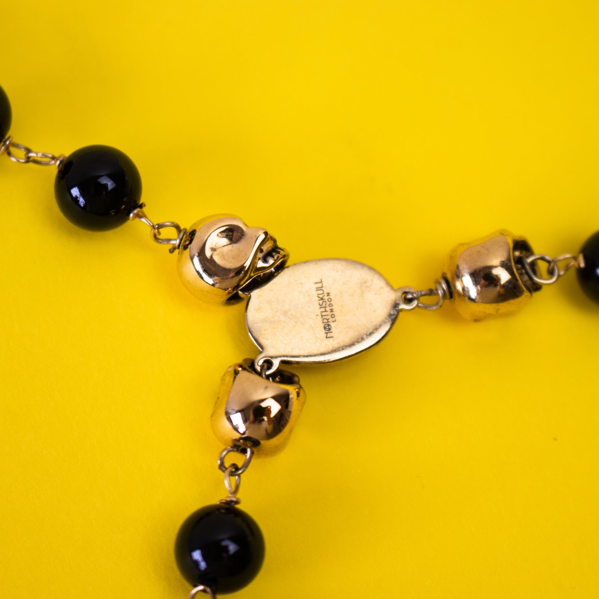 Colar com contas em tom preto e dourado e detalhe de caveira numa cruz.