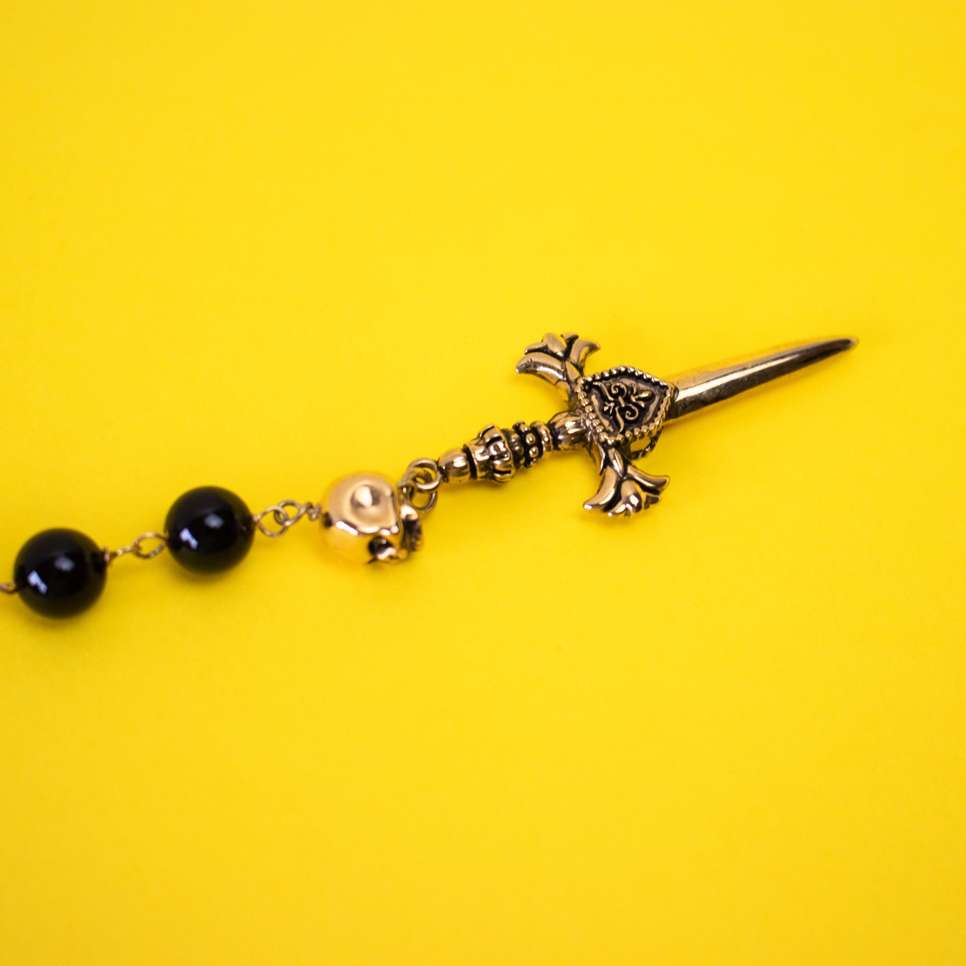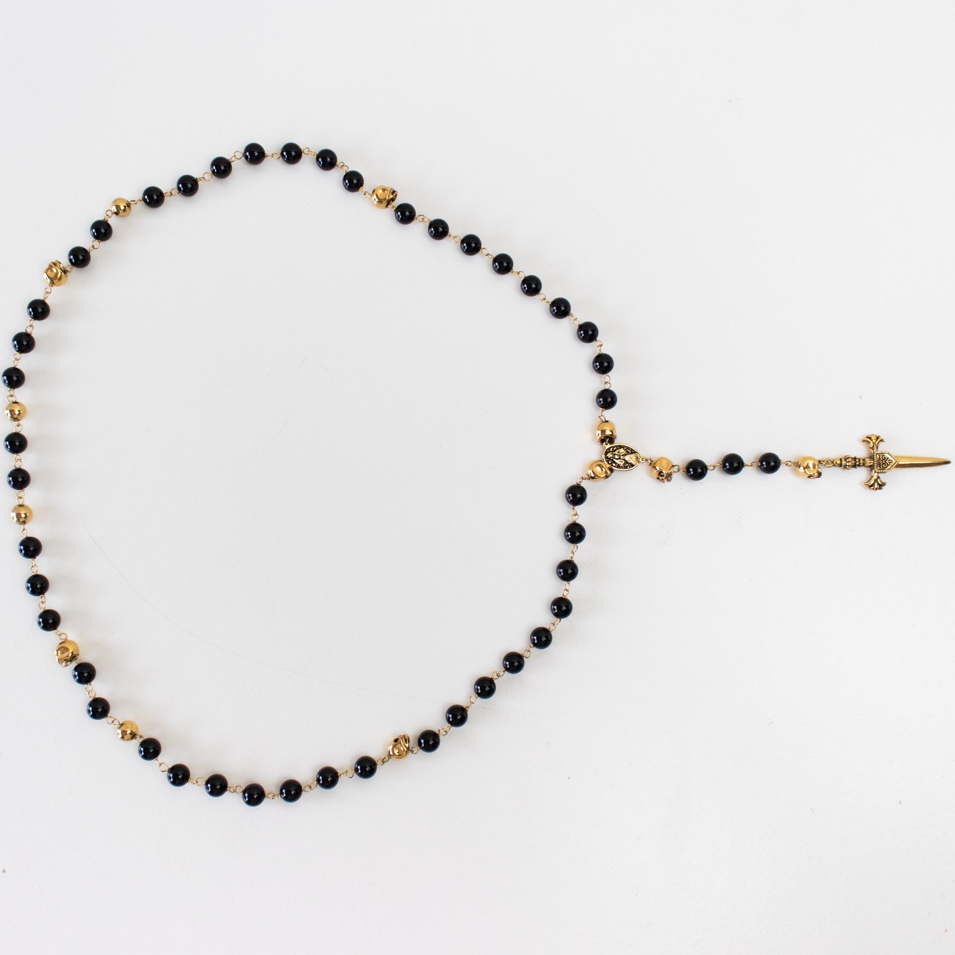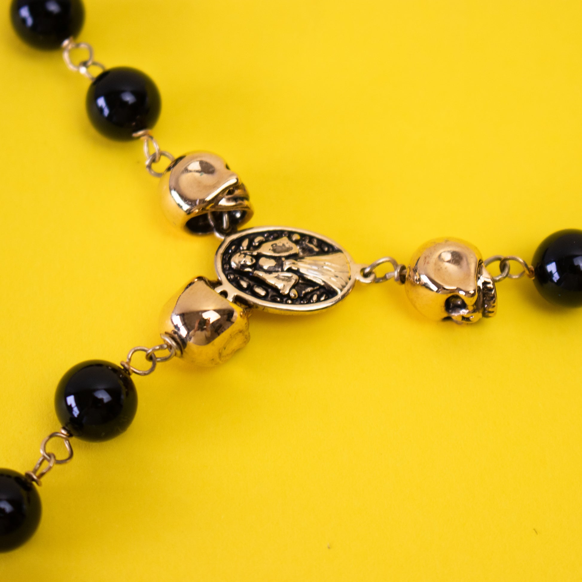 Colar com contas em tom preto e dourado e detalhe de caveira numa cruz.