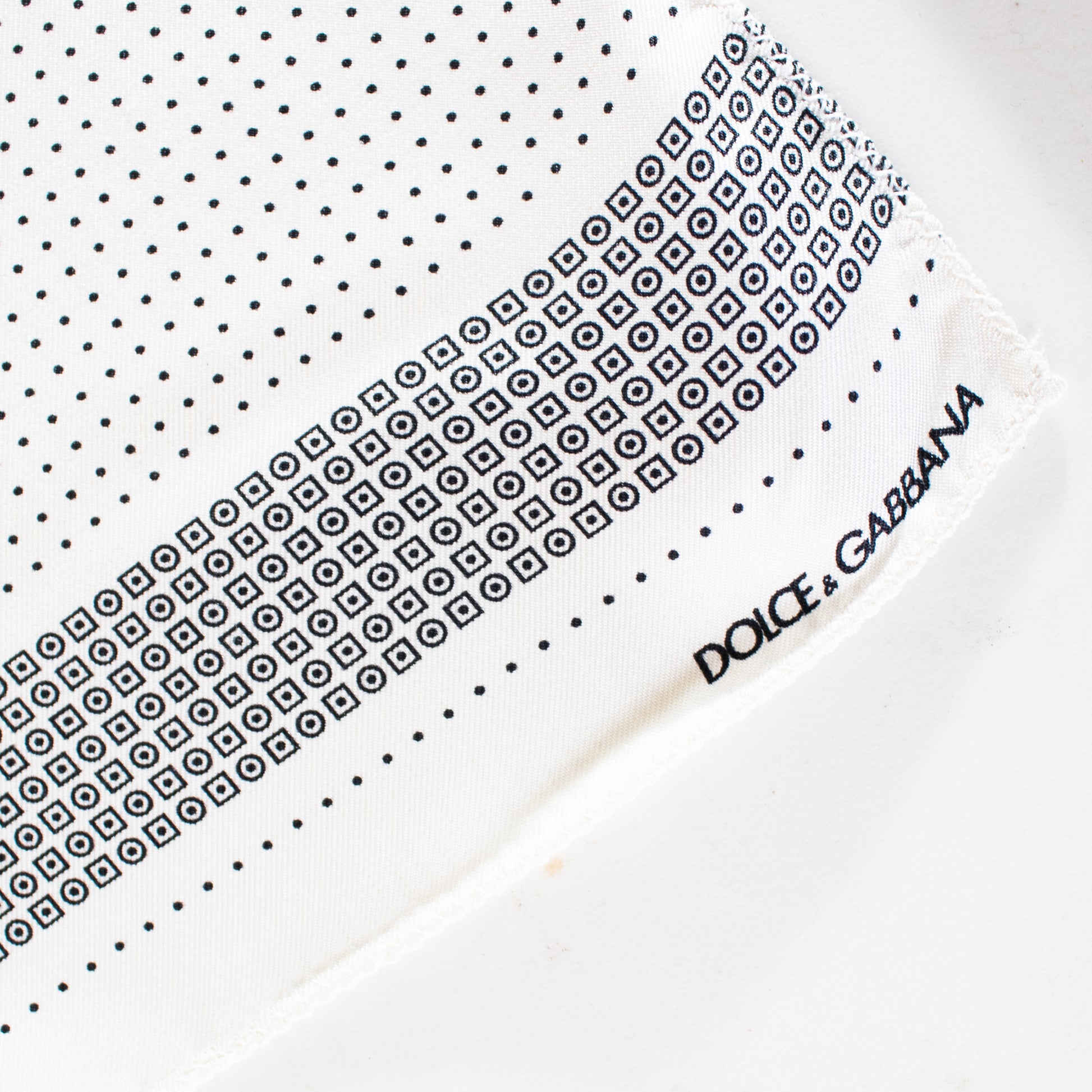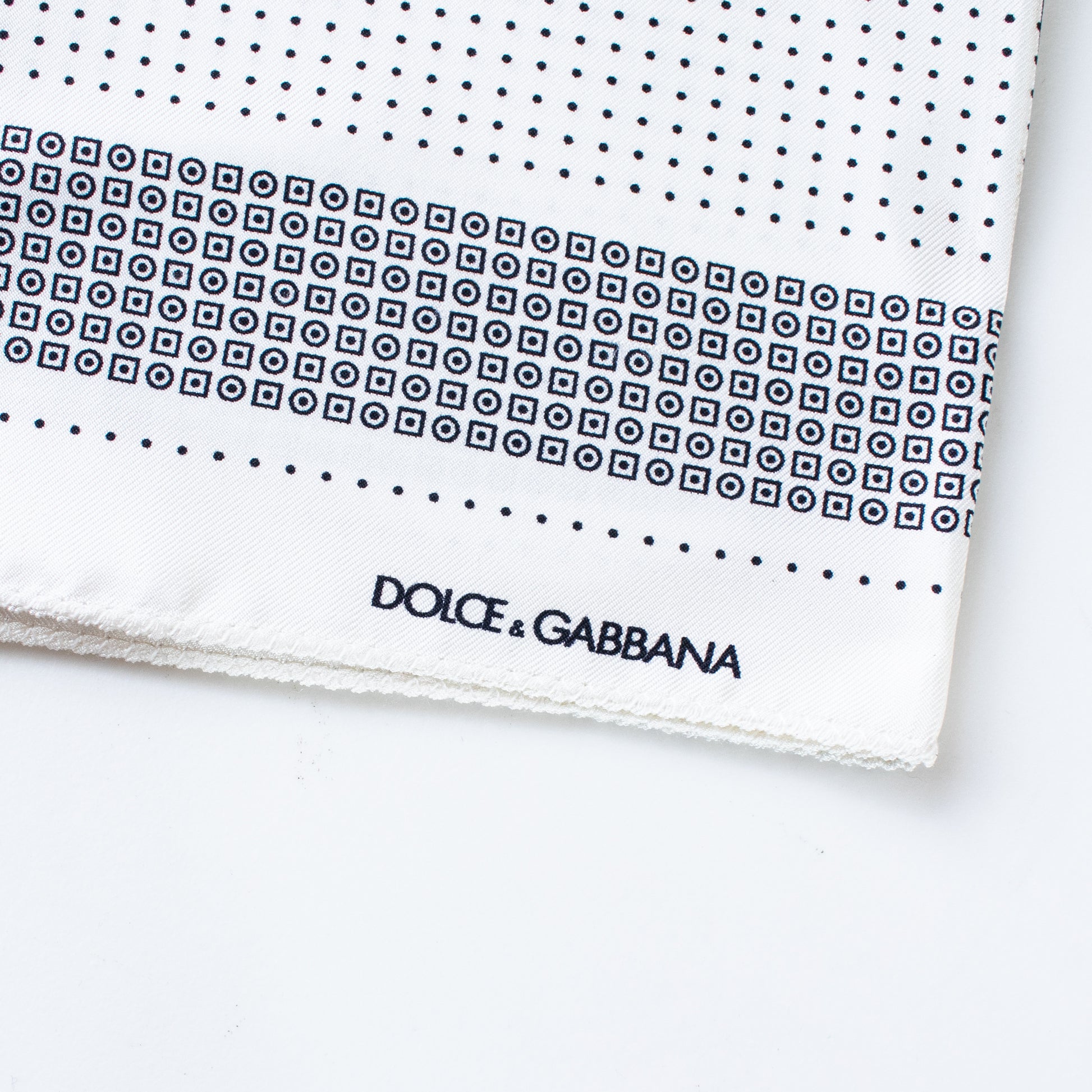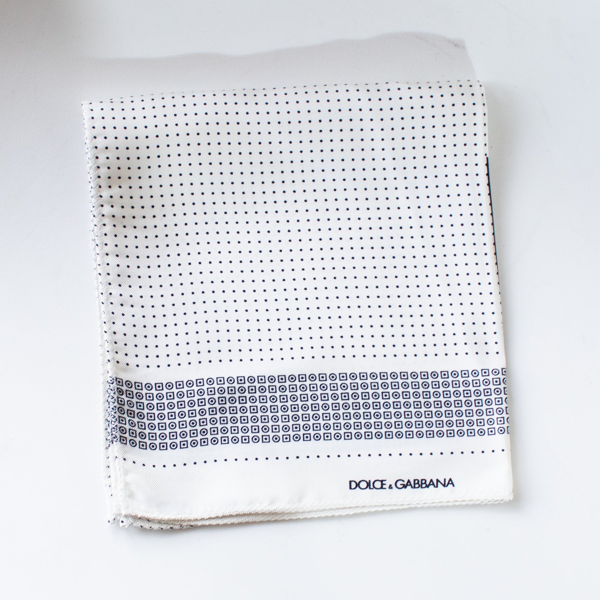 Lenço em seda com fundo branco e detalhes e logotipo D&G azuis.