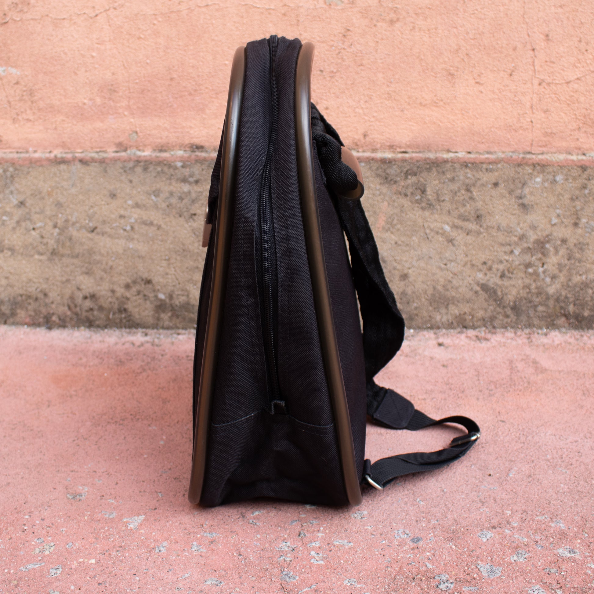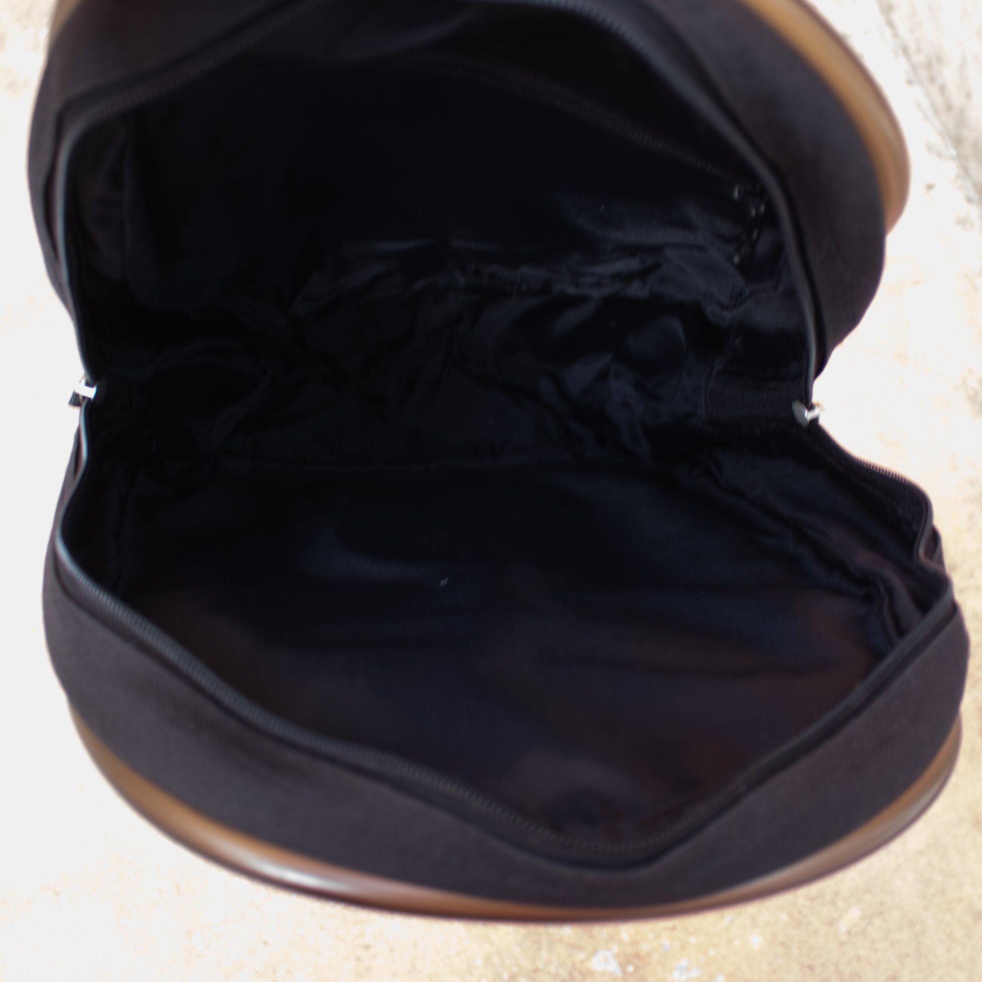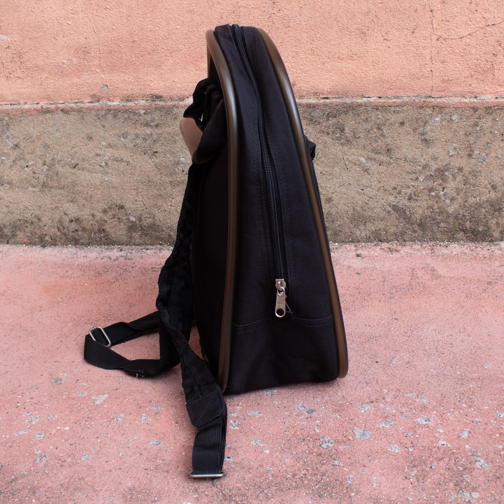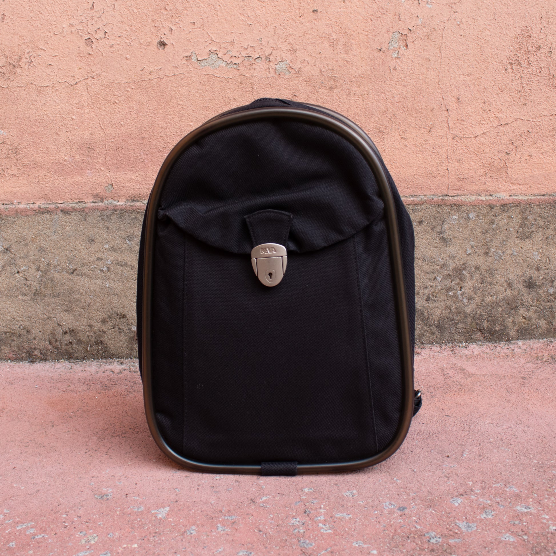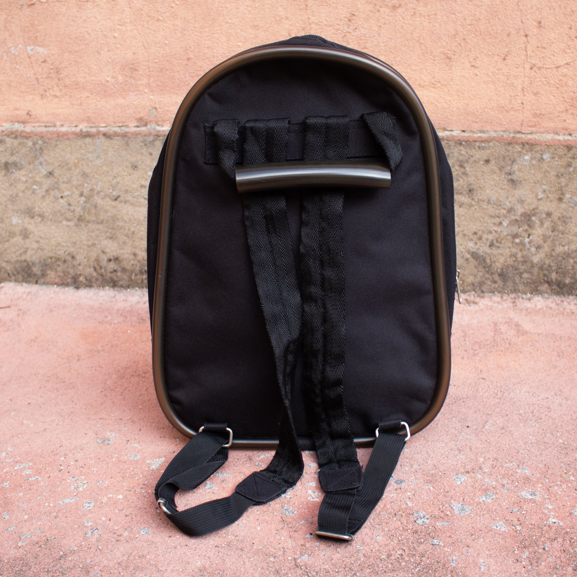 Mochila com alças de tecido pretas com pormenor de borracha em volta da mesma e na alça de mão. Fecho de correr. Bolso exterior com fecho metalizado fosco.
