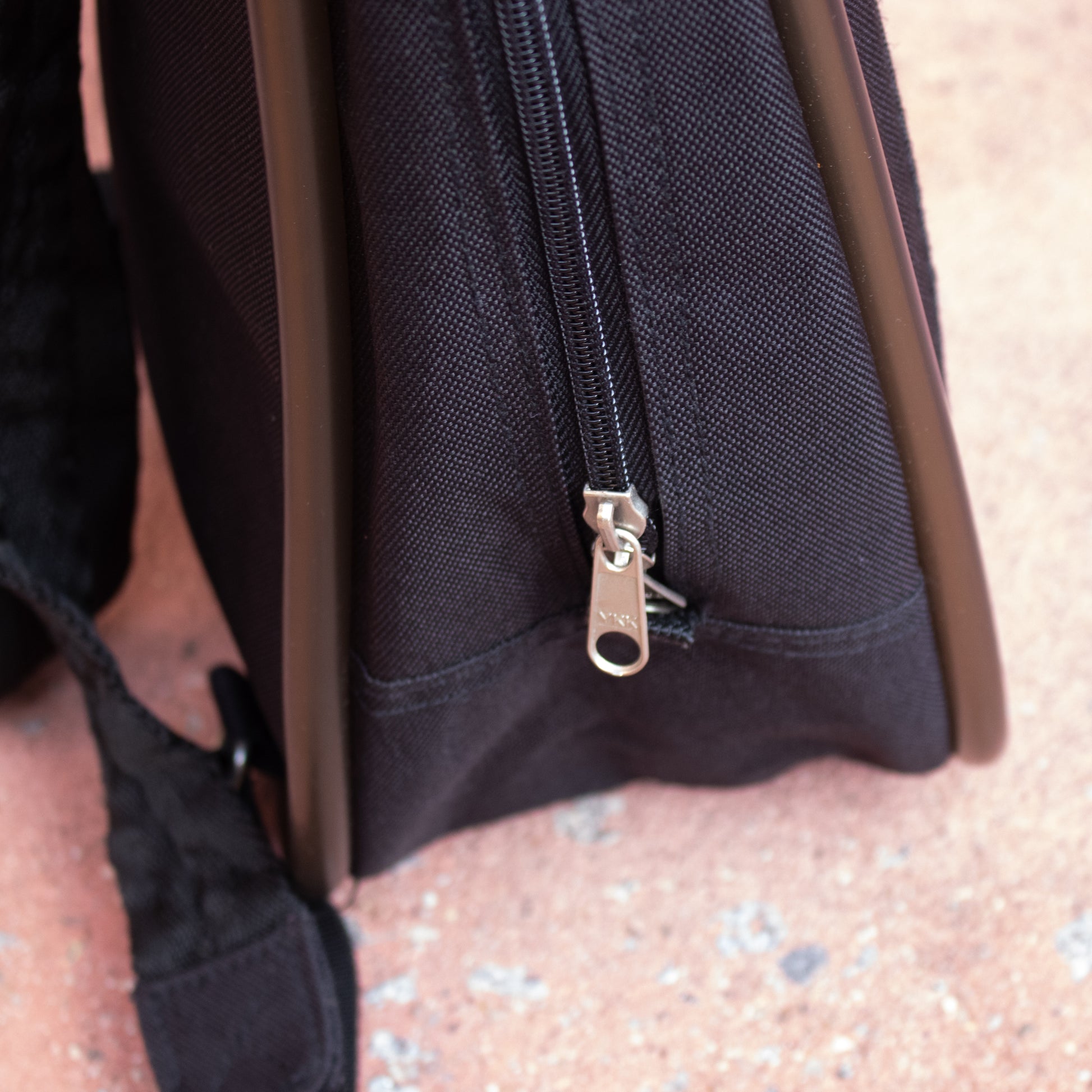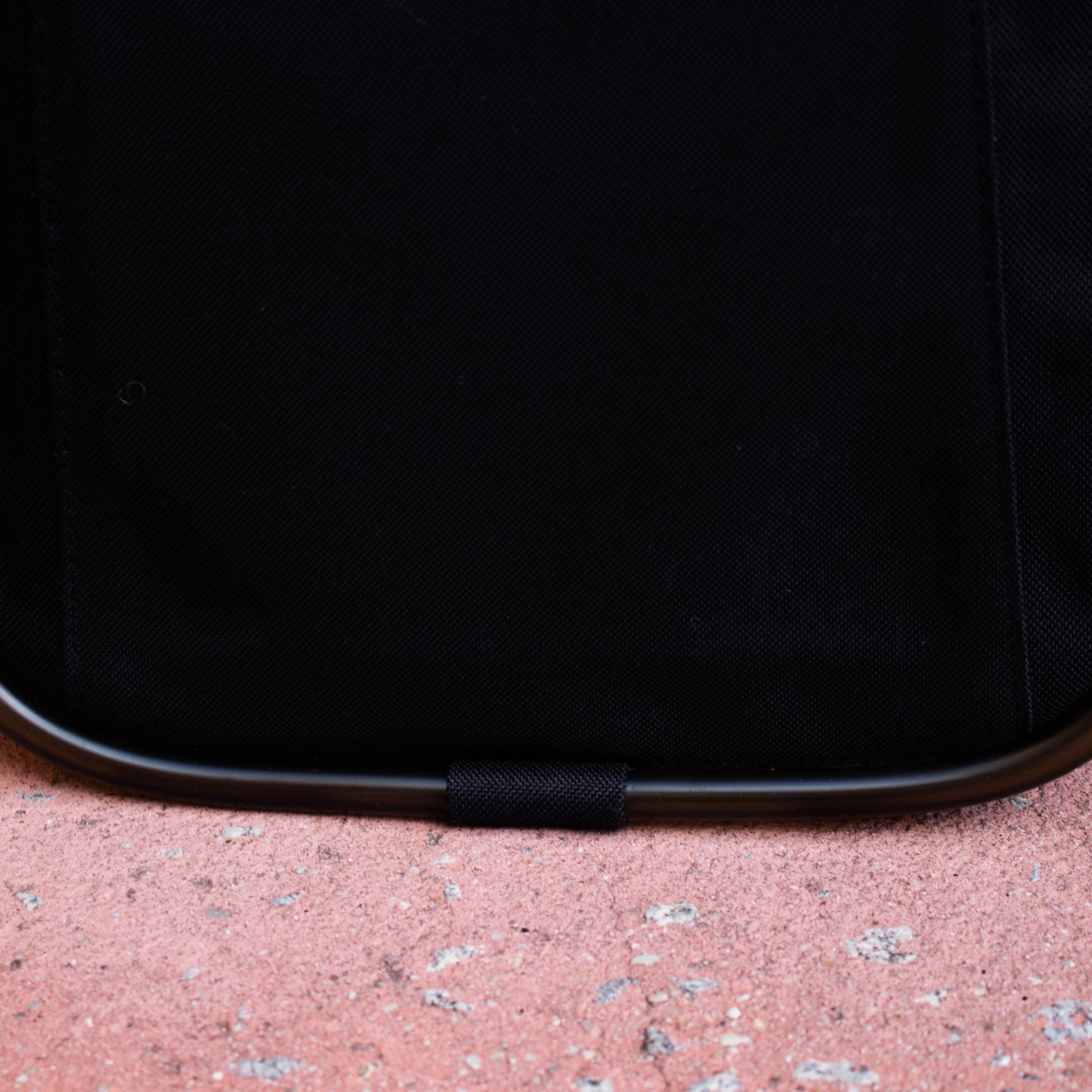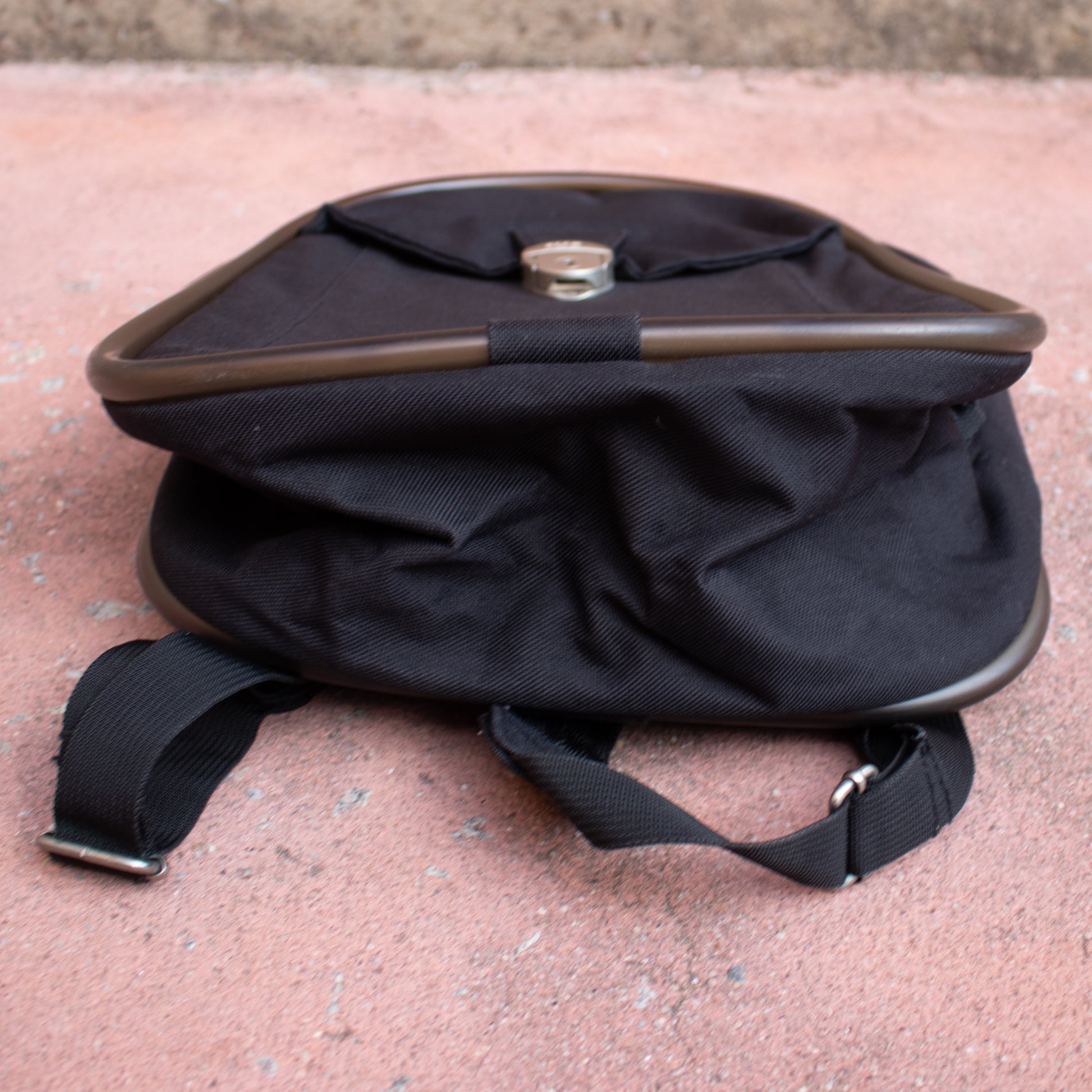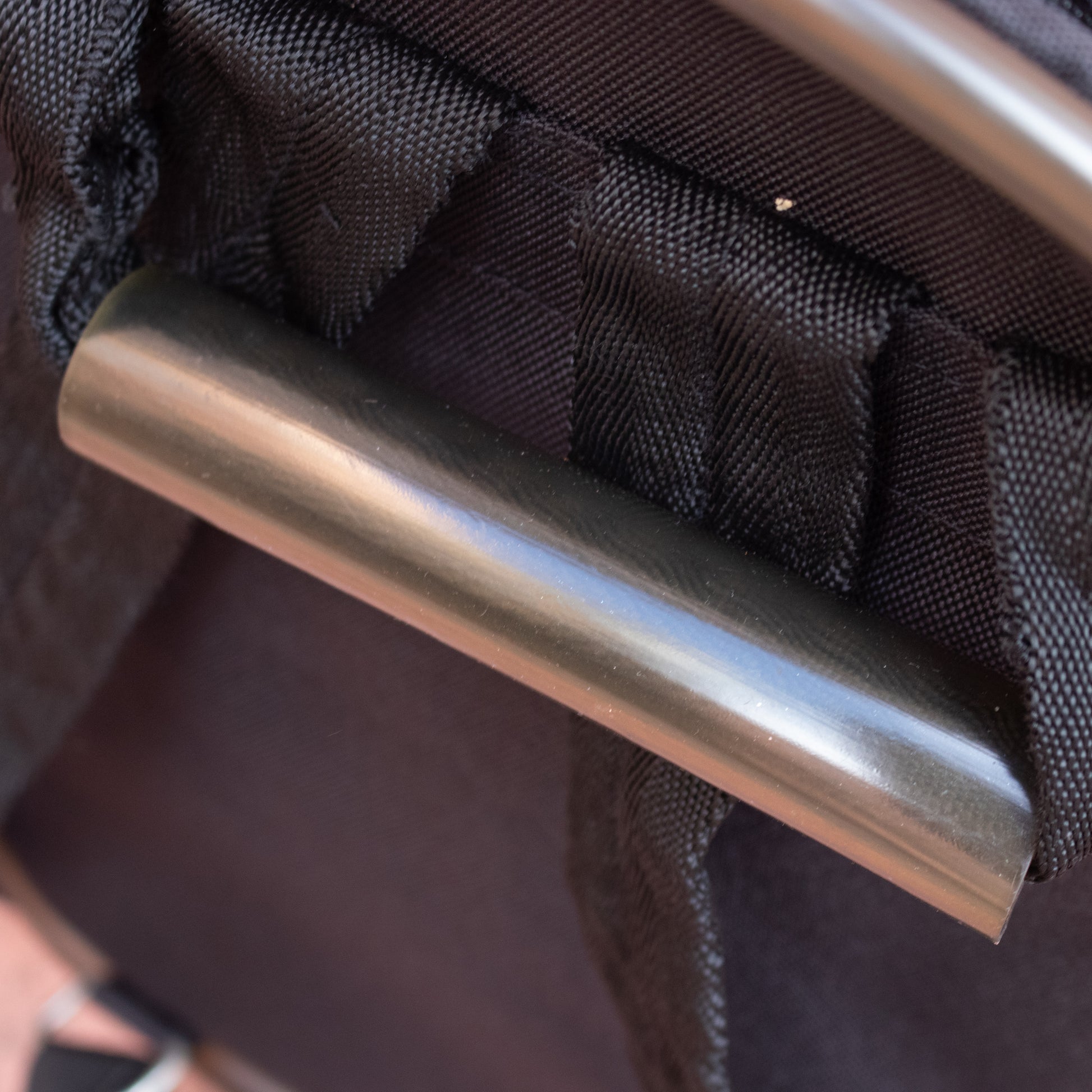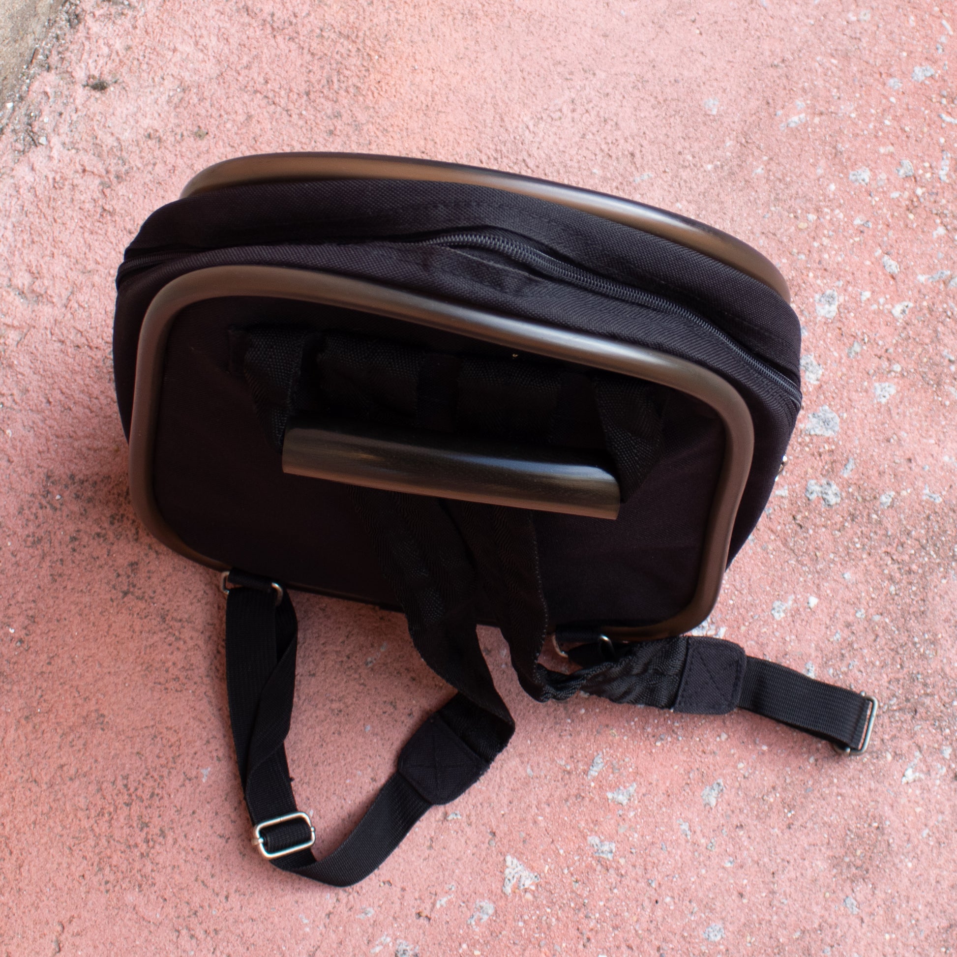 Mochila com alças de tecido pretas com pormenor de borracha em volta da mesma e na alça de mão. Fecho de correr. Bolso exterior com fecho metalizado fosco.