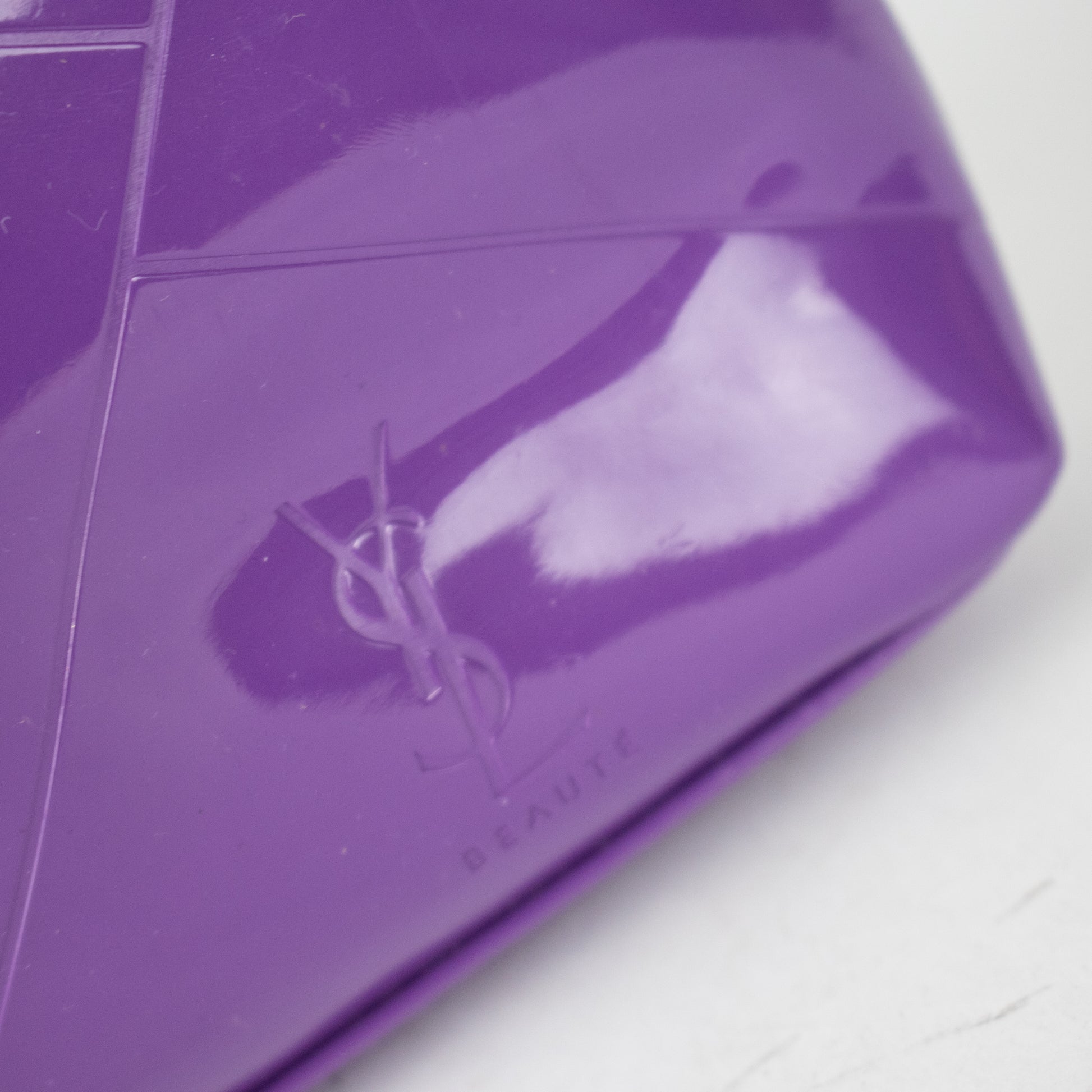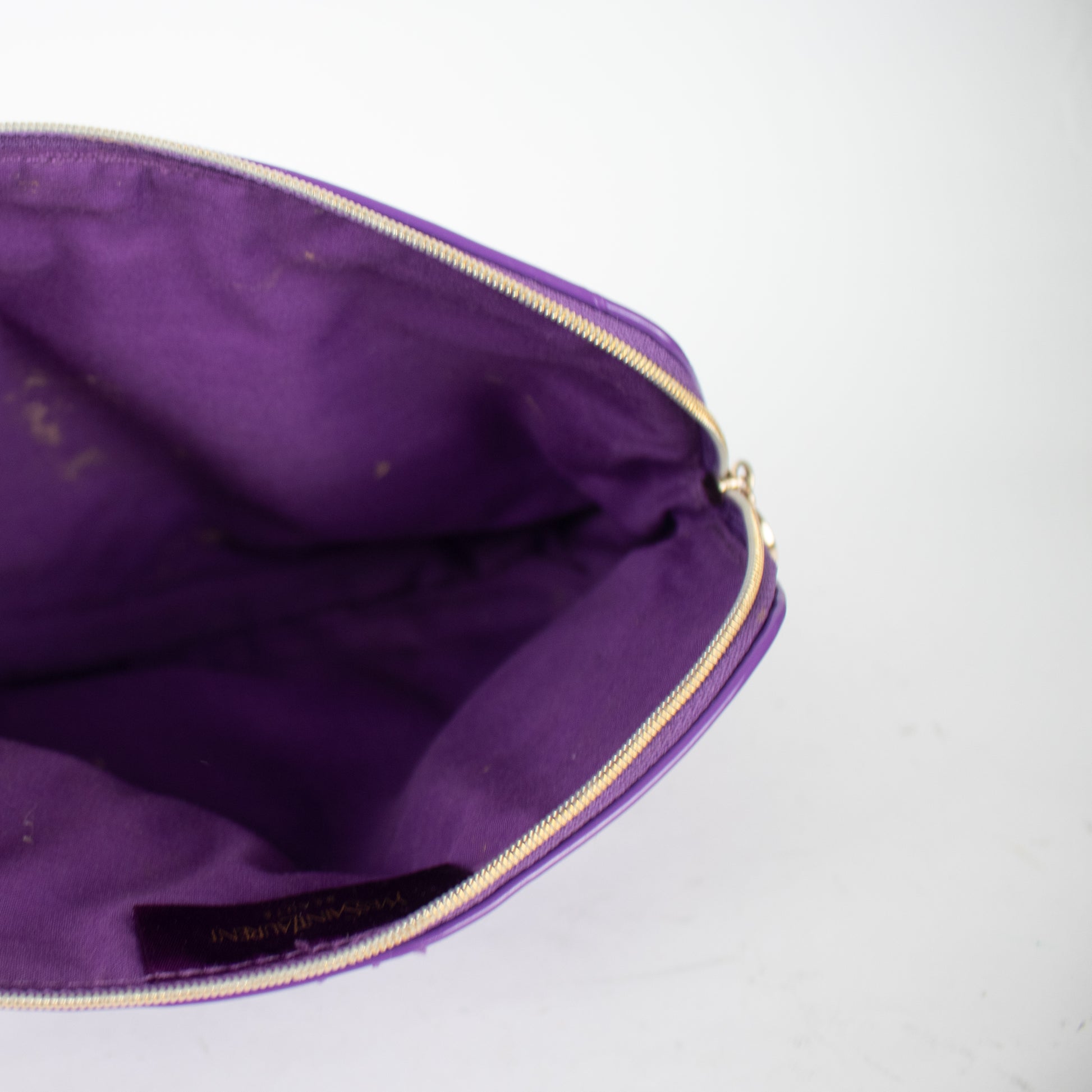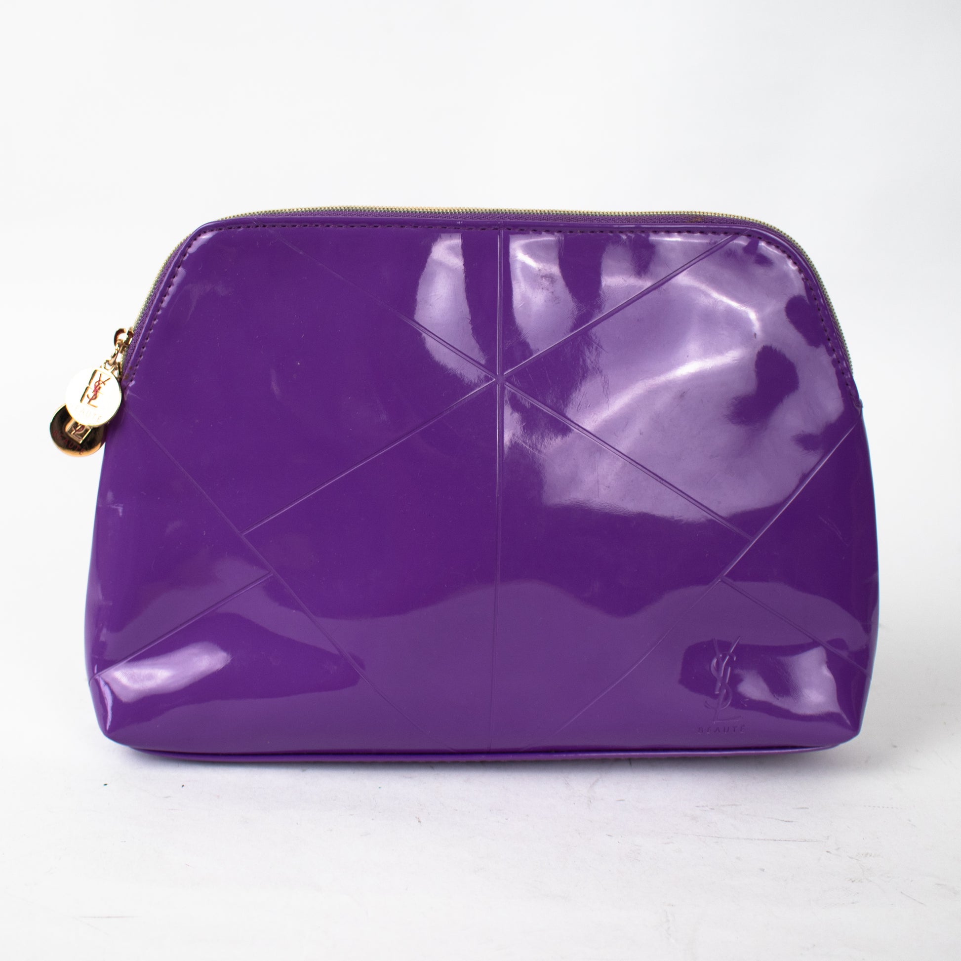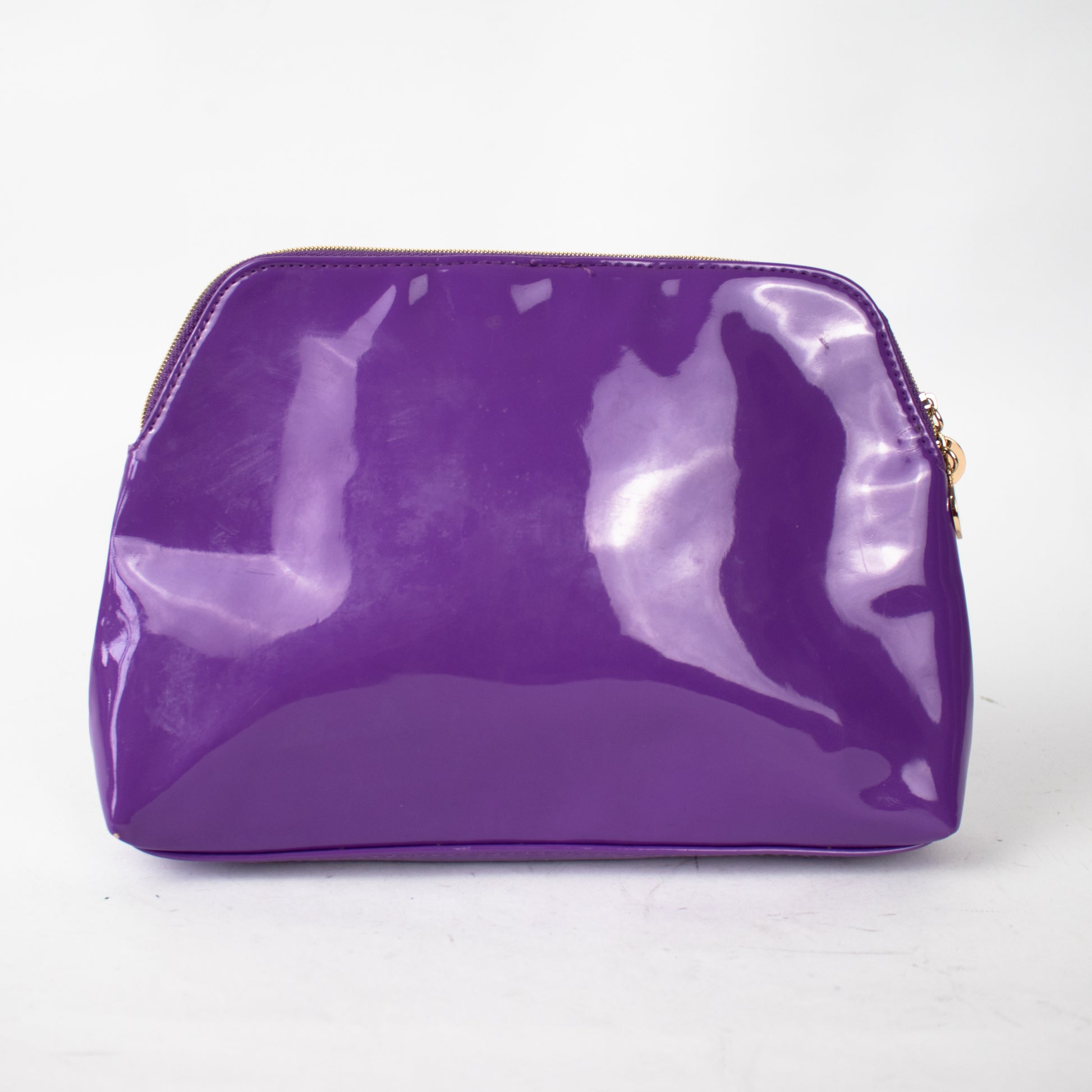Necessaire de pele em tom roxo, em formato de concha e fecho éclair na parte superior. Detalhe decorativo correspondente ao logo, metálico em tom dourado