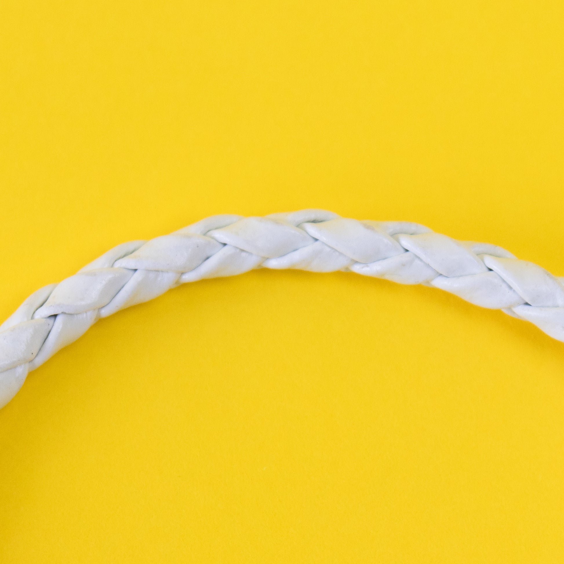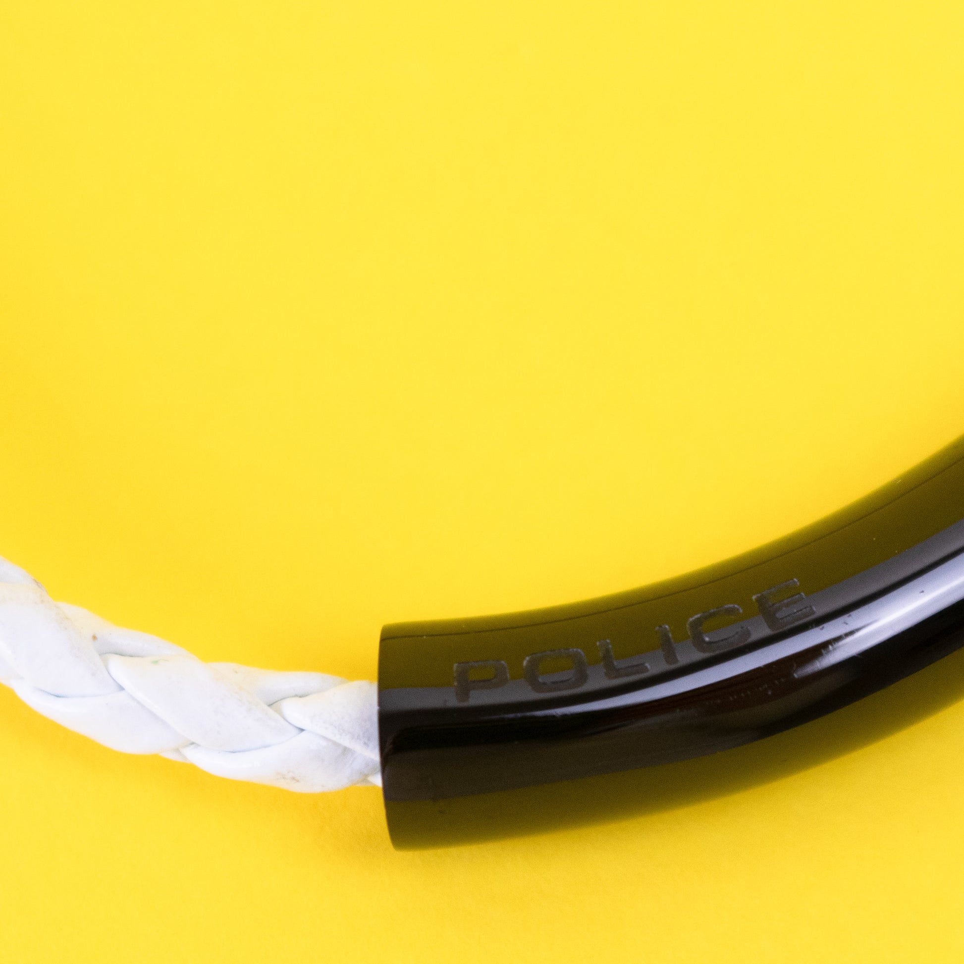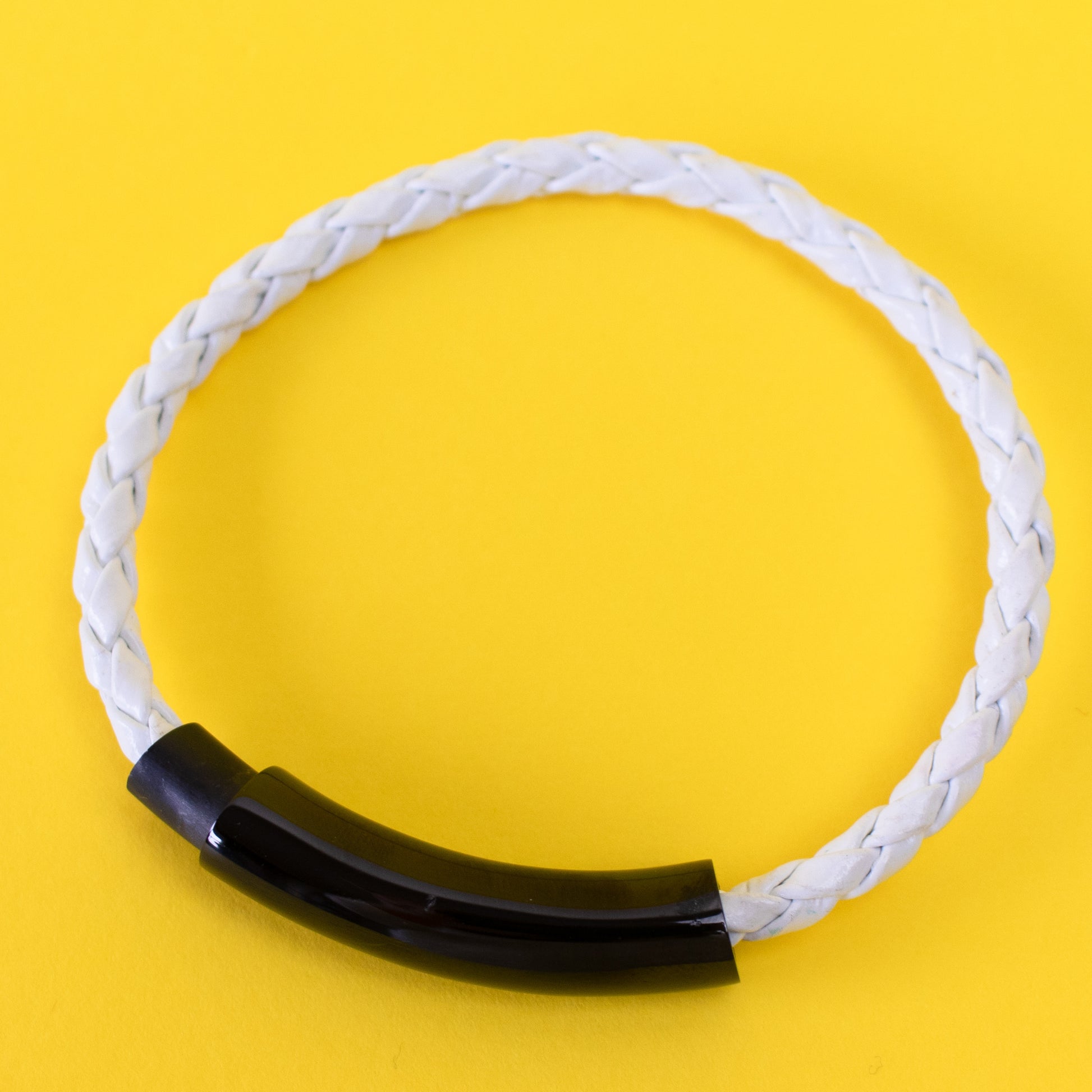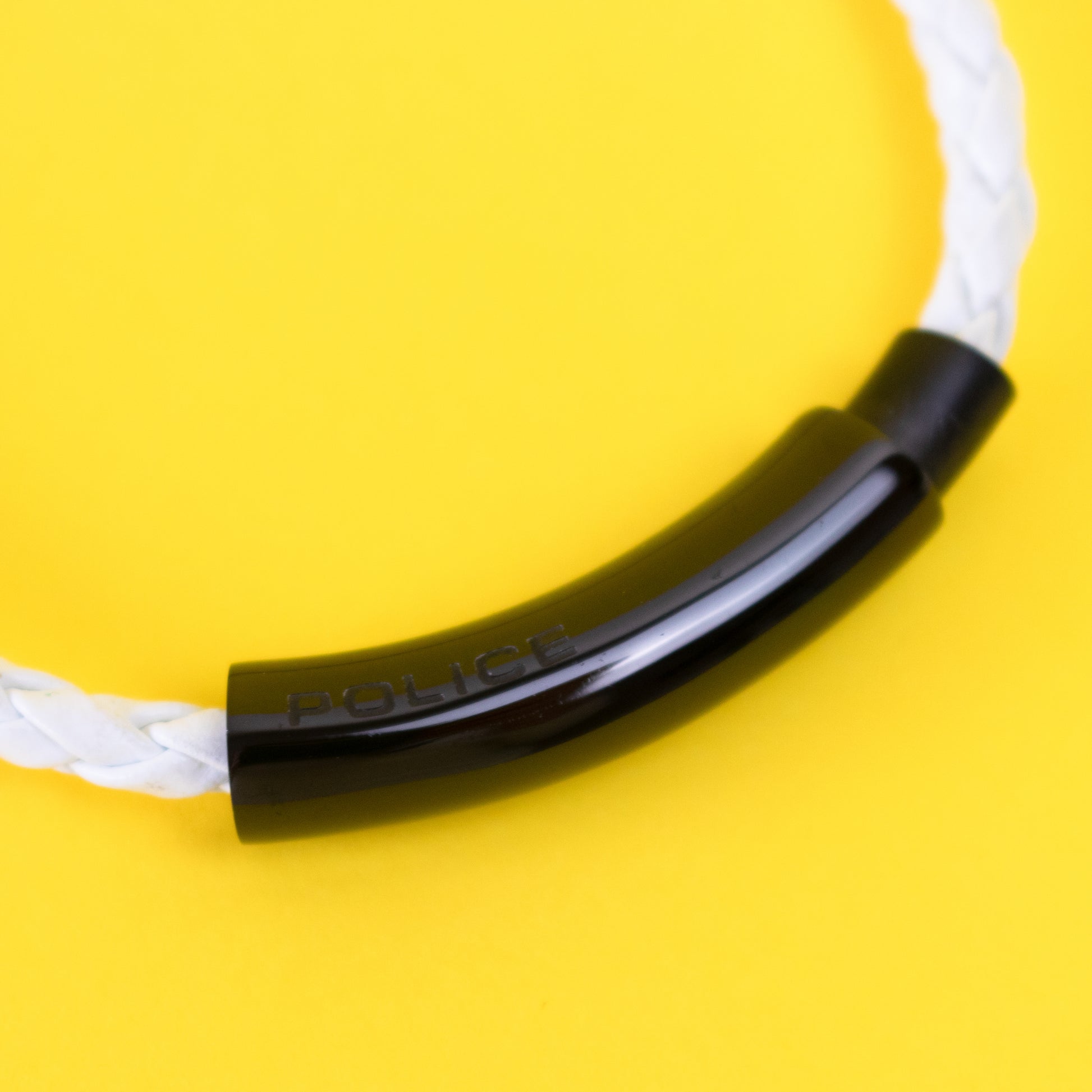 Pulseira fina entrançada em tom branco. Aplicação de borracha em tom preto com gravação da marca.