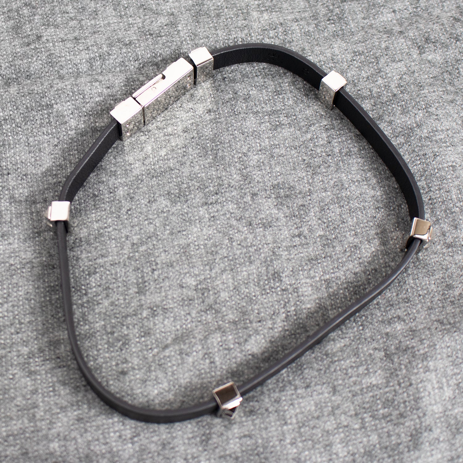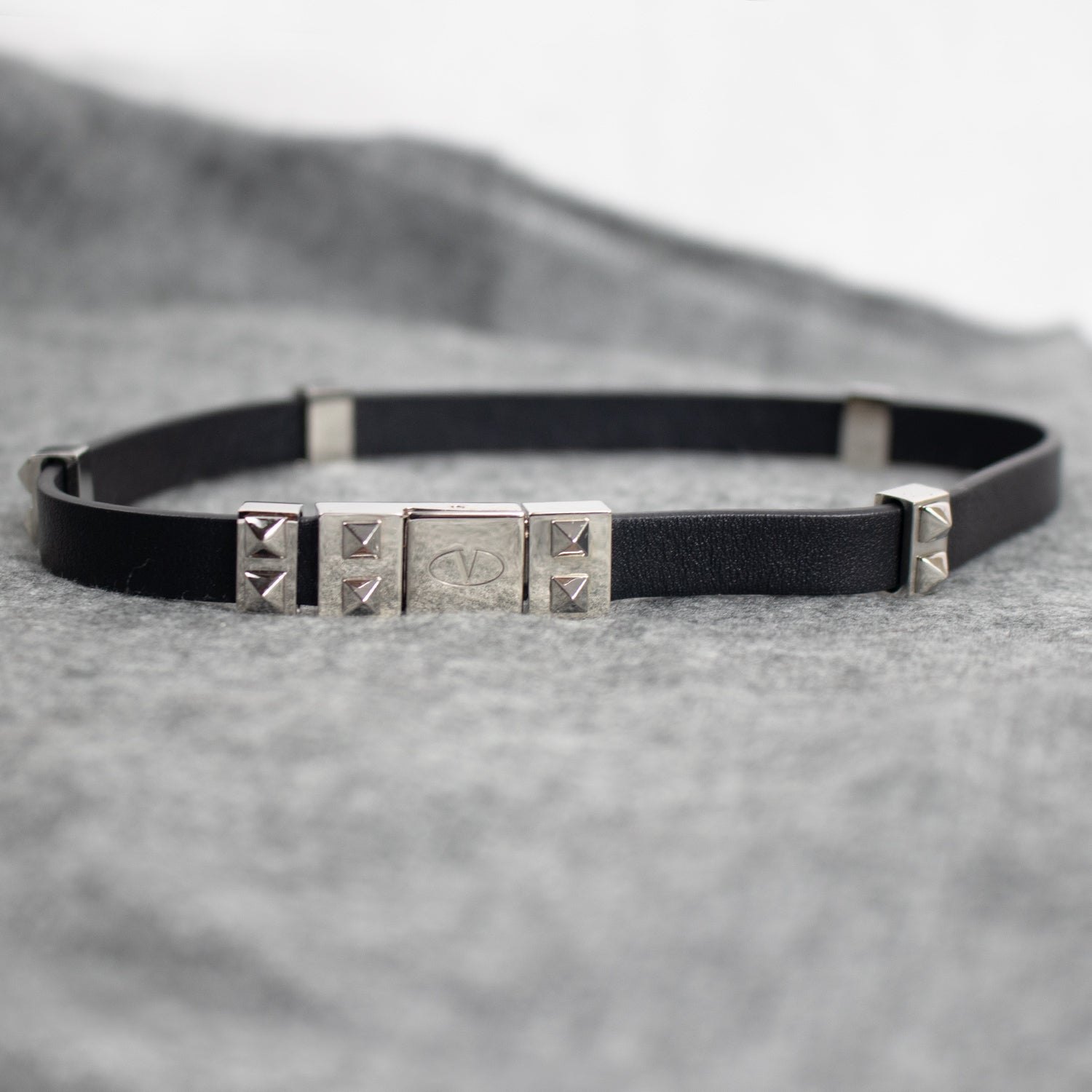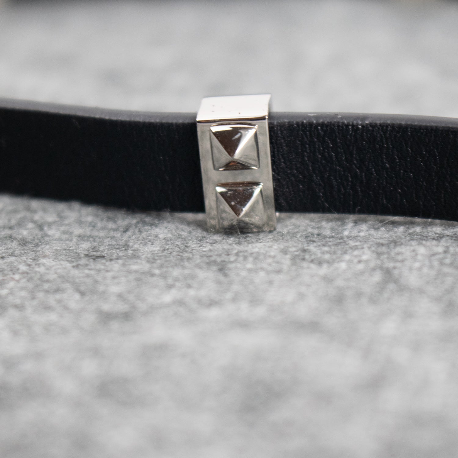 Pulseira fina em aplicação de borracha em tom preto com detalhes dispersos metalizados em tom prateado.