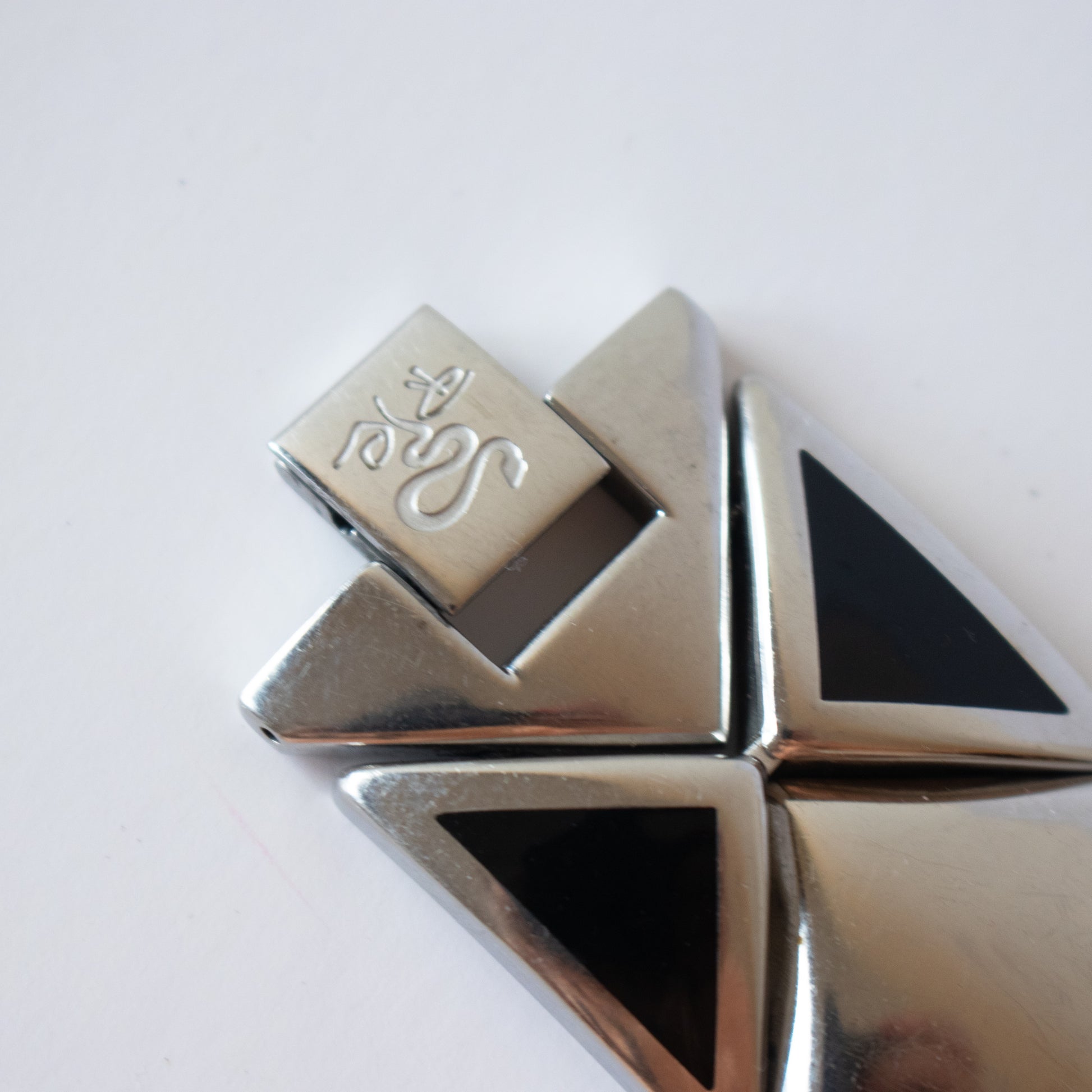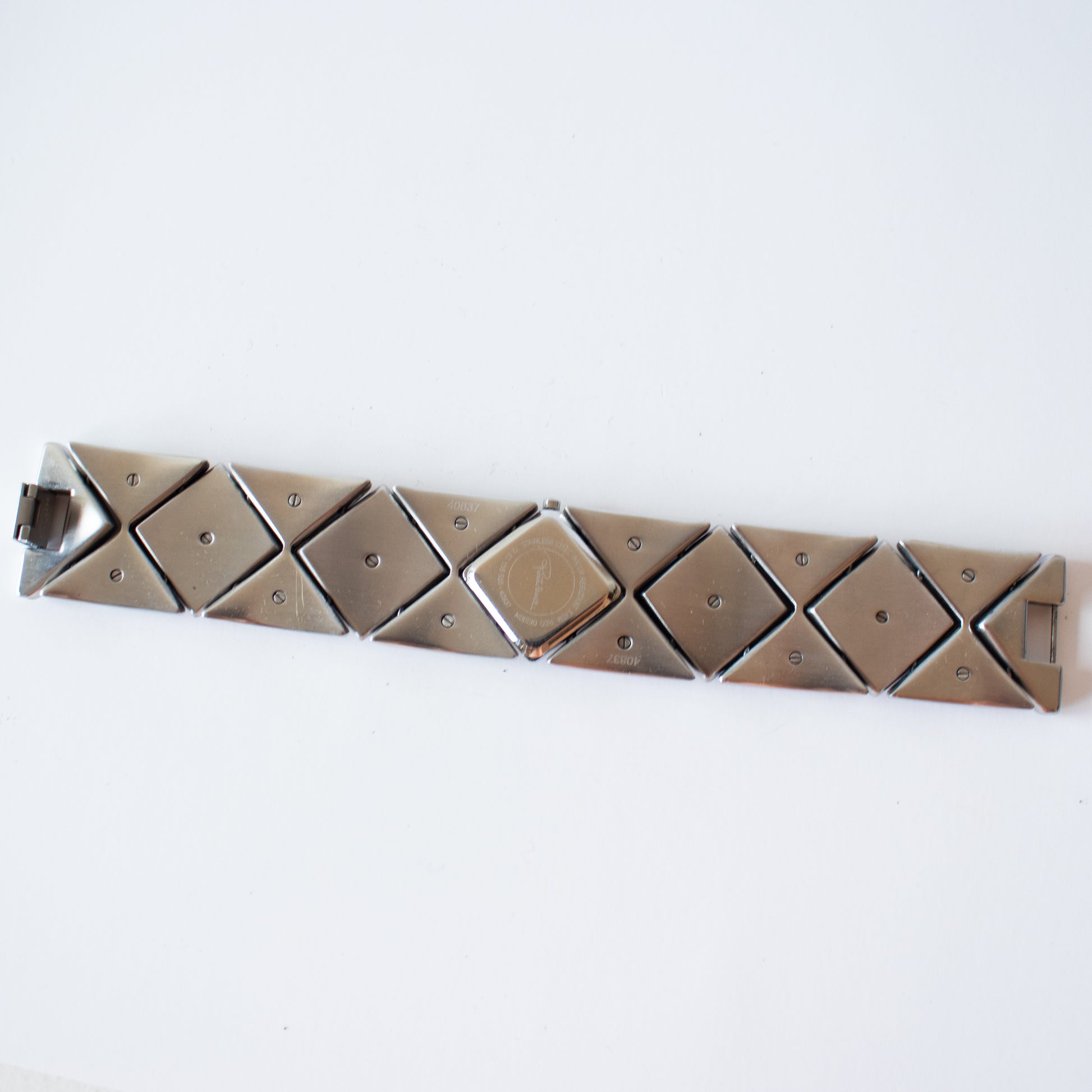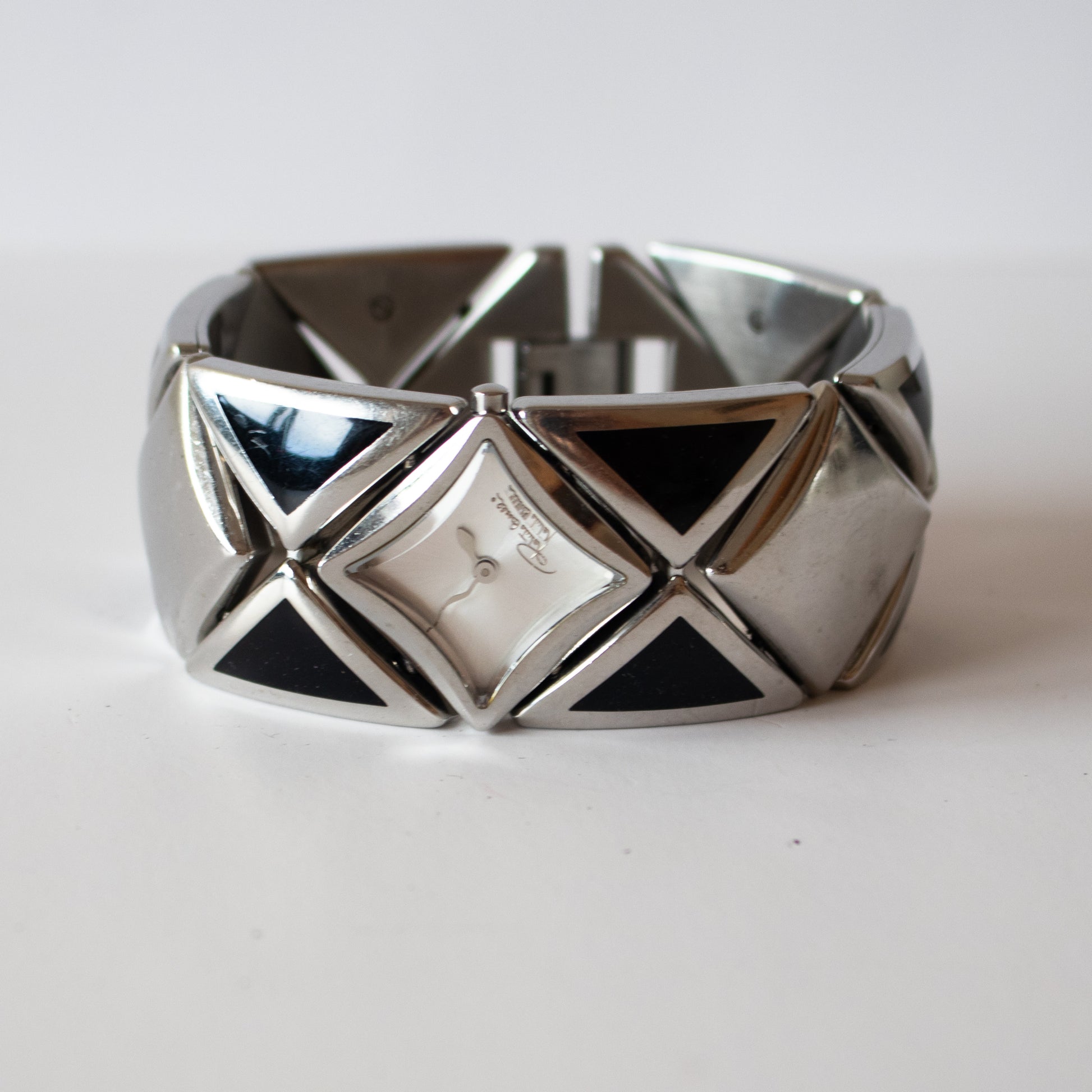 Relógio em aço prateado e preto, alternado, com cronógrafo.