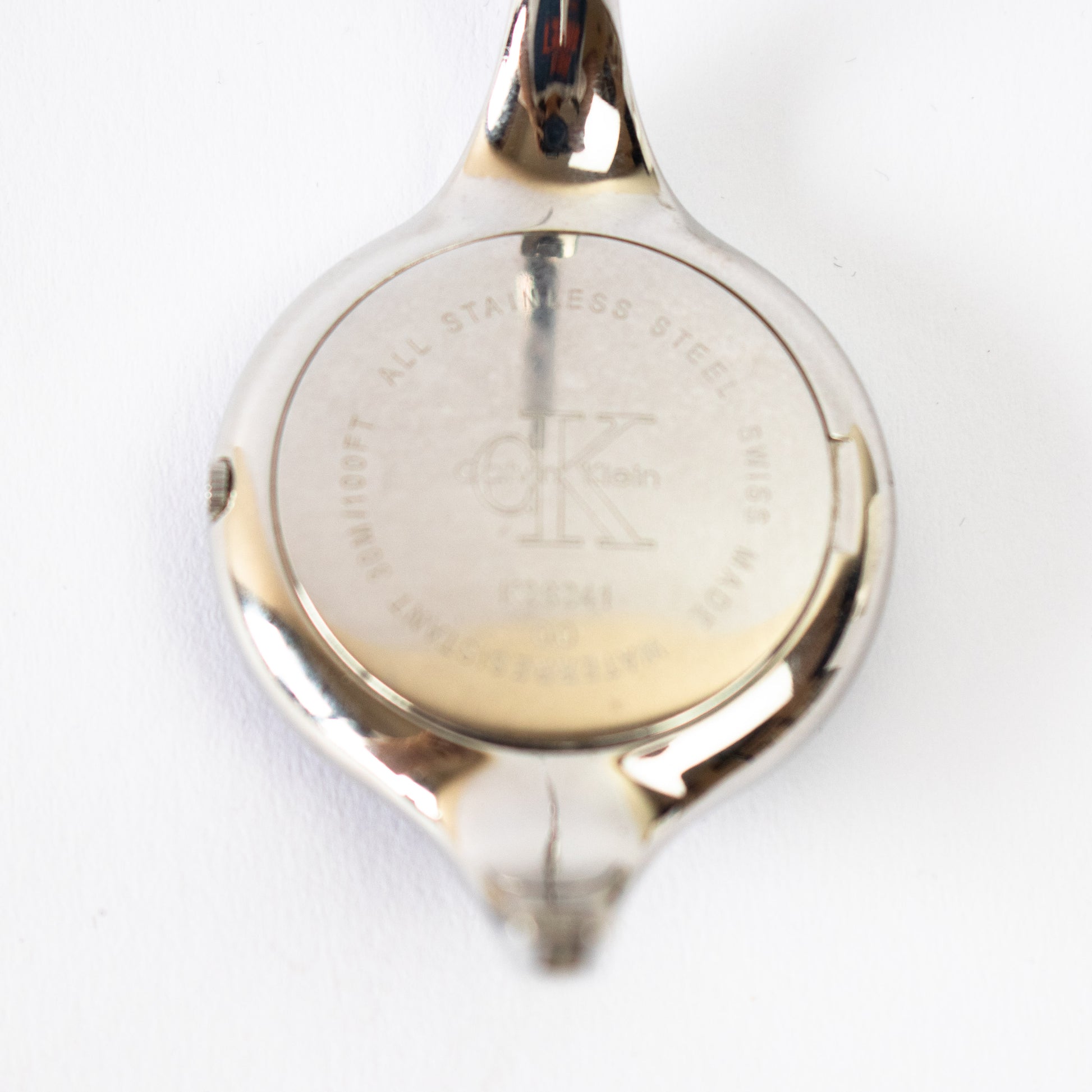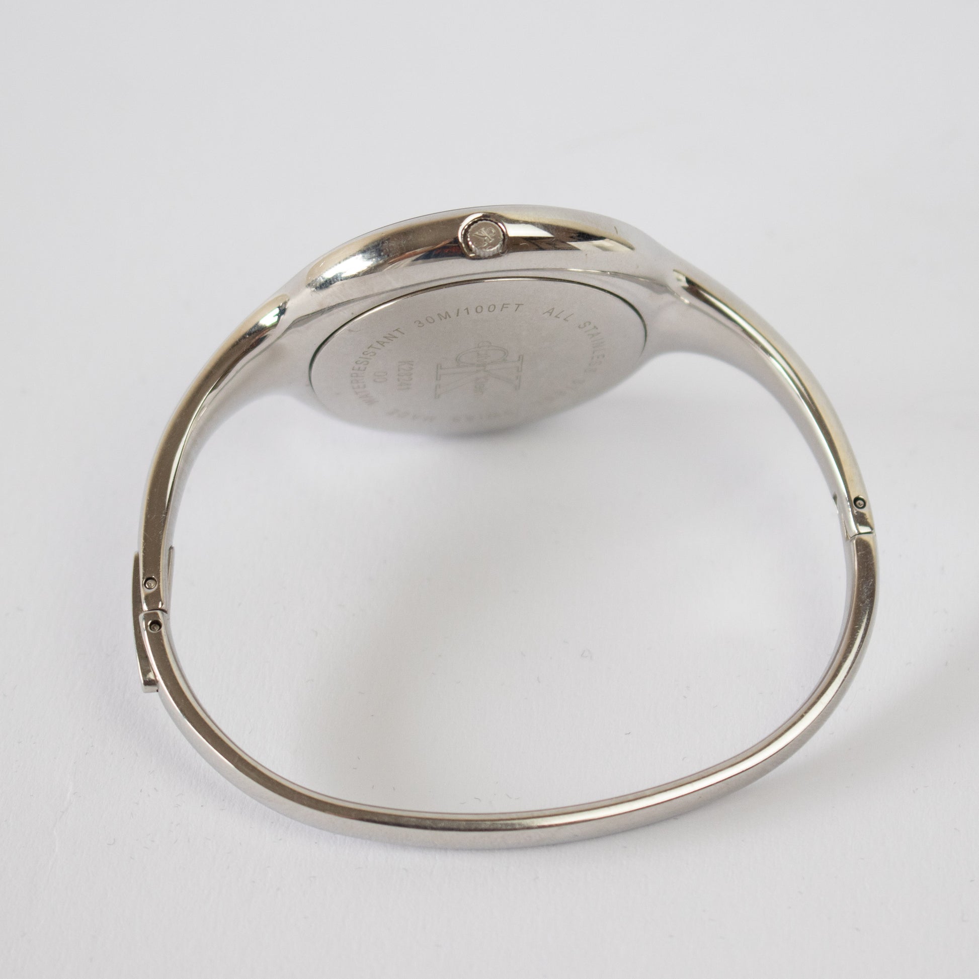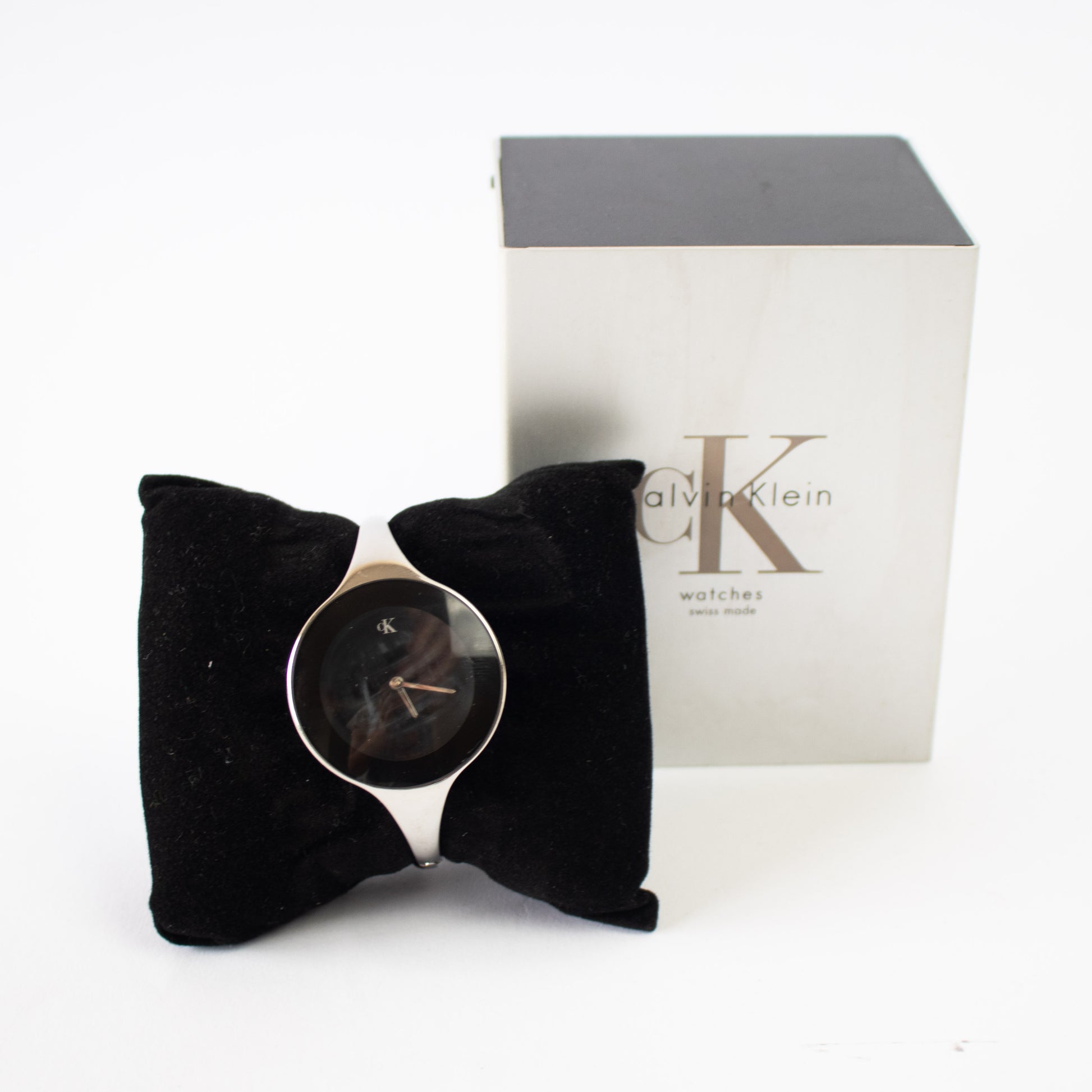 Relógio analógico de estilo característico e único. Bracelete fina e elegante em aço em tom prateado. Mostrador em tom preto e vidro mineral. Caixa original incluída.