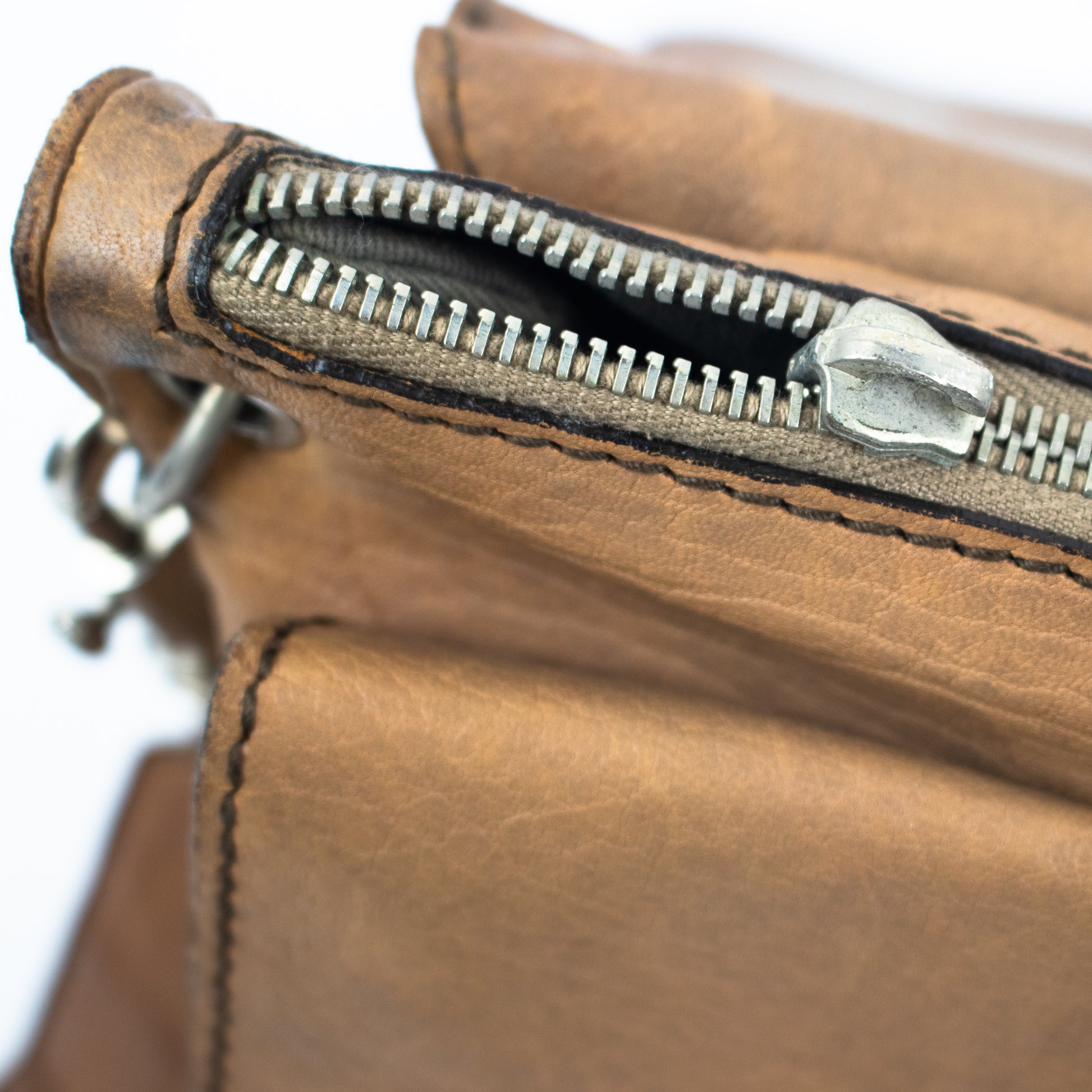 Sac en cuir avec bandoulière en tissu réglable. Fermeture éclair métallique sur le rabat. Détails argentés. Poche intérieure avec fermeture éclair.