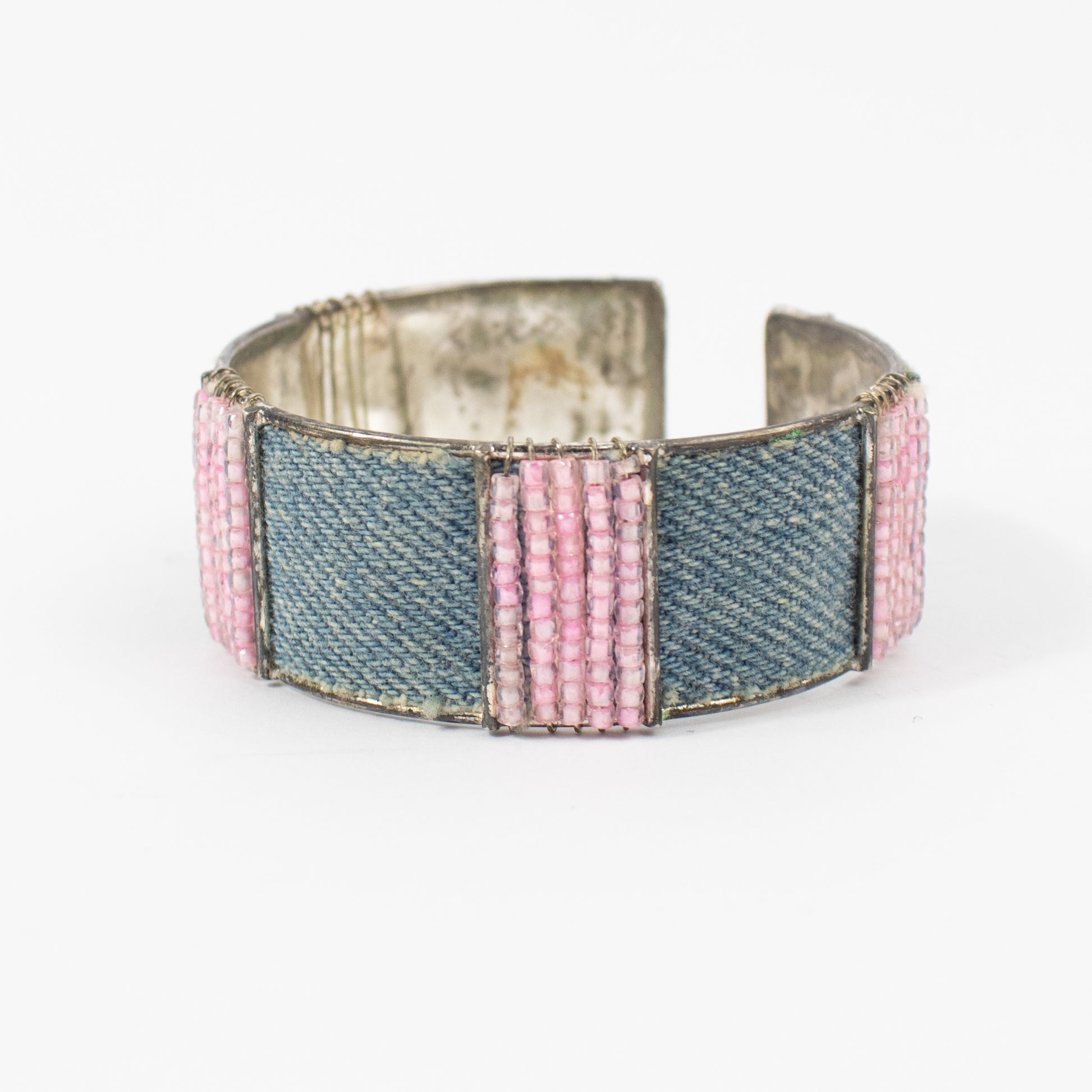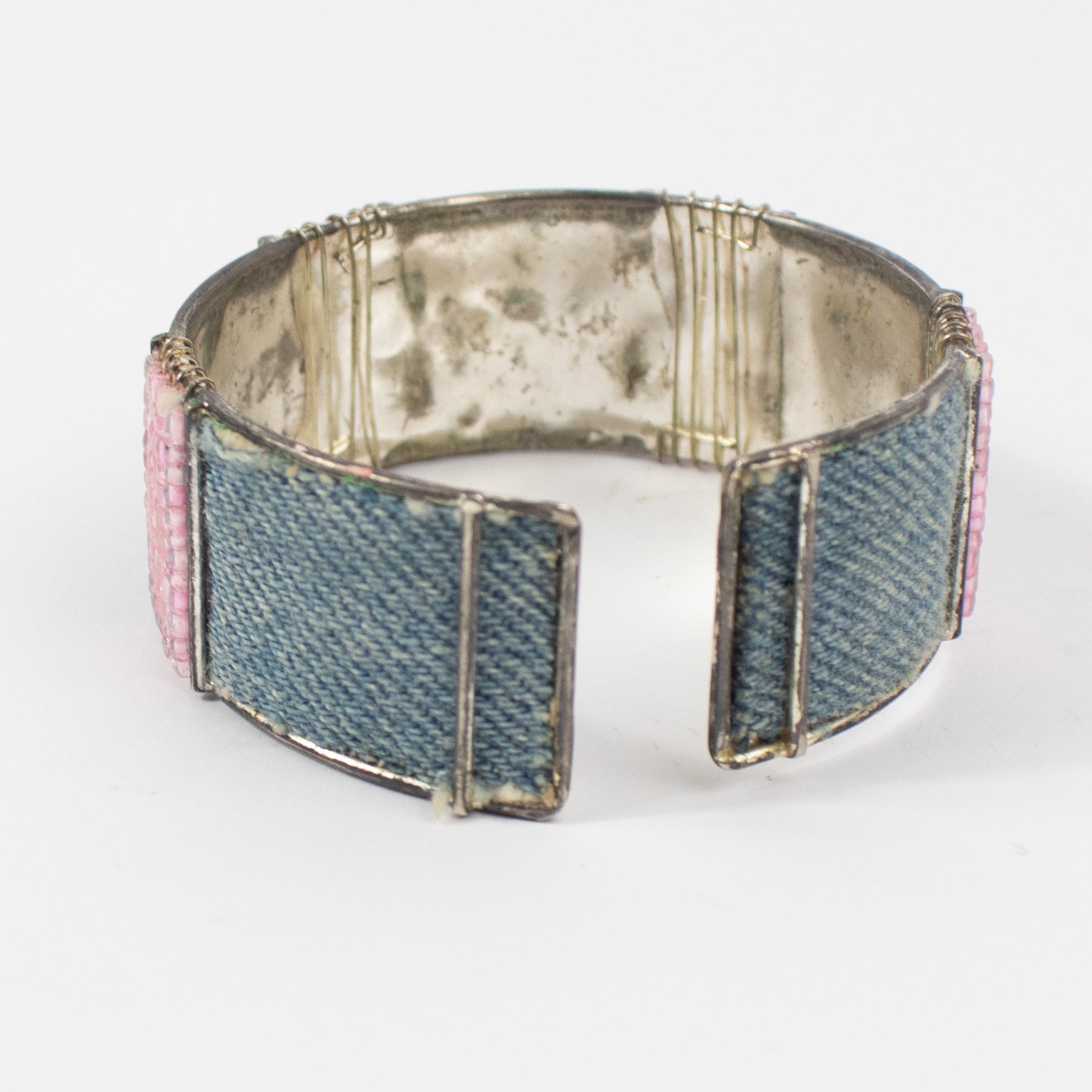 Bracelet large de taille moyenne en argent. Face extérieure avec application en tissu denim bleu et perles rose clair.
