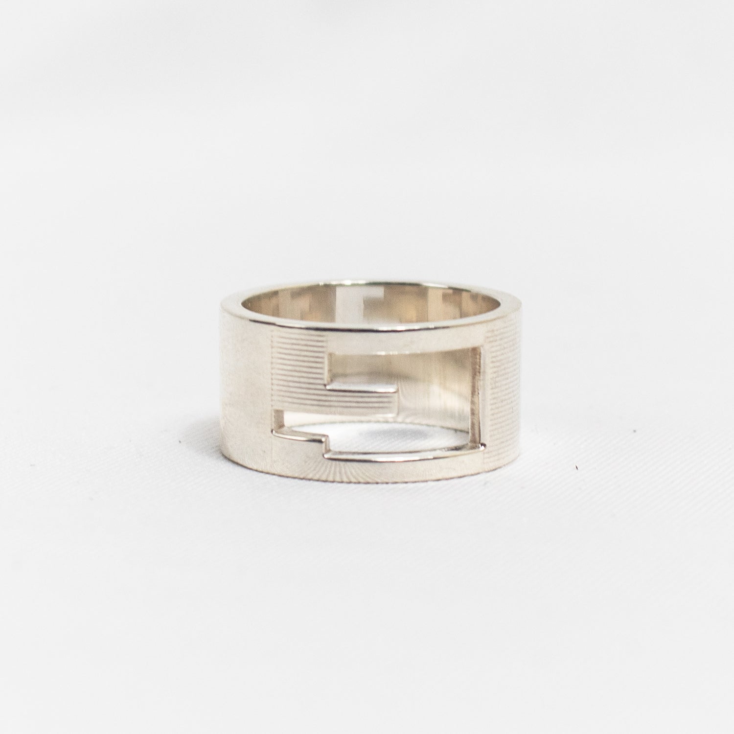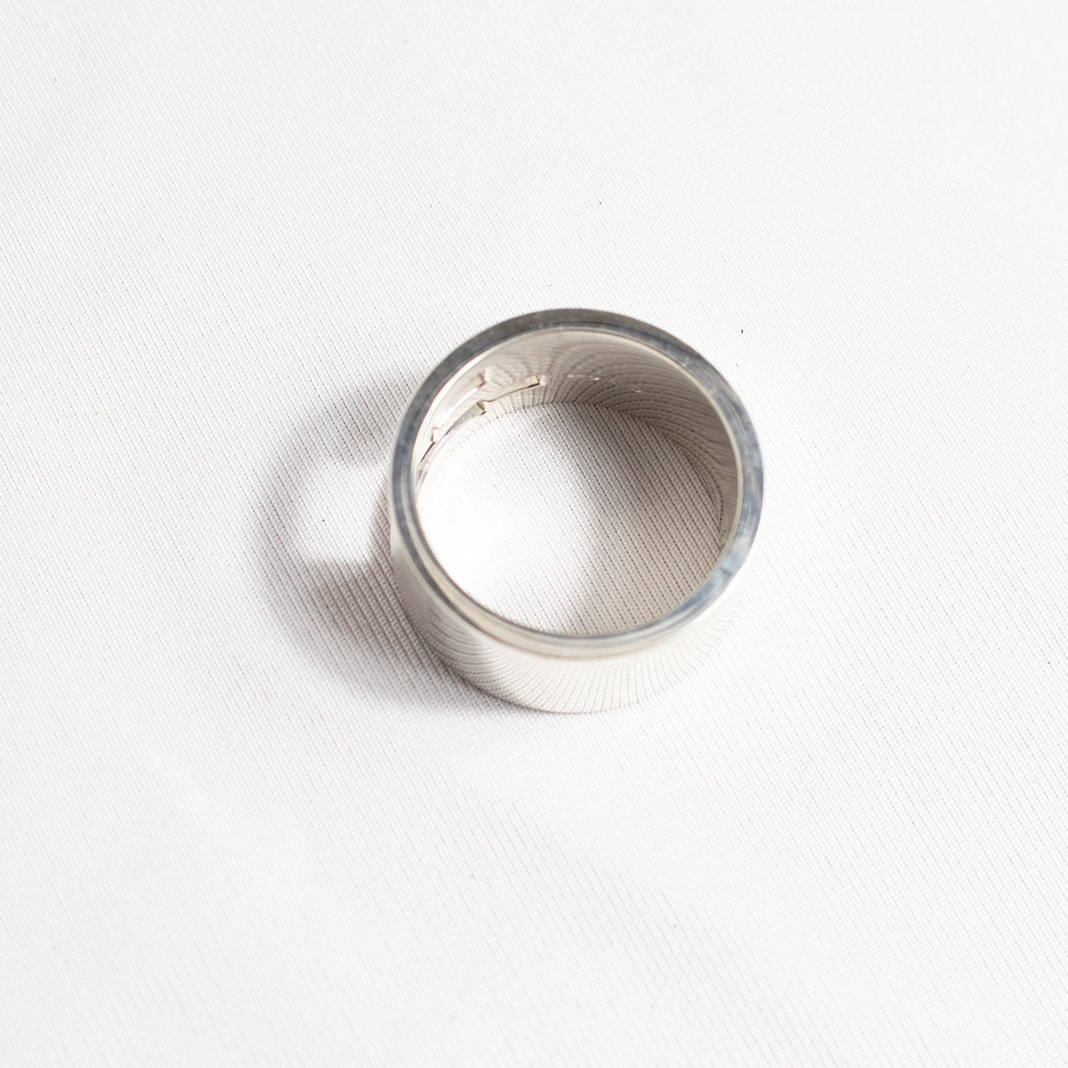 Anel largo em prata com detalhes geométricos, conferindo-lhe um design peculiar, inteiramente em tom prateado.