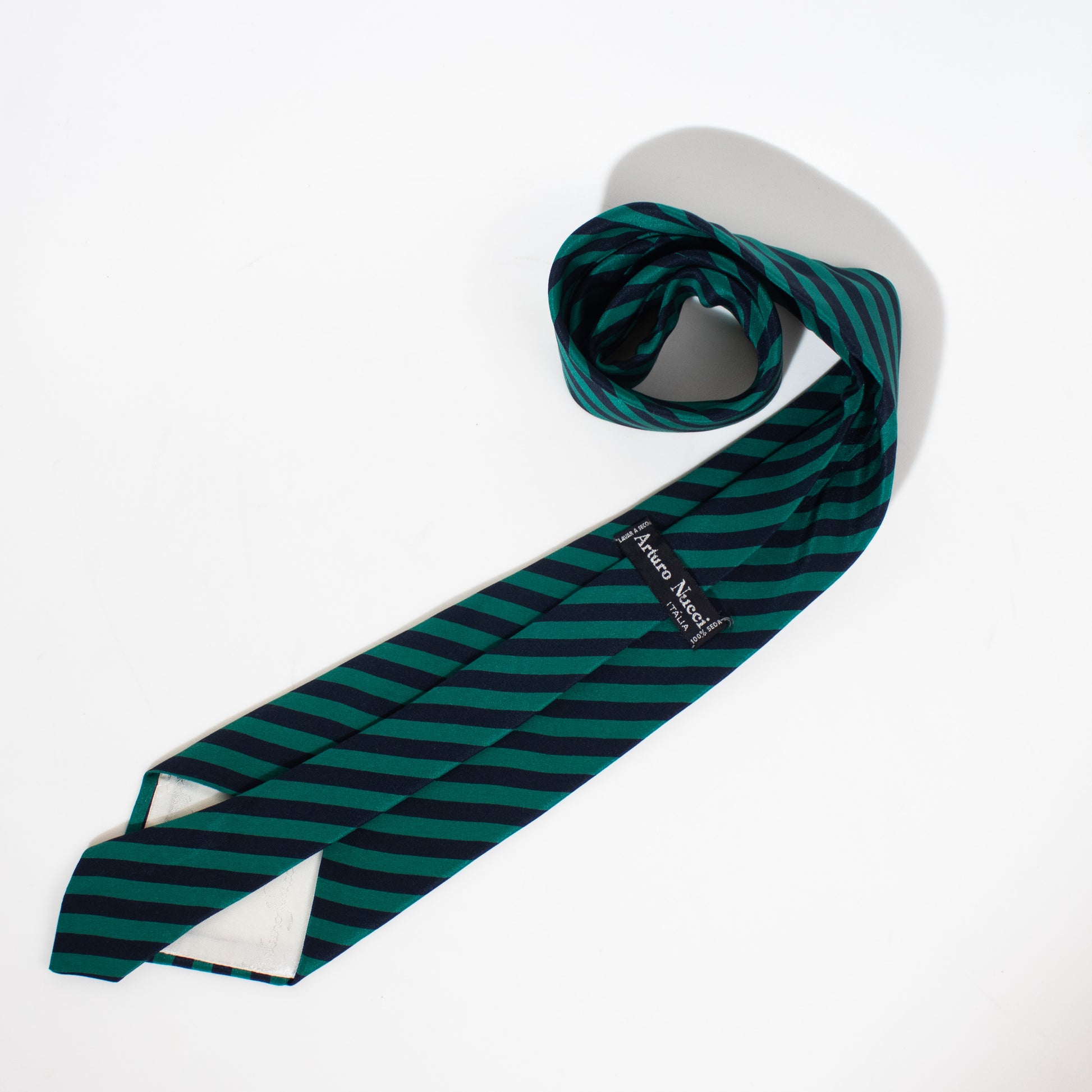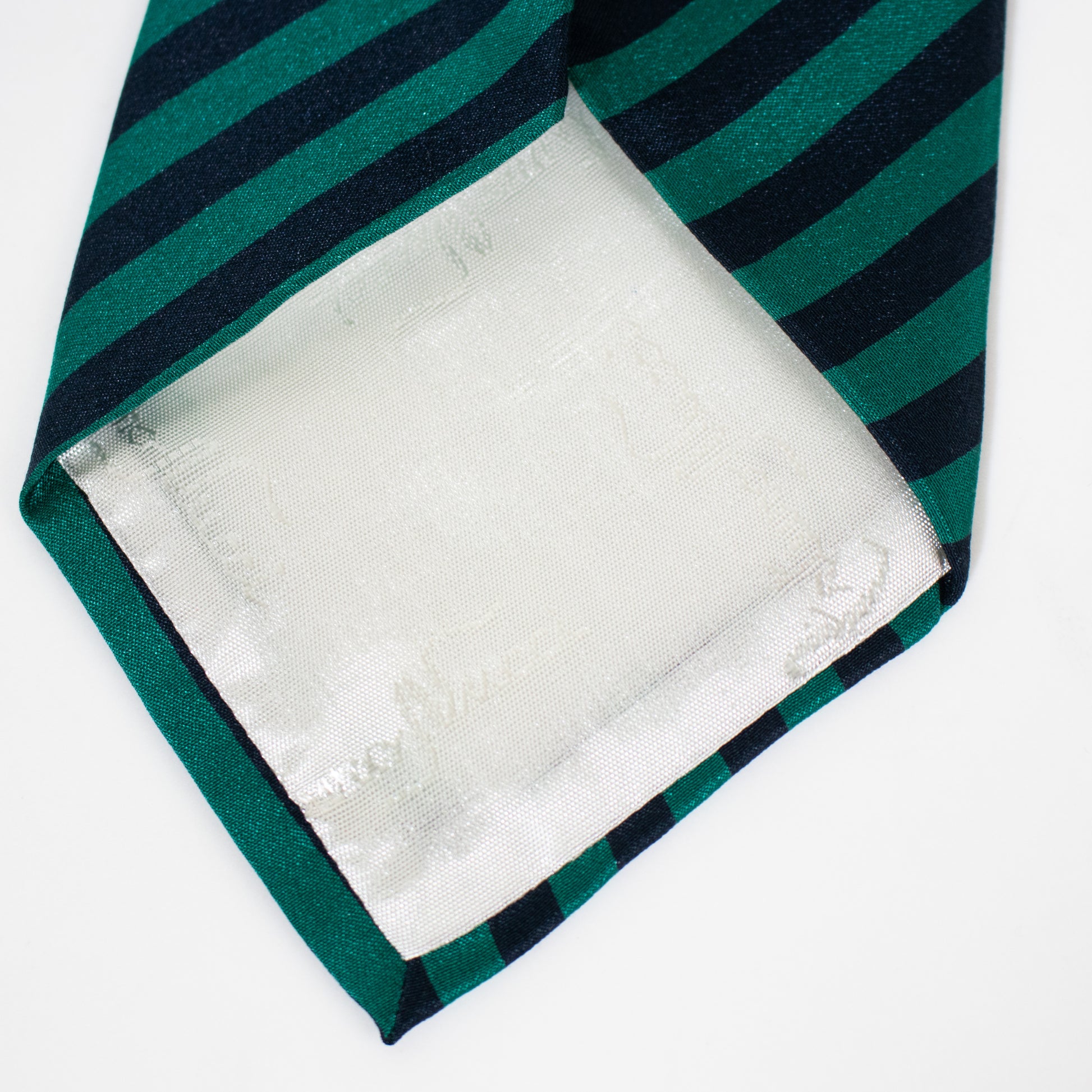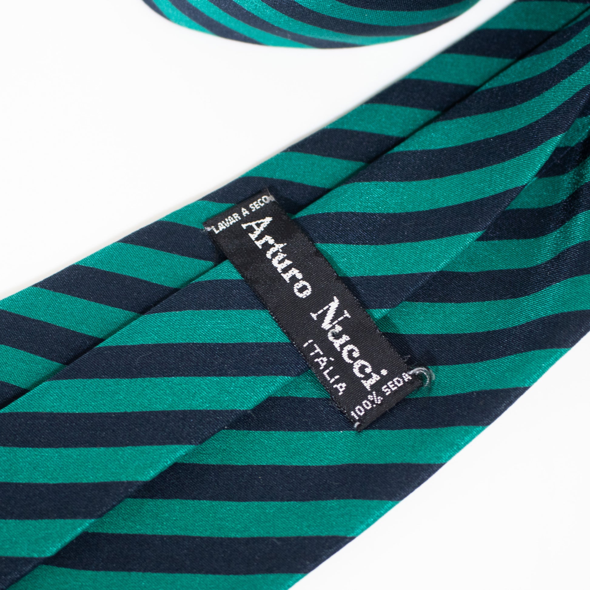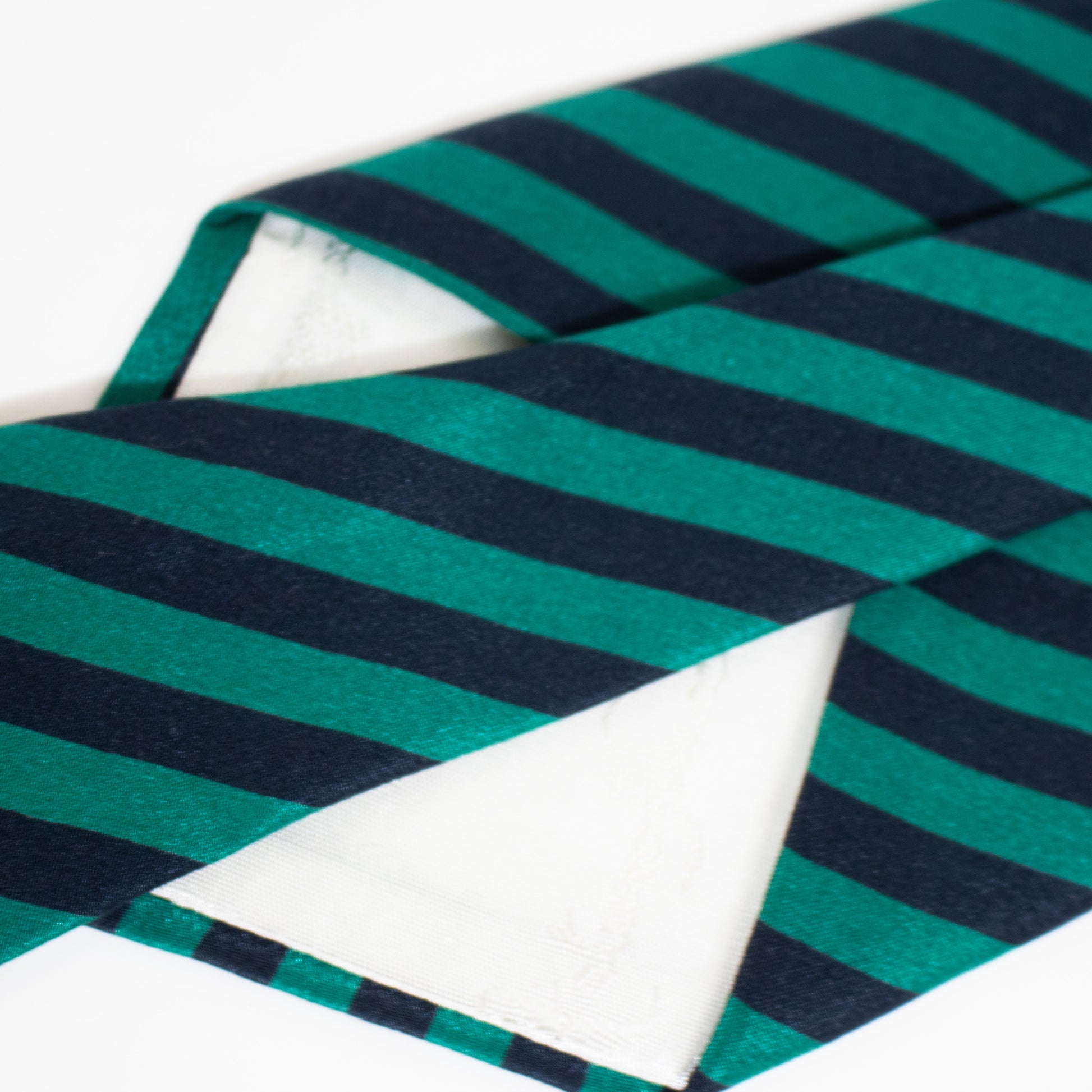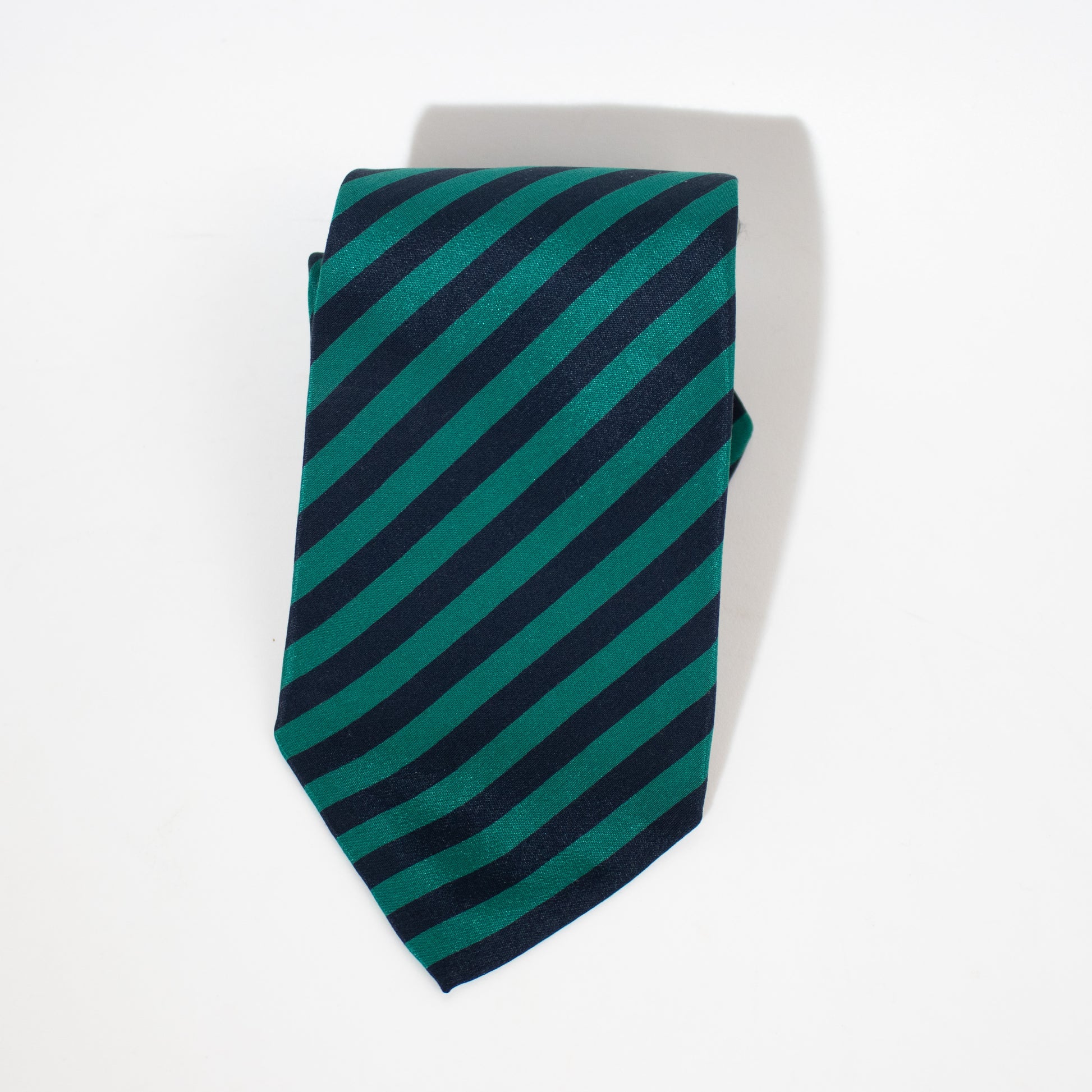 Gravata larga fabricada em mistura de seda e algodão às riscas de tom verde e azul.