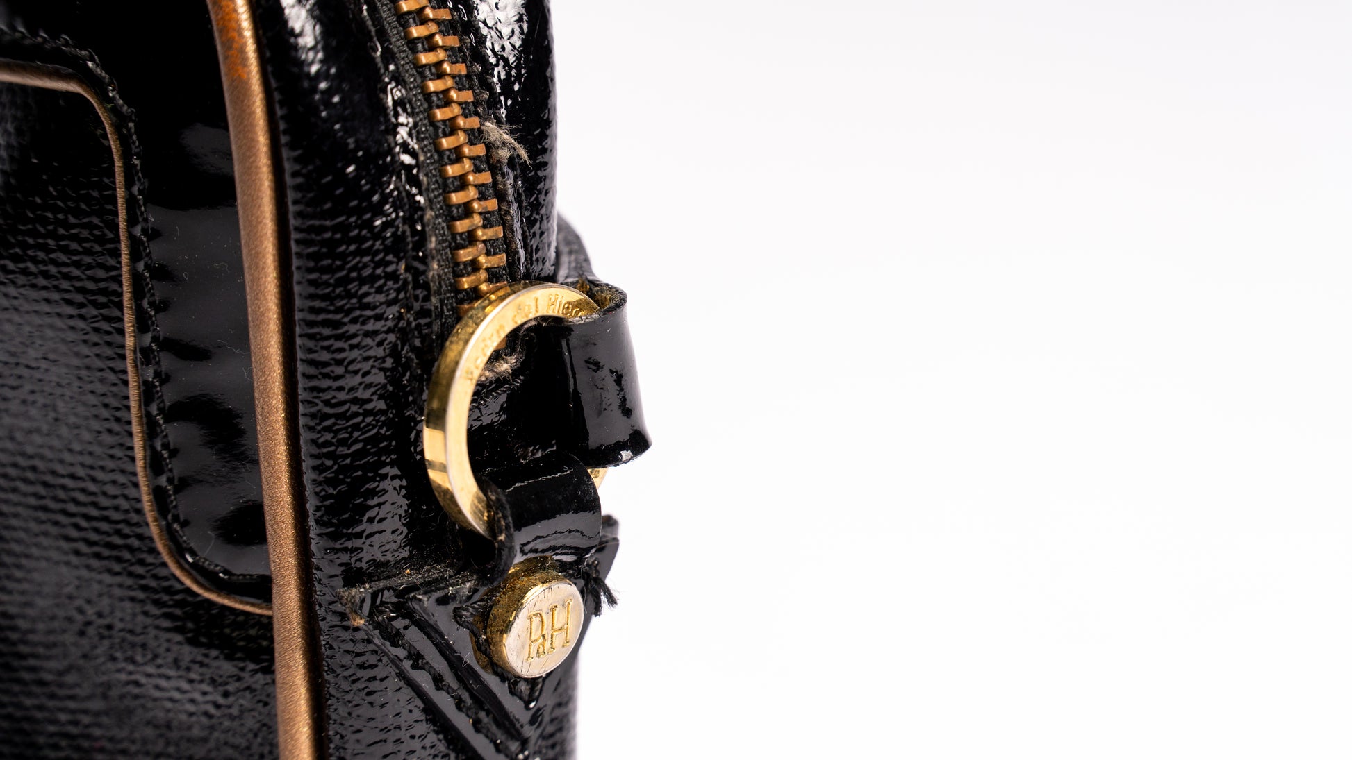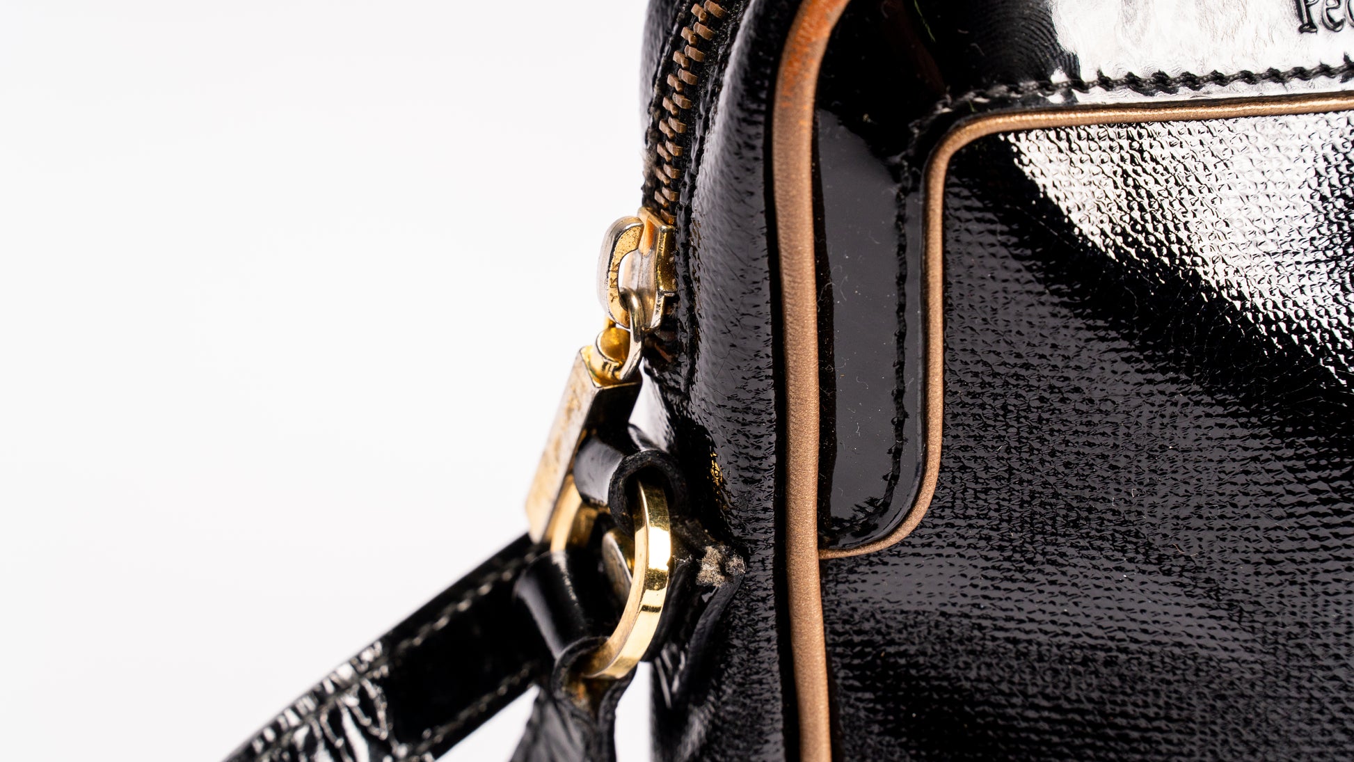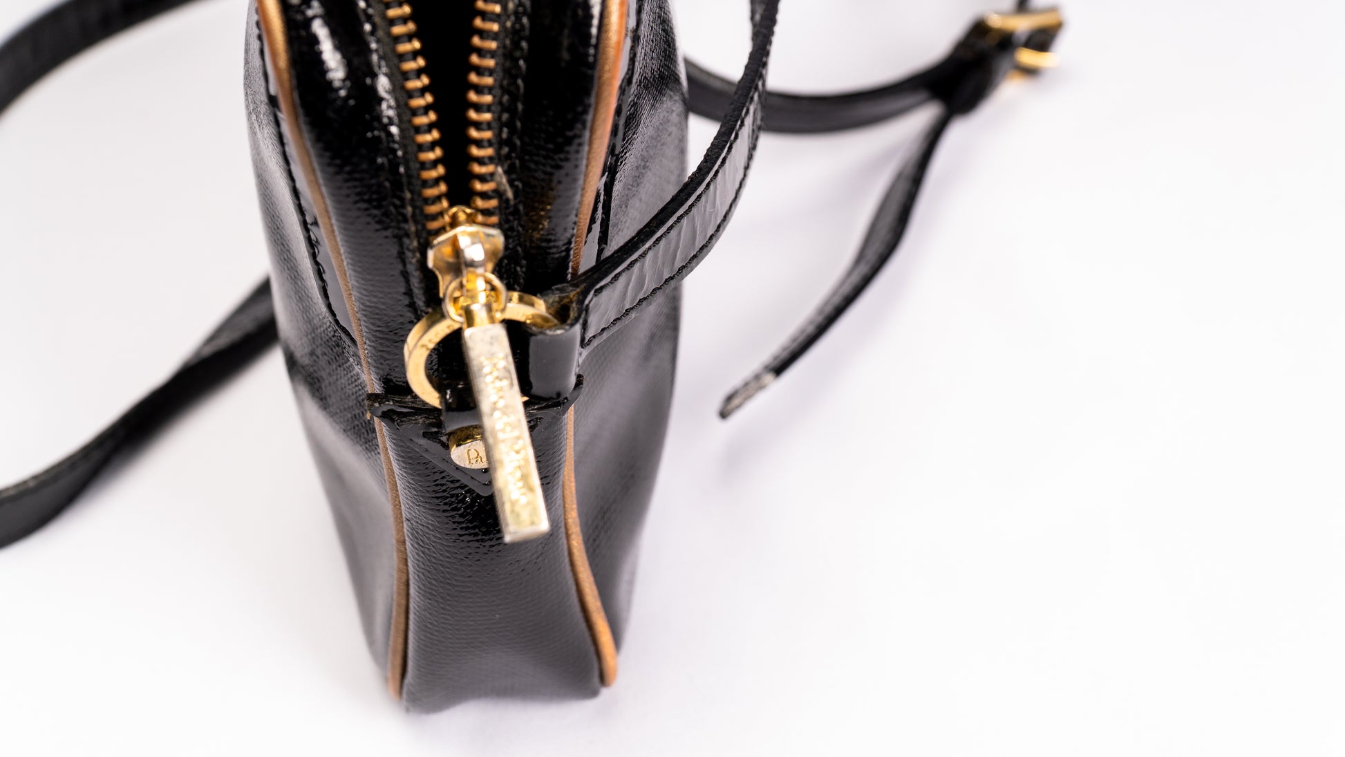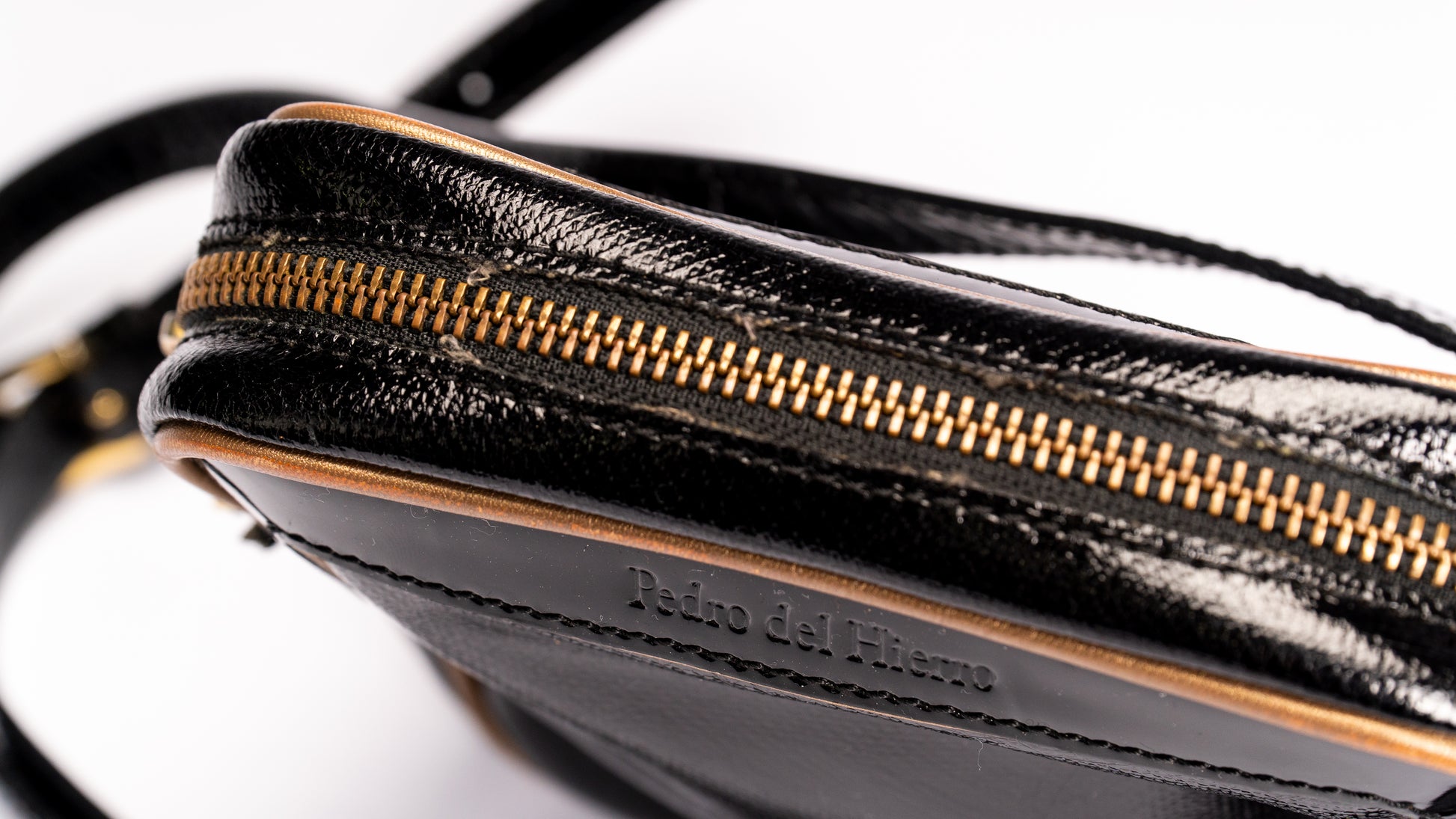 Bolsa tiracolo com fecho-éclair metálico dourado e alsa ajustável.