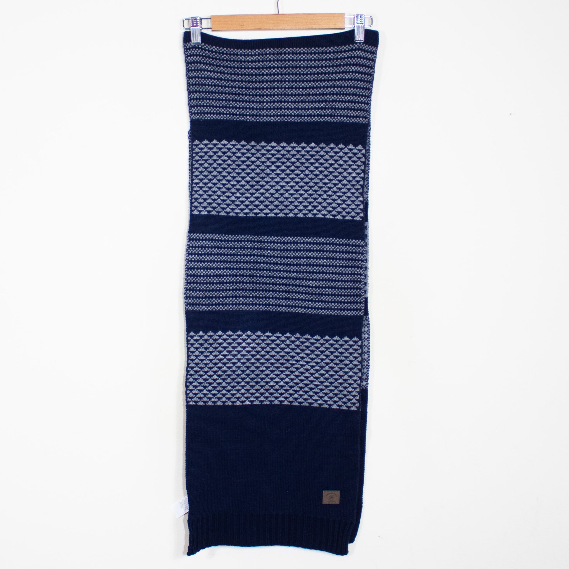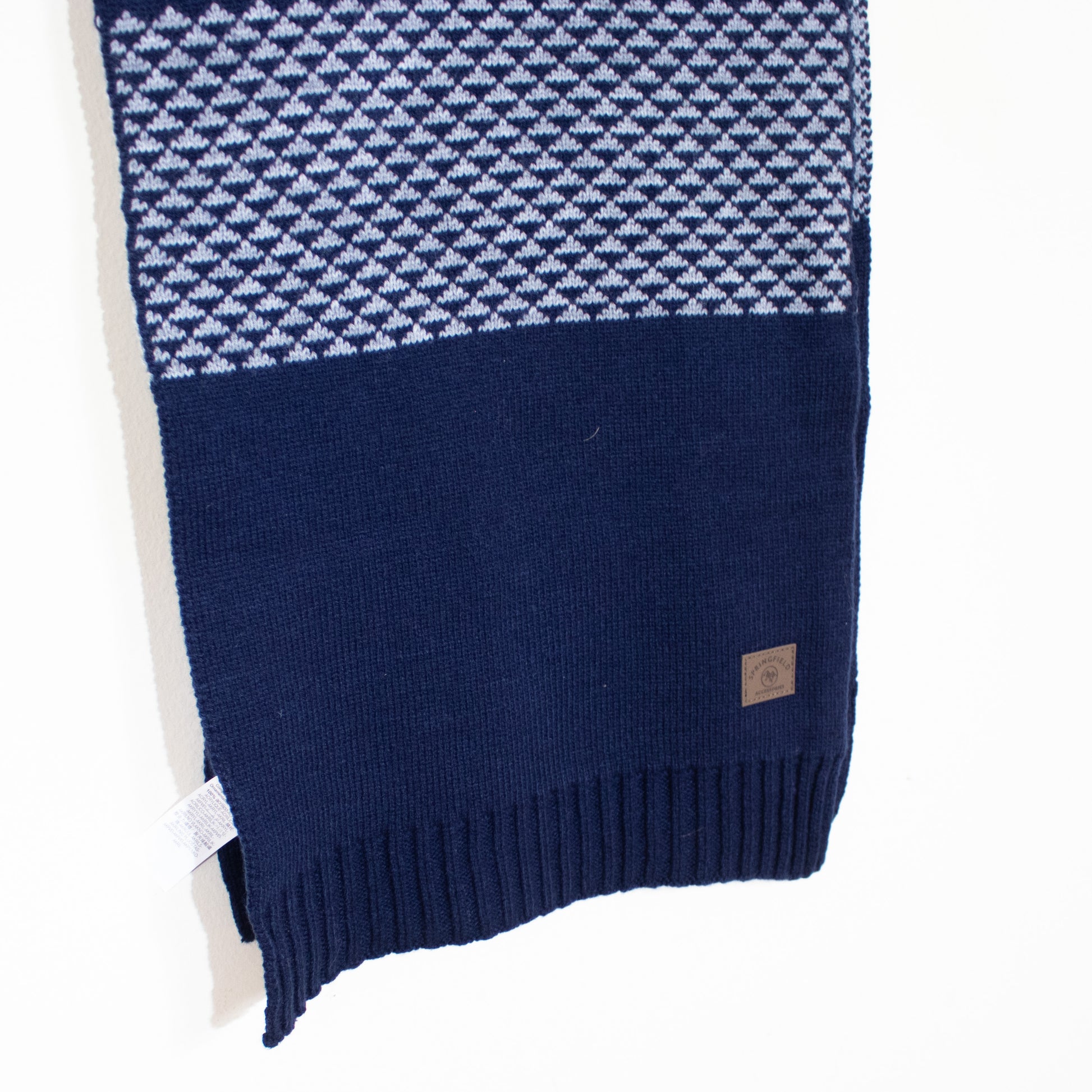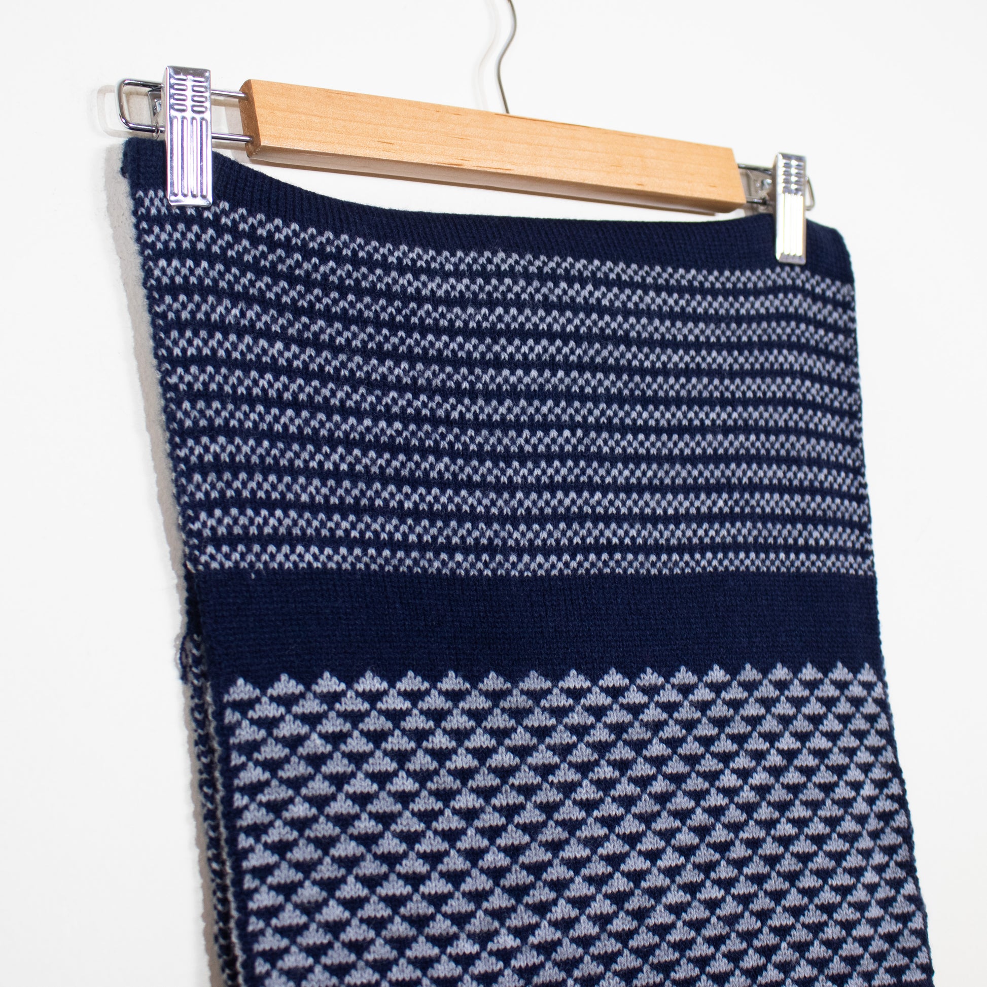Cachecol em malha fina de acrílico macio sem franjas e com padrão e fundo em tom azul marinho.