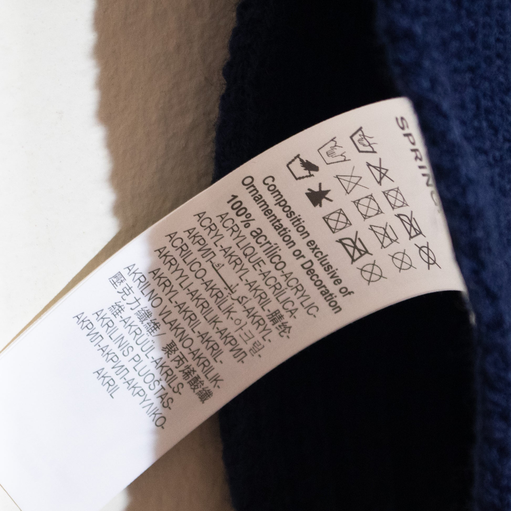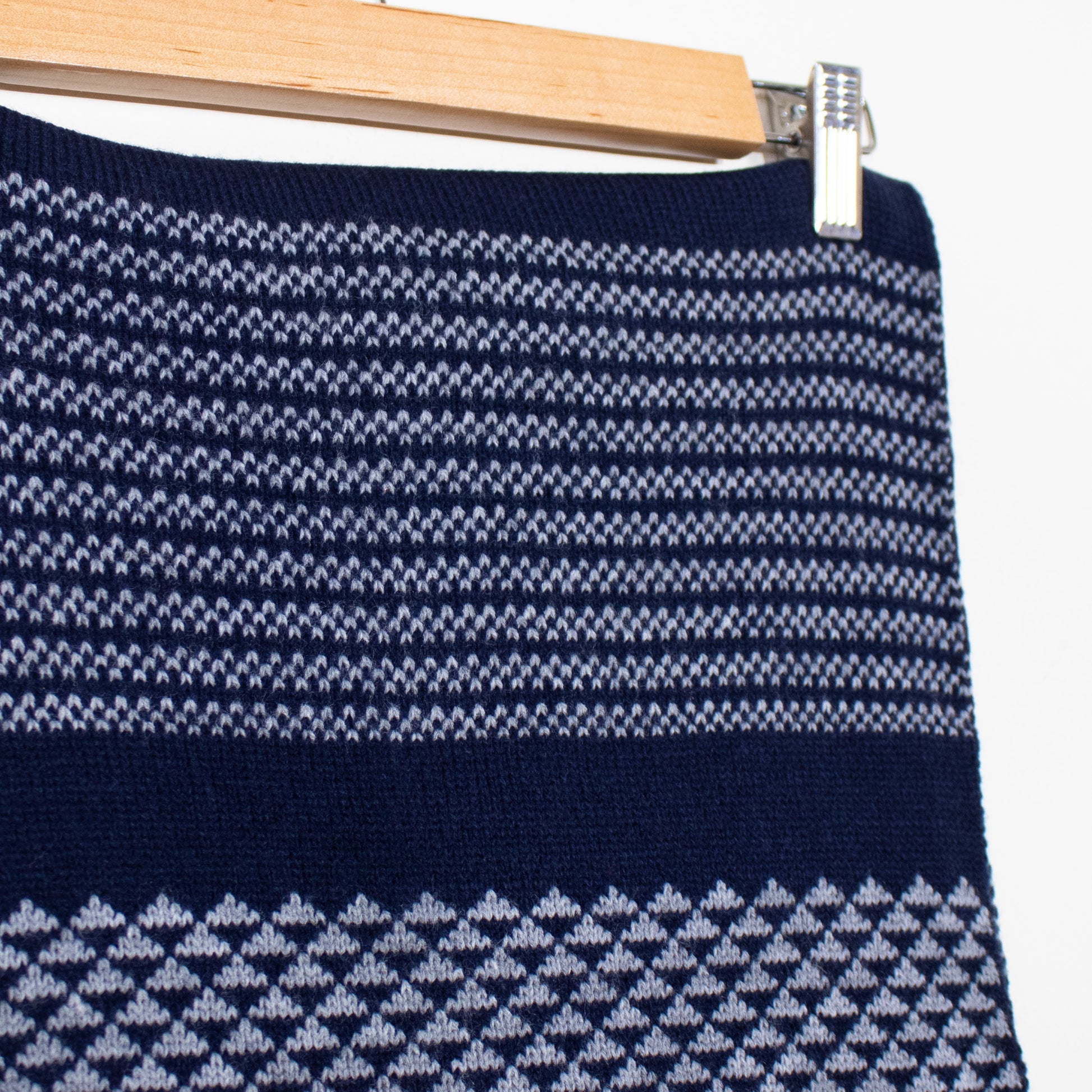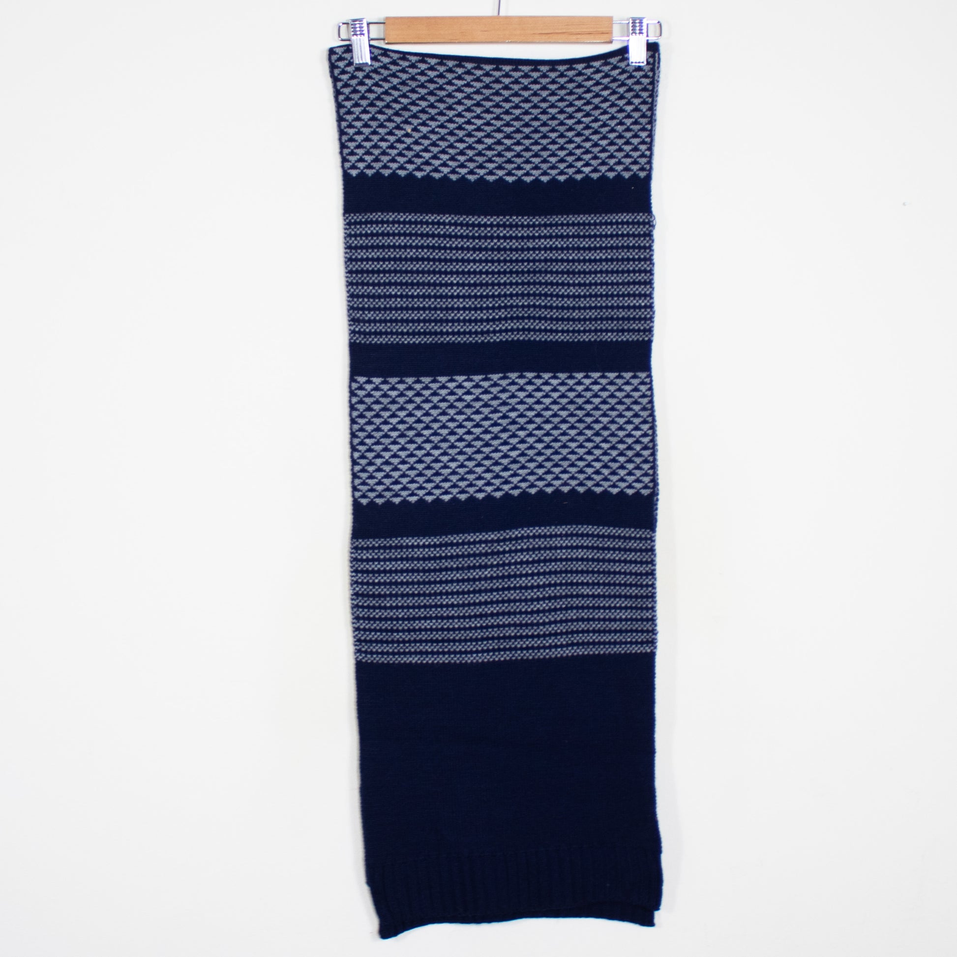 Cachecol em malha fina de acrílico macio sem franjas e com padrão e fundo em tom azul marinho.