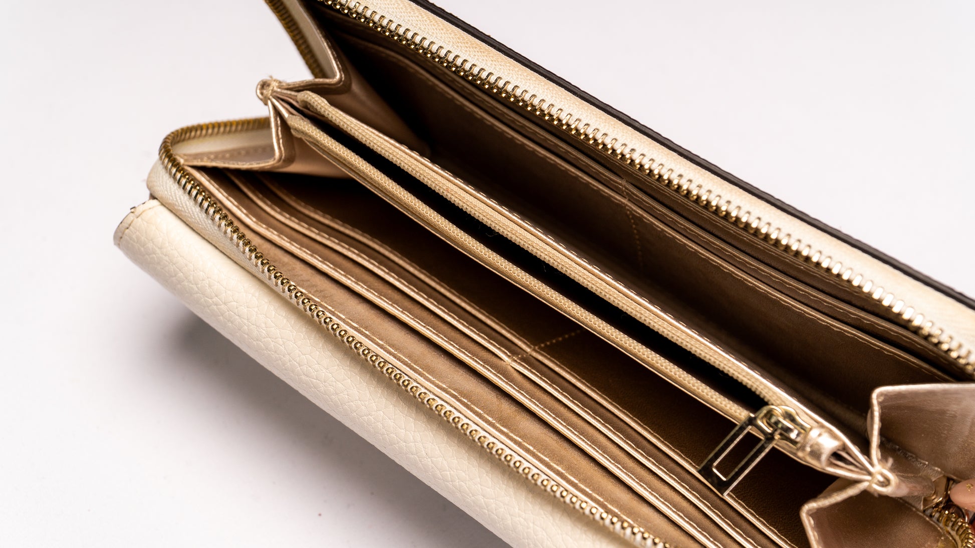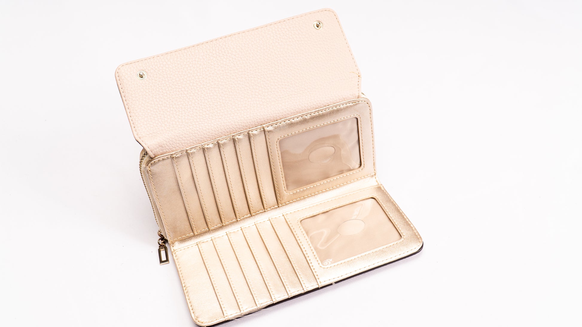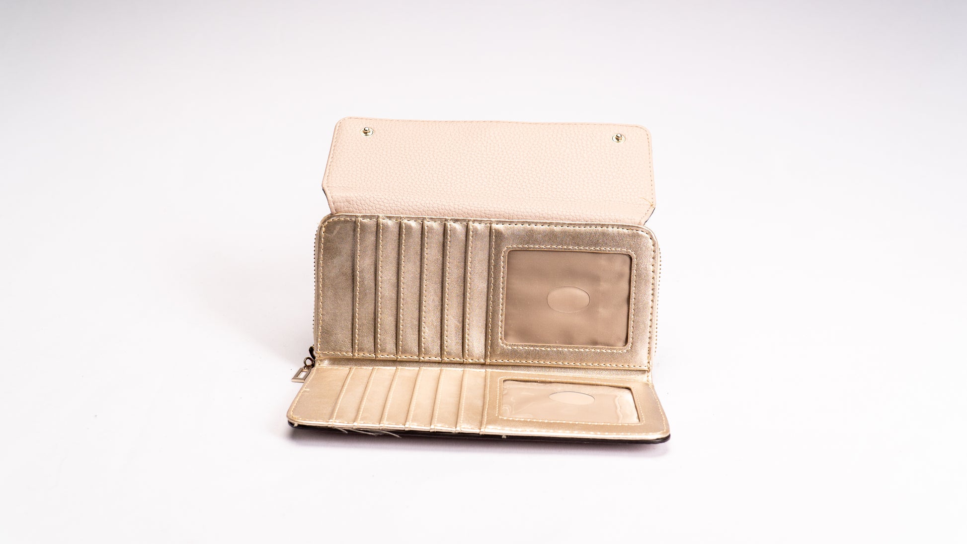 Carteira com compartimentos para cartões com fecho de botões de pressão e compartimento para moedas com fecho éclair metálico.