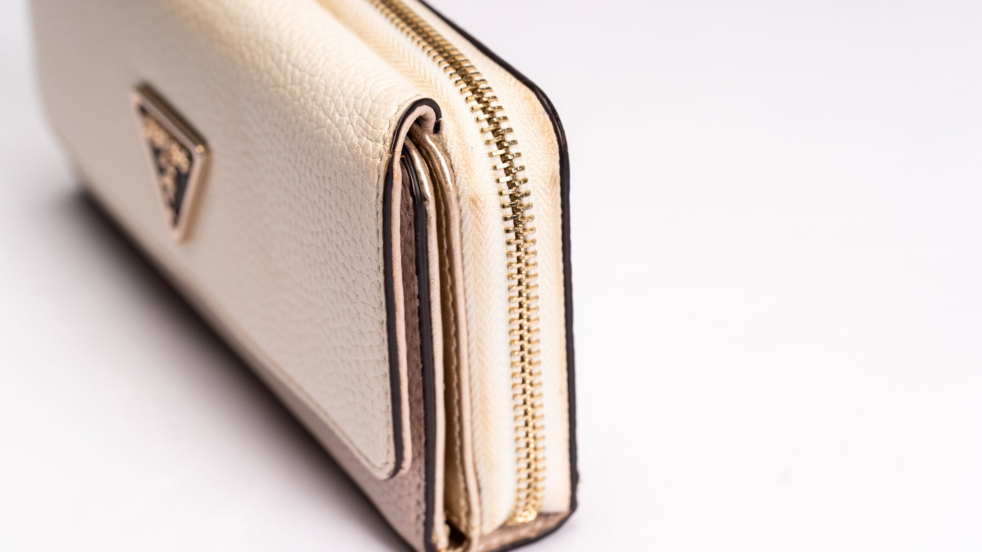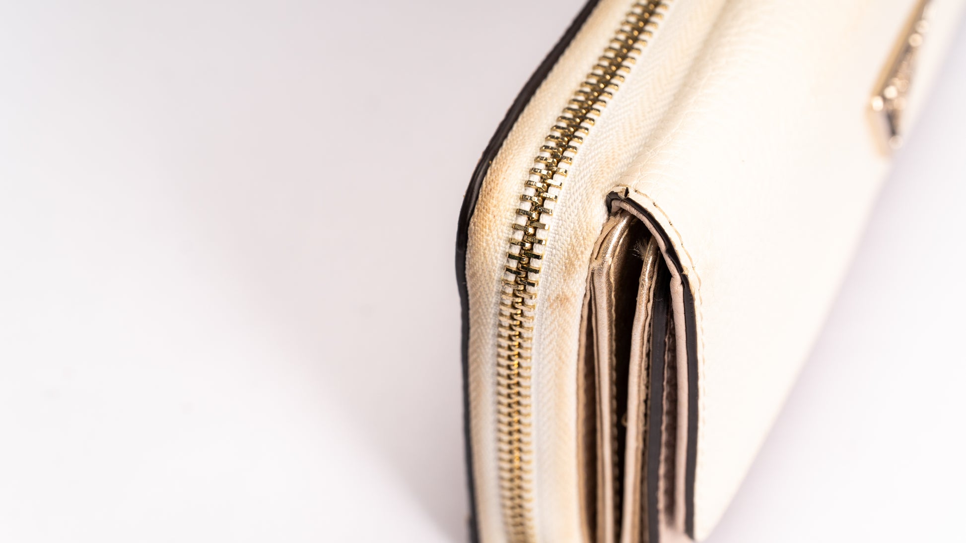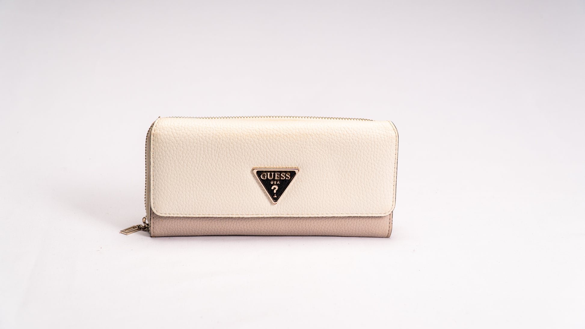 Carteira com compartimentos para cartões com fecho de botões de pressão e compartimento para moedas com fecho éclair metálico.