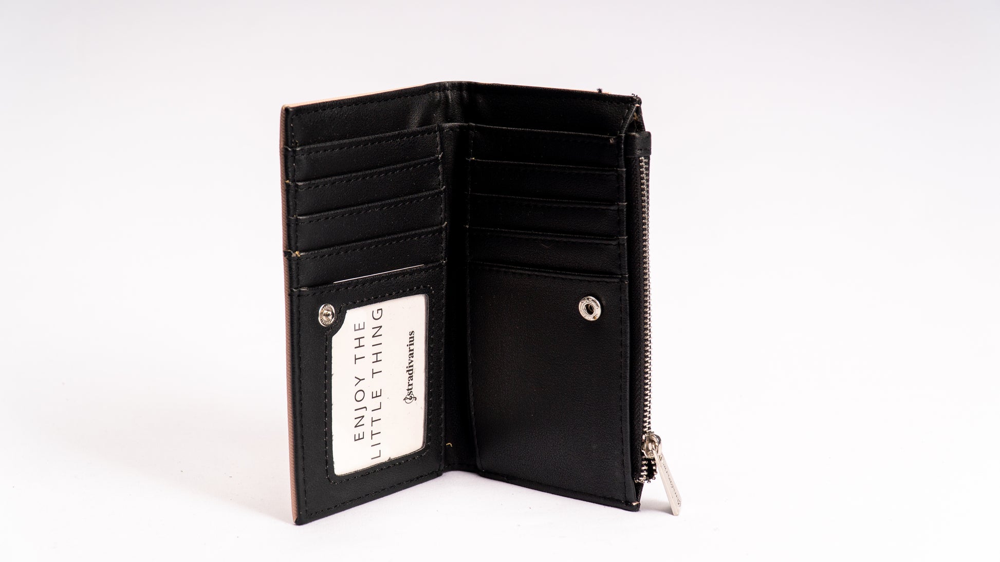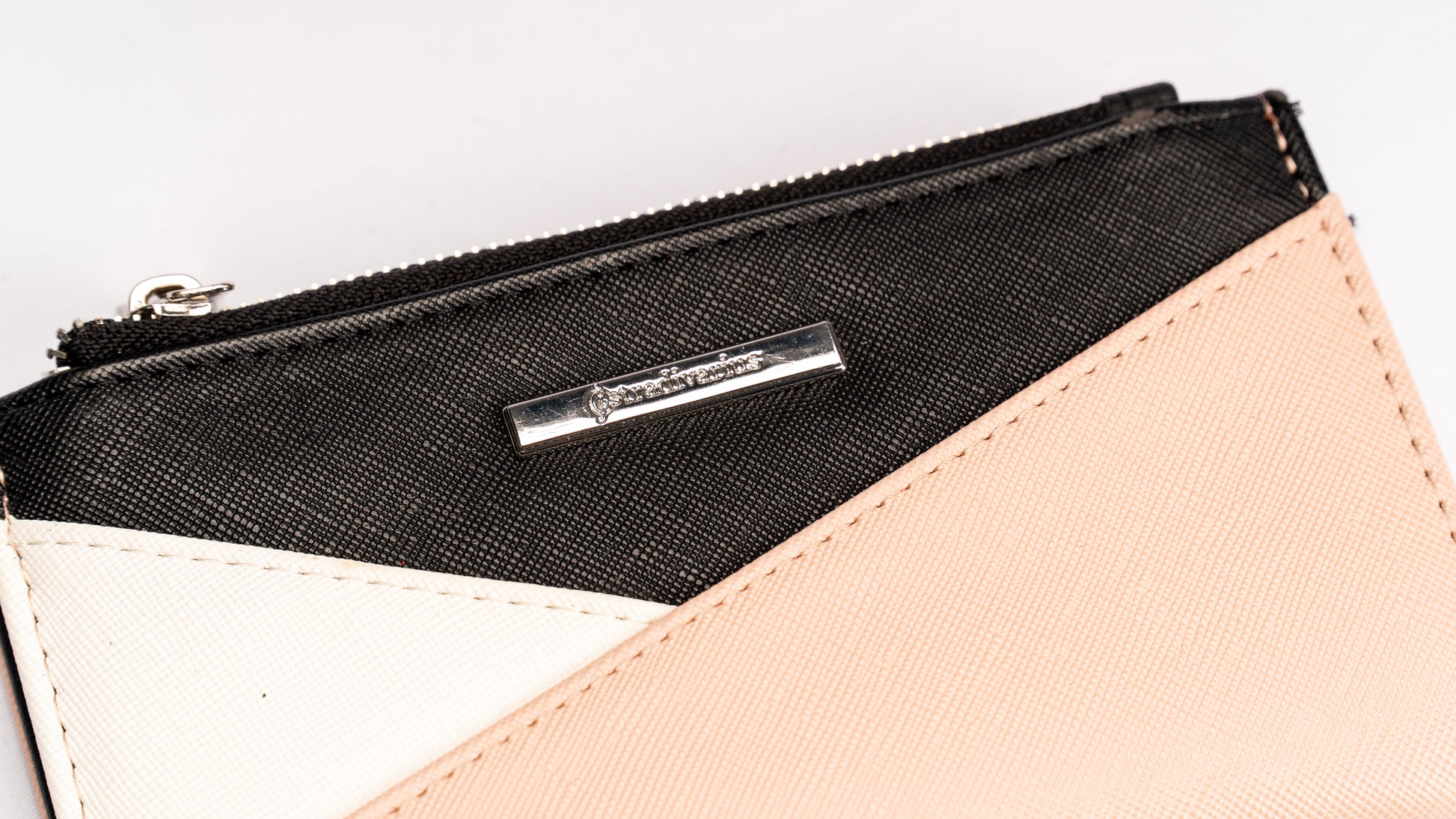 Carteira tricolor, com compartimento para moedas com fecho éclair e compartimento para cartões com fecho de pressão.