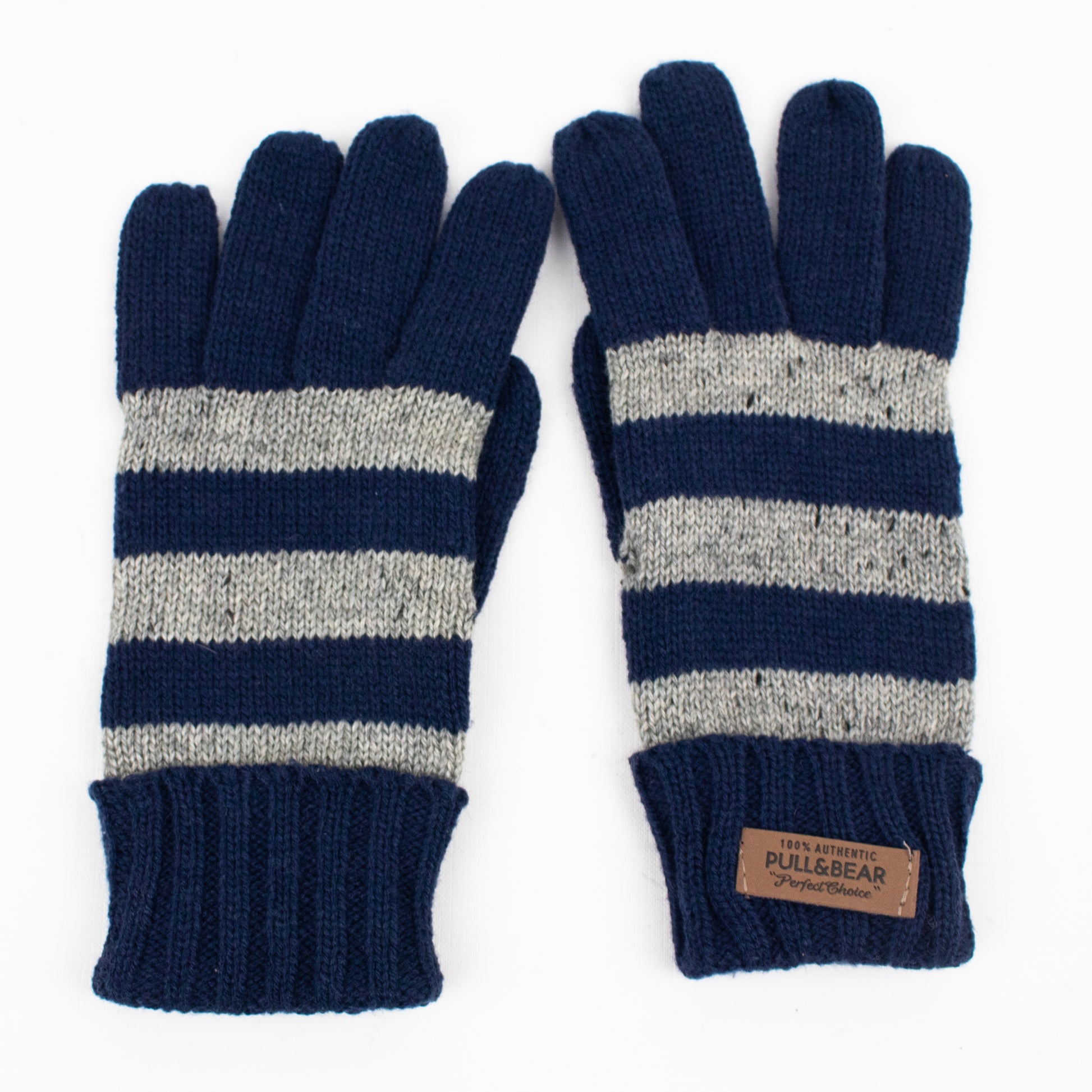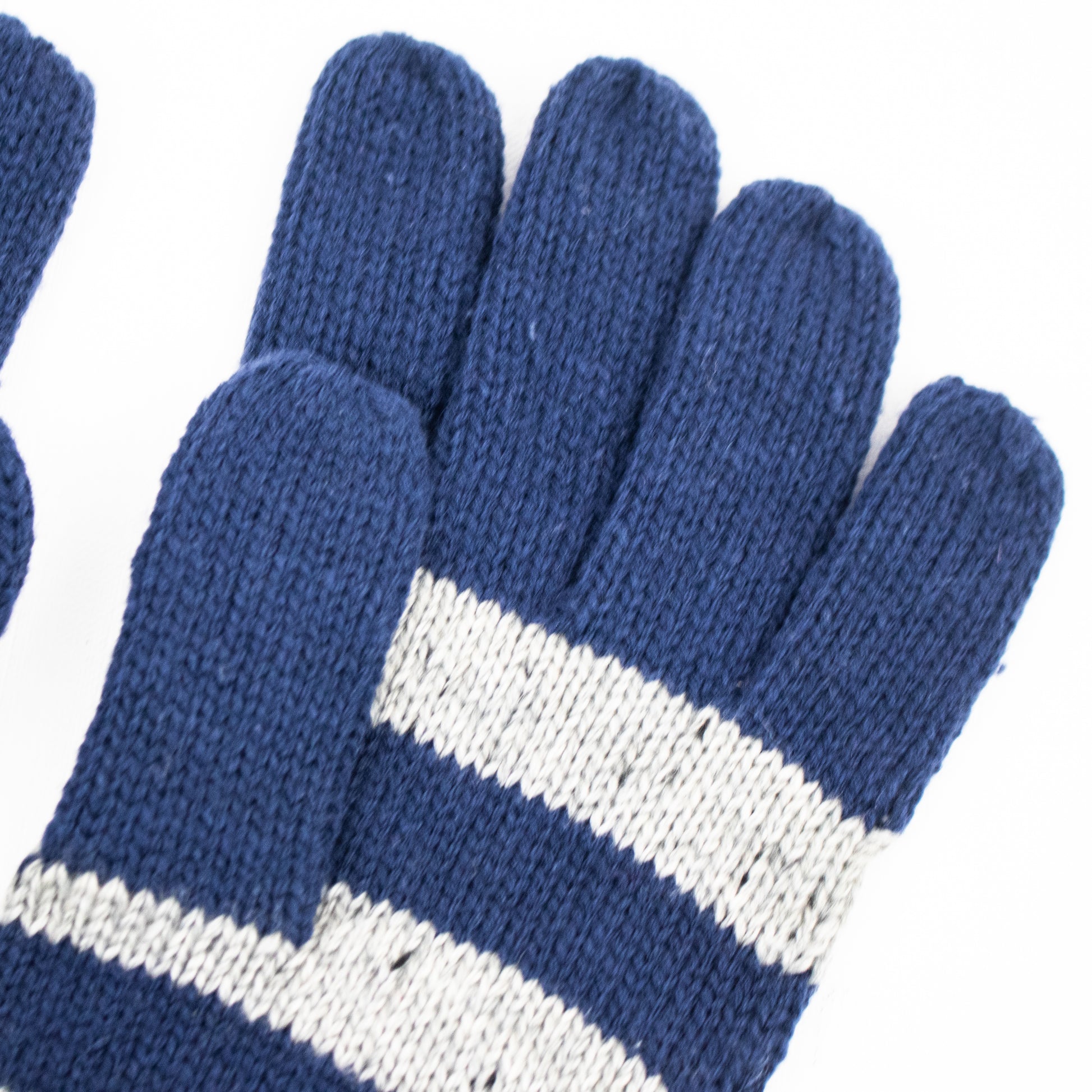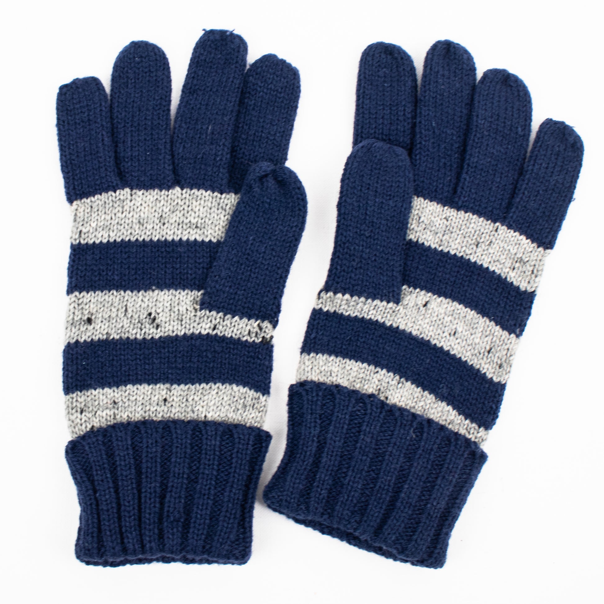 Conjunto de cachecol e luvas de malha com riscas horizontais.