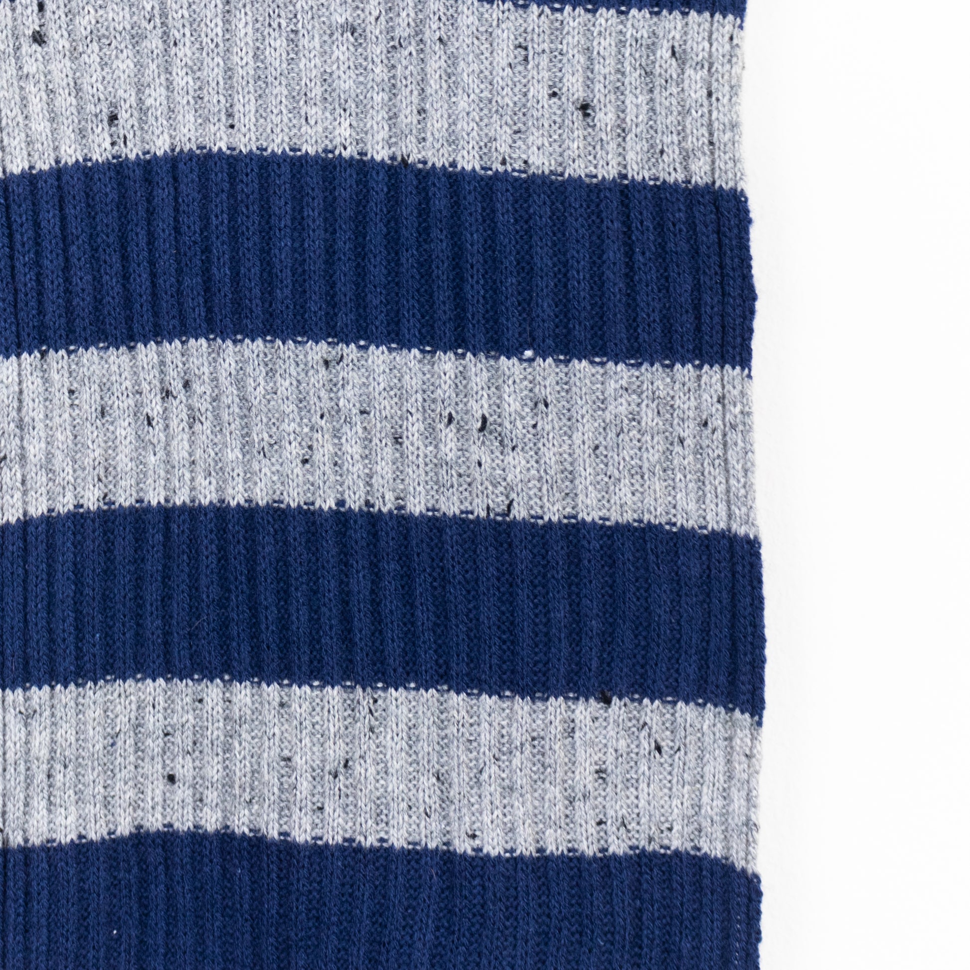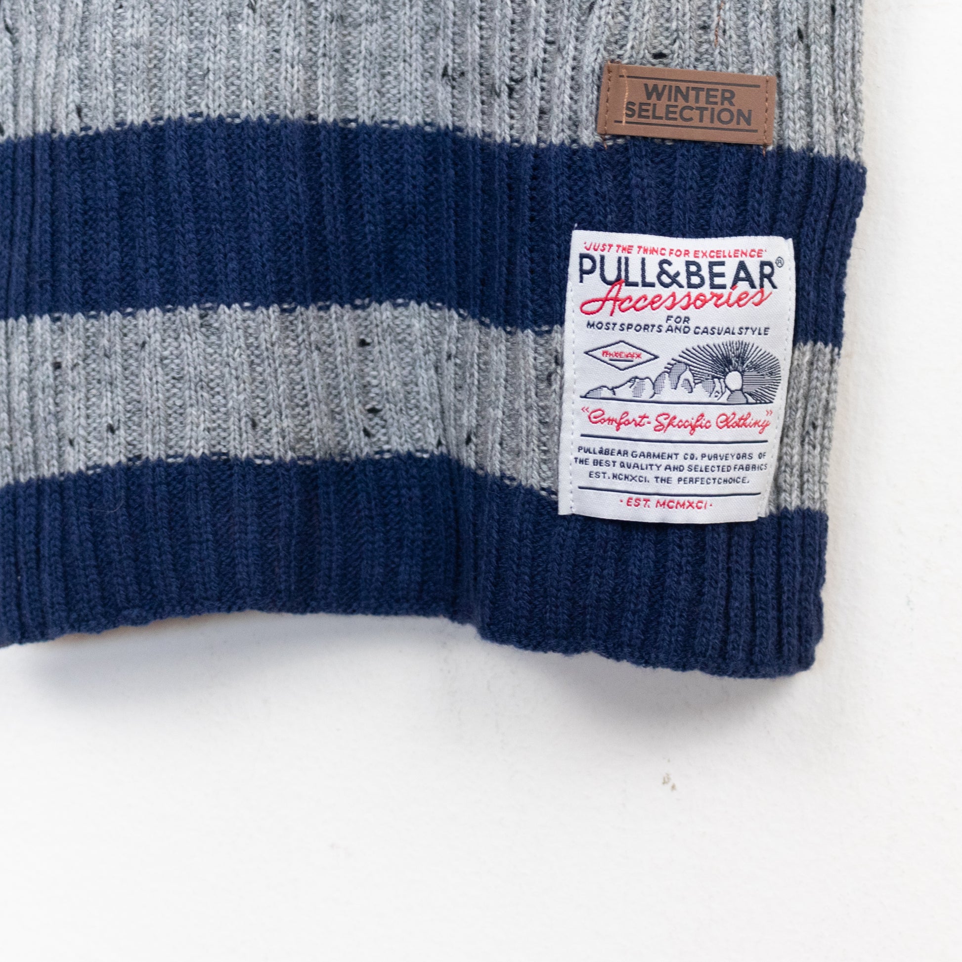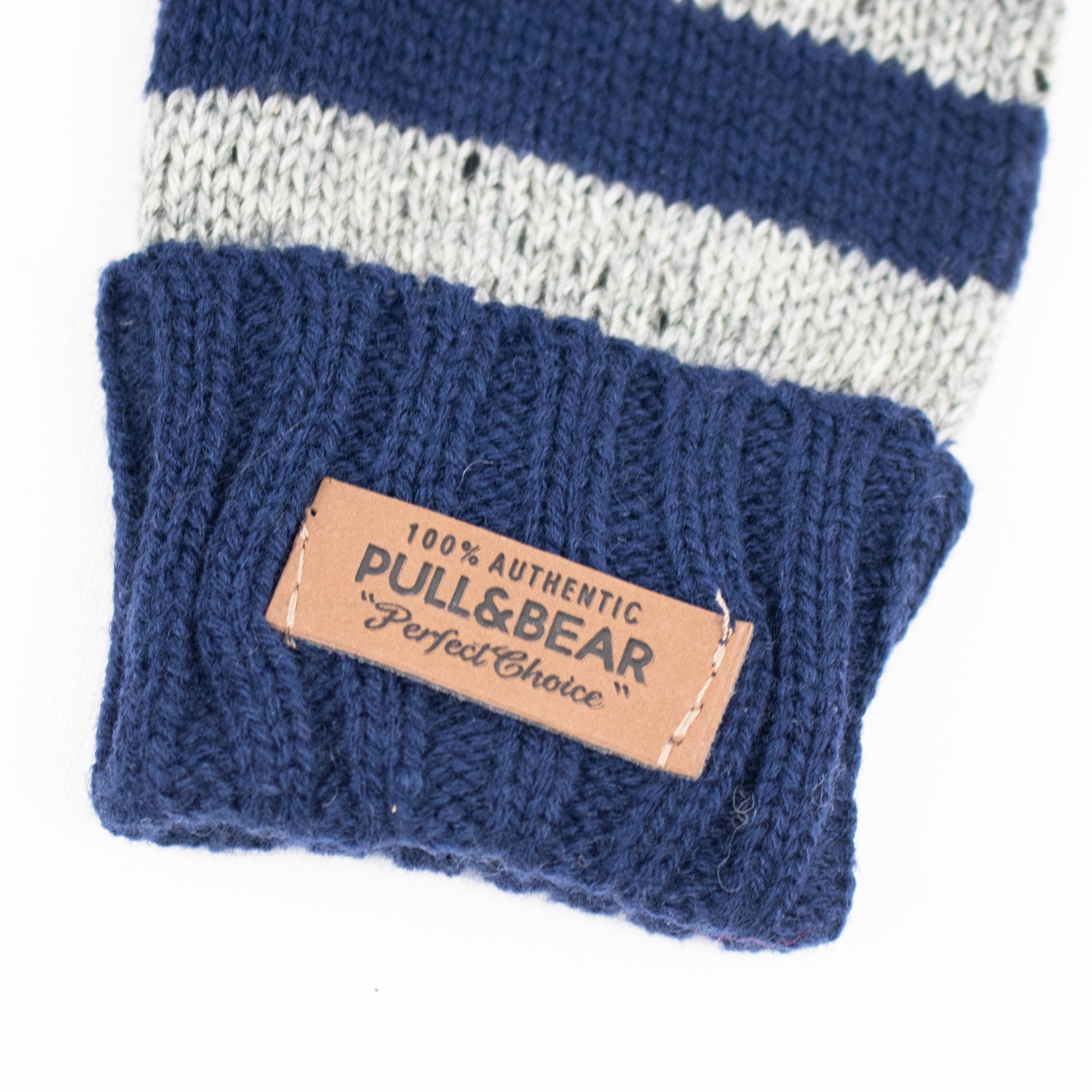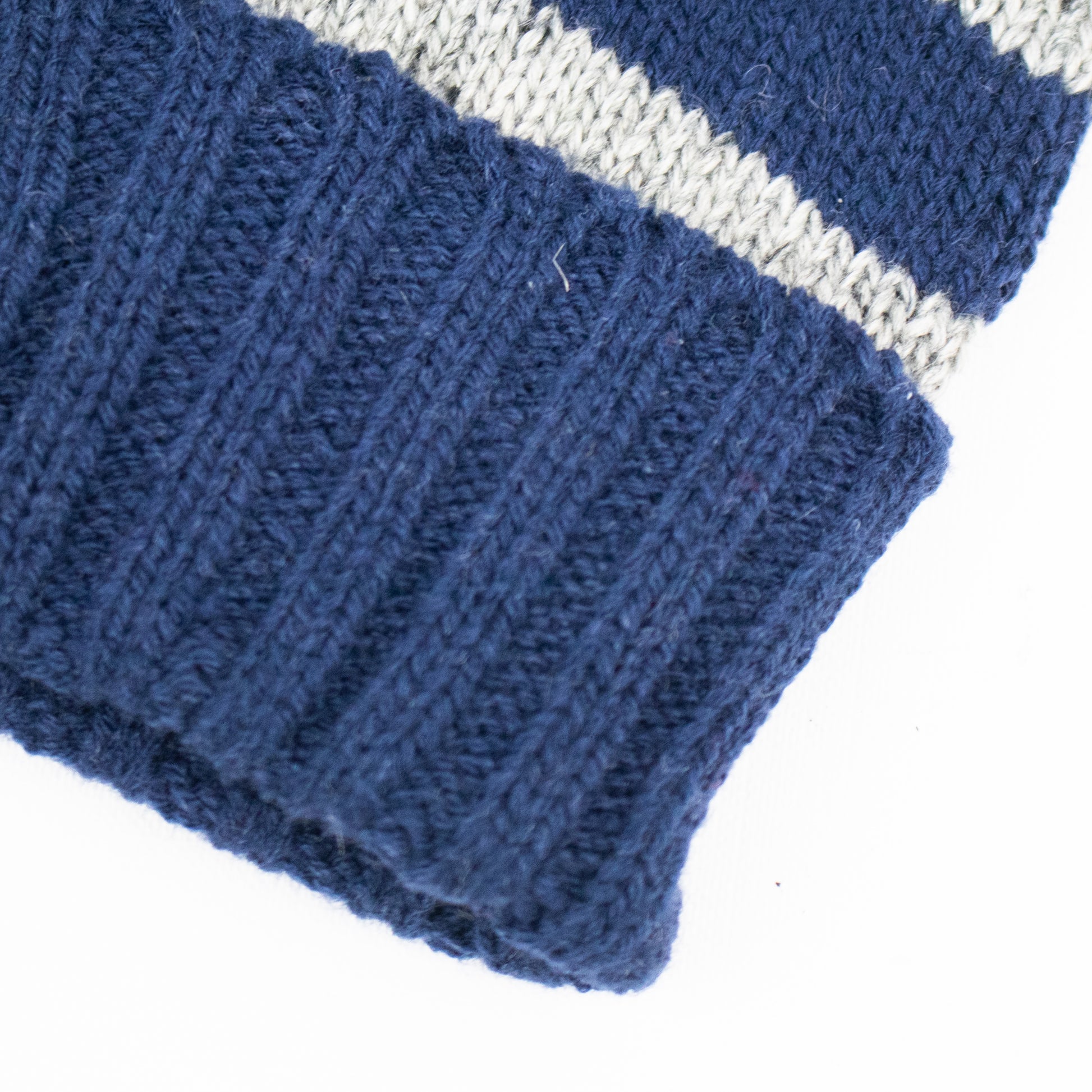 Conjunto de cachecol e luvas de malha com riscas horizontais.