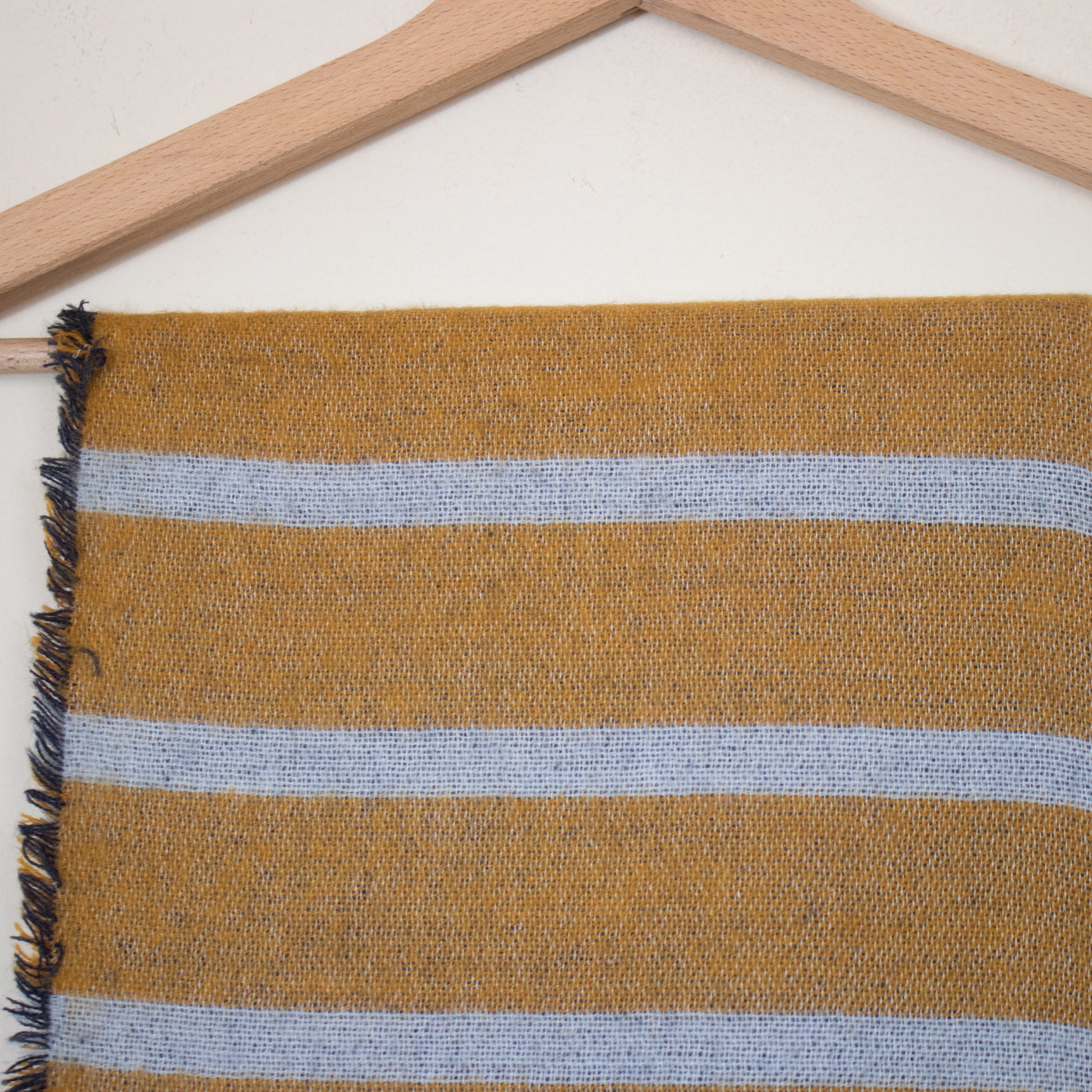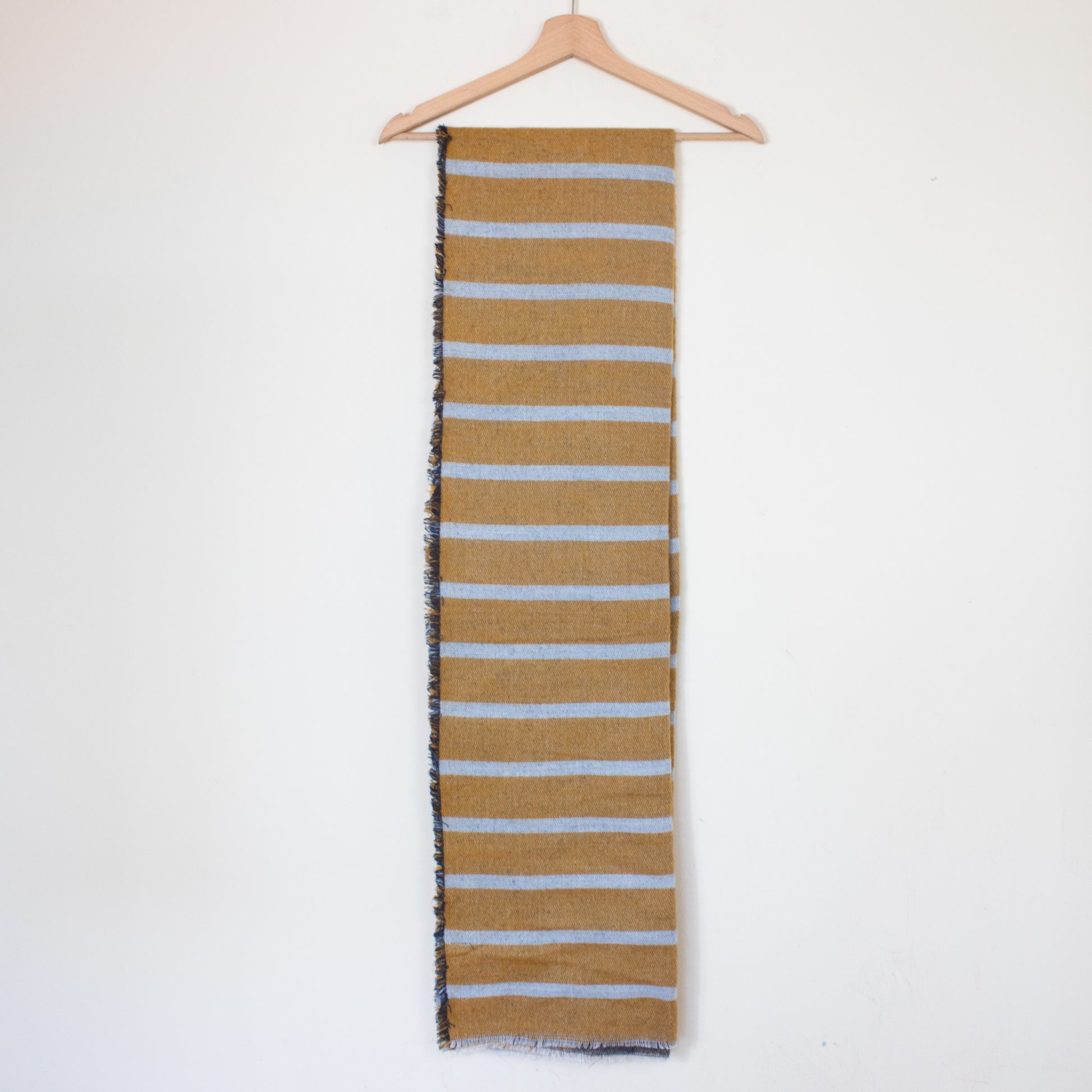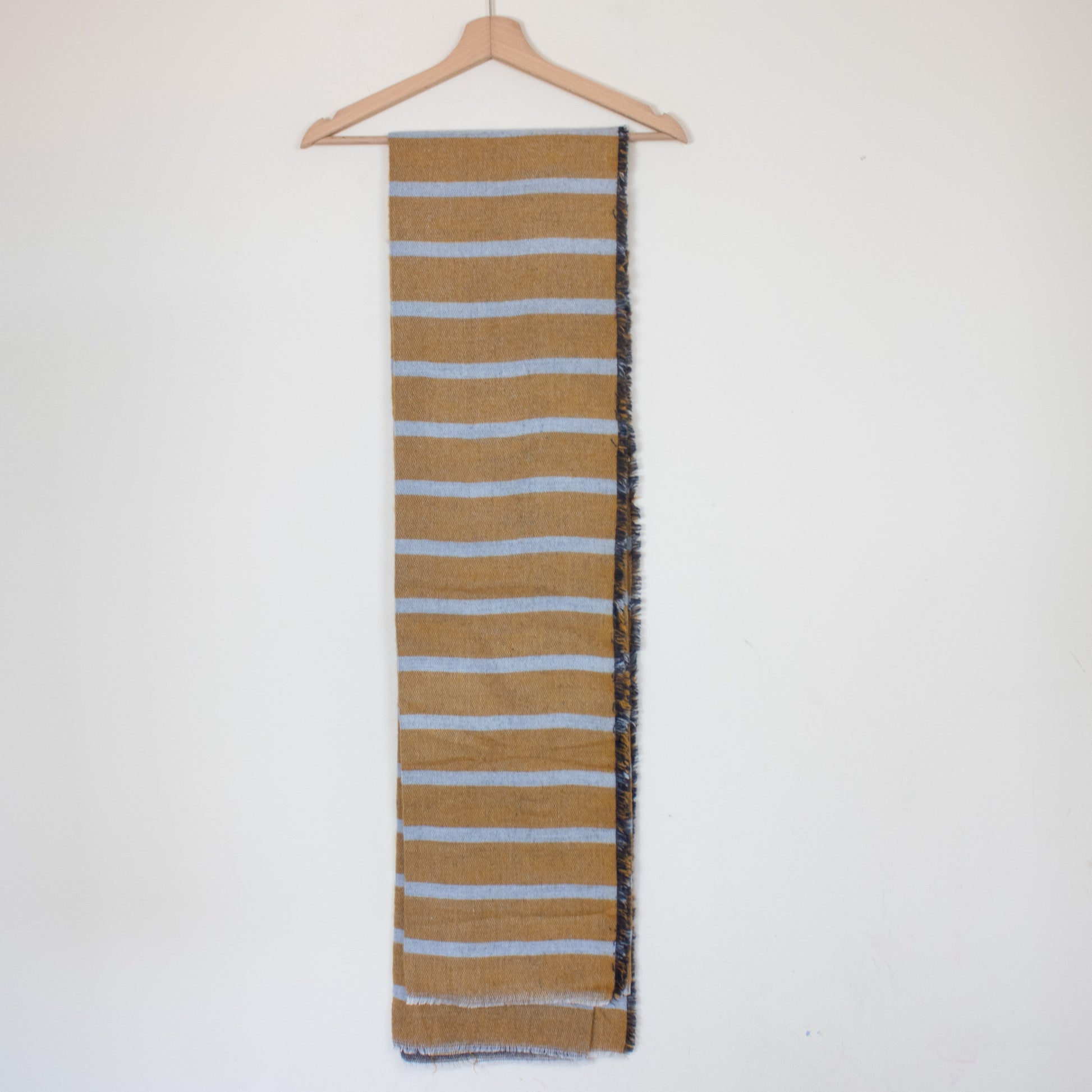 Écharpe em viscose jacquard, suave e envolvente, com padrão listrado em tons neutros. Com orlas sem acabamento e franja curta nos lados em tom preto.