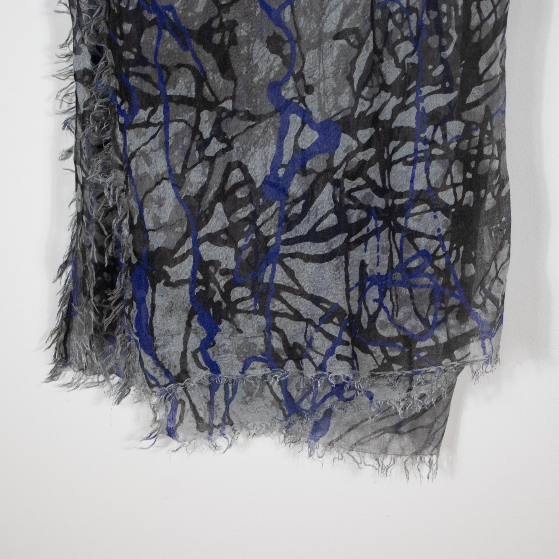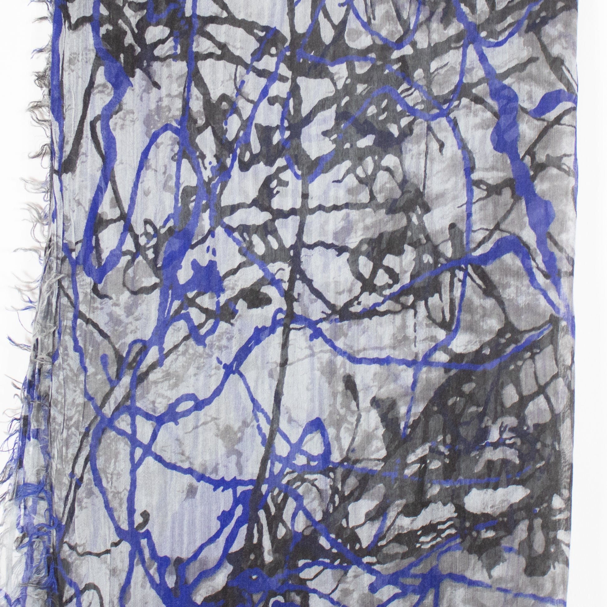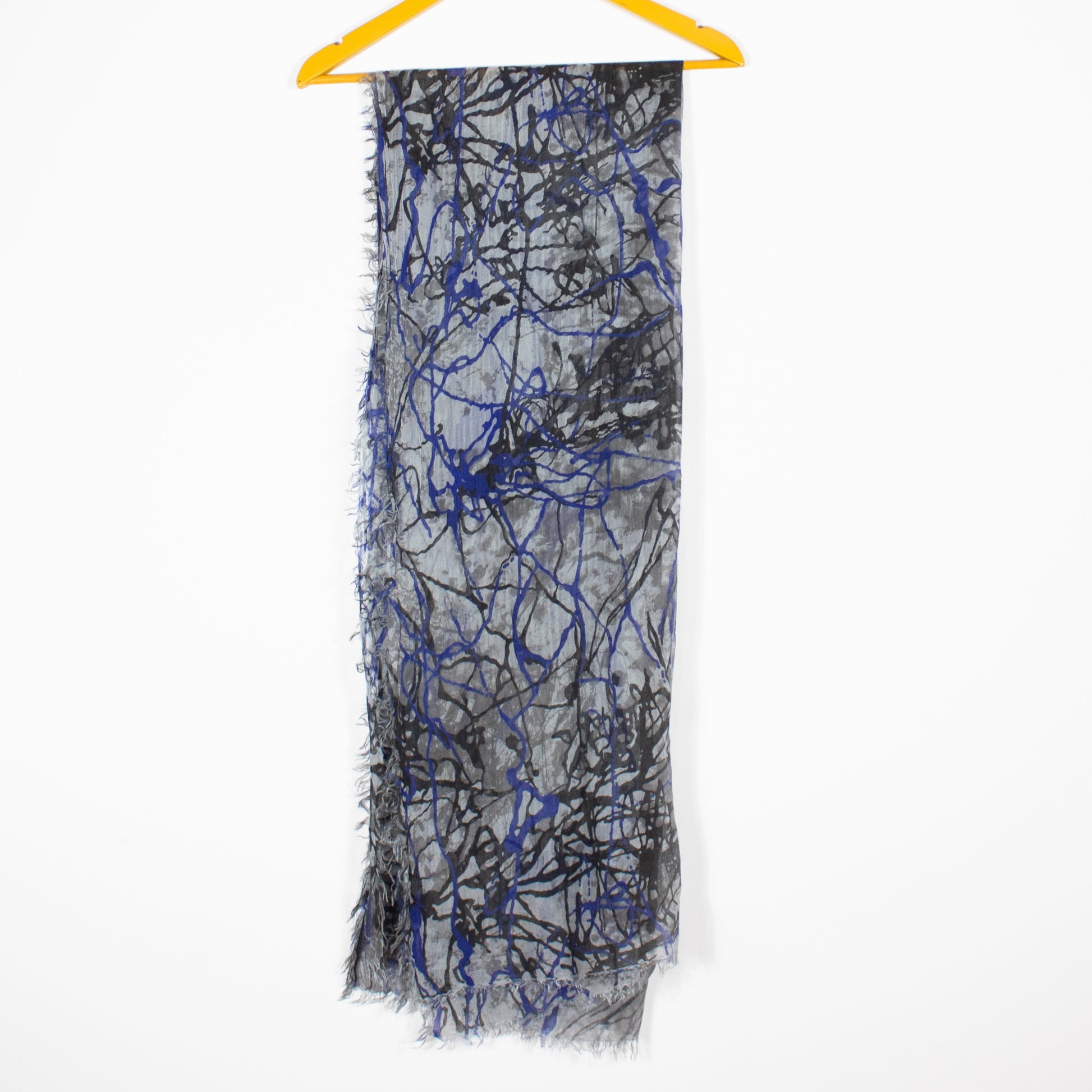 Écharpe em viscose jacquard, suave e envolvente com padrão original em tonalidades frias. Com orlas sem acabamento e franja curta.