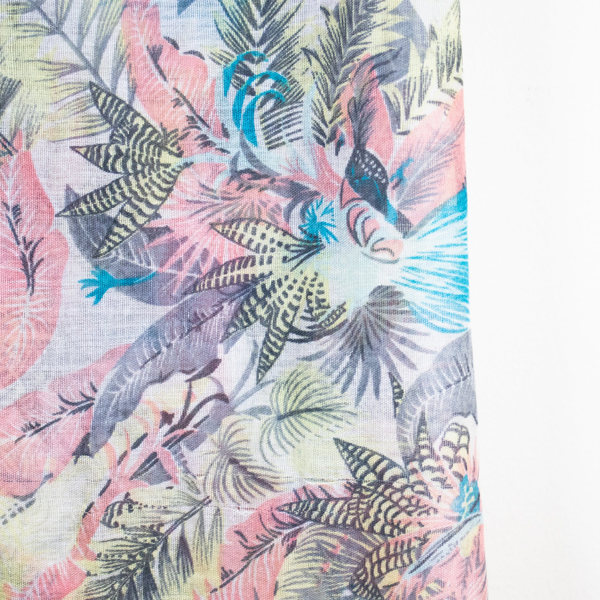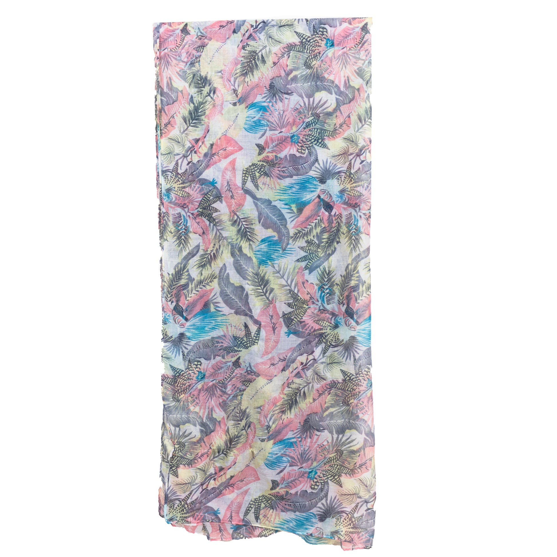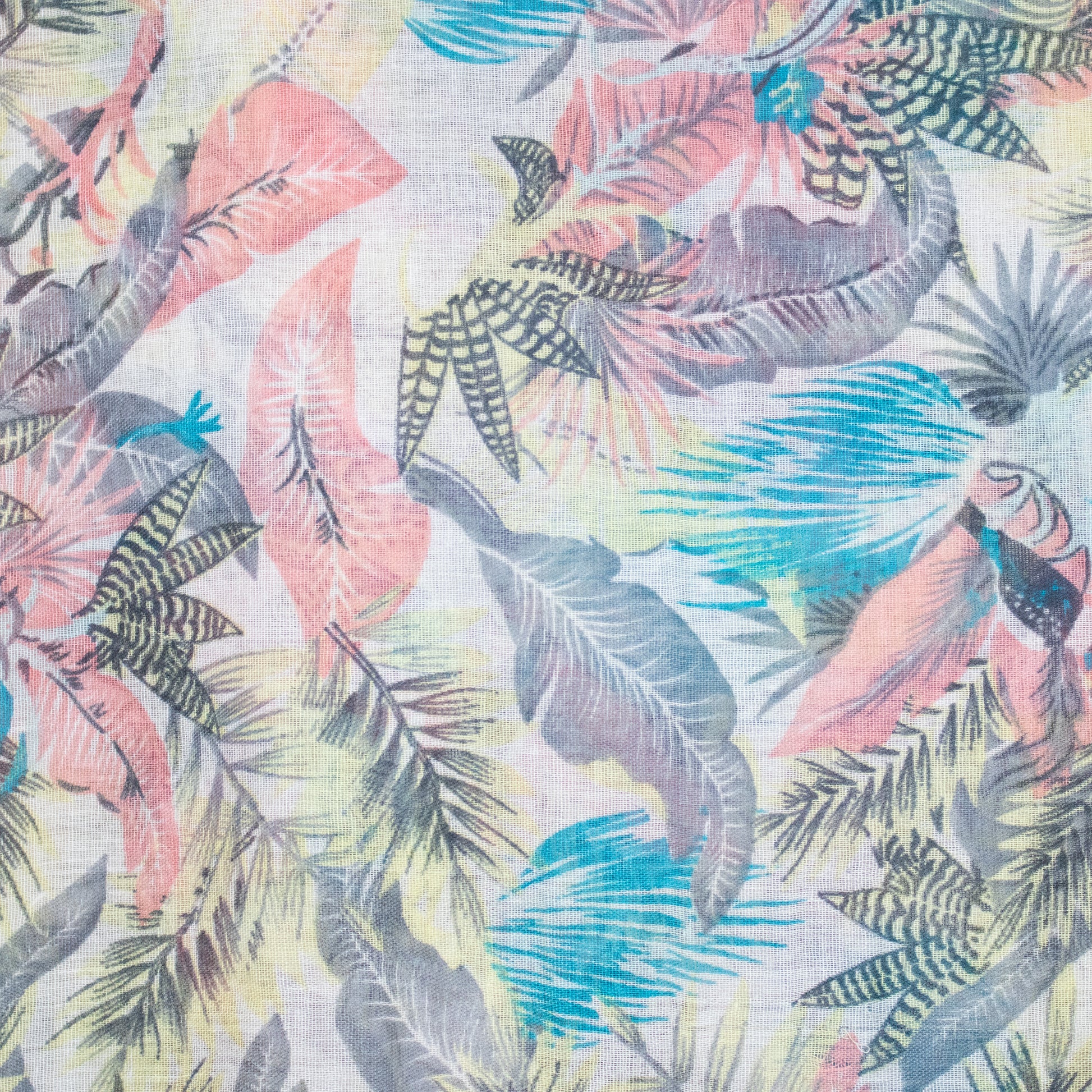 Lenço de tecido semitransparente com padrão de fohas de várias cores e feitios.