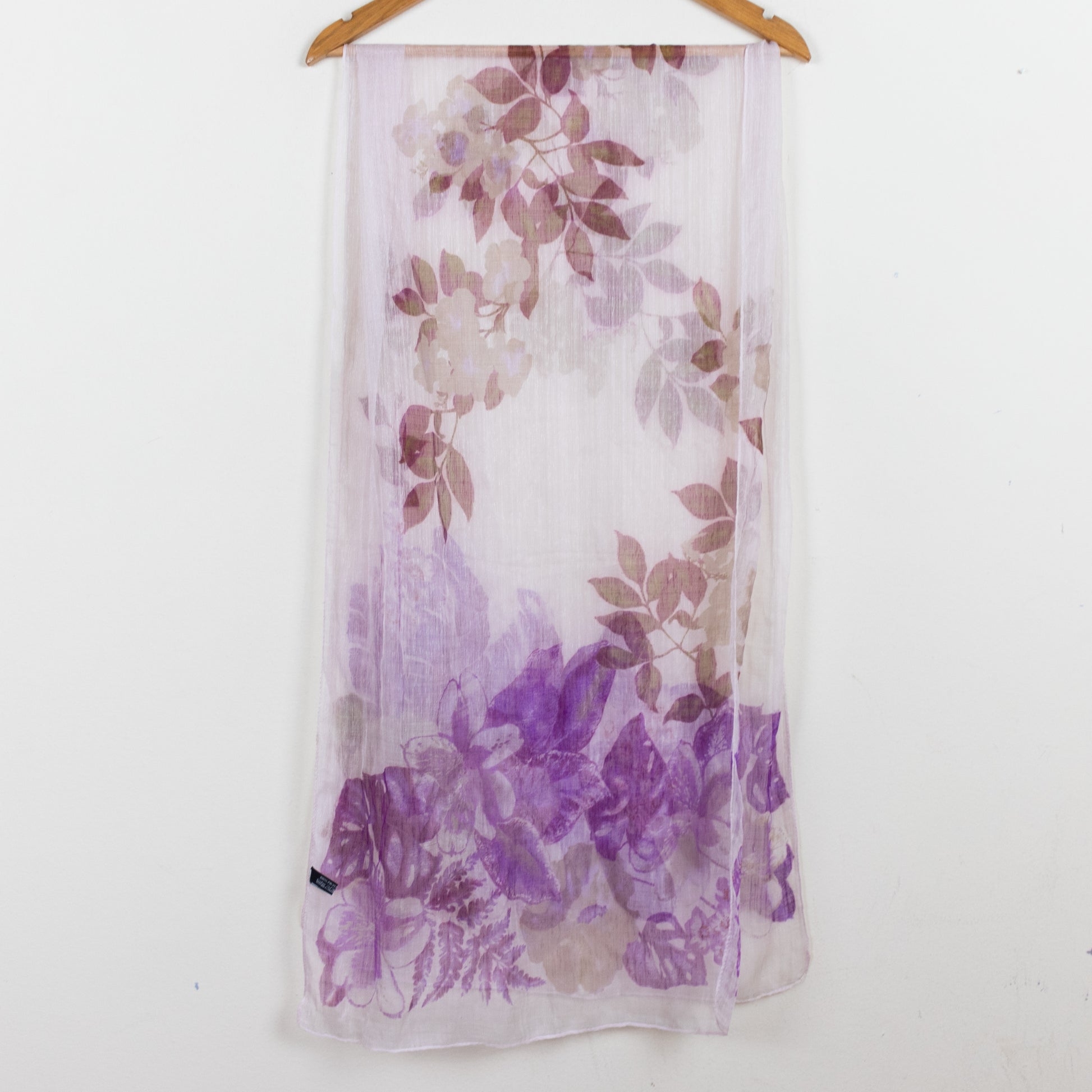 Lenço semitransparente com padrão floral em tons roxos e castanhos.