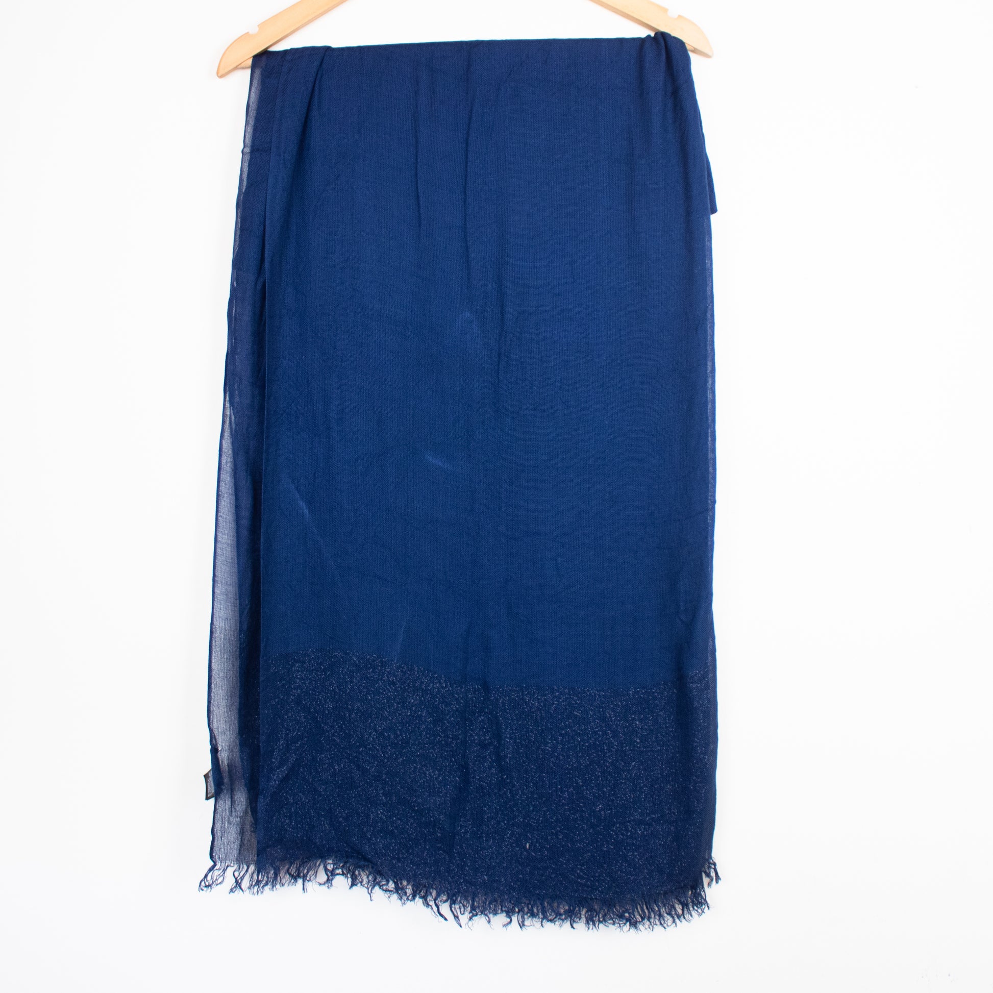 Lenço em tonalidade uniforme, em tom azul, em formato retangular, com franjas.