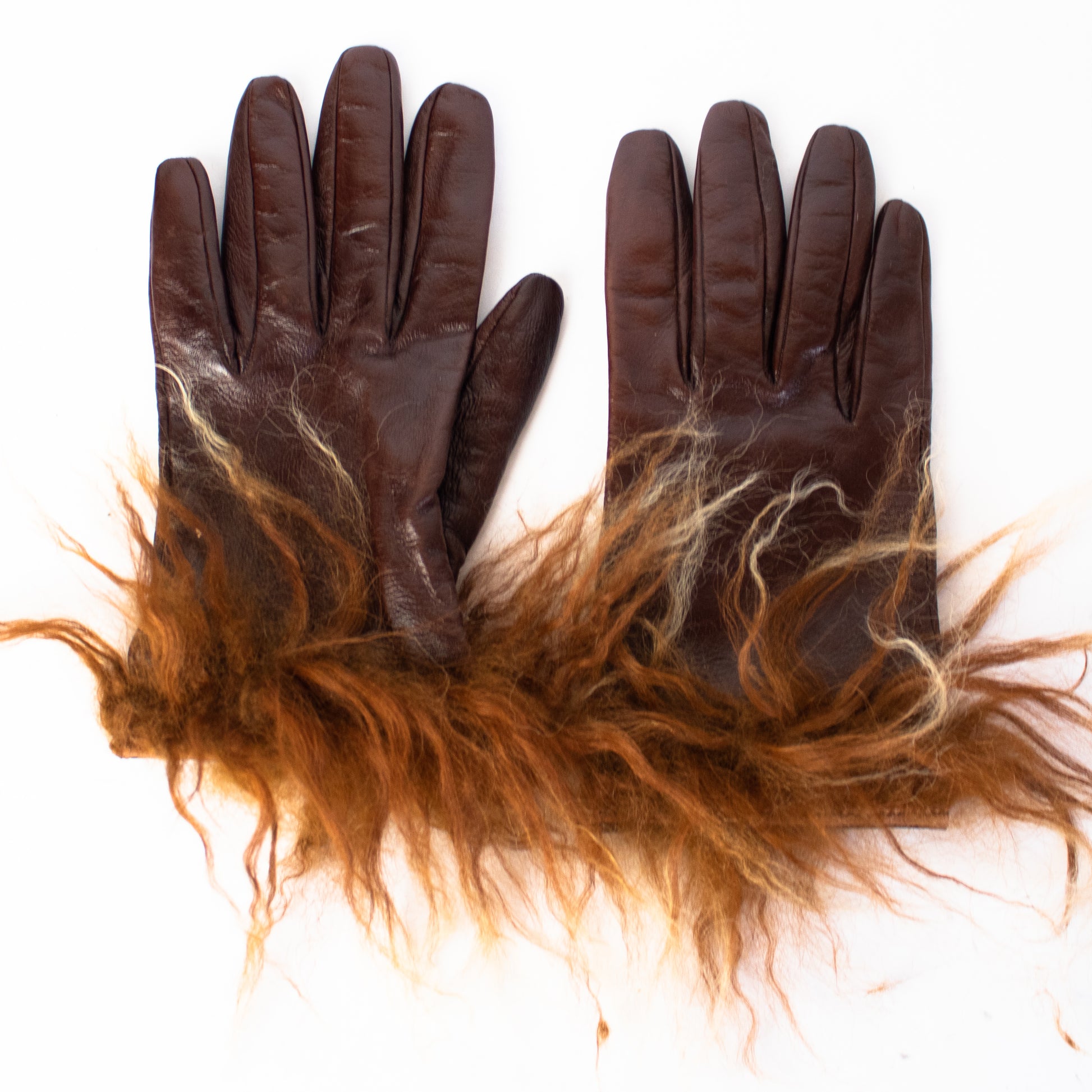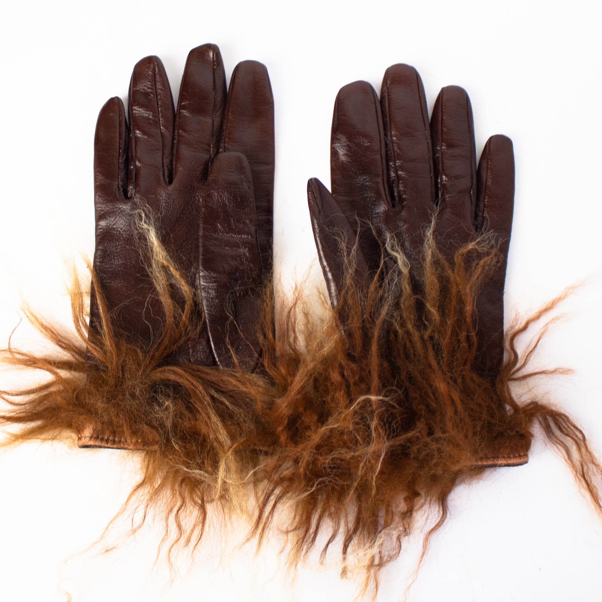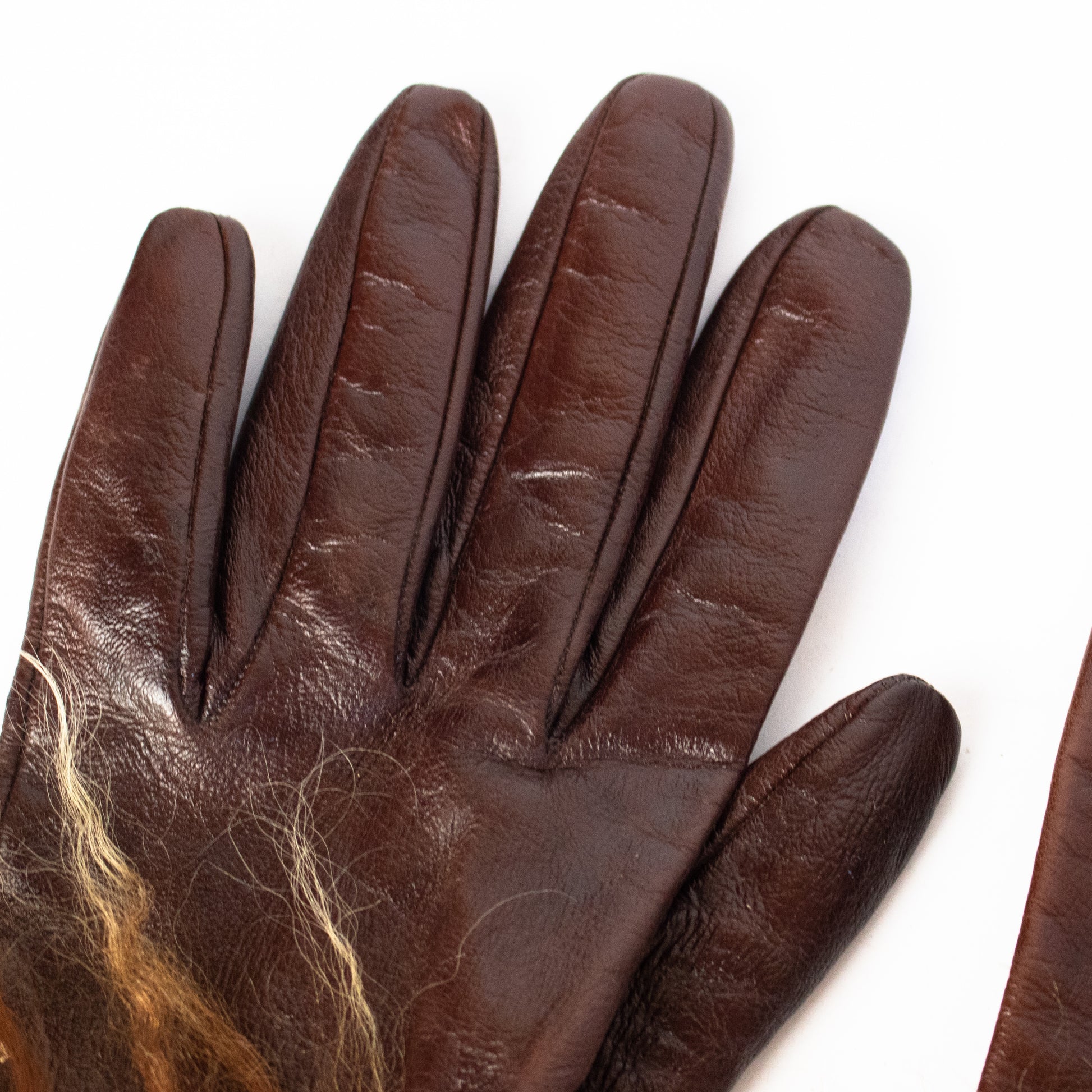 Um par de luvas em pele em tom castanho escuro, com elástico nos pulsos para um bom ajuste. Aplicação de pelo felpudo em tom a combinar.