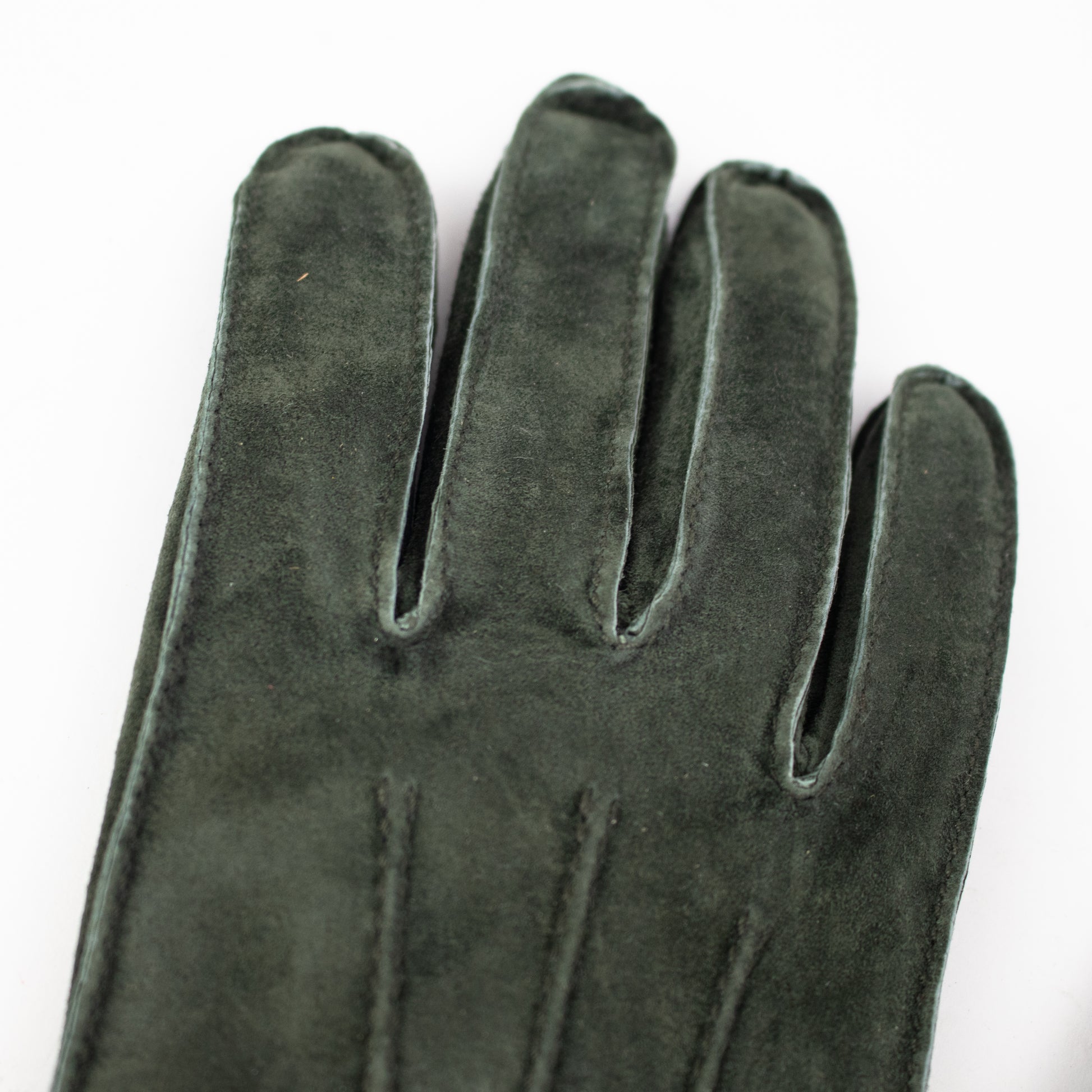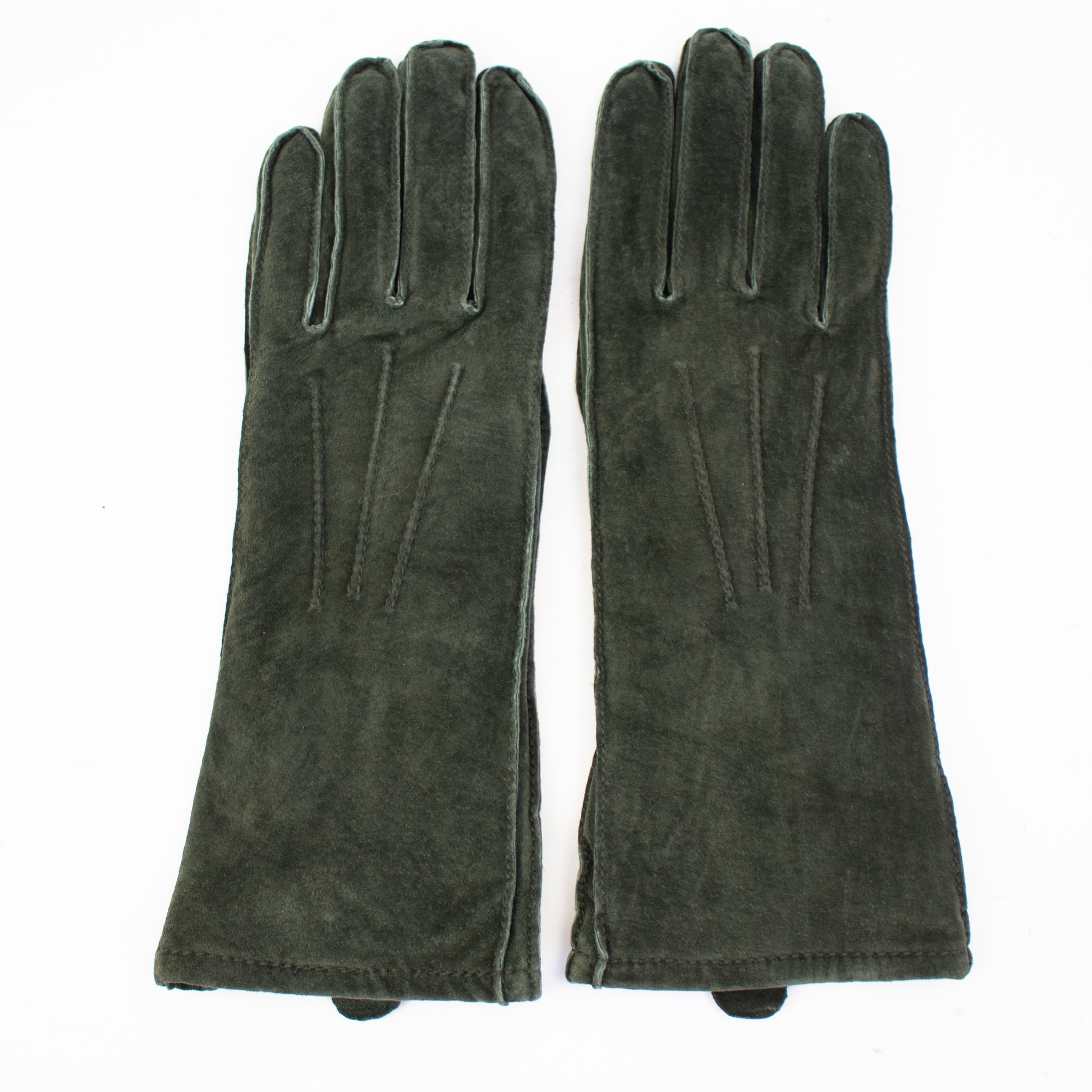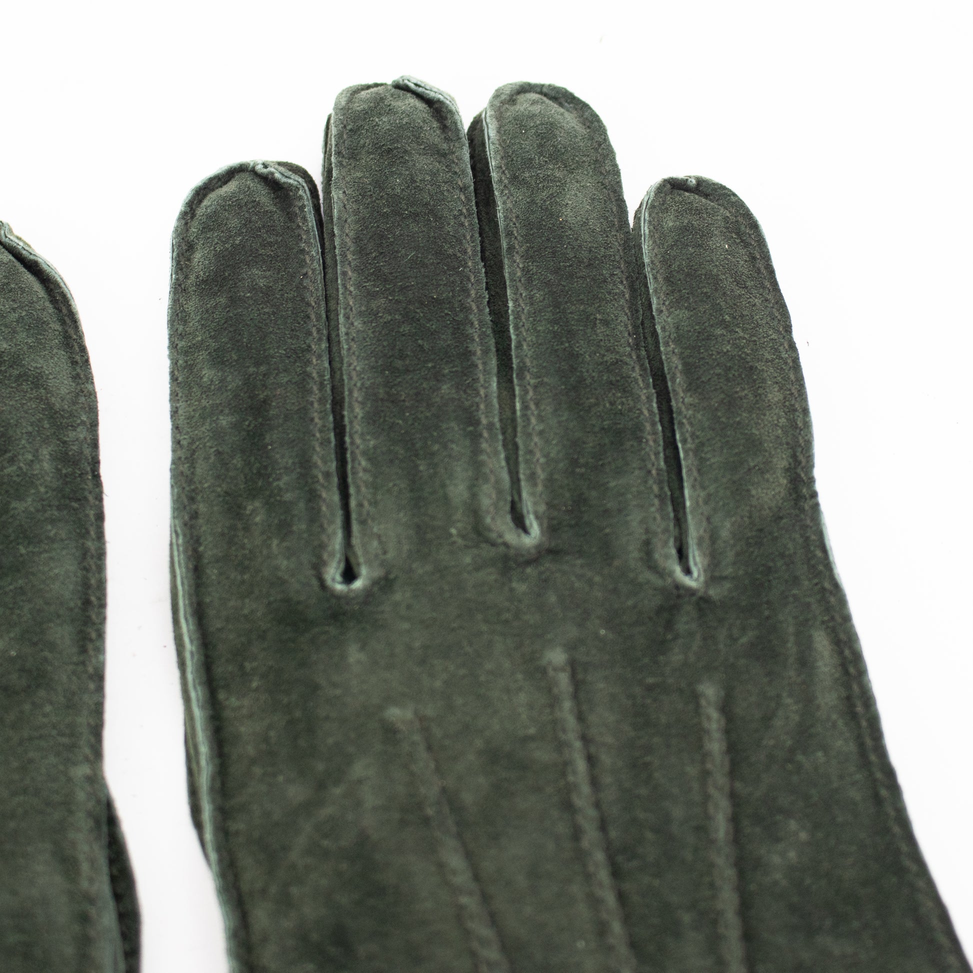 Um par de luvas em pele com acabamento em croute, em tom verde, com elástico fino nos pulsos para um bom ajuste.
