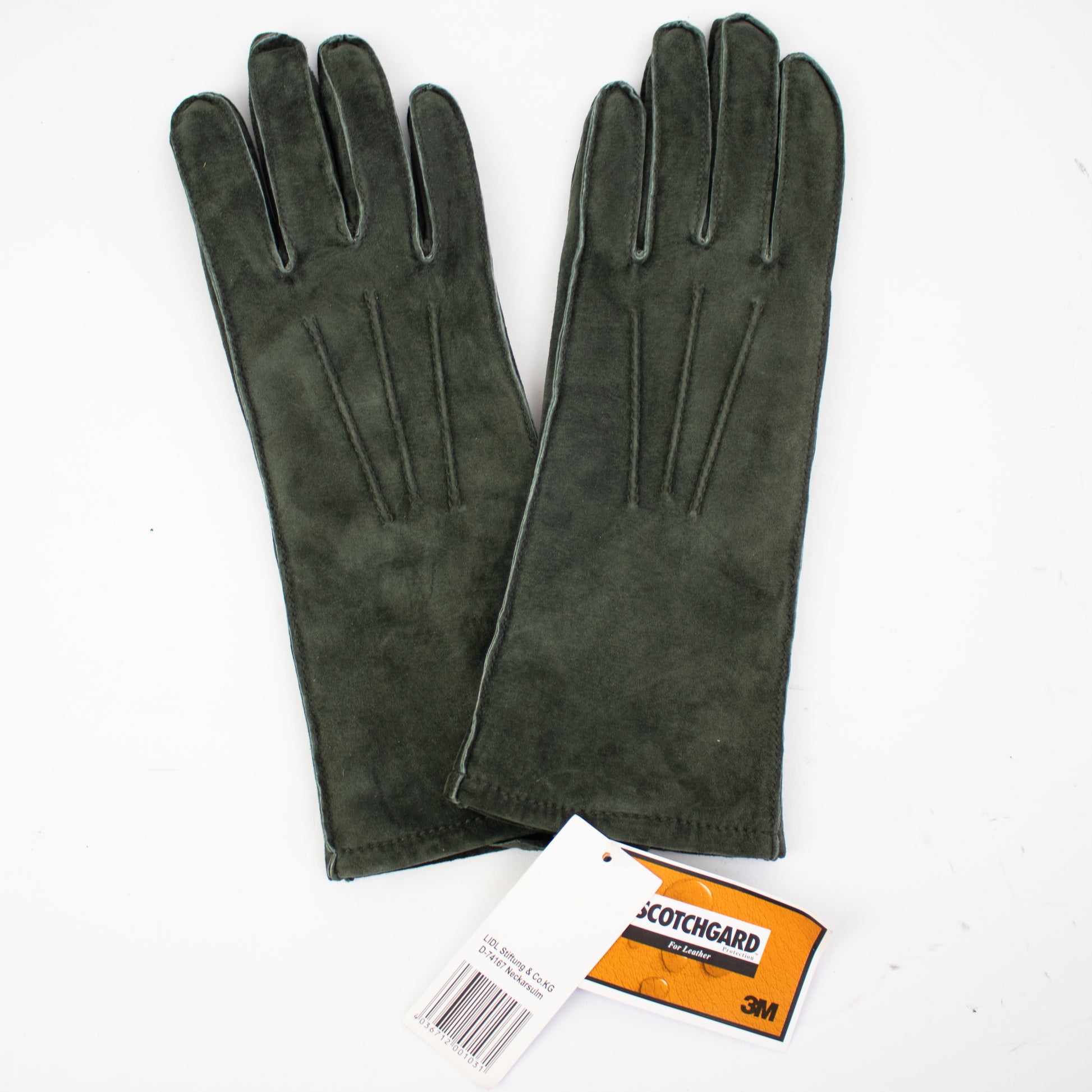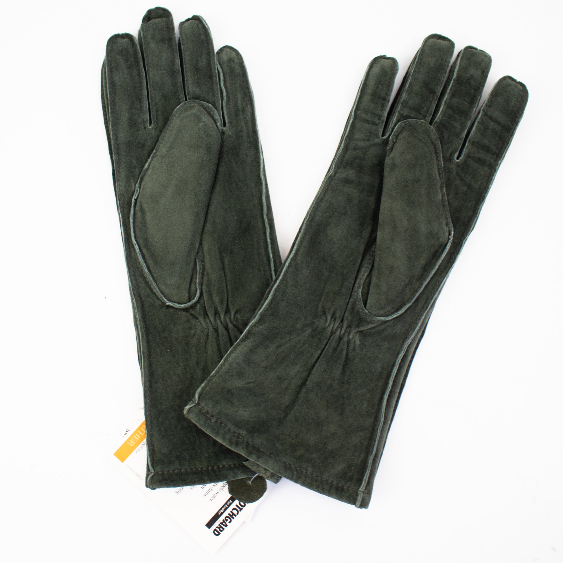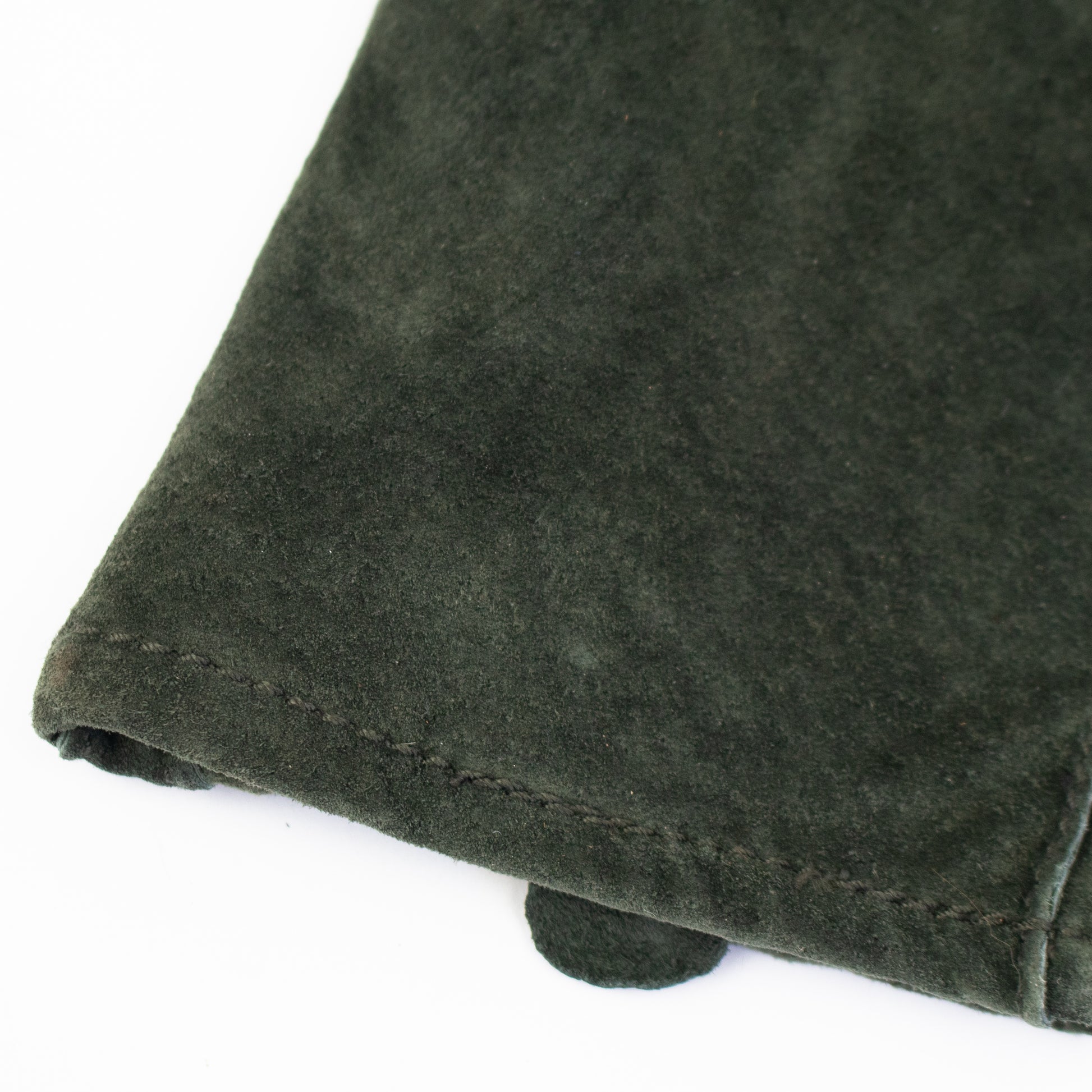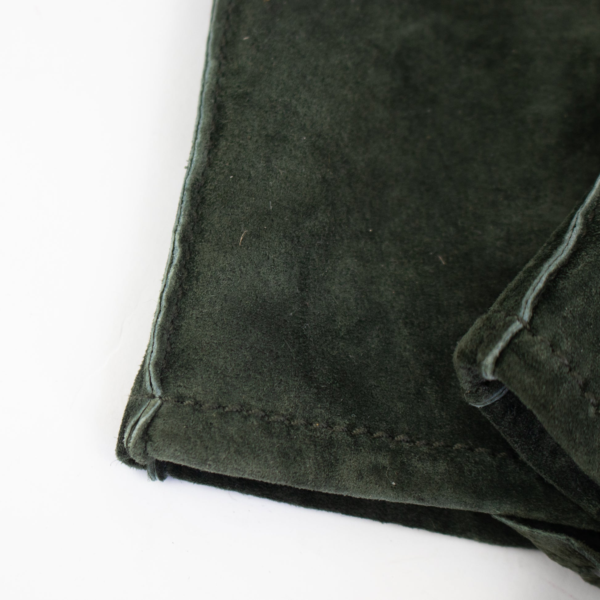 Um par de luvas em pele com acabamento em croute, em tom verde, com elástico fino nos pulsos para um bom ajuste.