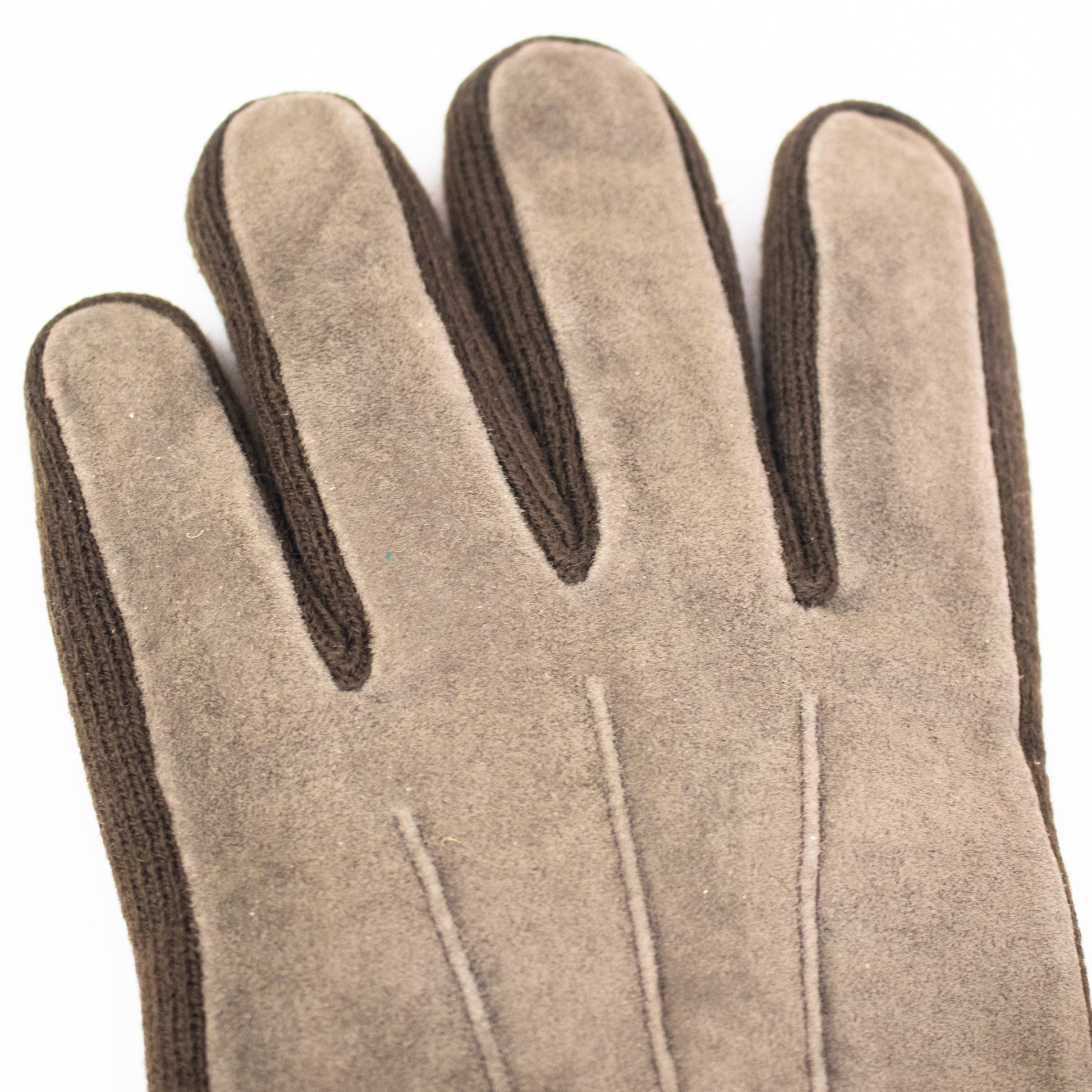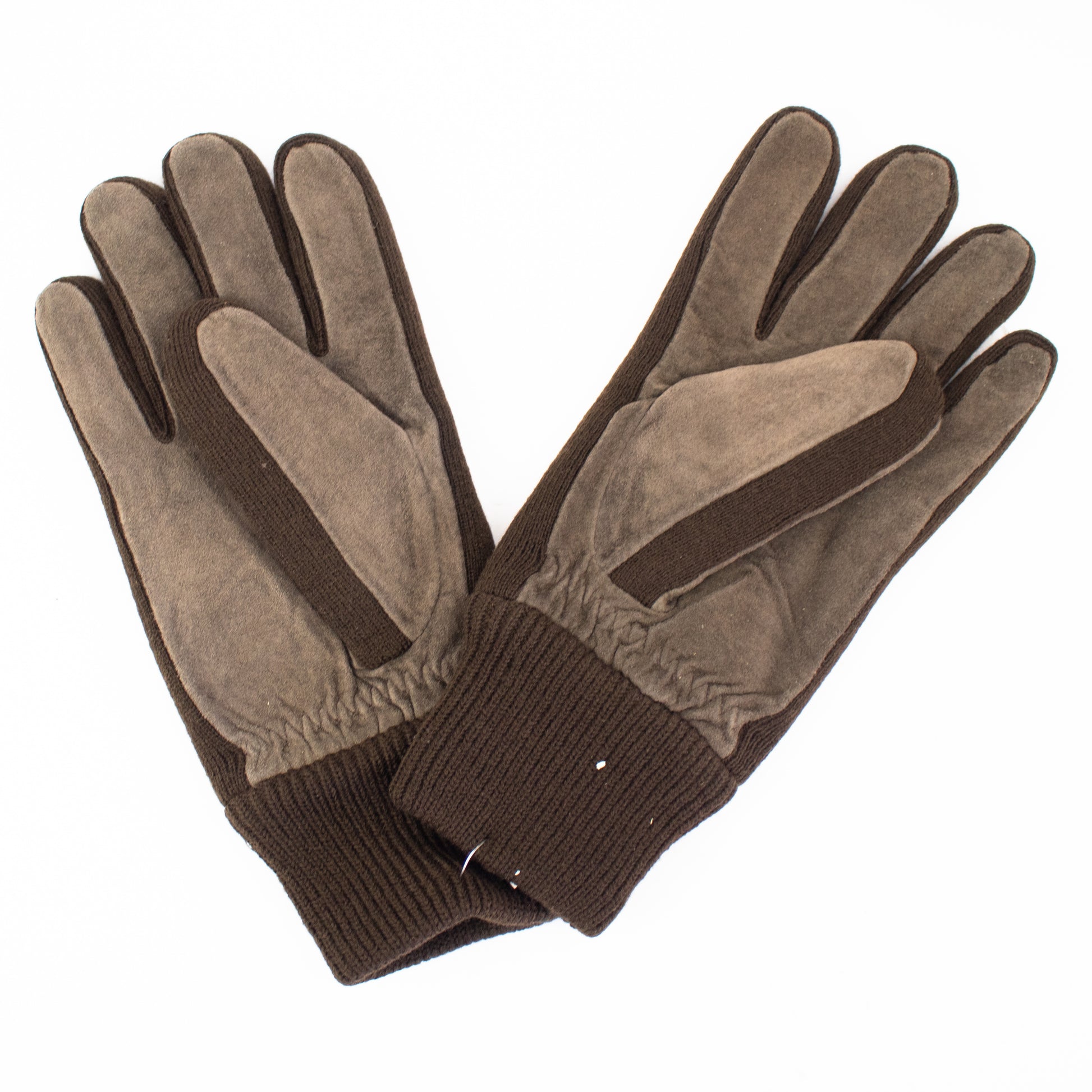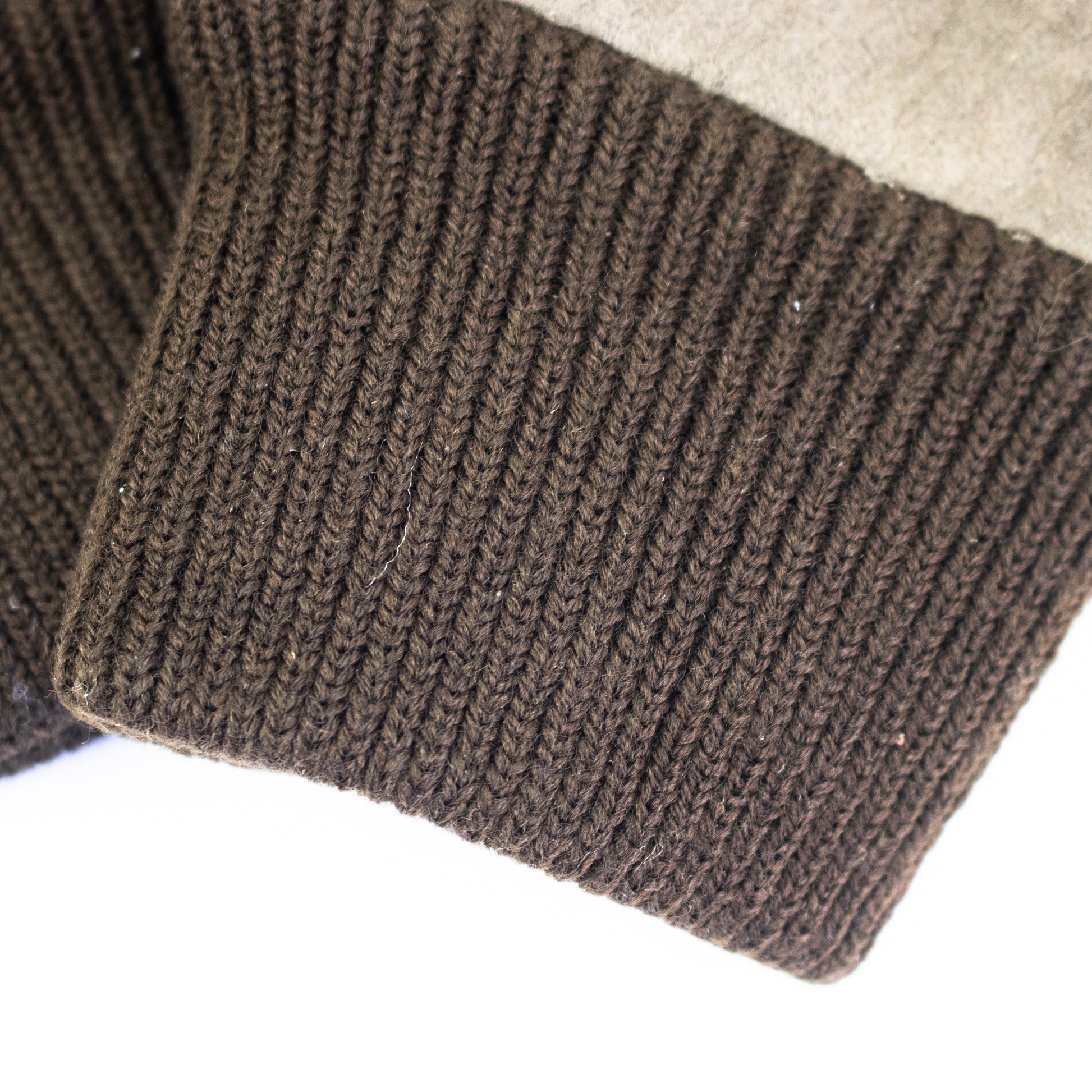 Um par de luvas em pele com acabamento em croute, em tom camel na frente e castanho no verso, com elástico nos pulsos e malha canelada larga para um bom ajuste.