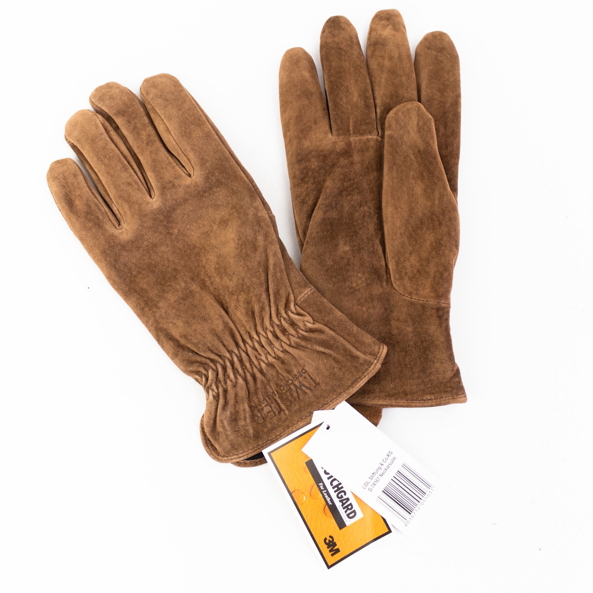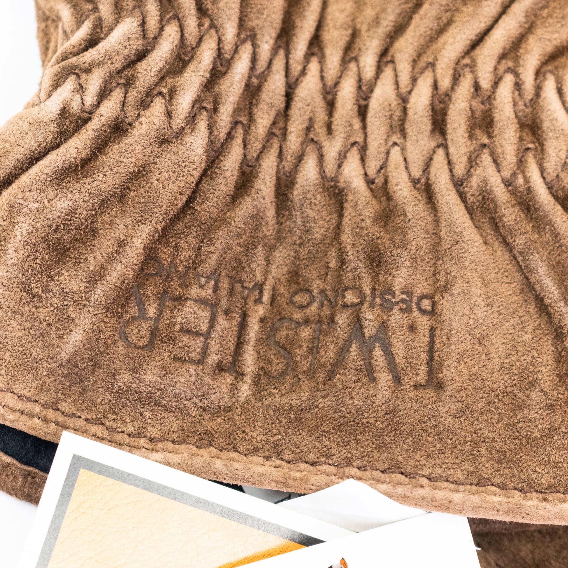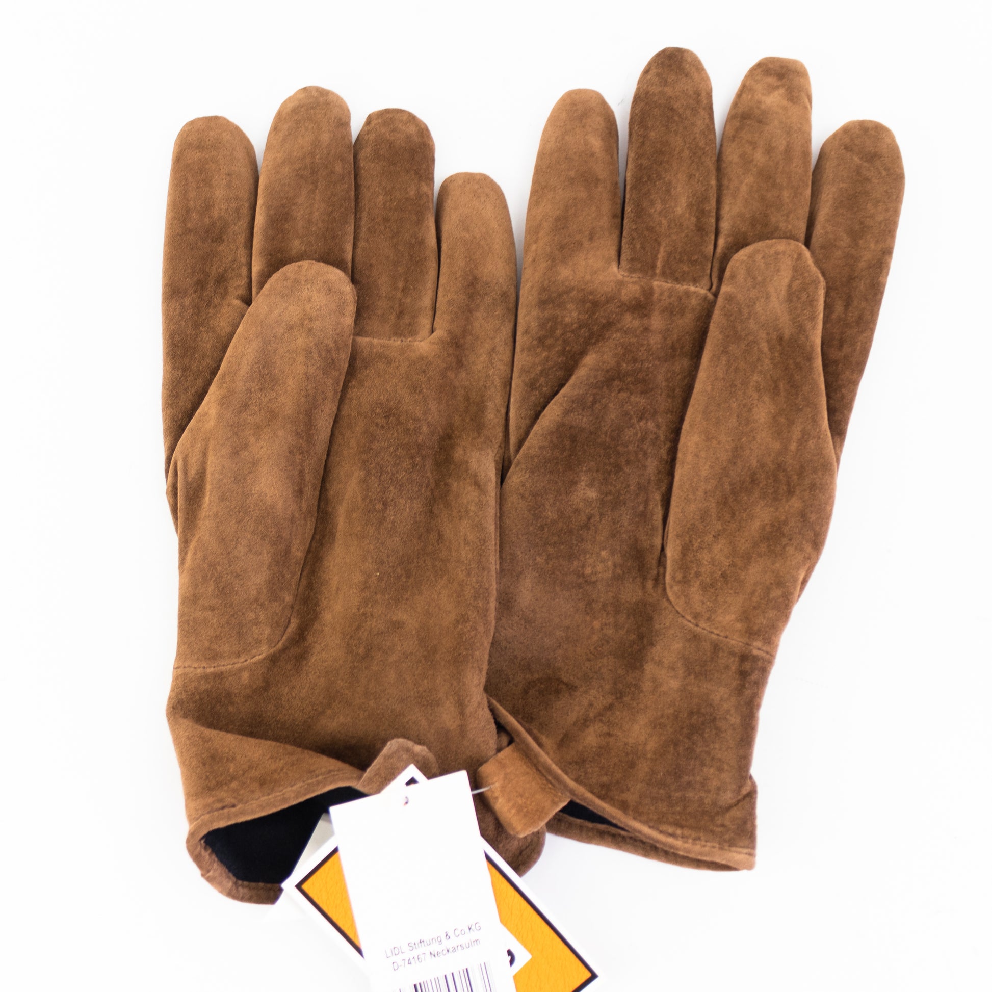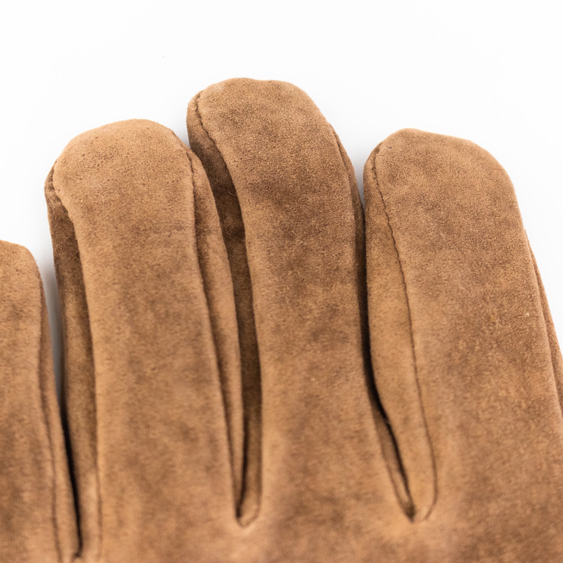 Um par de luvas em pele com acabamento em croute, em tom camel, com elástico nos pulsos para um bom ajuste.