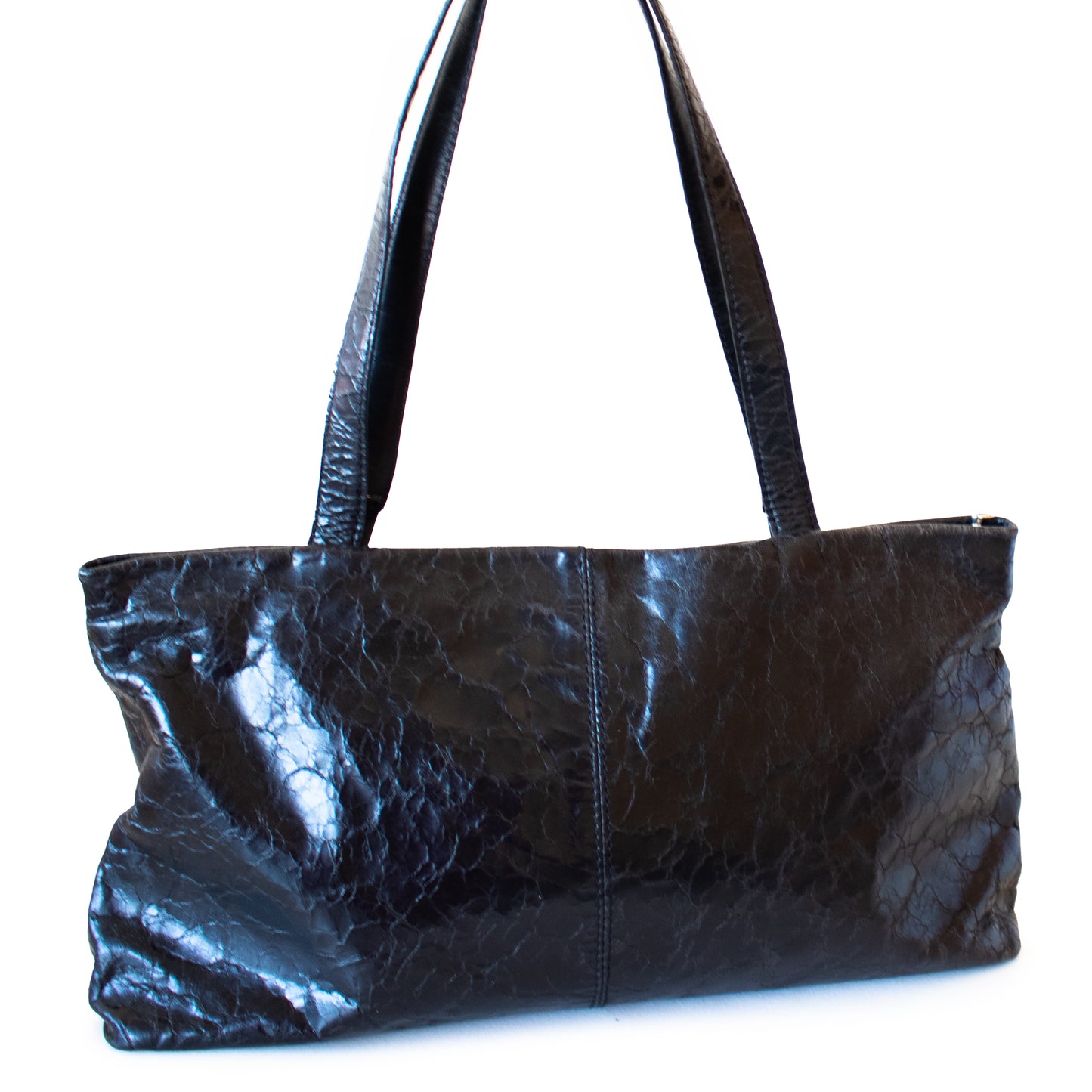Mala de ombro em pele gravada em tom preto, com forro. Alça de ombro dupla com aplicações metalizadas em tom dourado. Compartimento com abertura de fecho éclair metalizado em tom dourado. Bolso interior com fecho éclair.