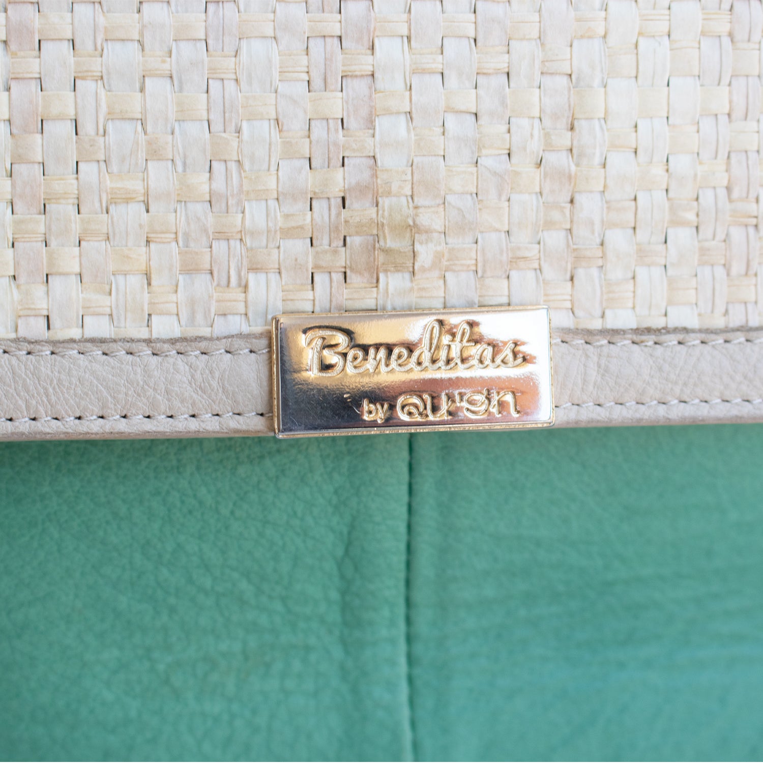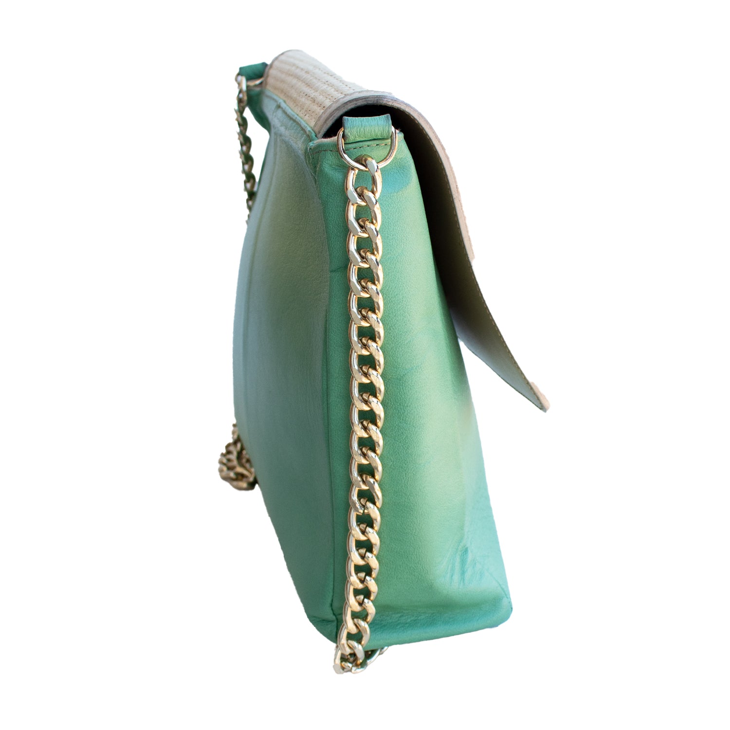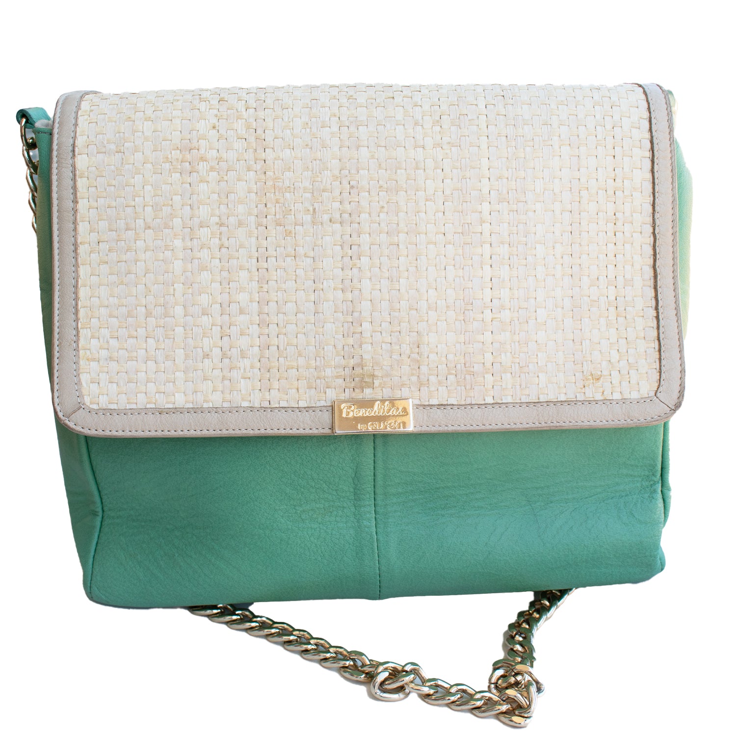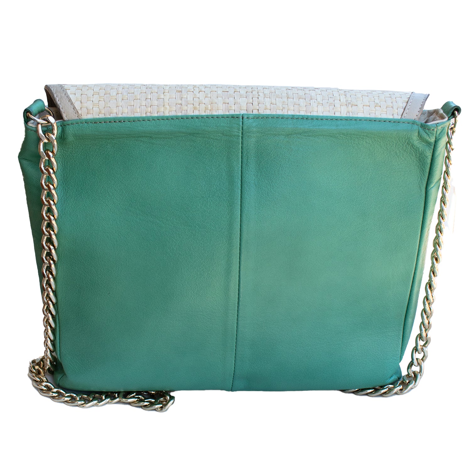 Mala com alça metálica dourada na cor verde, pala com pormenor de palha com fecho de mola magnética.