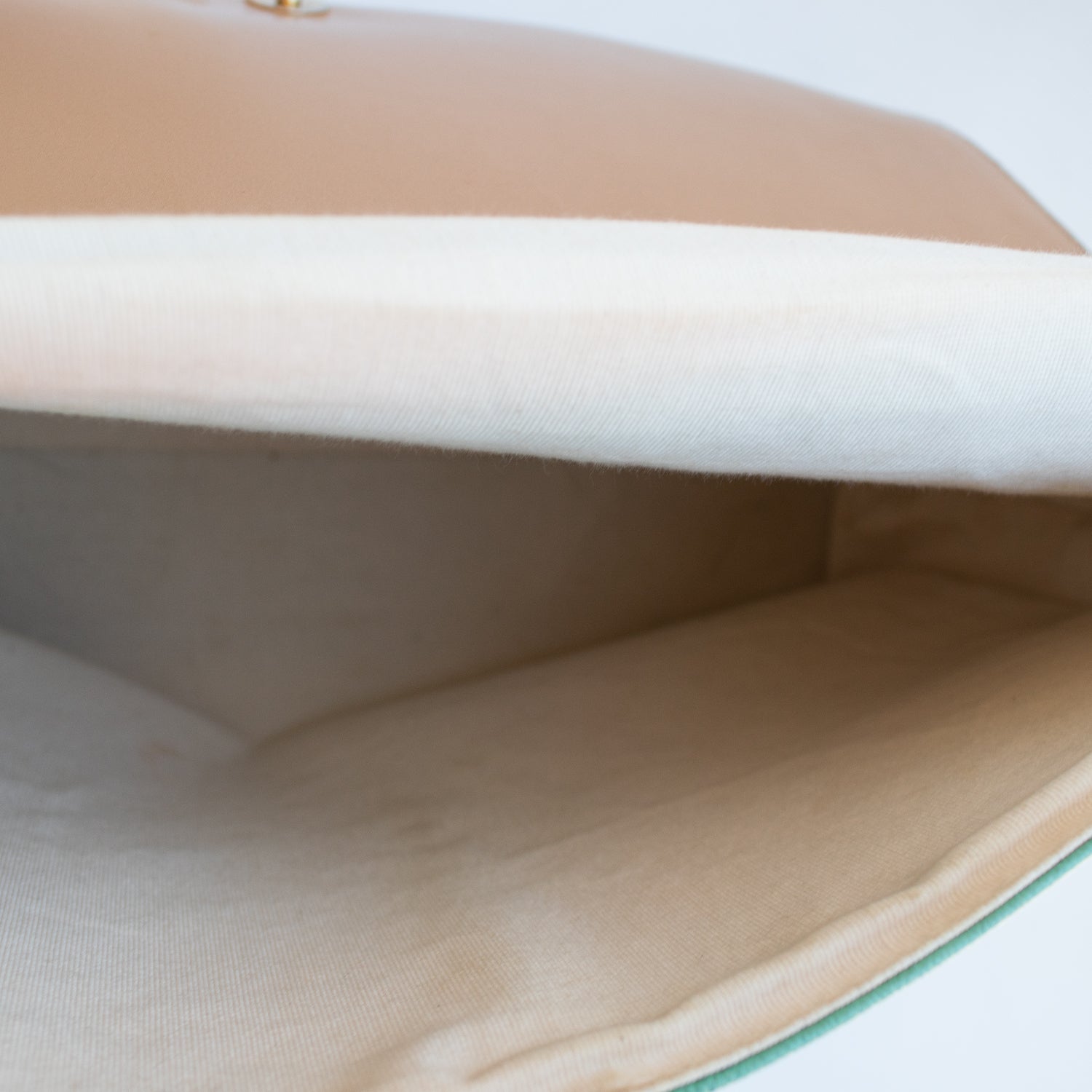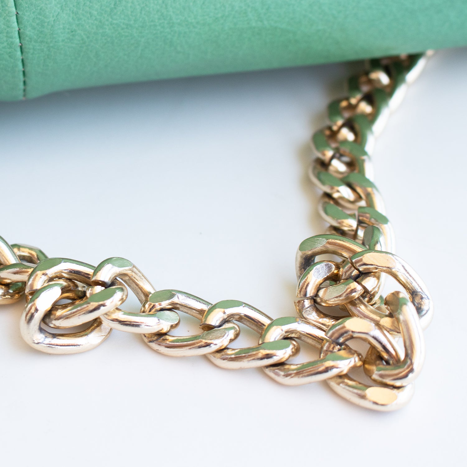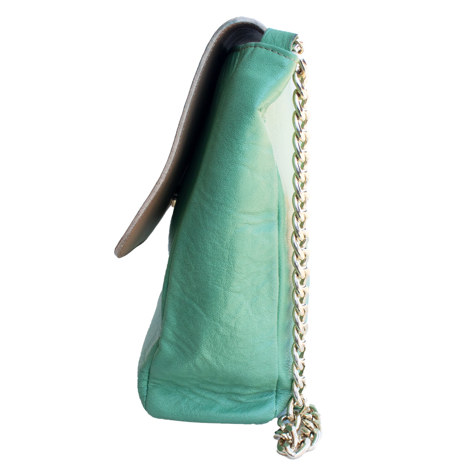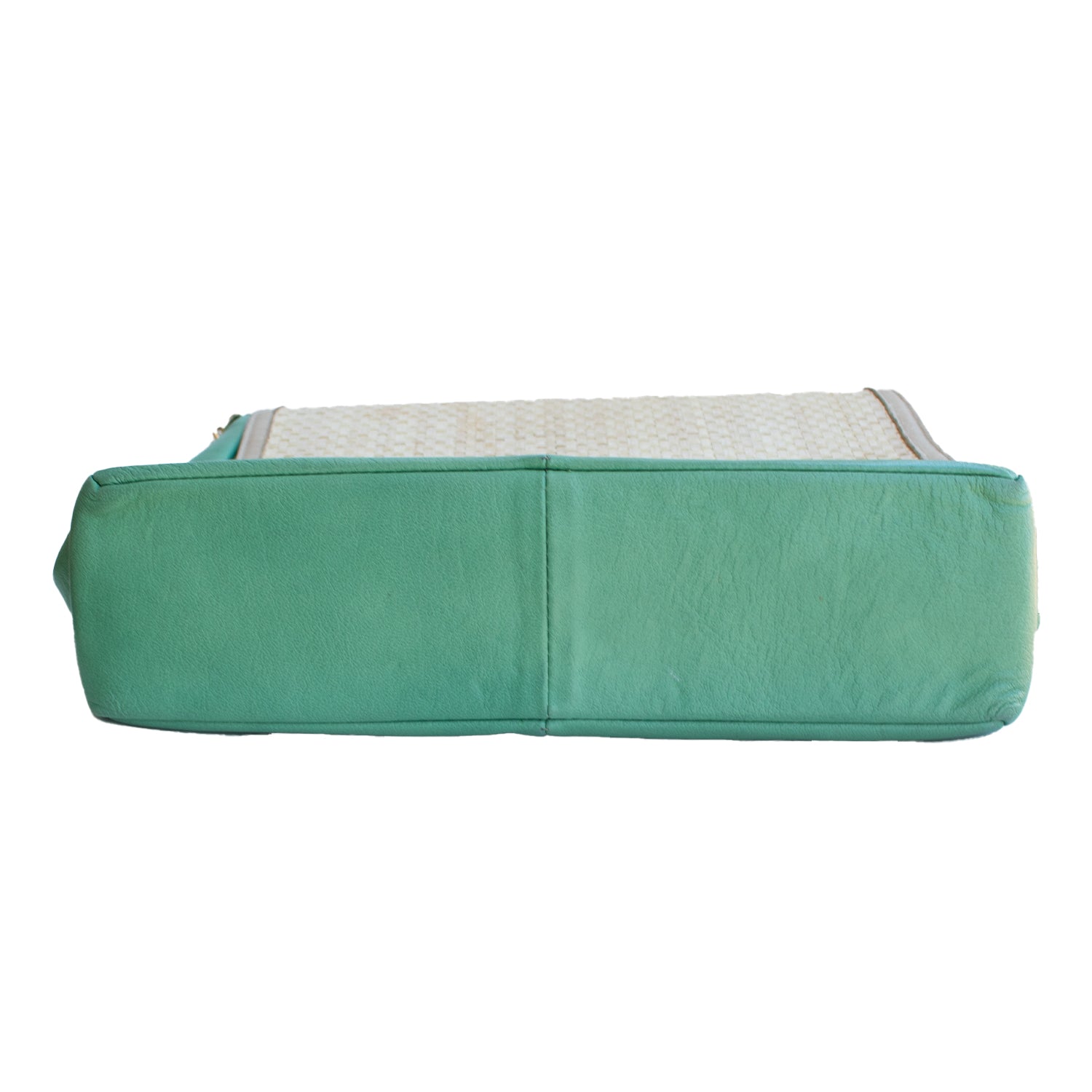 Mala com alça metálica dourada na cor verde, pala com pormenor de palha com fecho de mola magnética.