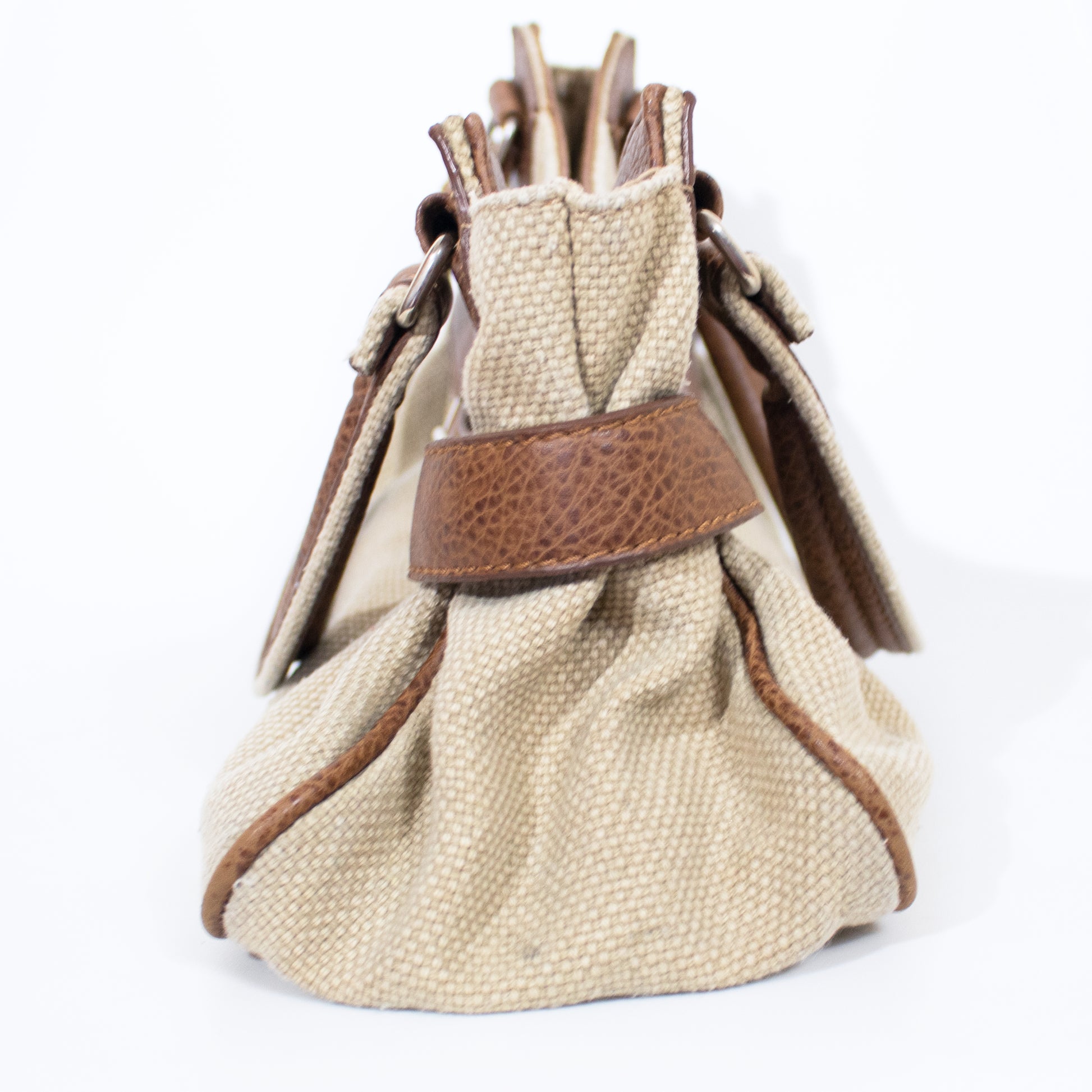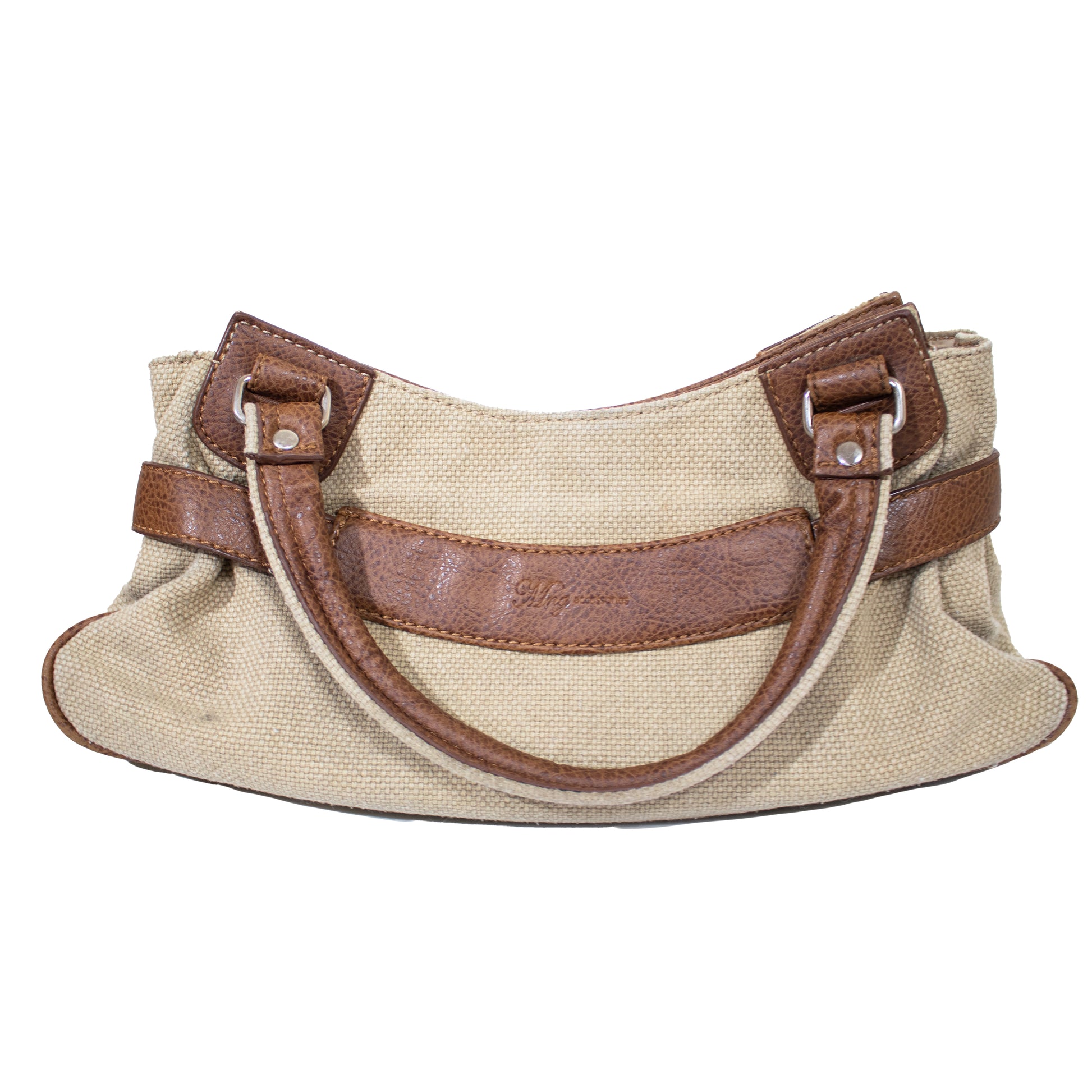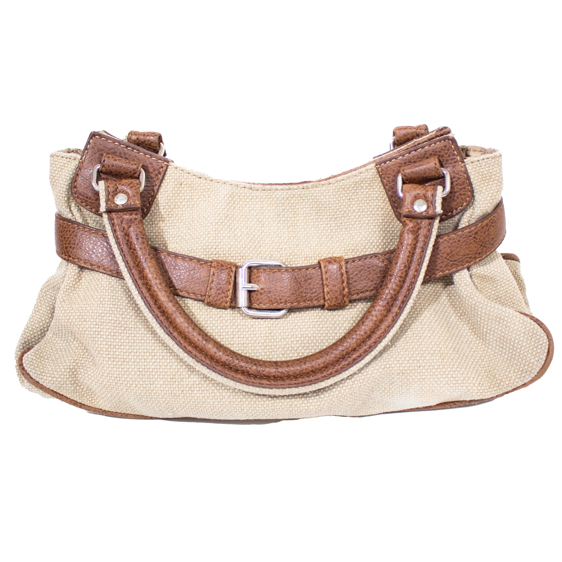 Mala de mão em tecido texturizado em tom bege. Detalhes em pele em tom castanho com fivela decorativa metalizada em tom prateado. Duas alças em pele em tom castanho.