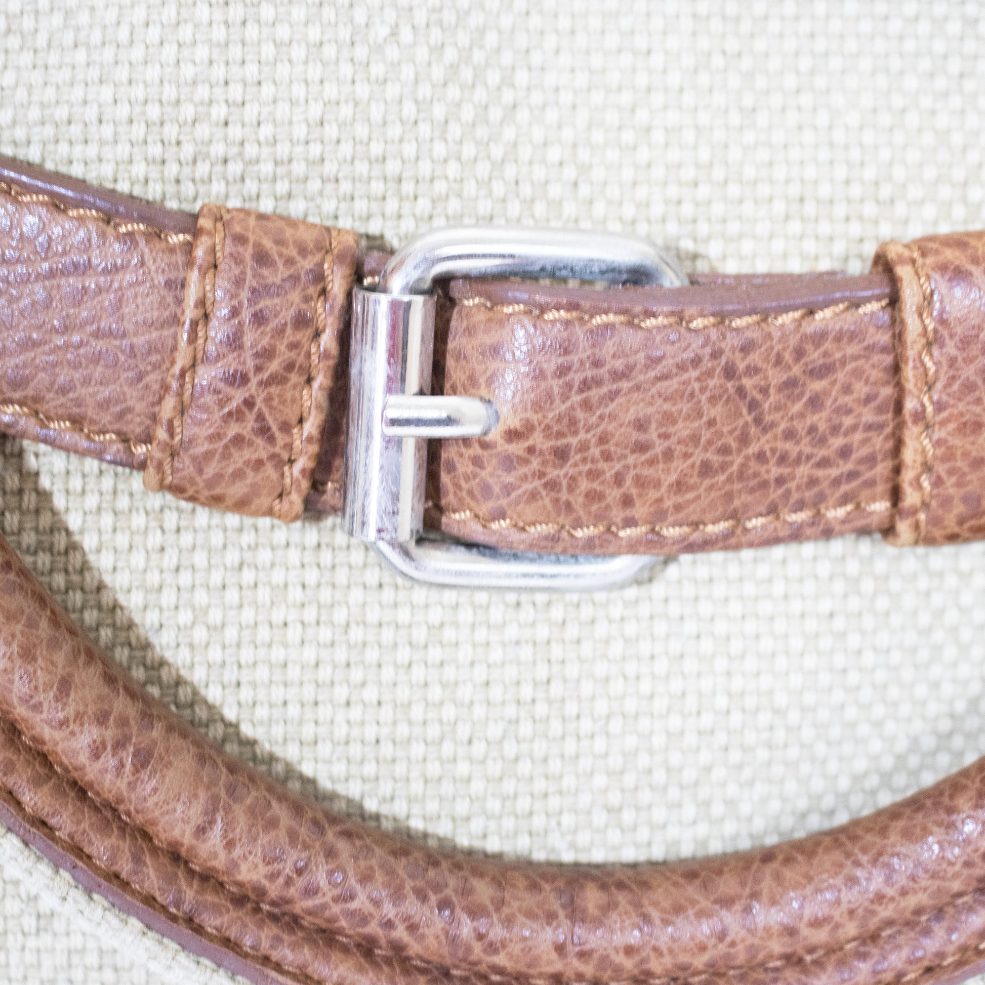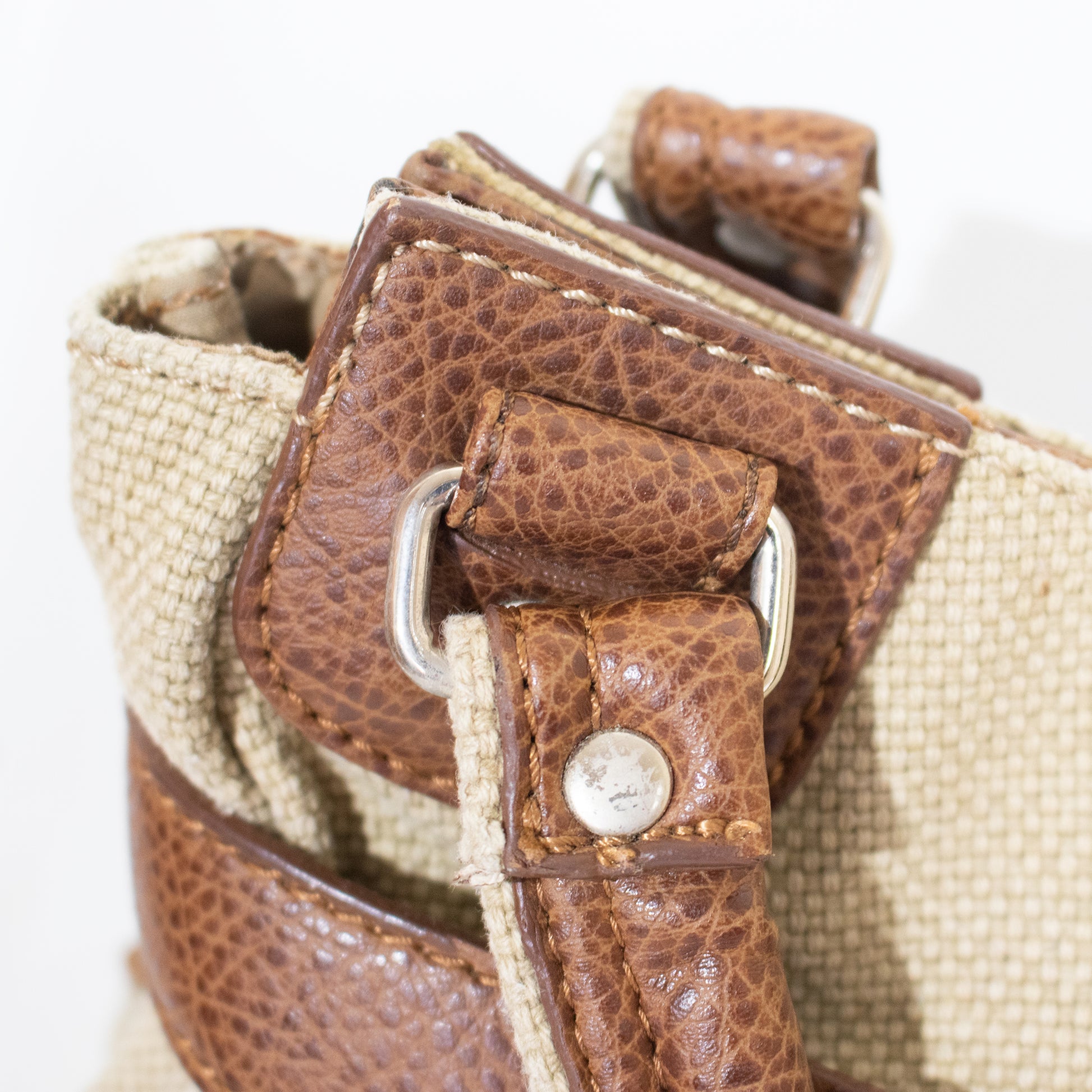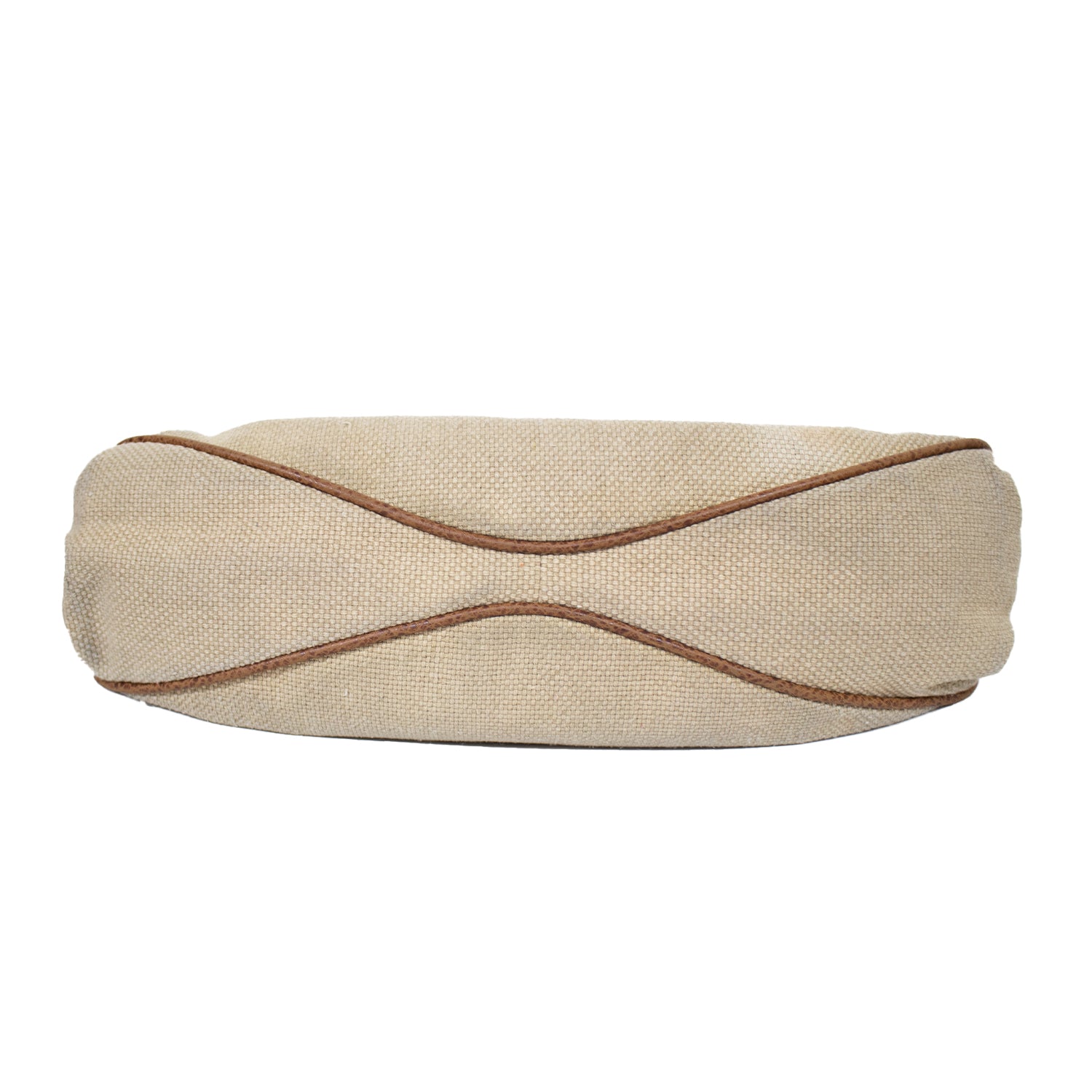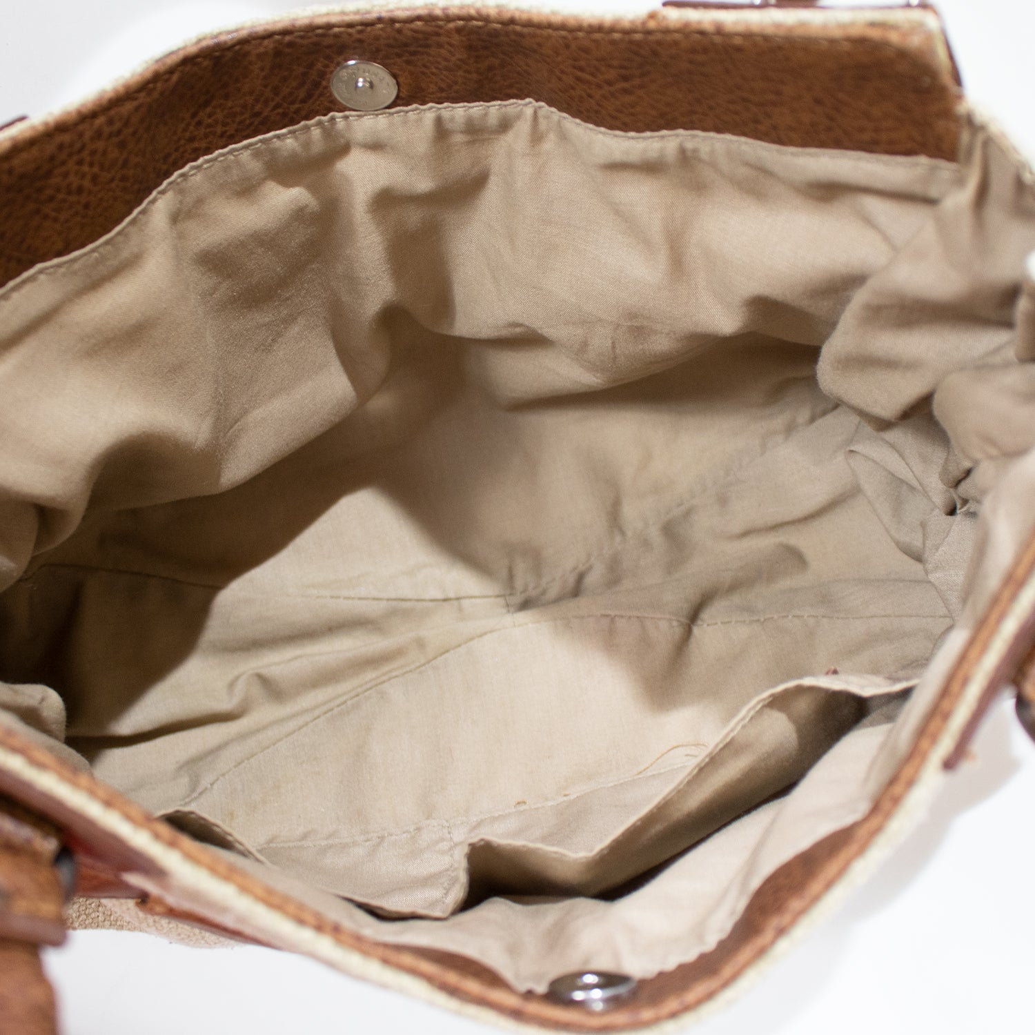 Mala de mão em tecido texturizado em tom bege. Detalhes em pele em tom castanho com fivela decorativa metalizada em tom prateado. Duas alças em pele em tom castanho.