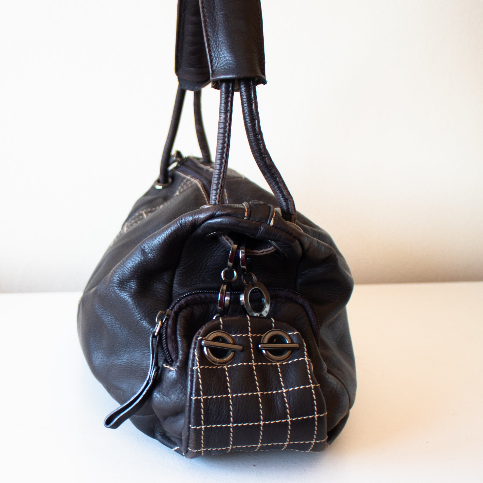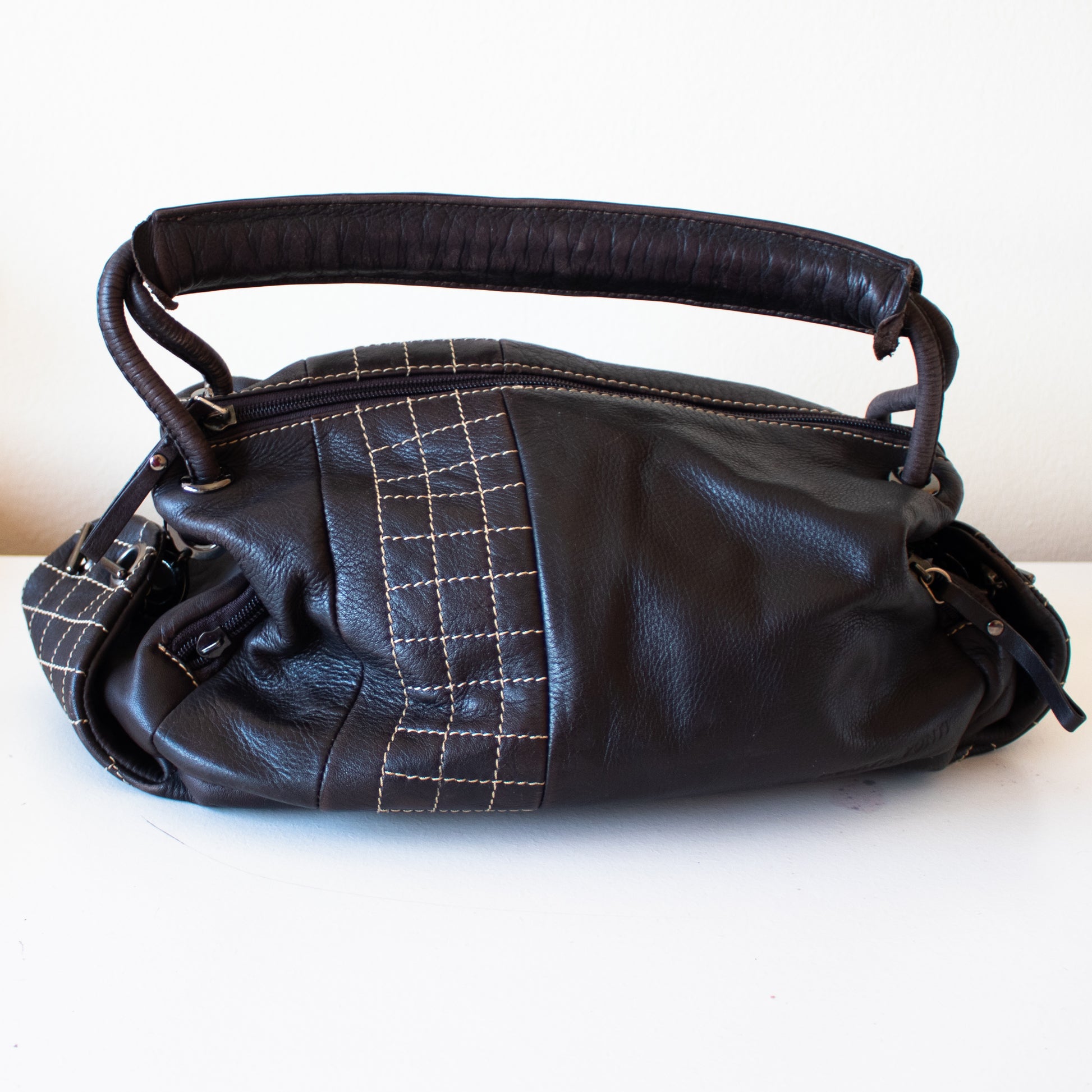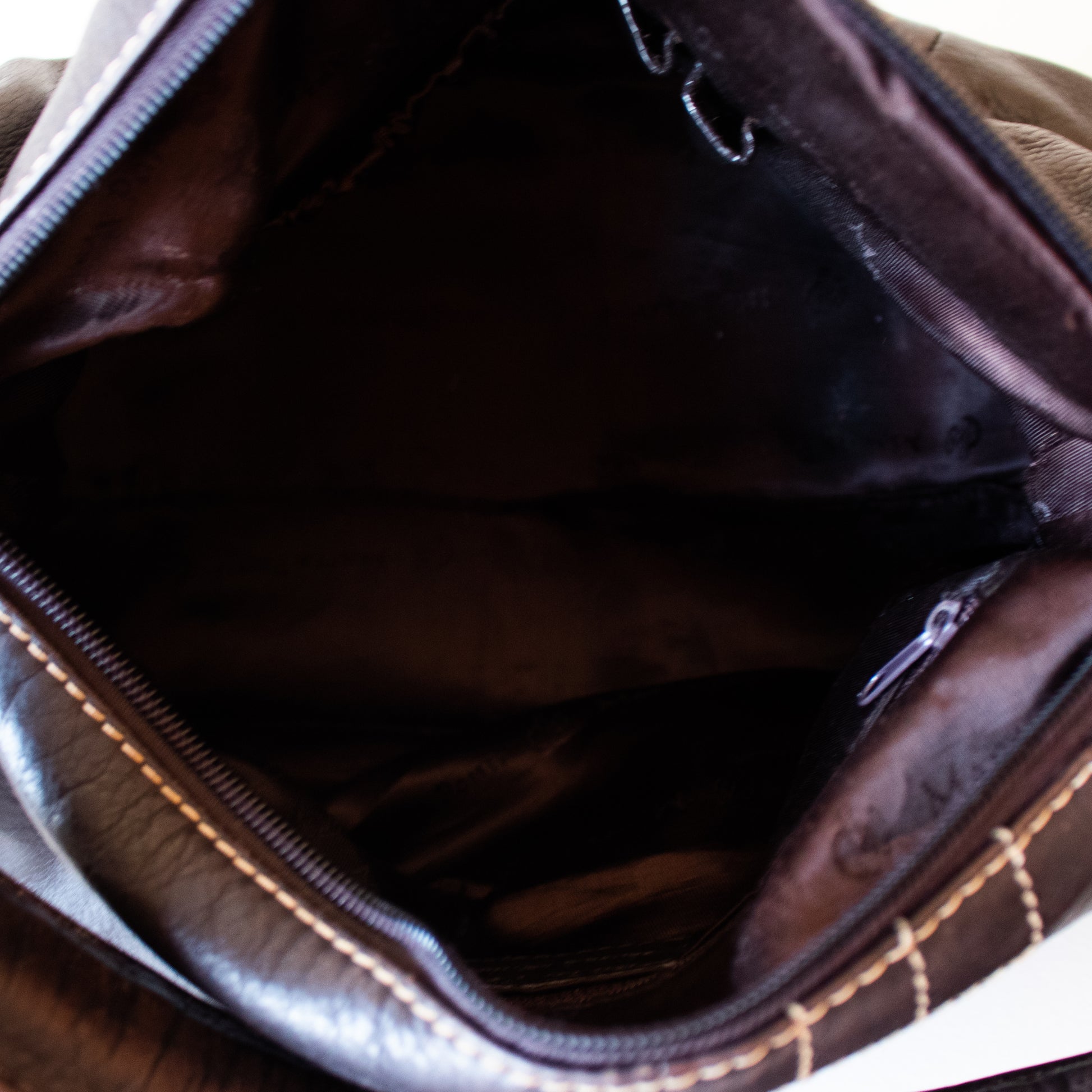 Mala de ombro em pele em tom castanho, de formato abalonado, com costuras decorativas em tom contraste. Alça de ombro, no mesmo material. Compartimento com abertura de fecho éclair. Compartimento interior forrado, com bolso e fecho éclair.