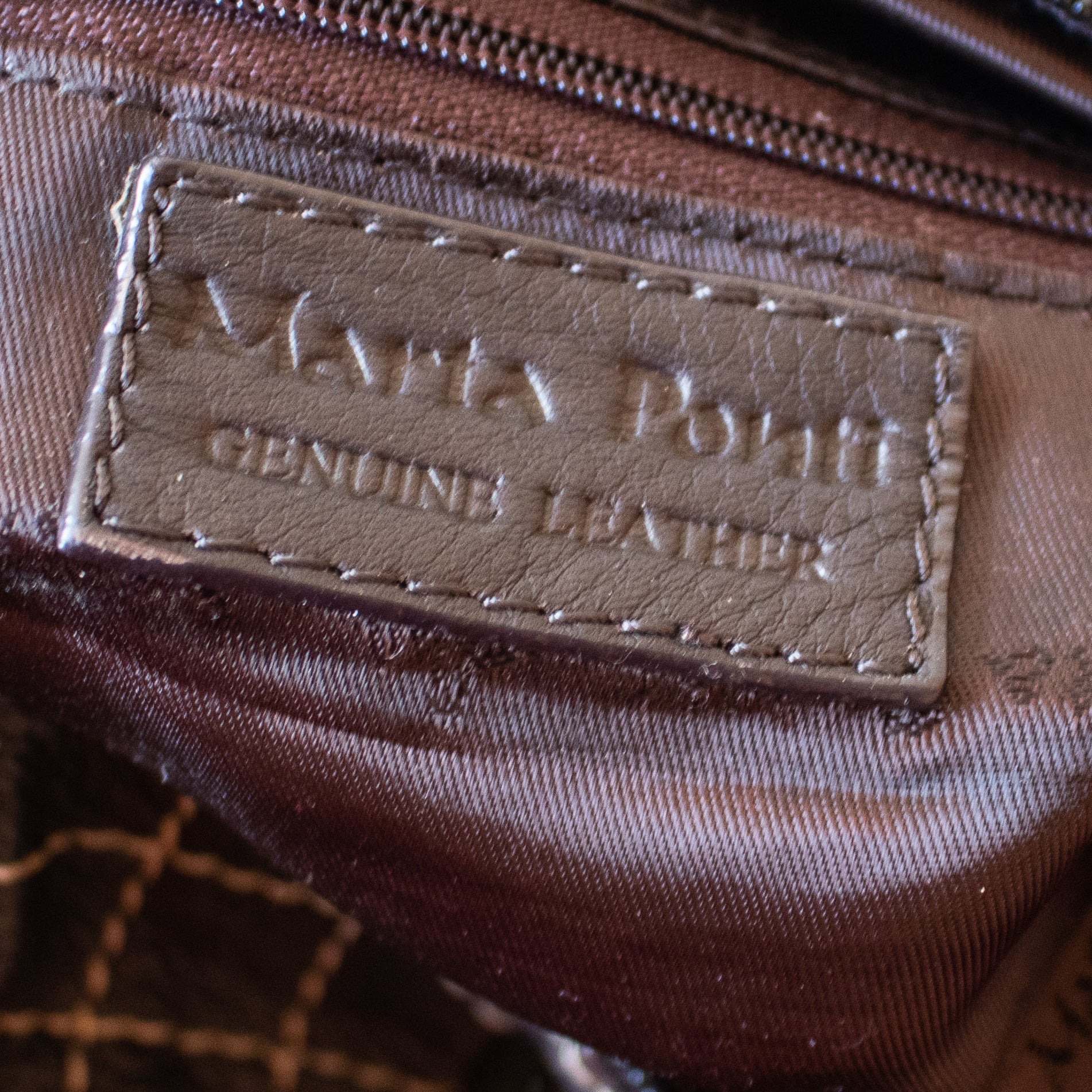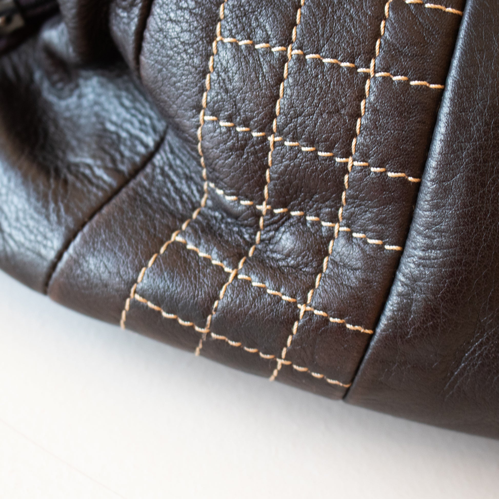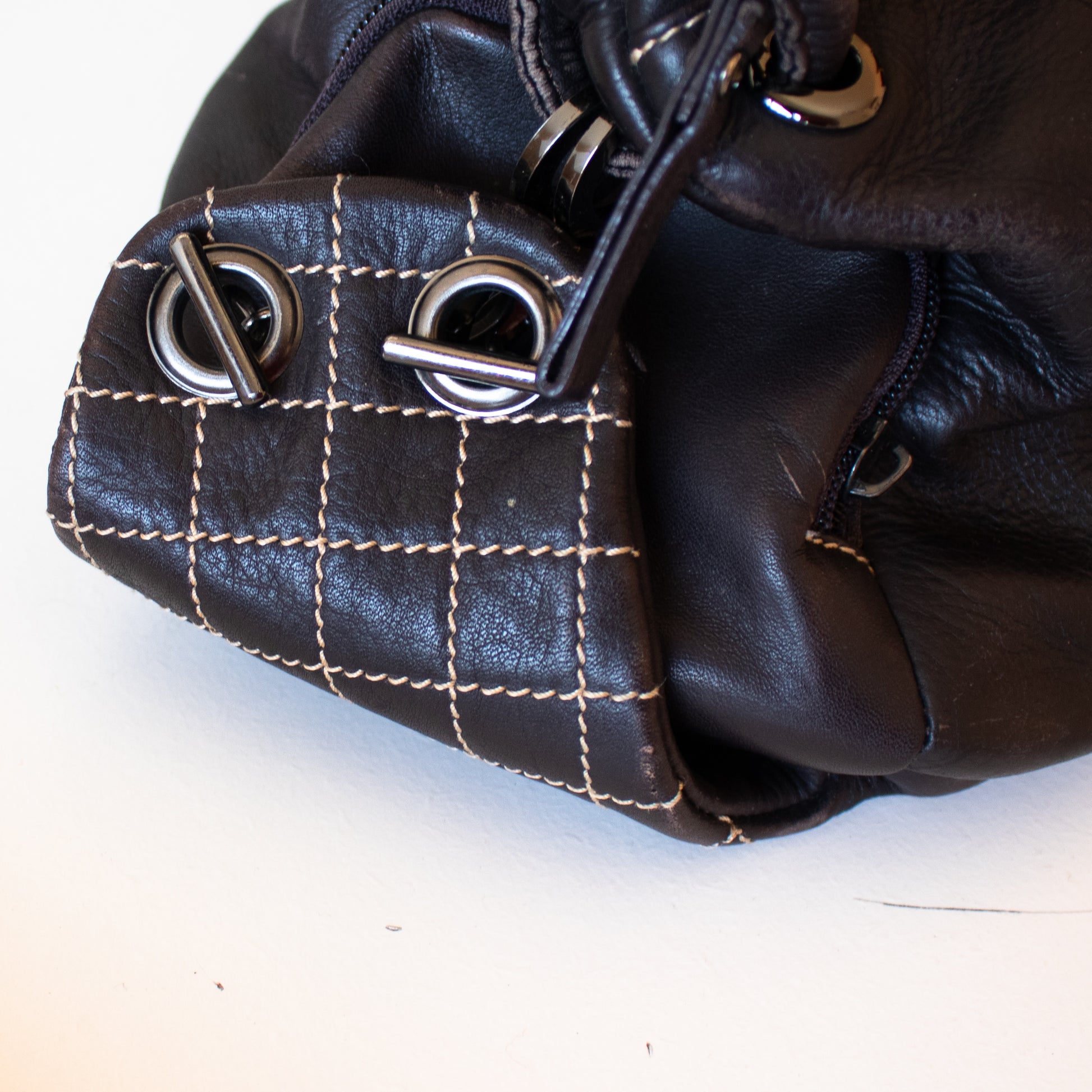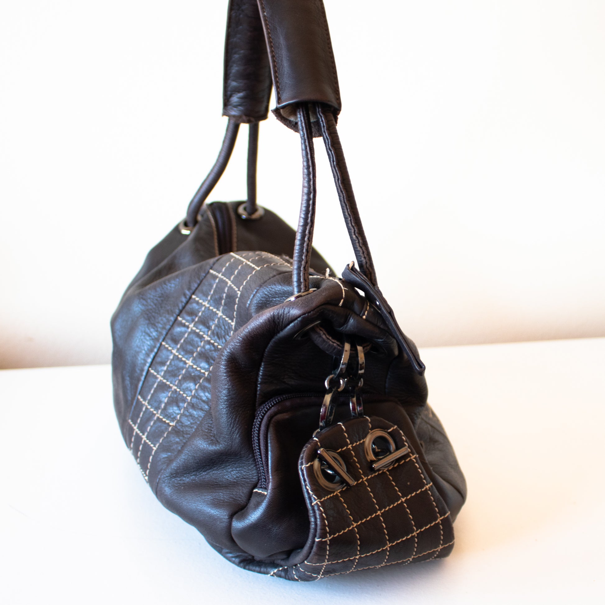 Mala de ombro em pele em tom castanho, de formato abalonado, com costuras decorativas em tom contraste. Alça de ombro, no mesmo material. Compartimento com abertura de fecho éclair. Compartimento interior forrado, com bolso e fecho éclair.