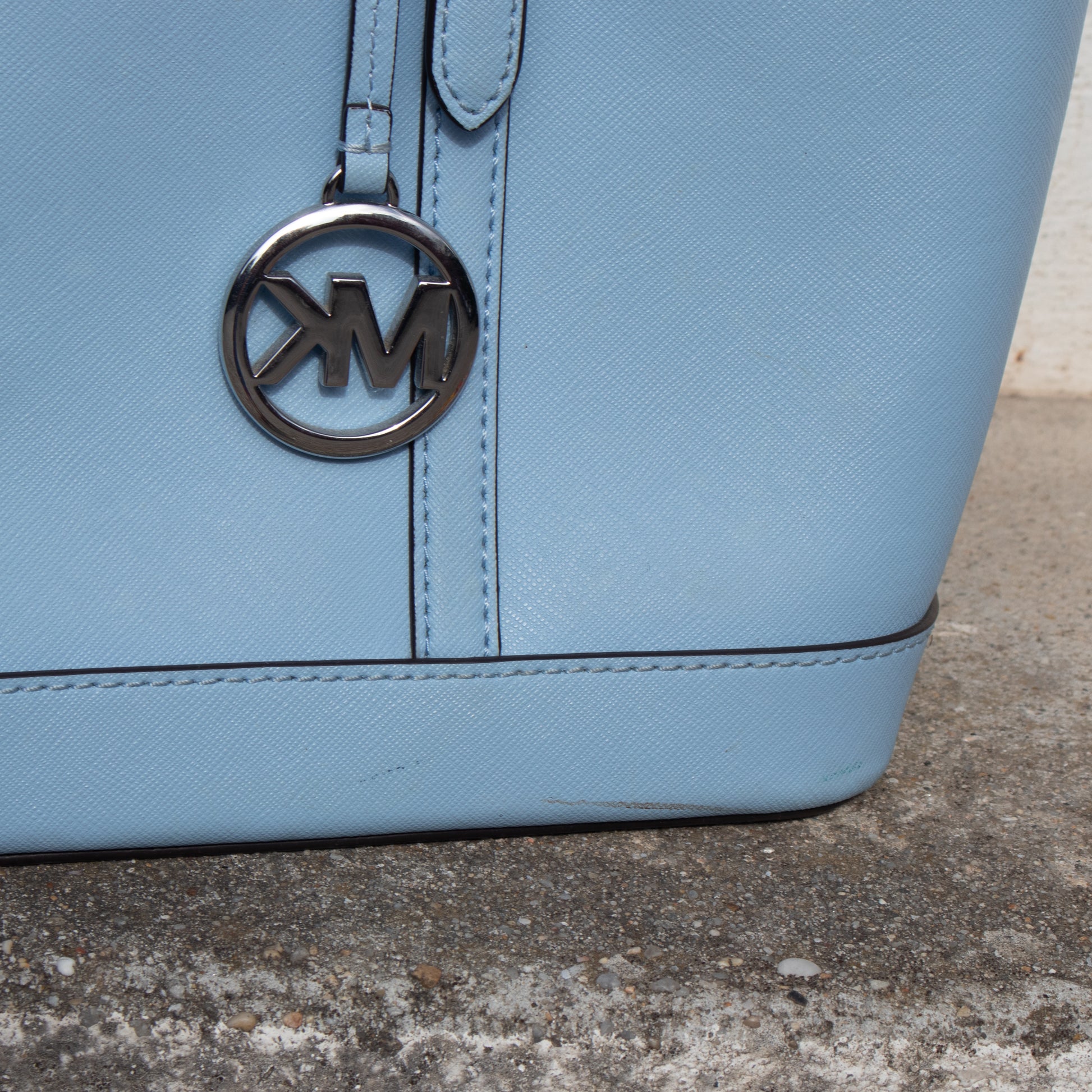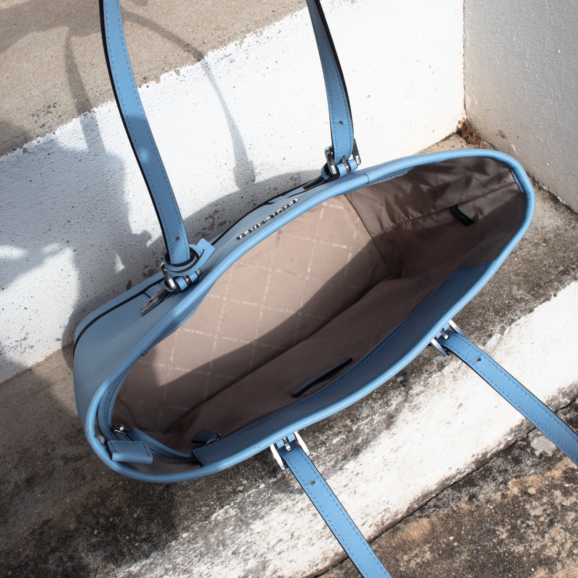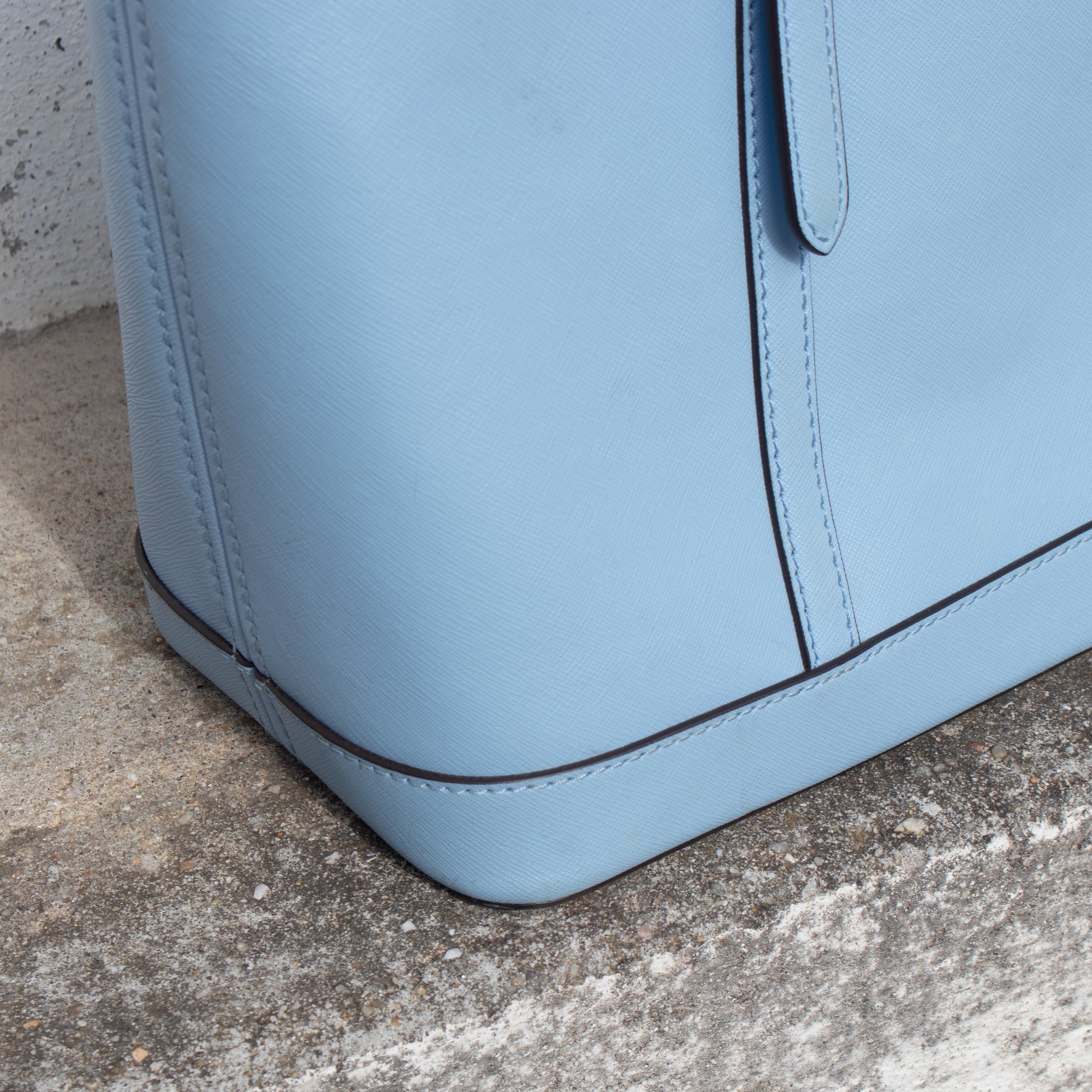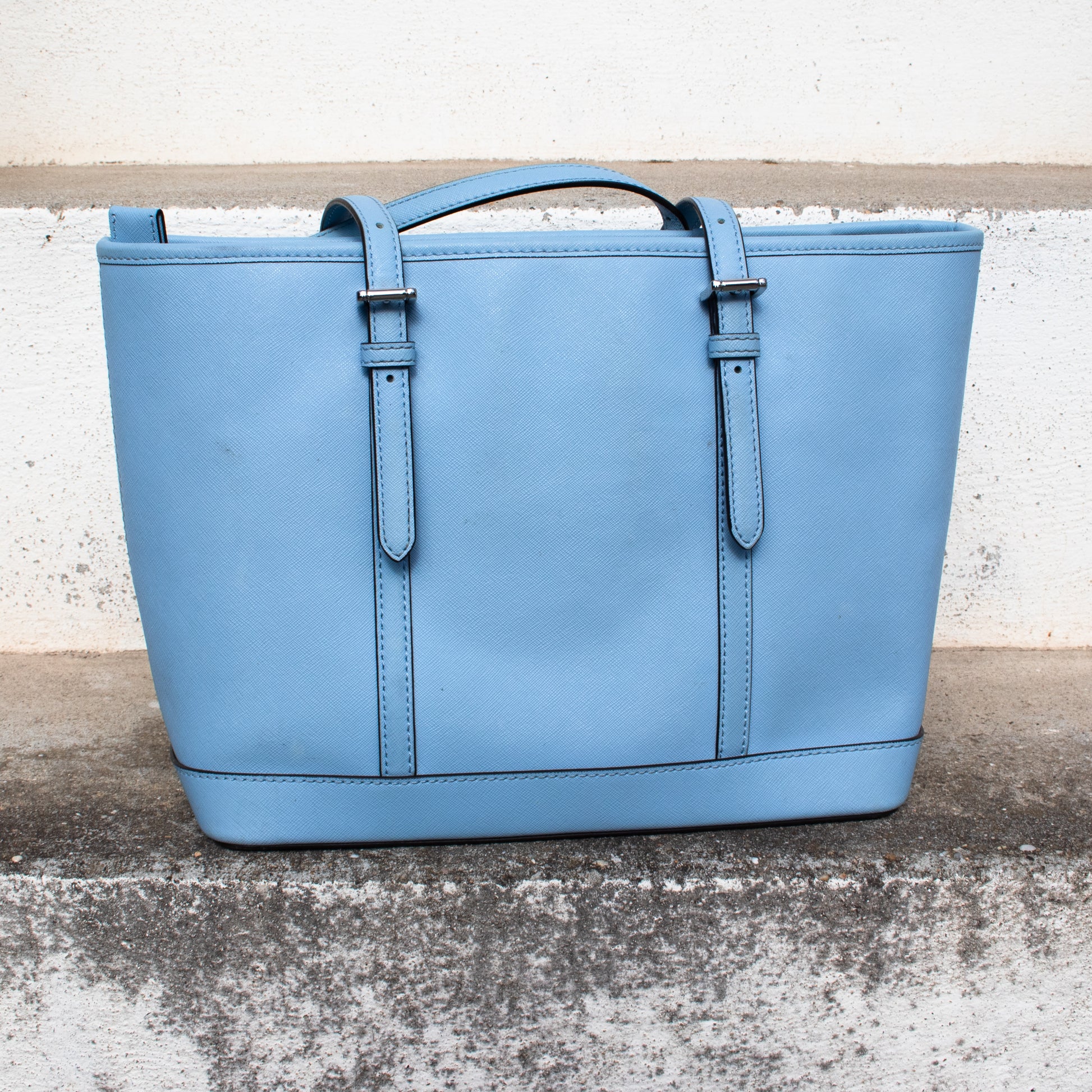 Mala shopper de ombro em tamanho grande em pele gravada em tom azul. Alças superiores curtas e ajustáveis. Fecho éclair na parte superior. Detalhes decorativos metalizados em tom prateado. Compartimento interno principal com forro de tecido em padrão.