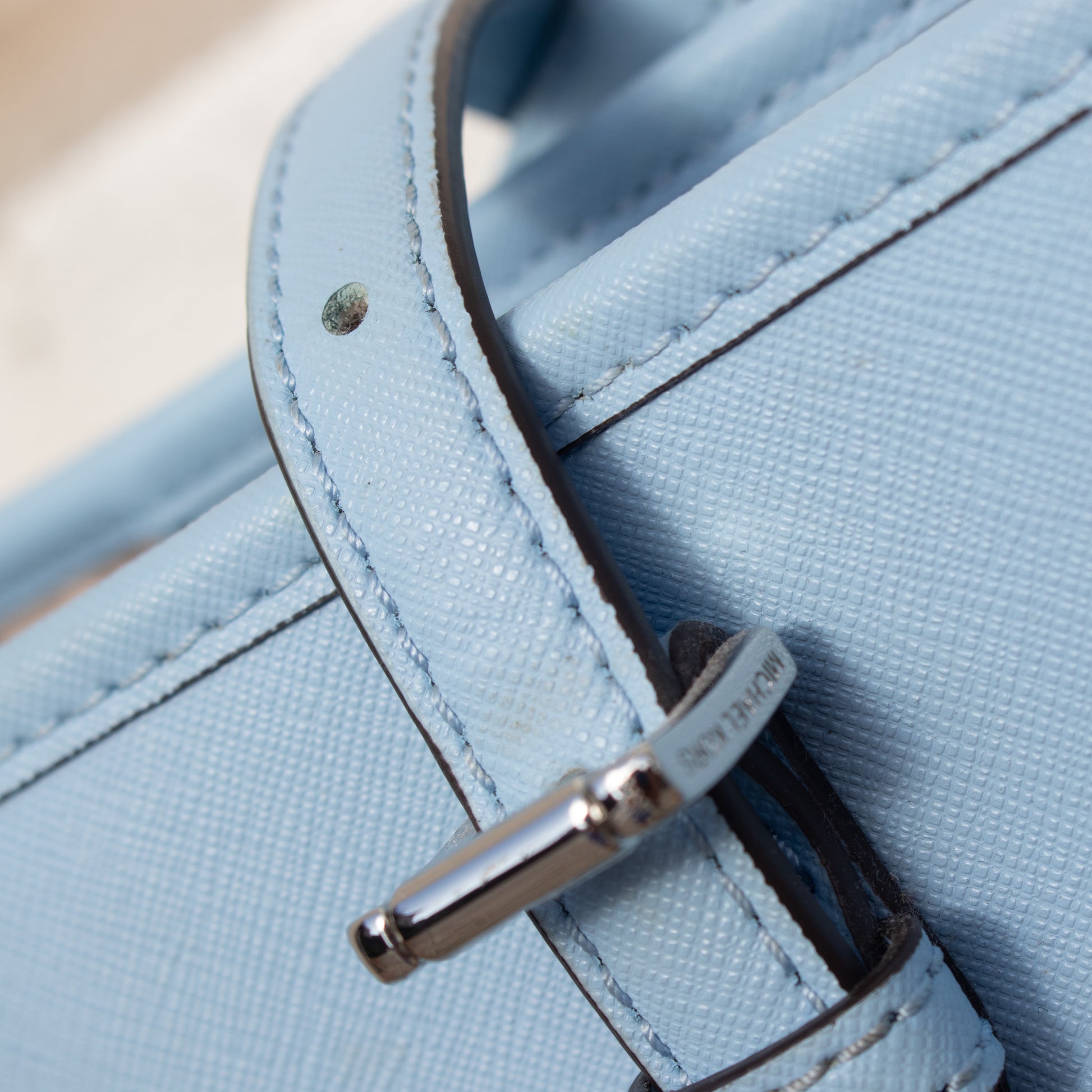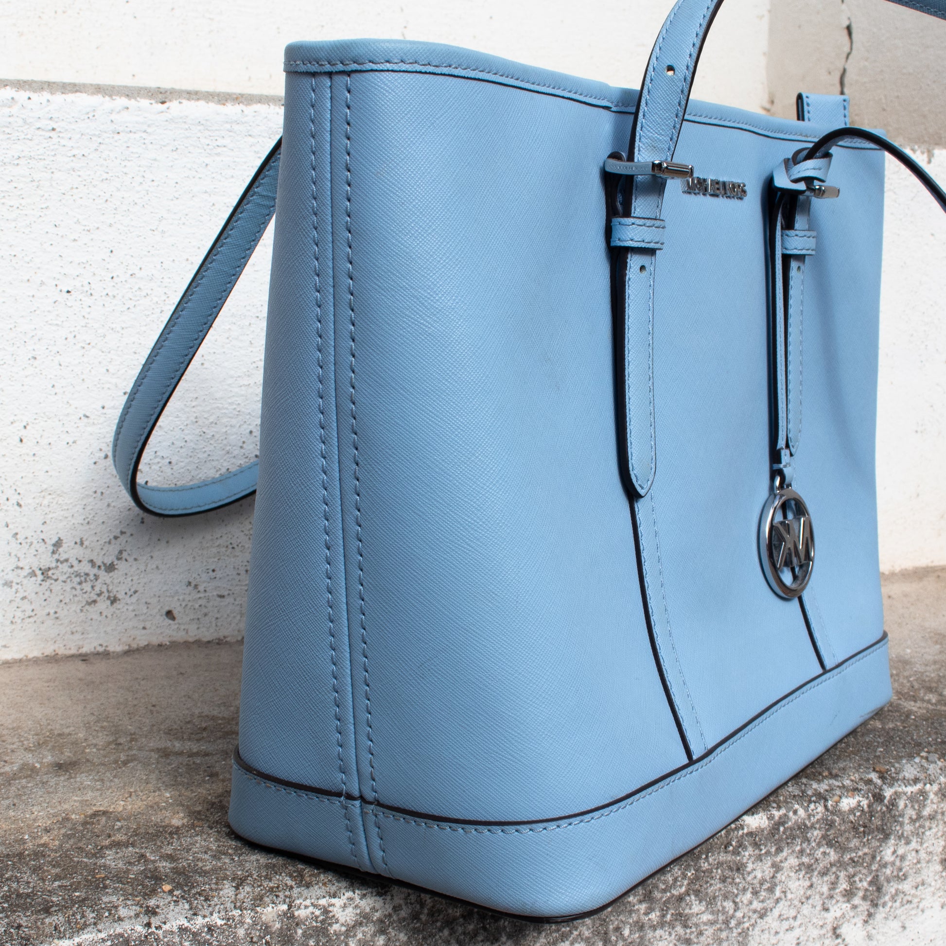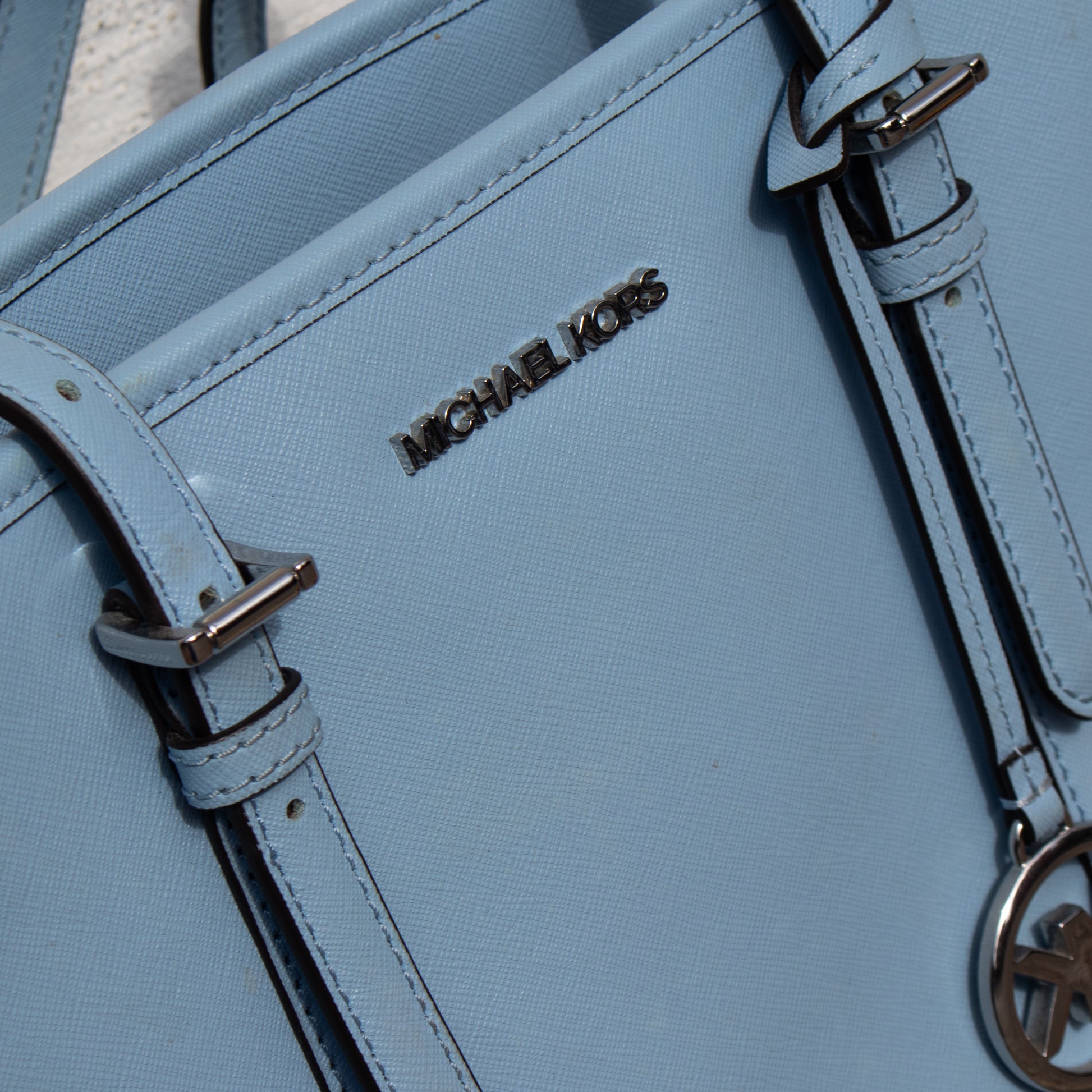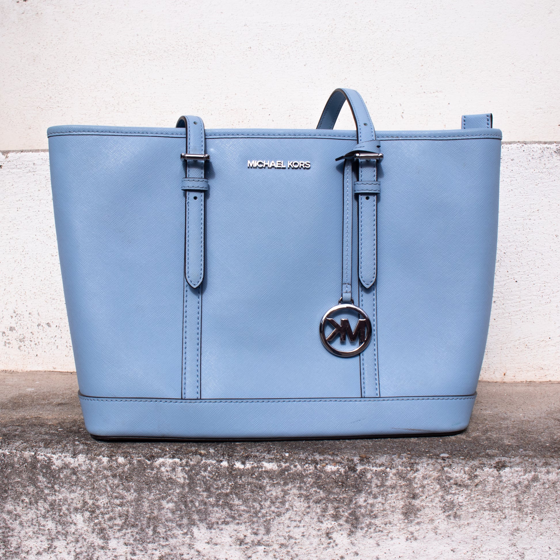 Mala shopper de ombro em tamanho grande em pele gravada em tom azul. Alças superiores curtas e ajustáveis. Fecho éclair na parte superior. Detalhes decorativos metalizados em tom prateado. Compartimento interno principal com forro de tecido em padrão.