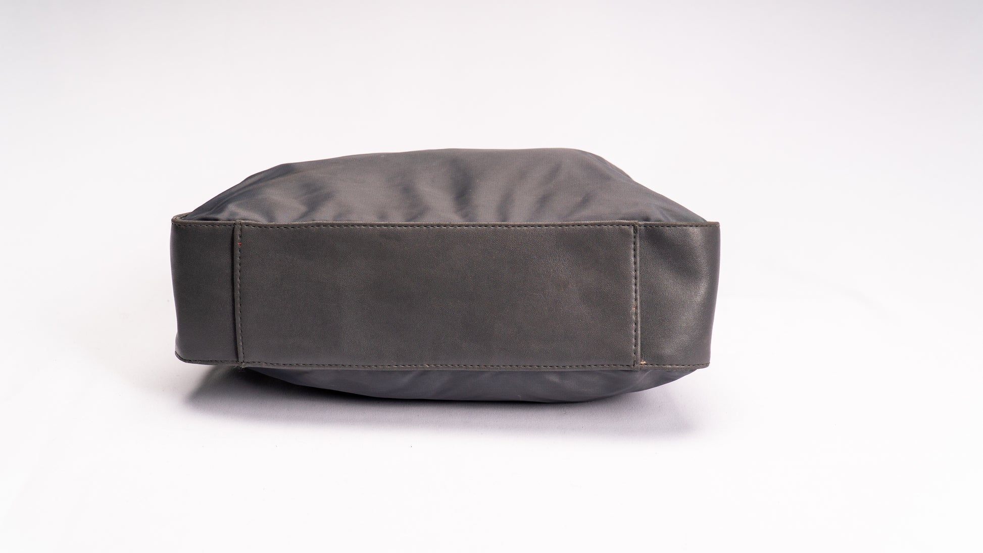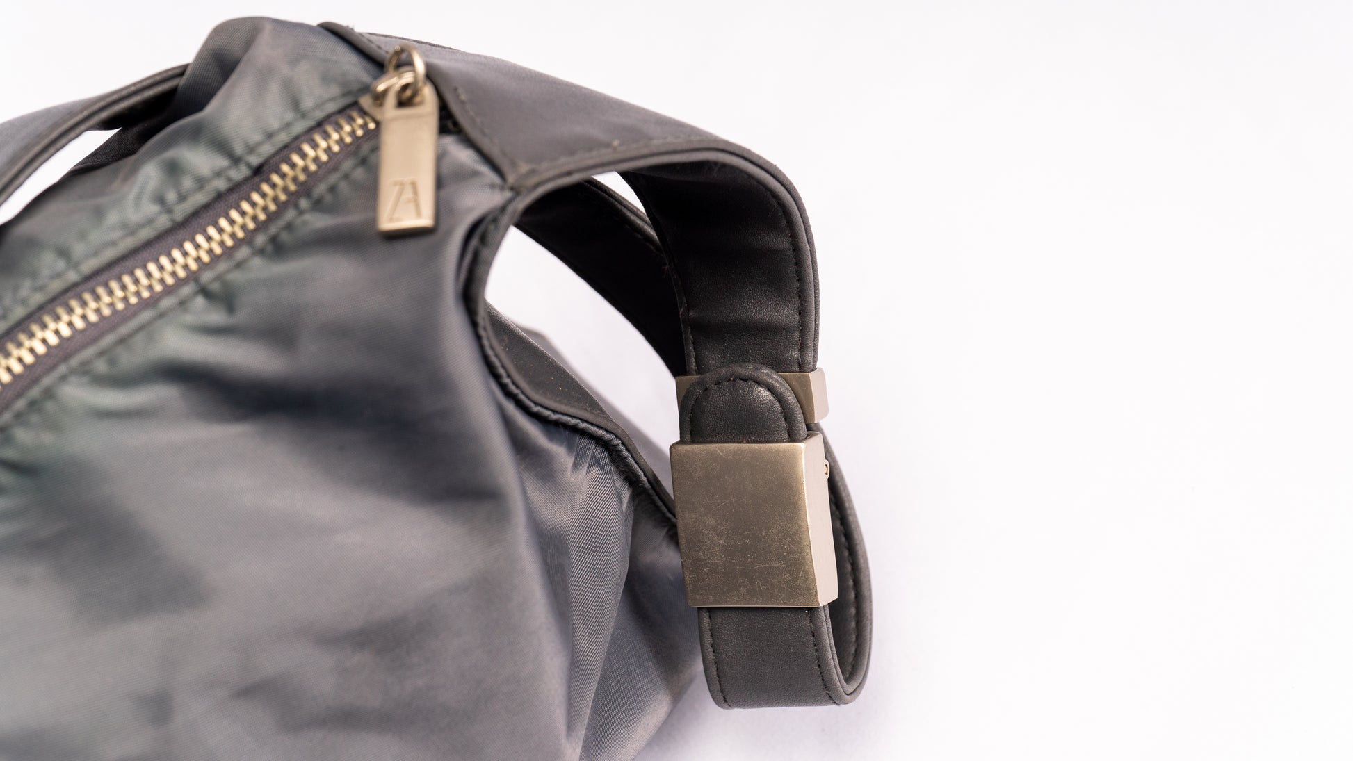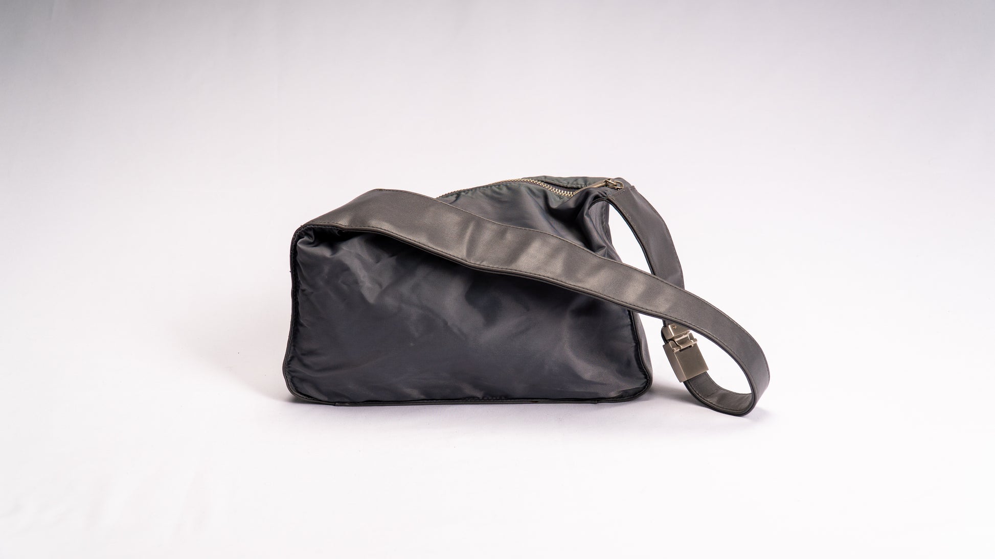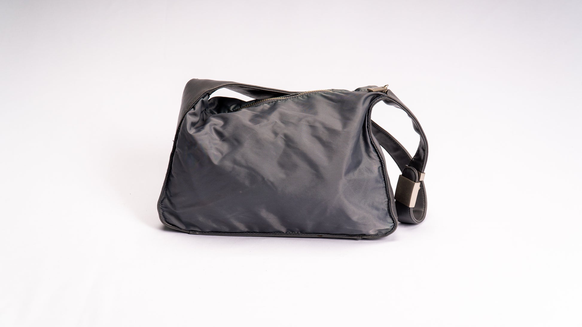 Mala de ombro, em cor preta, com algumas marcas de uso.